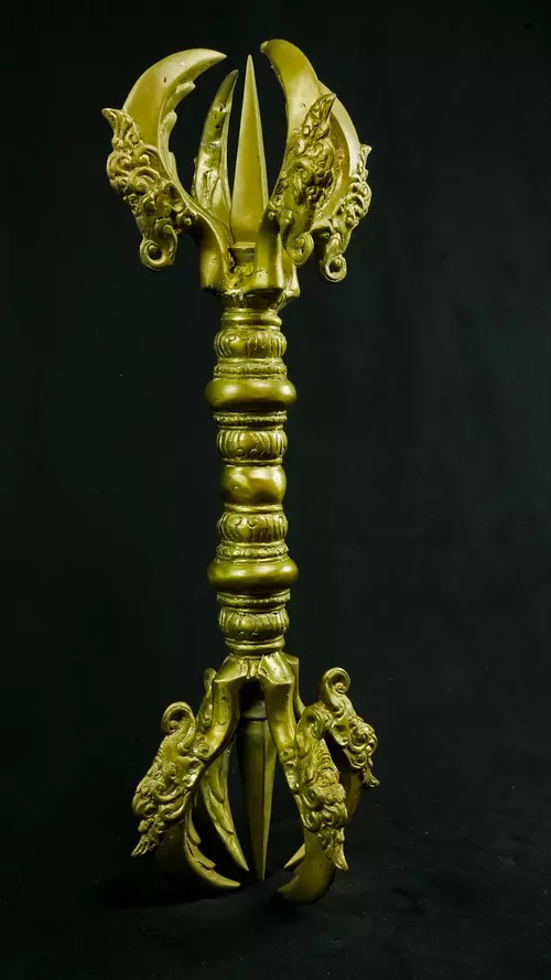 Le Dorje à double extrémité que tu présentes est une forme rituelle rare, unissant les polarités de l’énergie : le yin et le yang, la compassion et la sagesse, le ciel et la terre. Ses deux têtes opposées se rejoignent en un axe central, représentant la voie du milieu, là où toutes les dualités se résorbent.