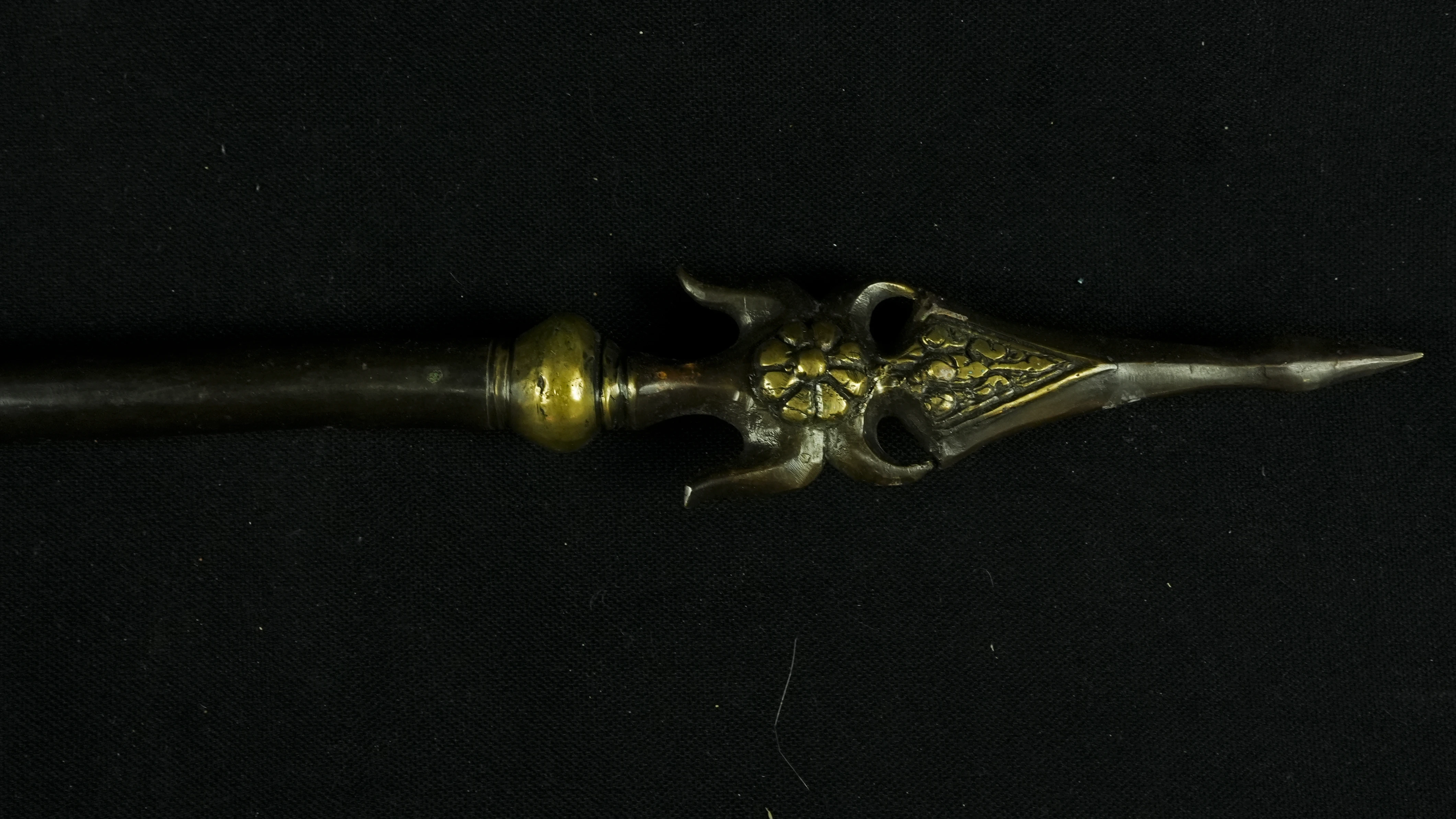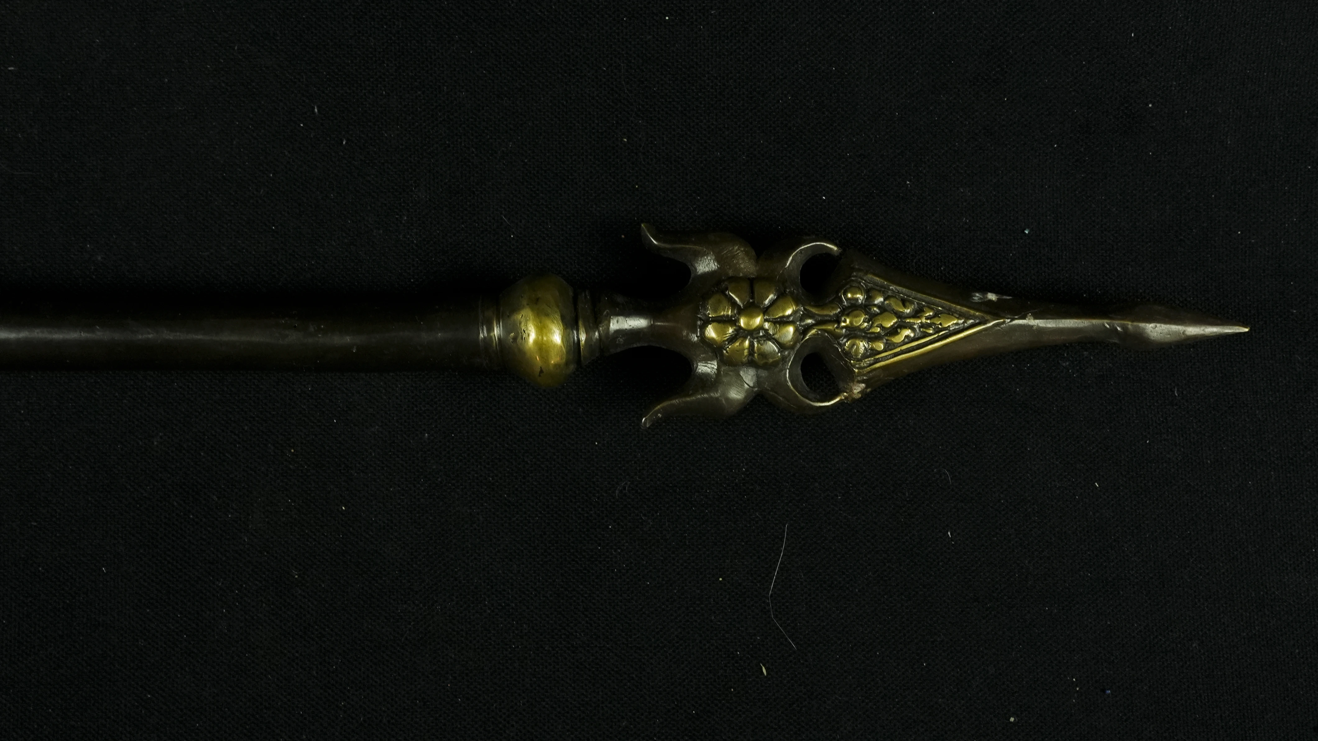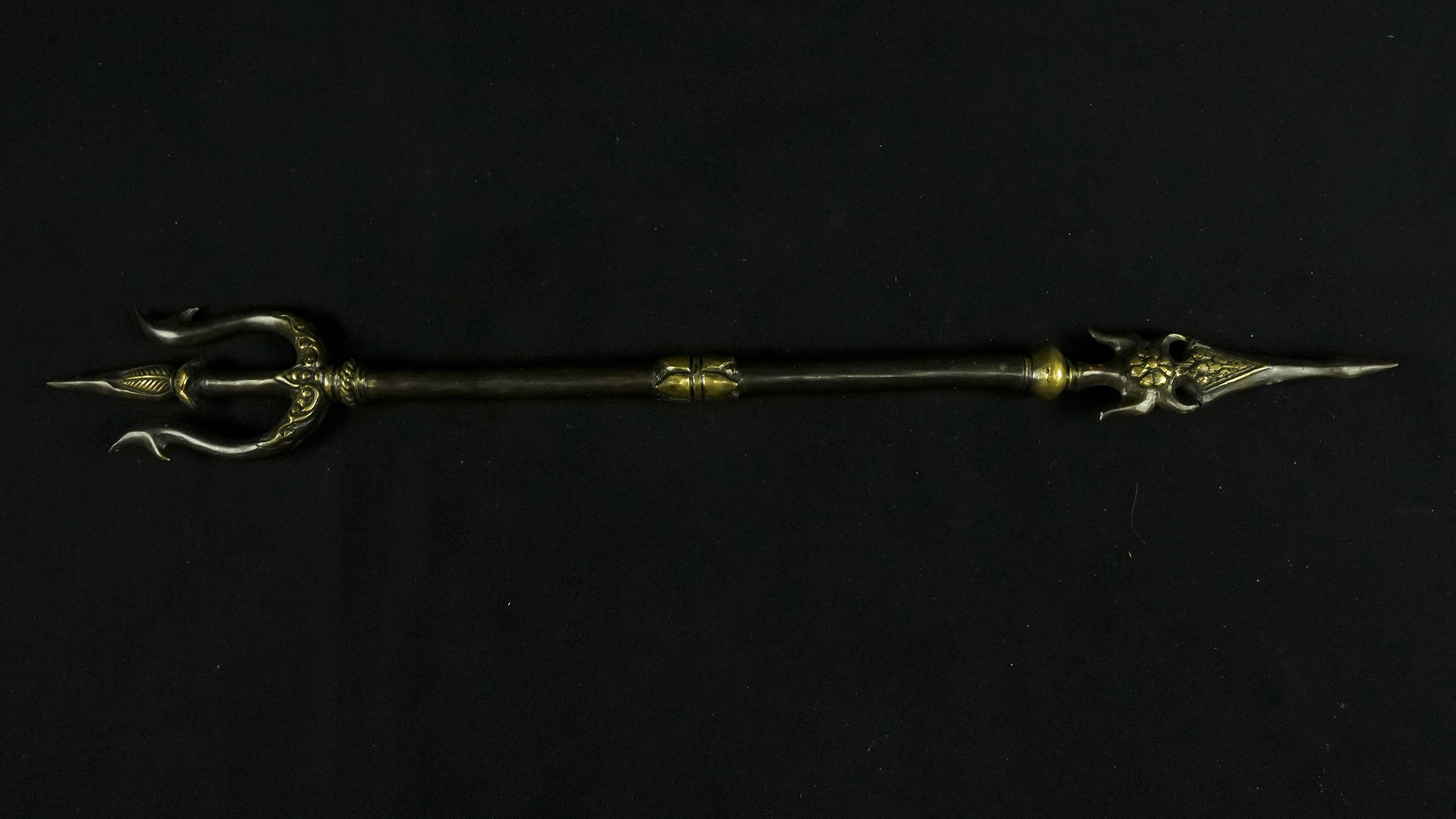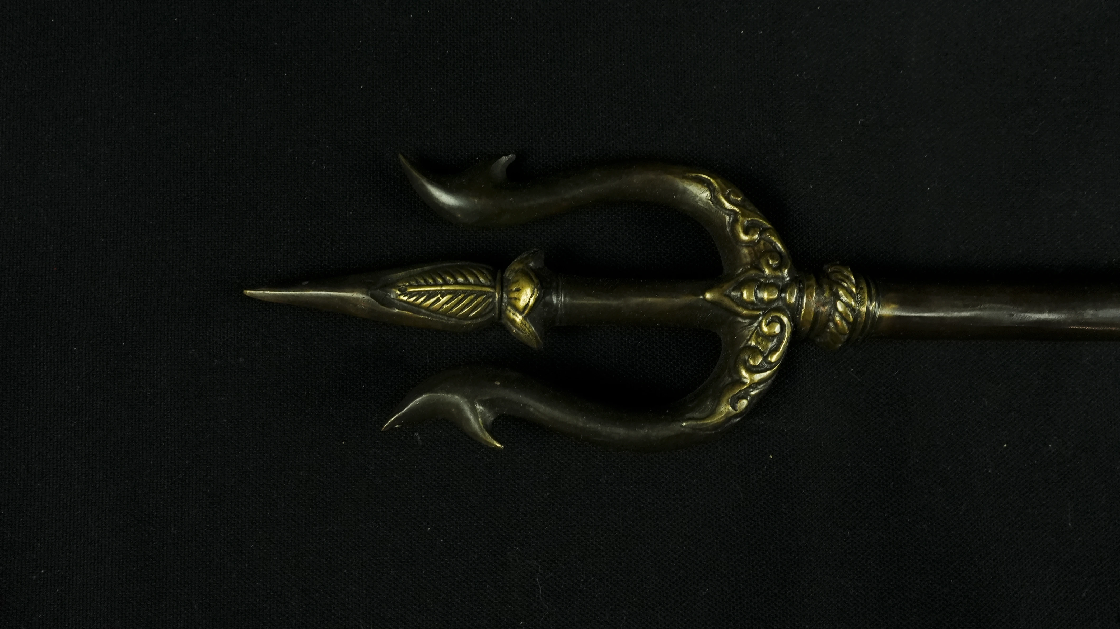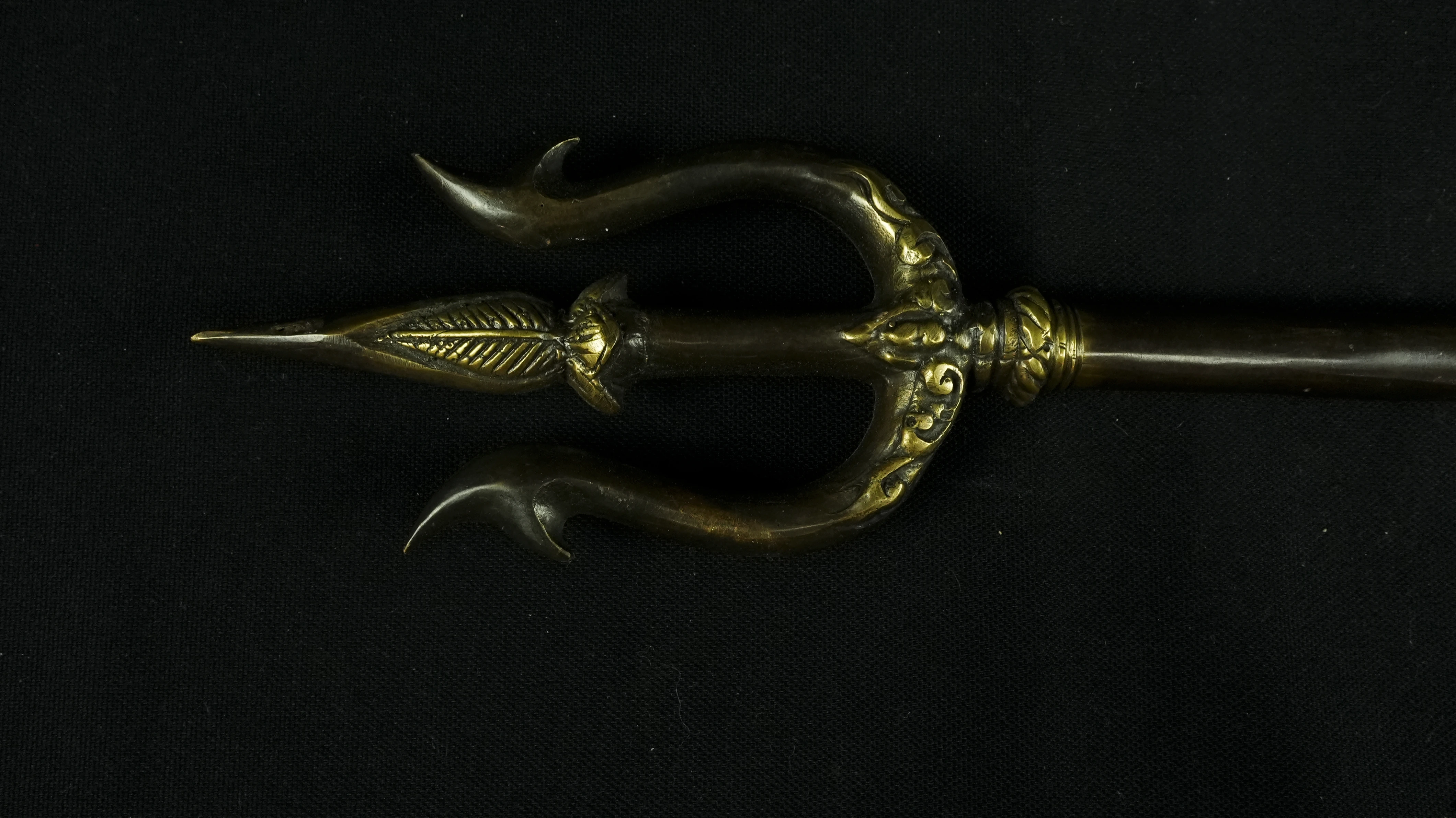 Le Triśūla, le trident sacré, est une arme divine : il est l’instrument de la victoire du dharma (l’ordre sacré, la loi cosmique), de la lumière et de la justice divine. Dans son éclat se concentre le pouvoir de dissiper les illusions et de rétablir l’ordre cosmique dans les trois mondes : physique, subtil et spirituel. Ses trois pointes unies à une seule base rappellent que toutes les dualités, toutes les diversités, trouvent leur origine dans une unité transcendante.