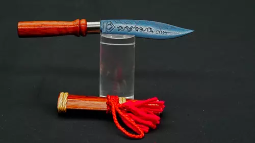 Cette mini-dague sacrée est un outil de clarté, de protection et d’alignement spirituel. L’union du métal sacré Lek Nam Phee et des inscriptions gravées lui confère une action multidimensionnelle, à la fois défensive, transmutatoire et éclairante.