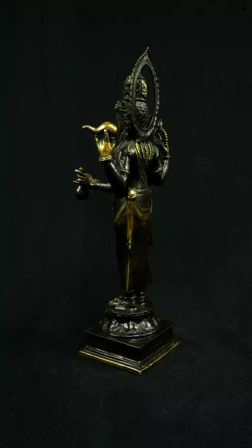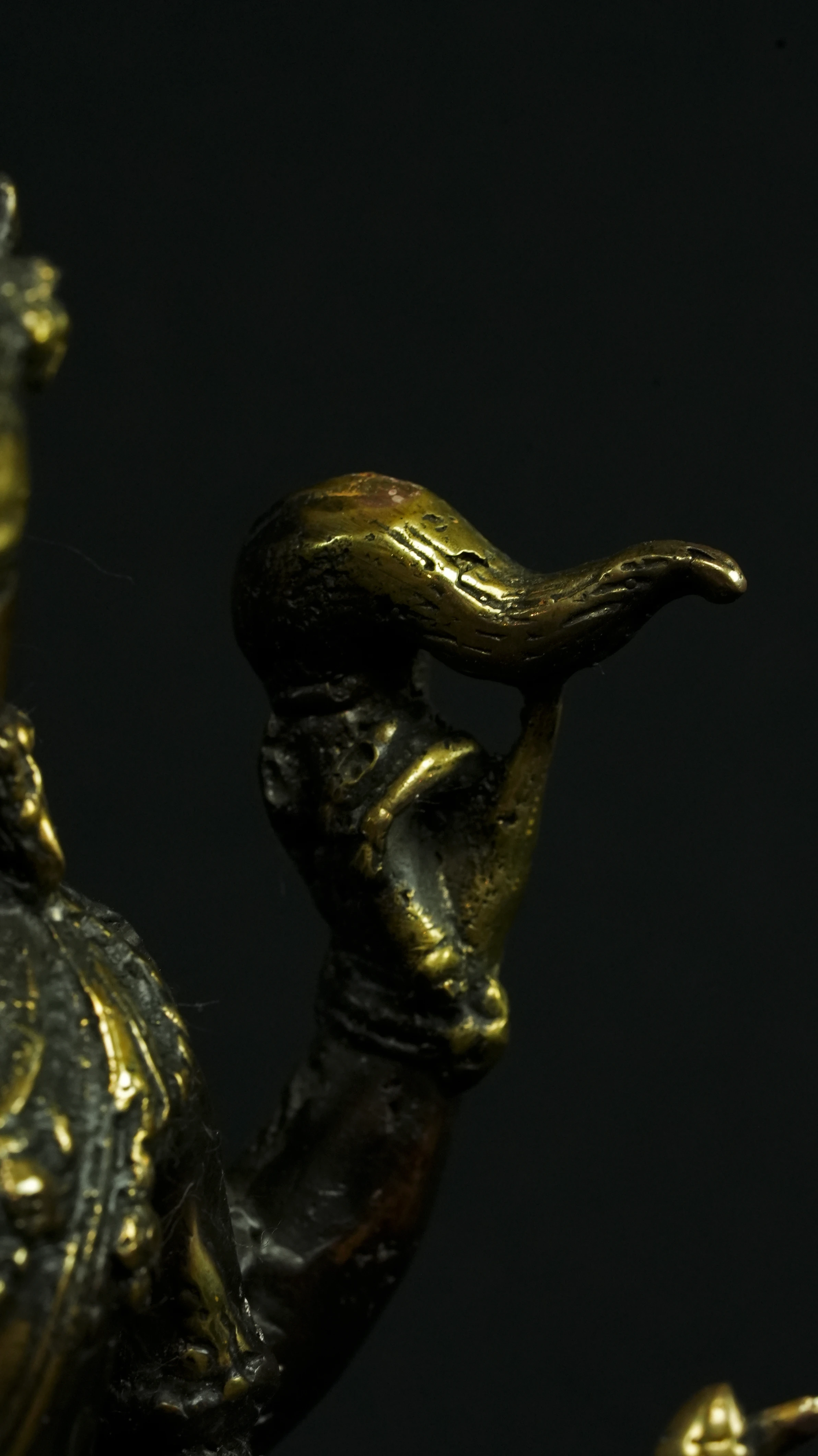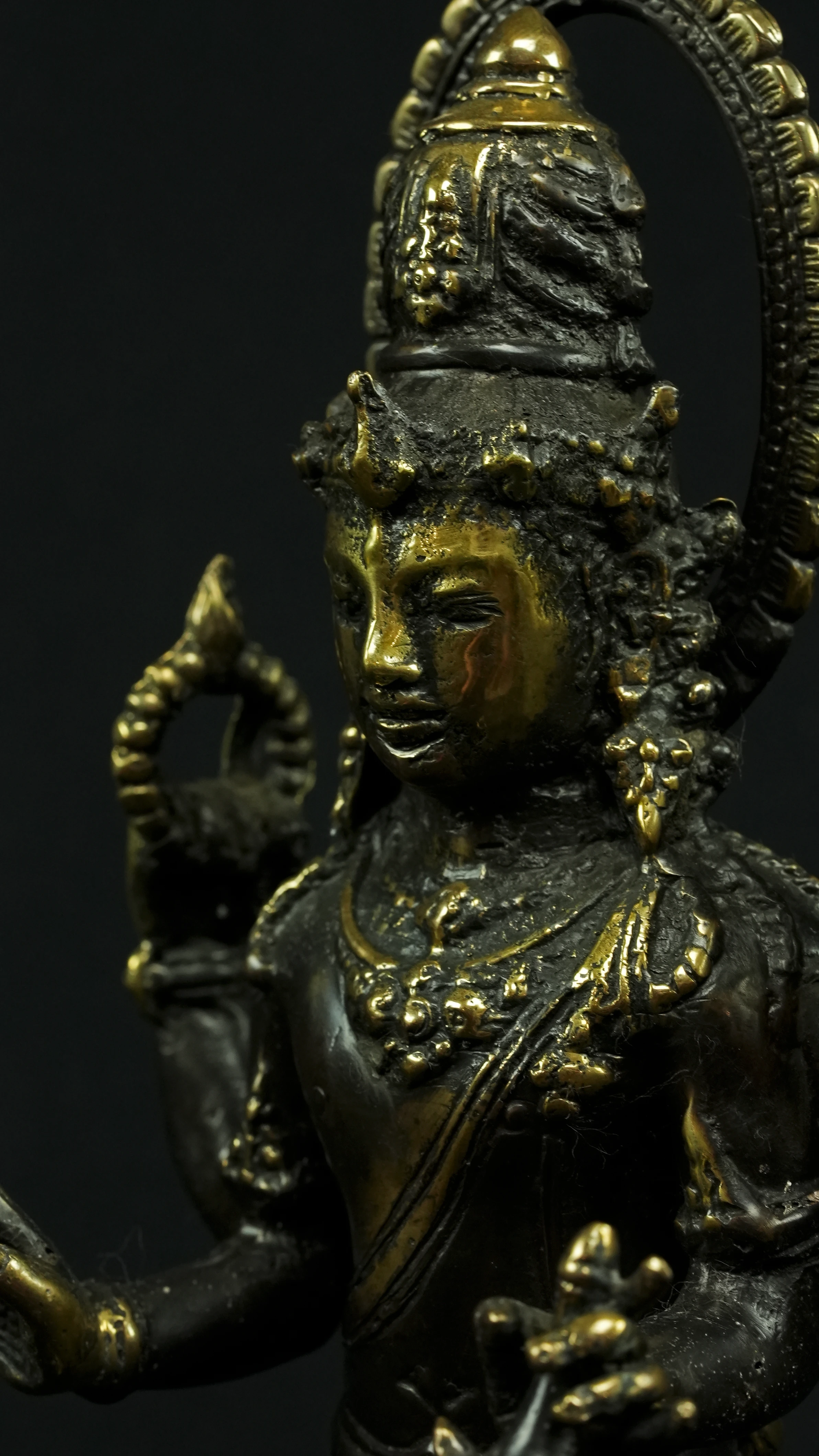 Symbole de la conscience à l’état pur, Brahma est le souffle primordial qui donne forme au chaos. Il ne crée pas seulement la matière, mais aussi le temps, la parole et la connaissance. Ses quatre visages tournés vers les quatre directions expriment sa vision totale : il perçoit simultanément le passé, le présent, le futur et le plan éternel où tout existe en harmonie.