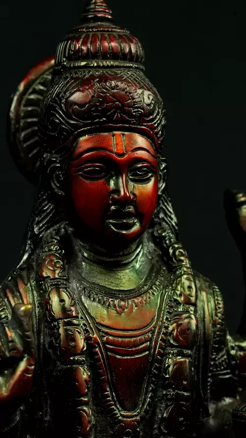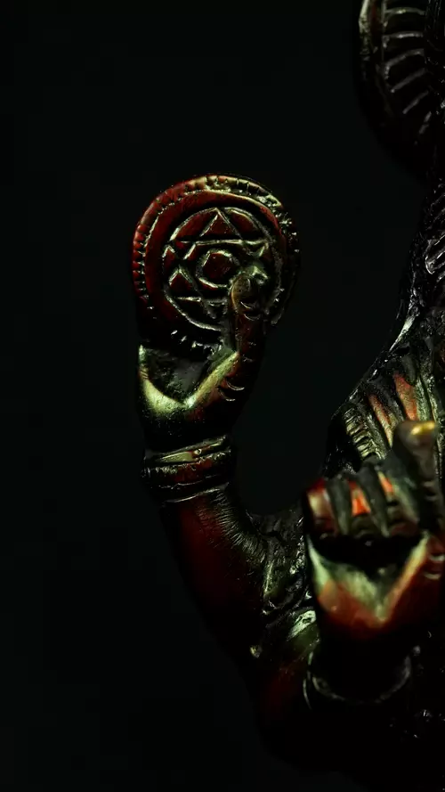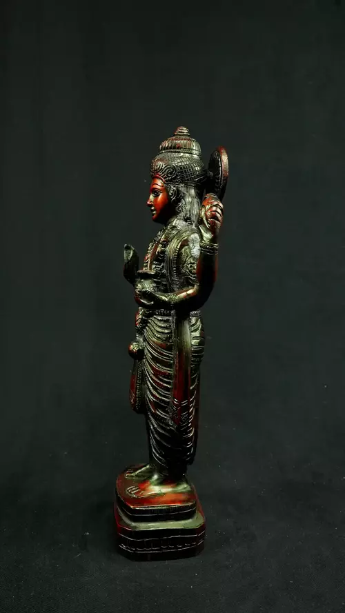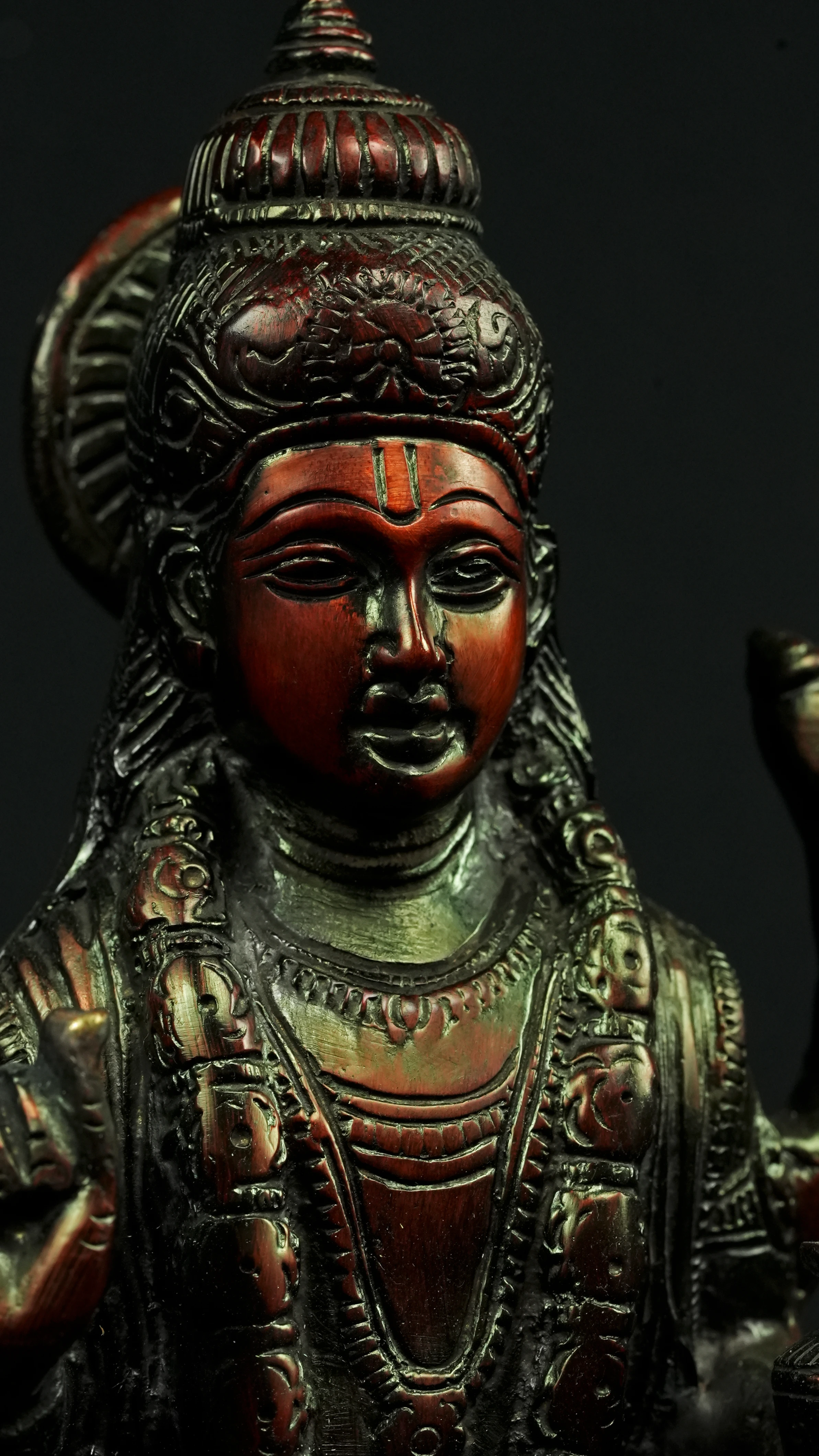 Chacun de ses quatre bras transmet une clé symbolique : le chakra (disque solaire) dissipe les impuretés profondes ; la conque ramène à l’ordre cosmique par le souffle ; la jarre d’Amrita irradie la lumière régénérante de l’élixir de vie ; et le geste d’offrande invite à recevoir la guérison avec humilité et foi. À travers l’équilibre de ses gestes, la précision de ses attributs et la douceur de son regard, cette représentation de Dhanvantari transmet un enseignement vivant : celui d’une médecine qui soigne en profondeur, qui purifie, qui élève, et qui reconnecte chaque être à la santé véritable, celle de l’âme en harmonie avec la Vie.
