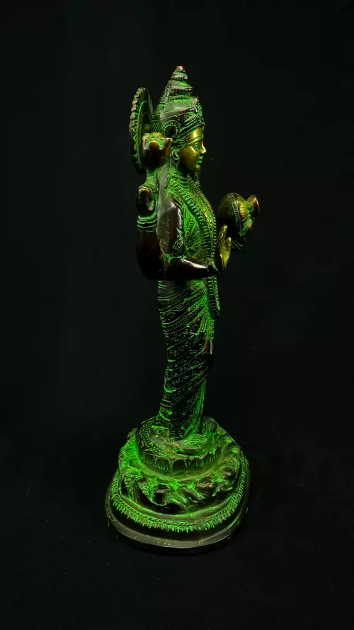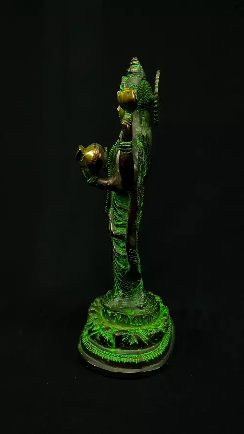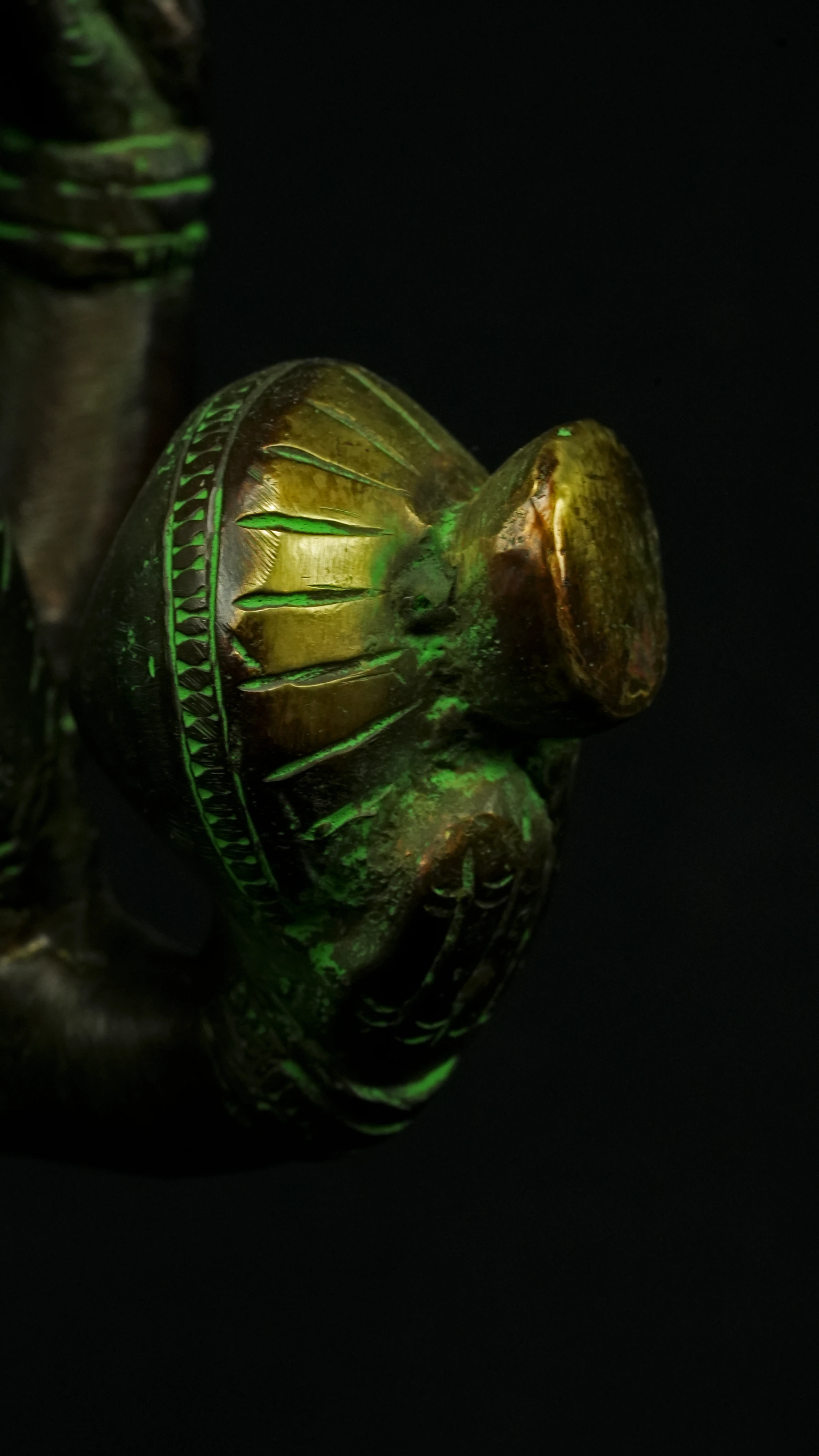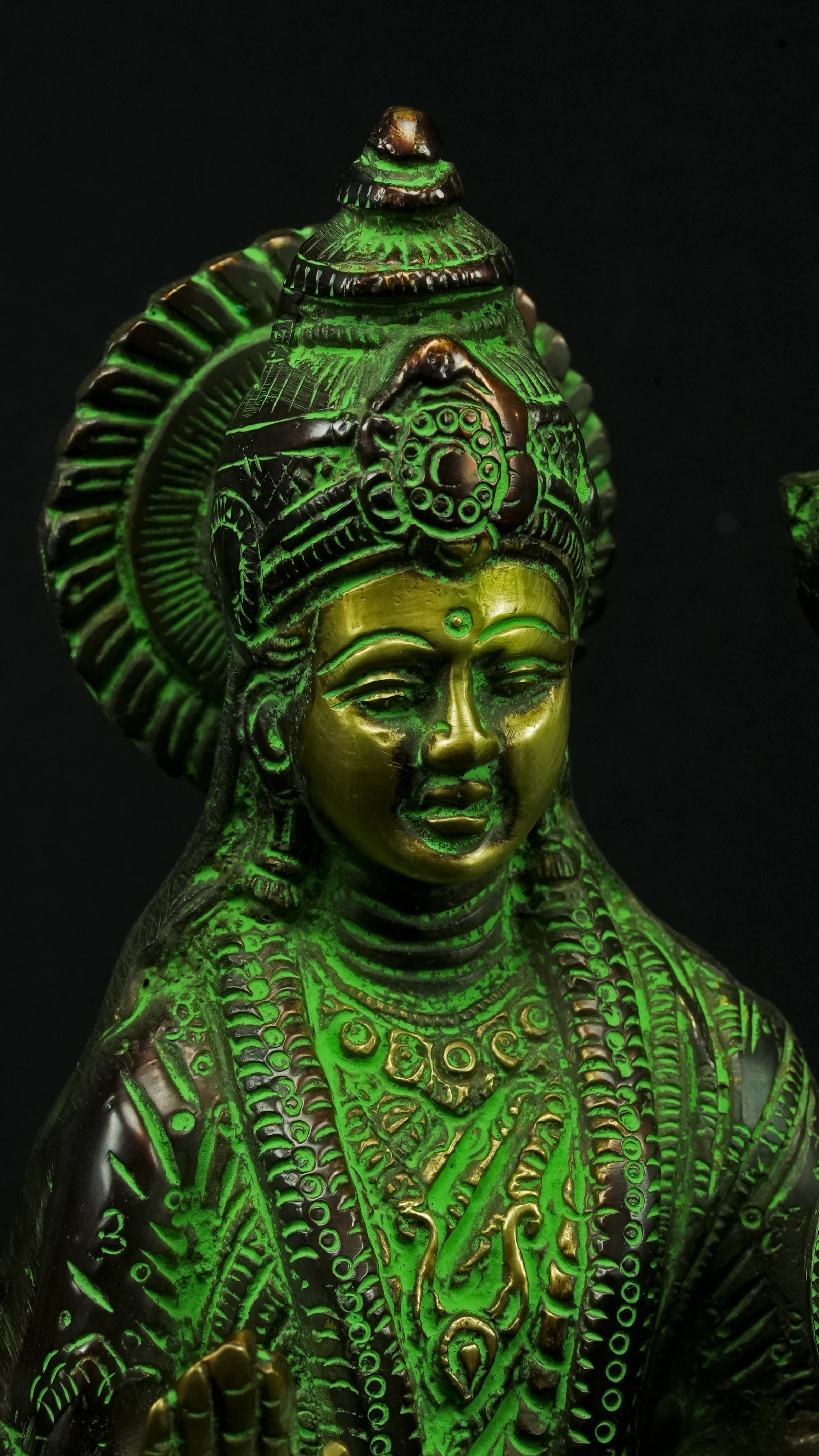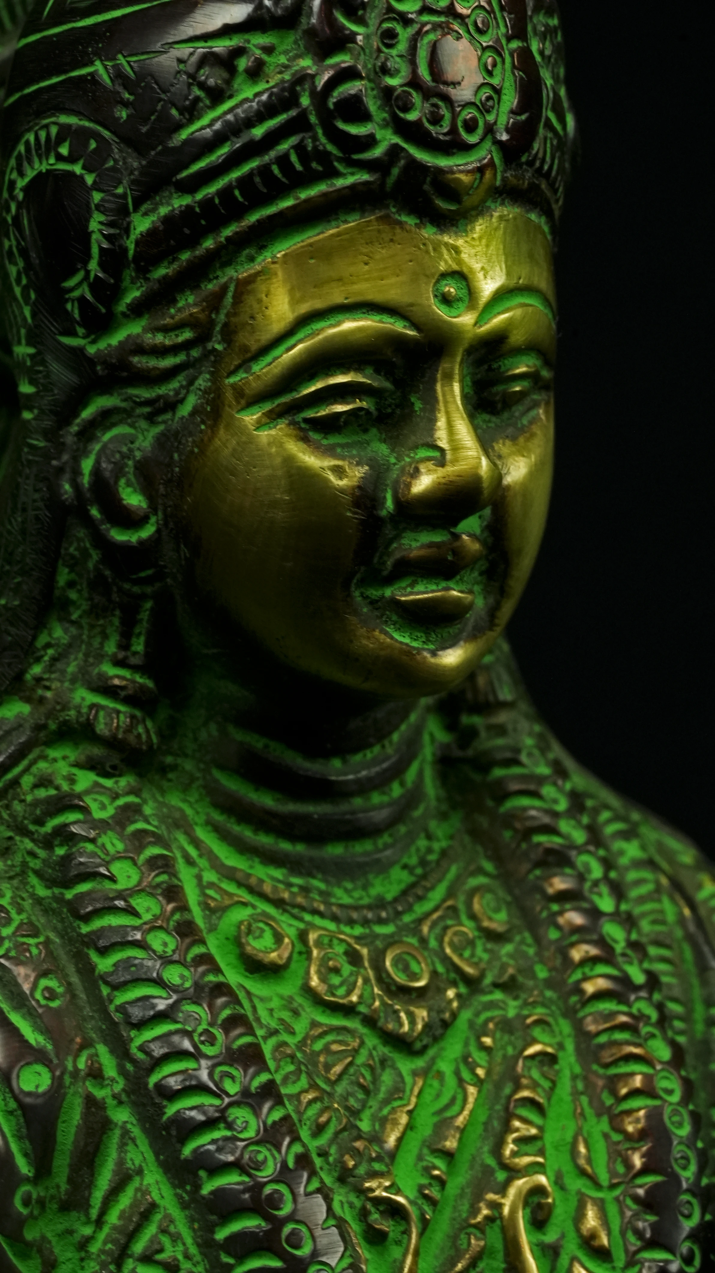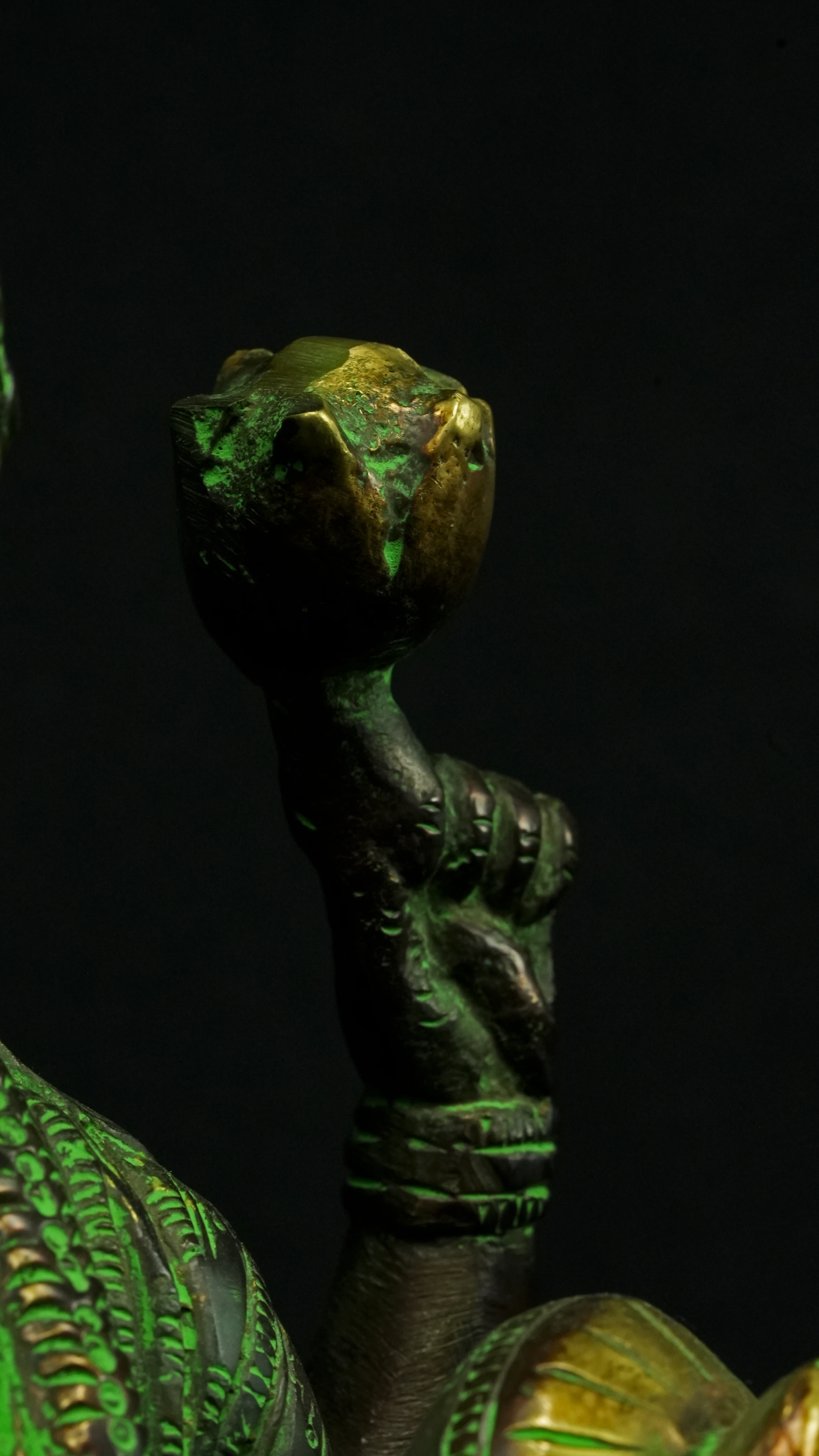 Cette statue de Dhanvantari, à la patine dorée et verte, incarne la puissance de la guérison dans sa forme la plus pure : à la fois médecine sacrée et lumière consciente. Debout sur un lotus, elle symbolise l’équilibre parfait entre la connaissance des lois naturelles et la Grâce divine qui régénère. Le vert vibrant évoque le prāna, la nature et le cœur, tandis que l’or de ses ornements rappelle la clarté intérieure indispensable à tout véritable processus de guérison.