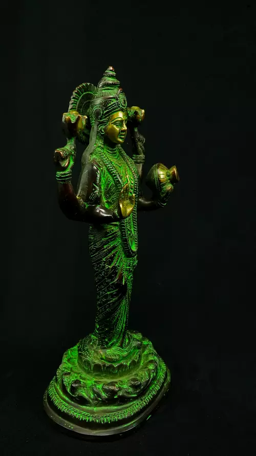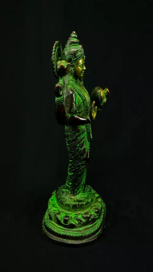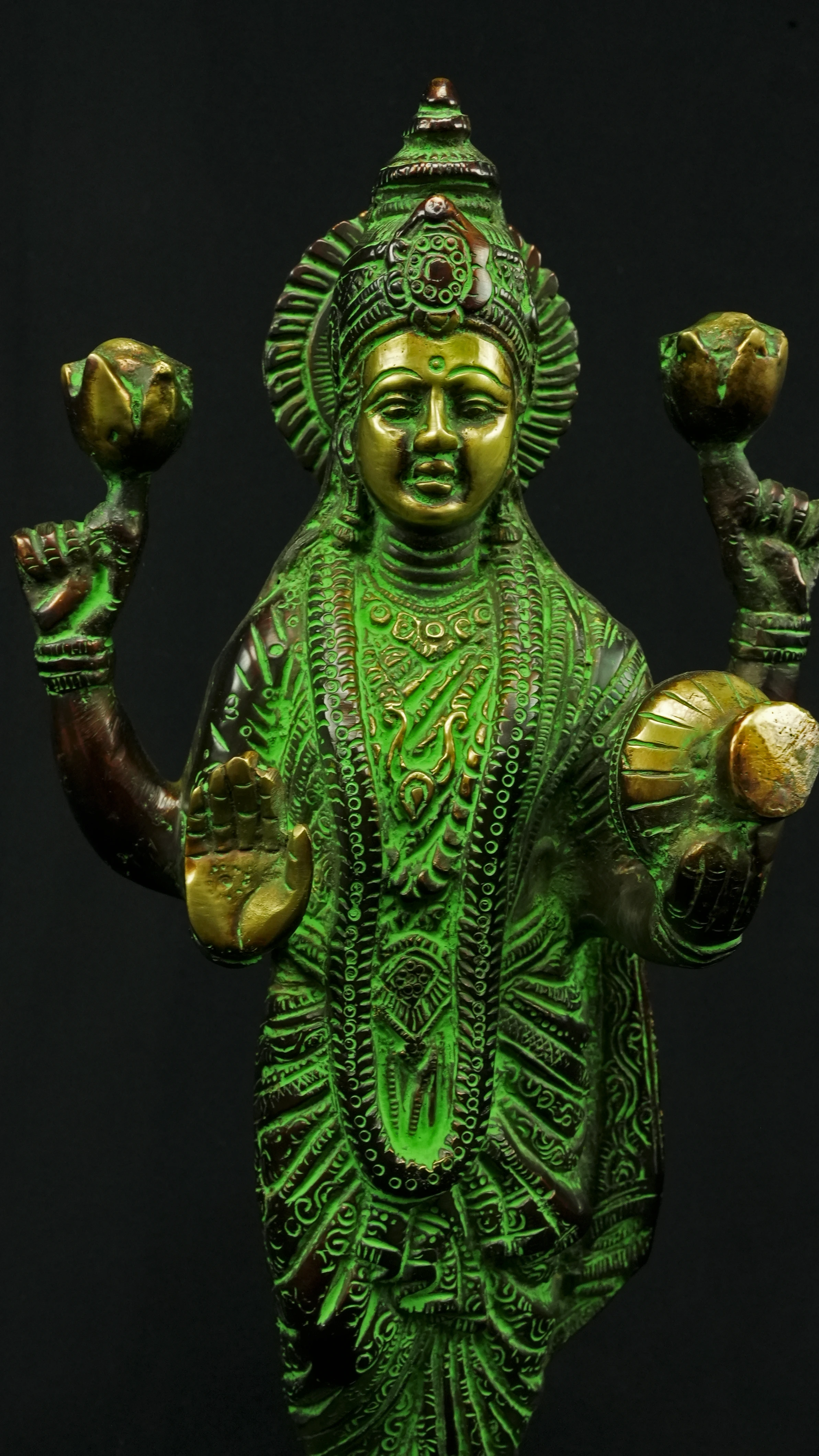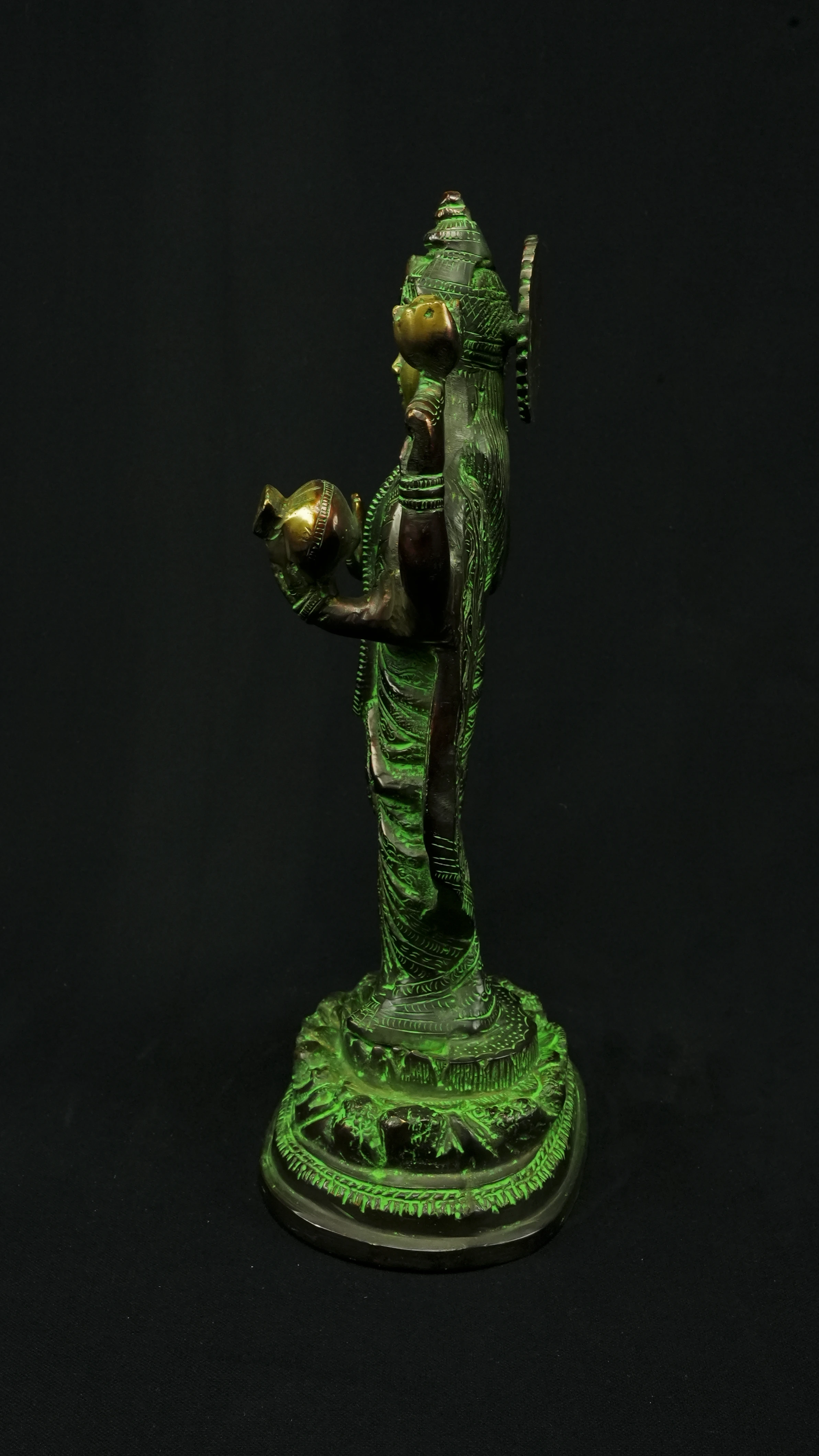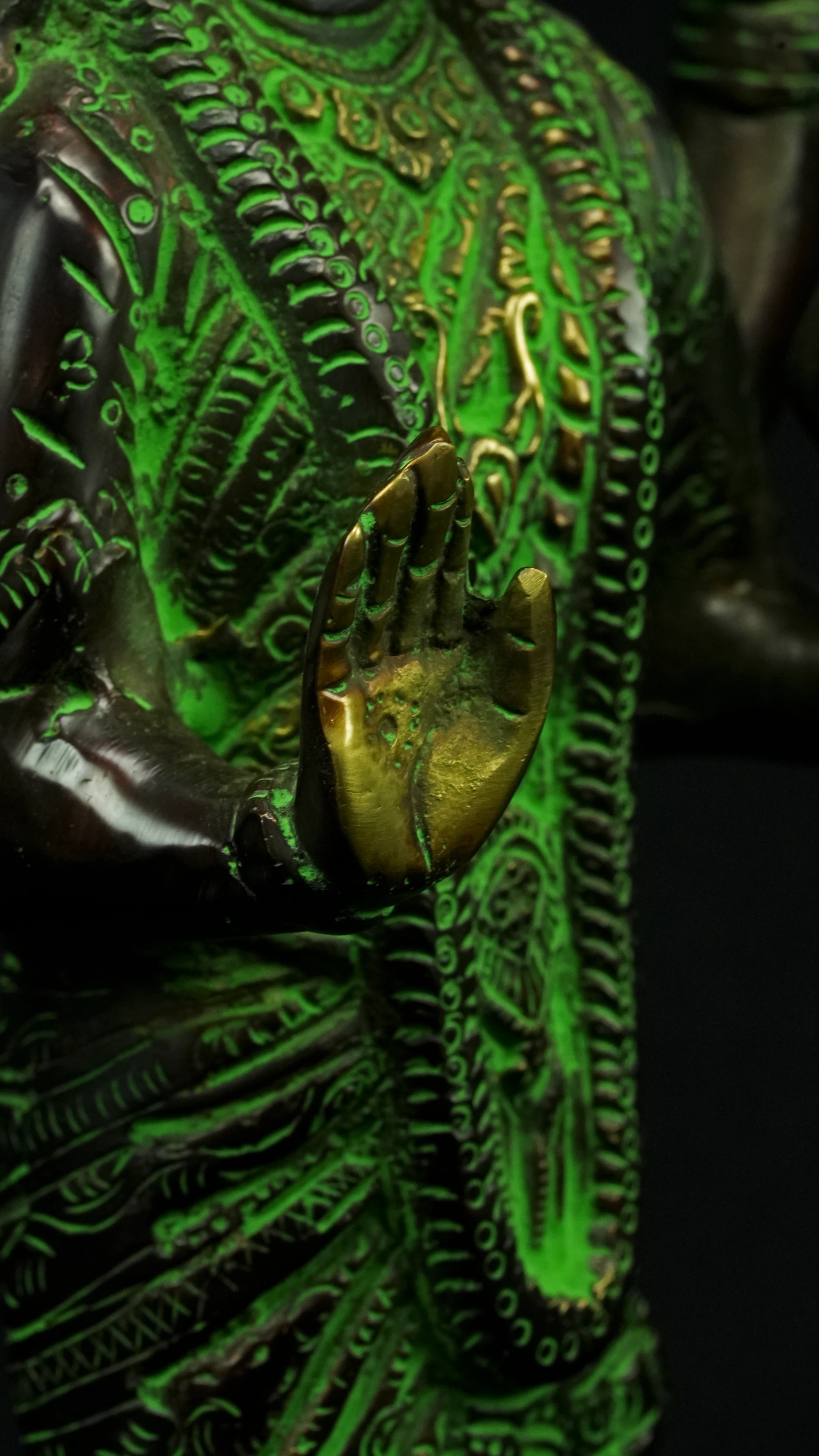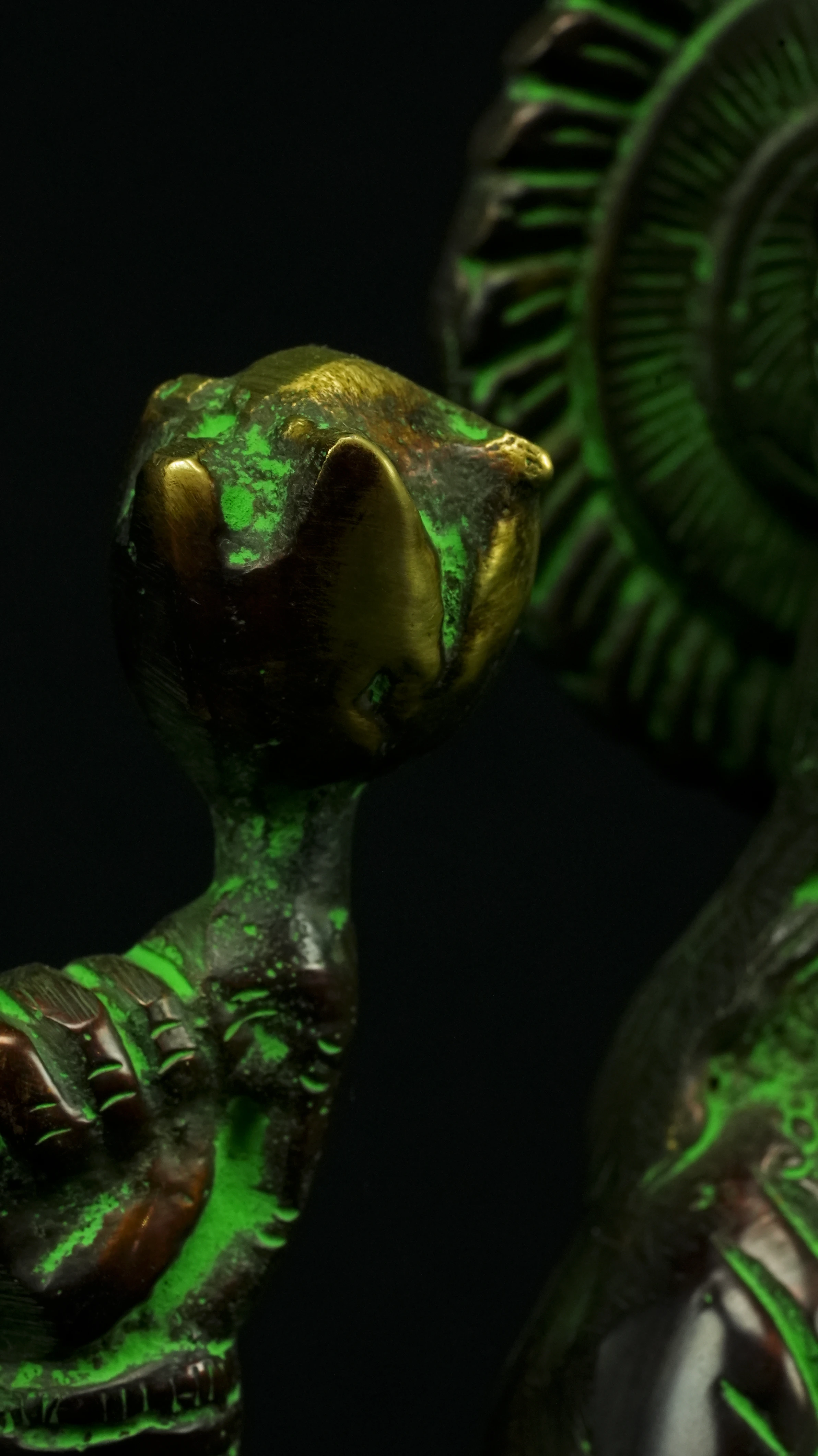 Cette statue de Dhanvantari, à la patine dorée et verte, incarne la puissance de la guérison dans sa forme la plus pure : à la fois médecine sacrée et lumière consciente. Debout sur un lotus, elle symbolise l’équilibre parfait entre la connaissance des lois naturelles et la Grâce divine qui régénère. Le vert vibrant évoque le prāna, la nature et le cœur, tandis que l’or de ses ornements rappelle la clarté intérieure indispensable à tout véritable processus de guérison.