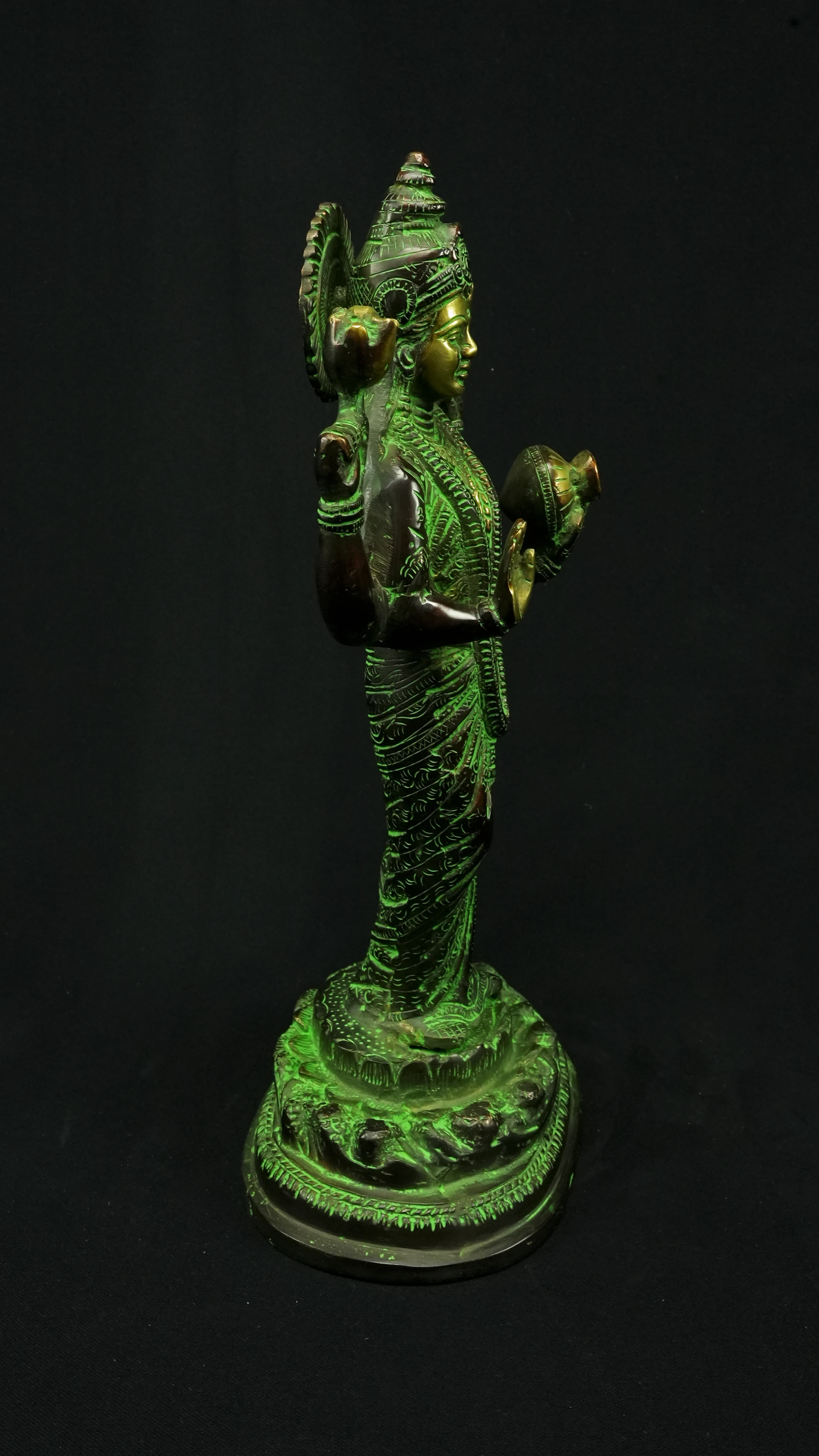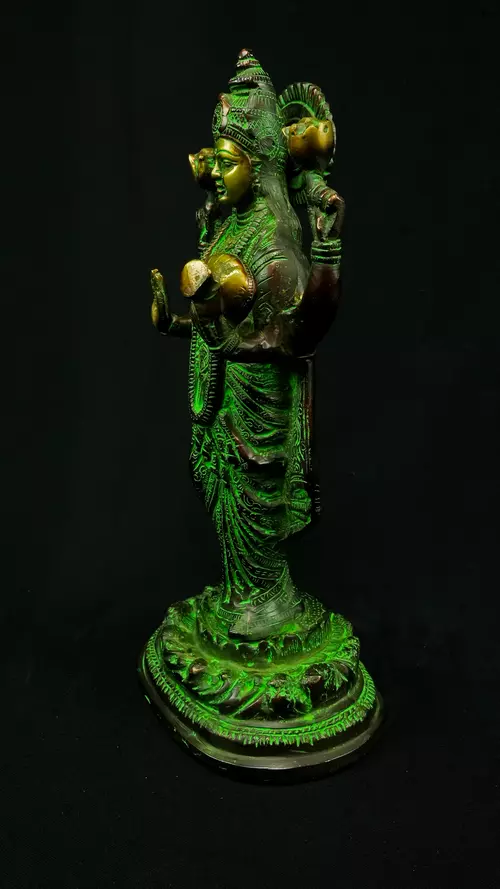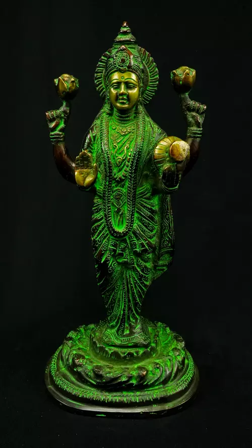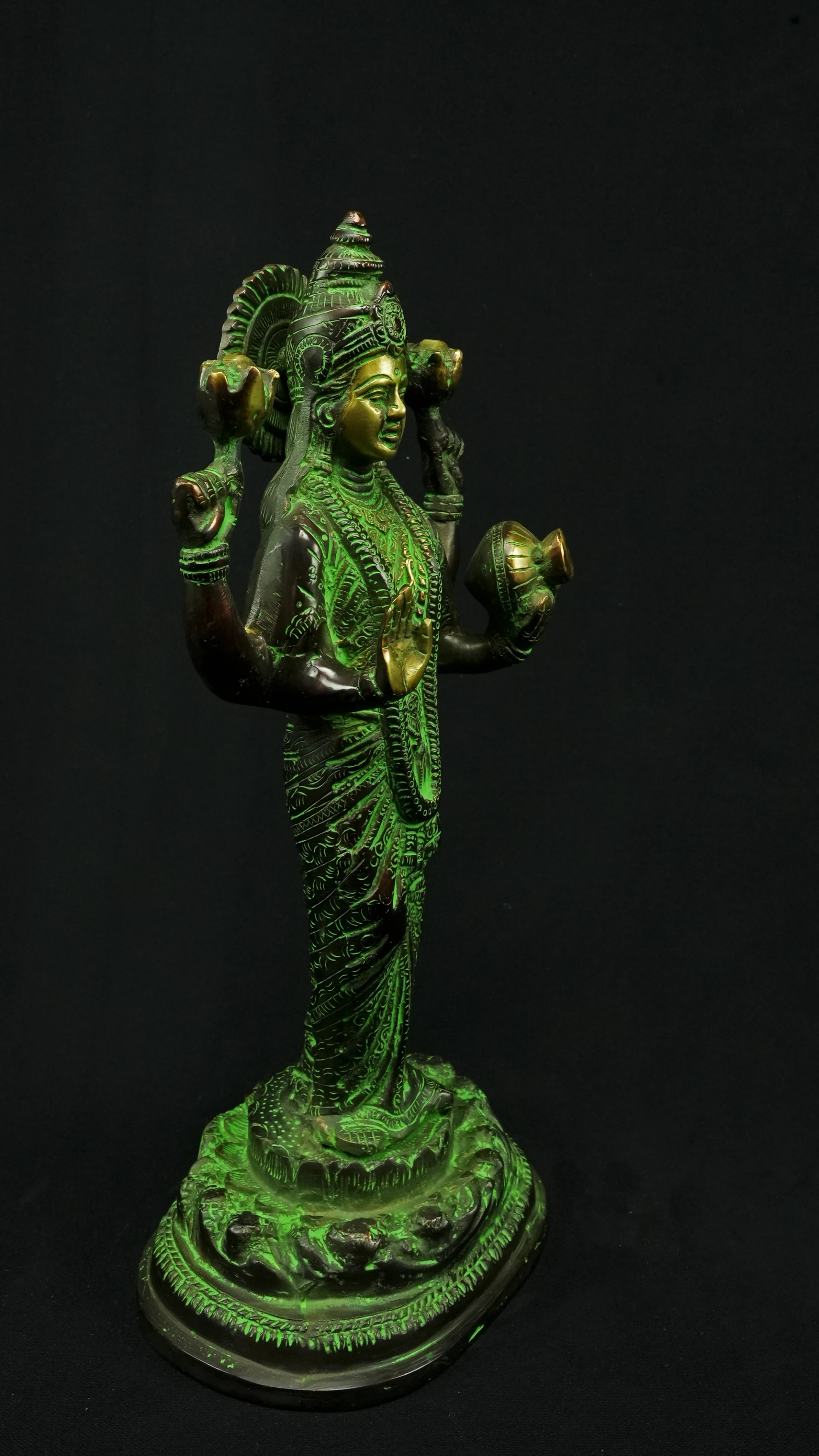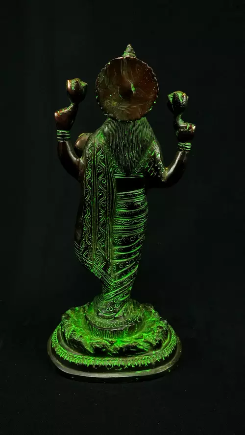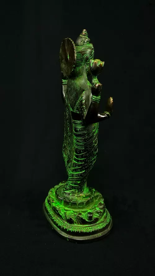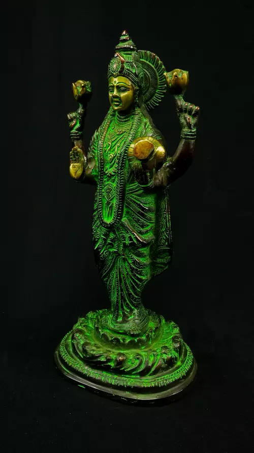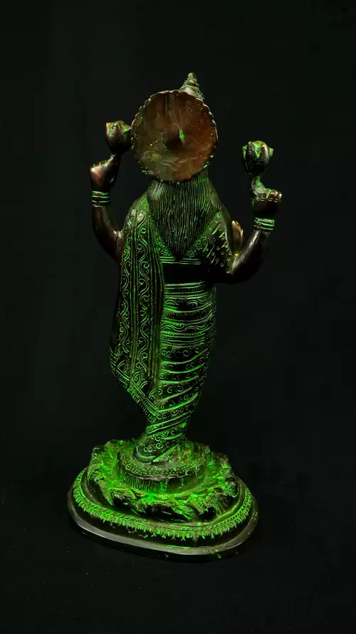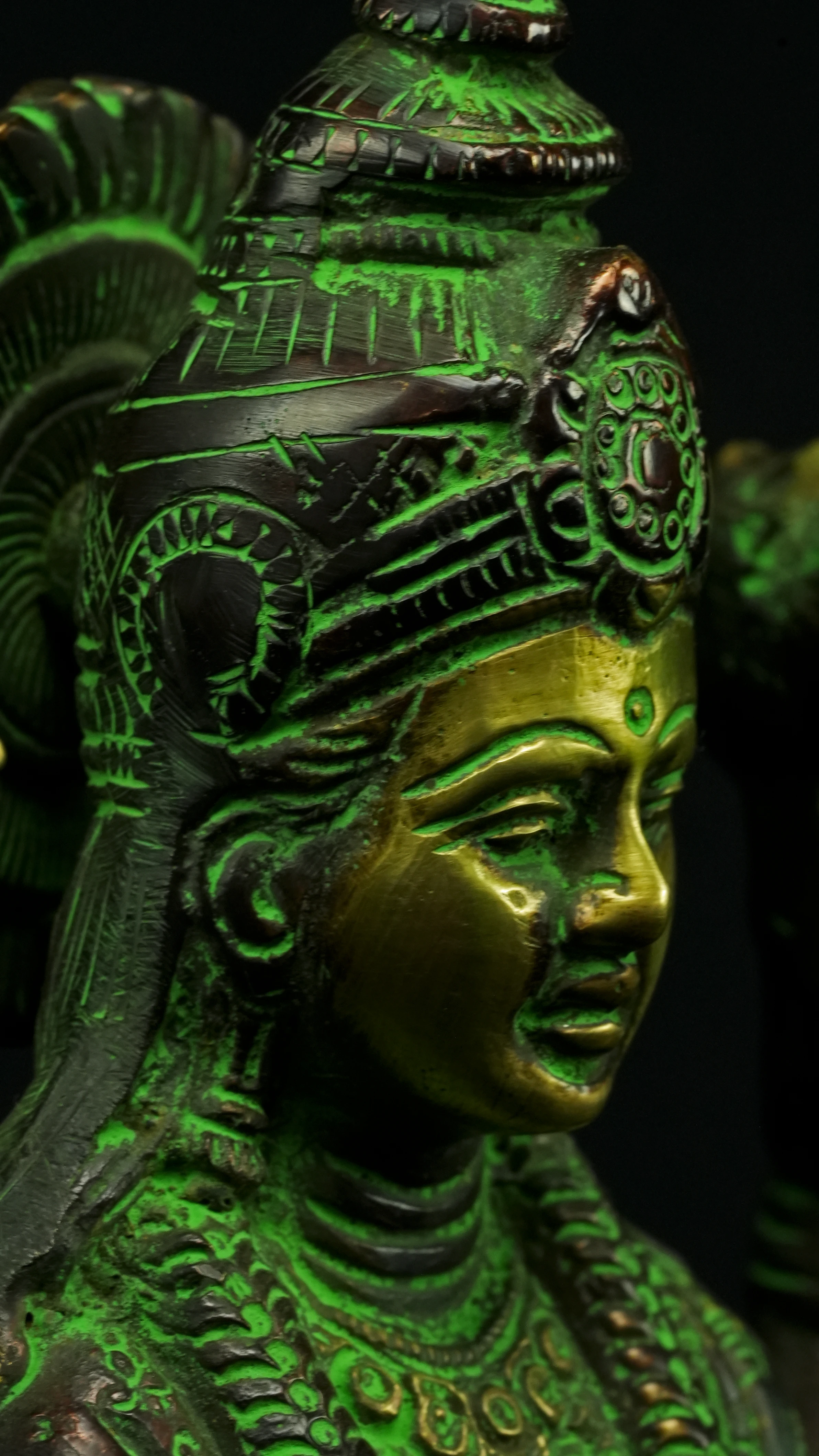 Cette statue de Dhanvantari, à la patine dorée et verte, incarne la puissance de la guérison dans sa forme la plus pure : à la fois médecine sacrée et lumière consciente. Debout sur un lotus, elle symbolise l’équilibre parfait entre la connaissance des lois naturelles et la Grâce divine qui régénère. Le vert vibrant évoque le prāna, la nature et le cœur, tandis que l’or de ses ornements rappelle la clarté intérieure indispensable à tout véritable processus de guérison.