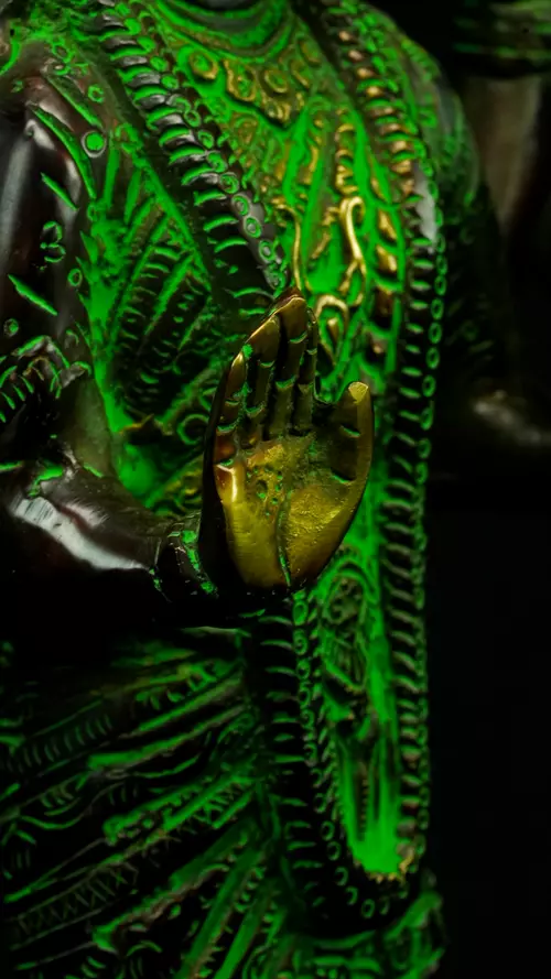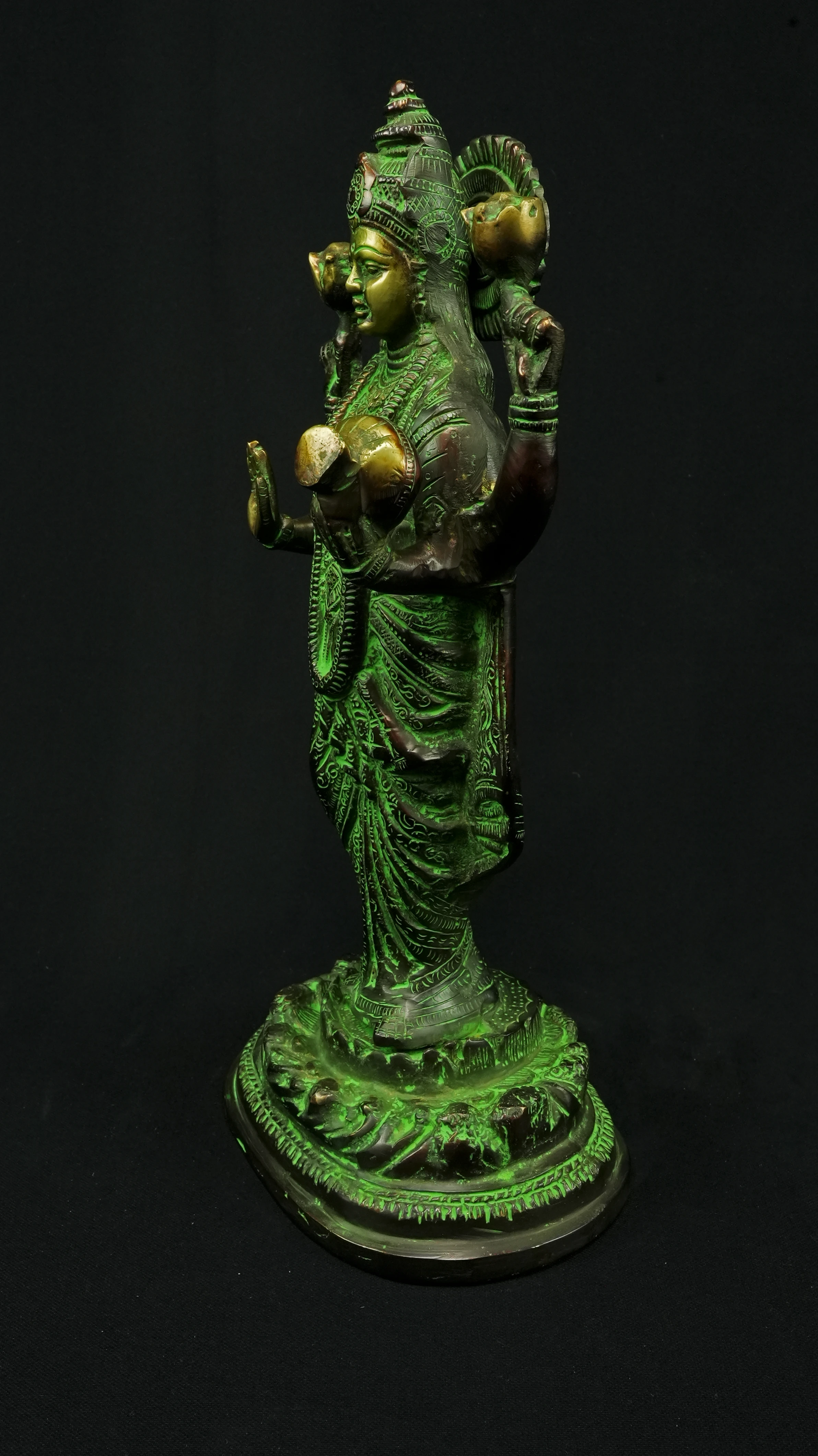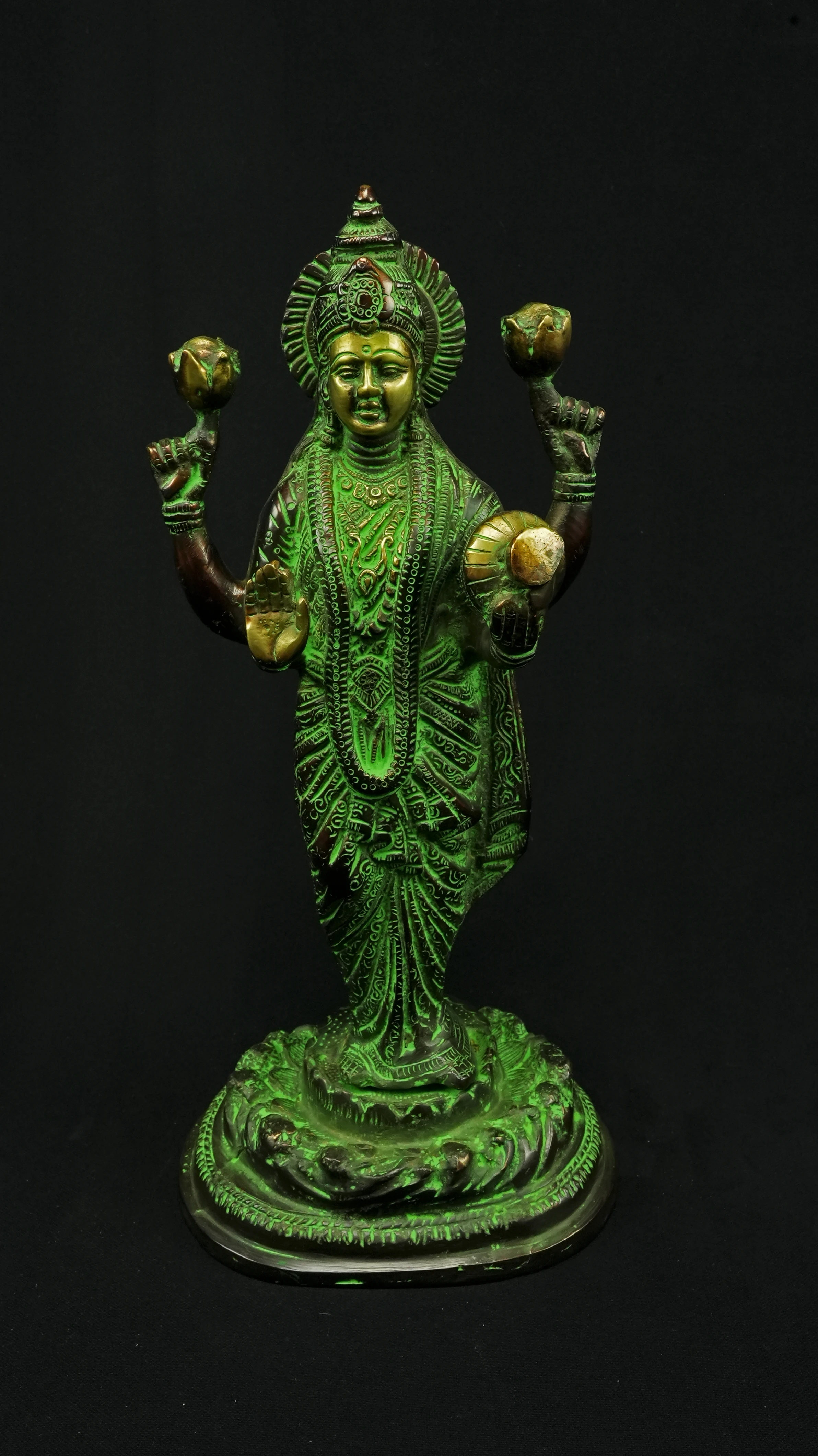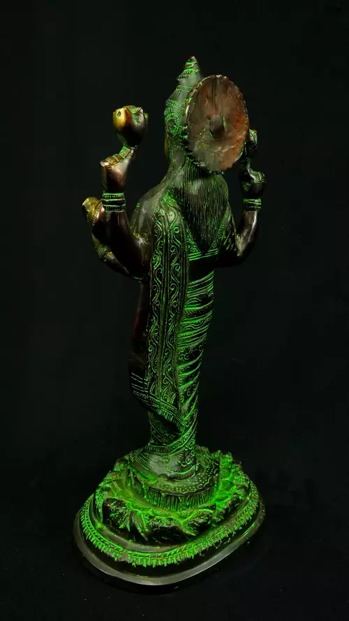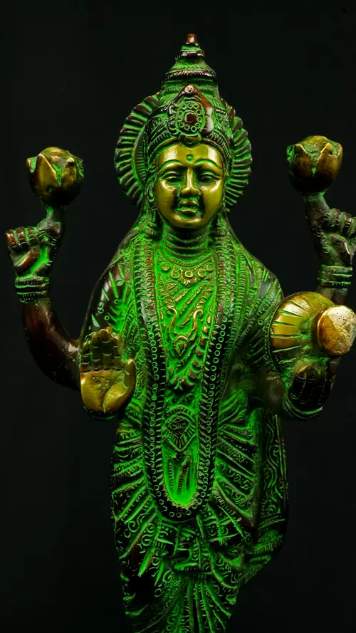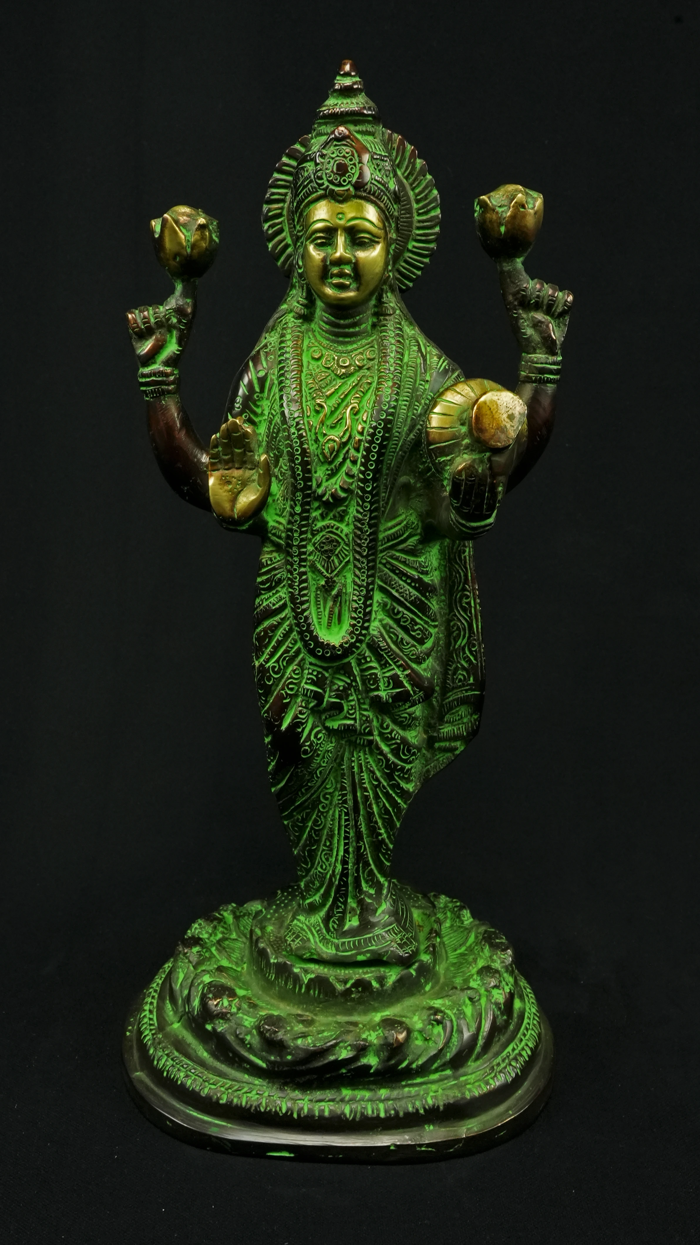 Cette statue de Dhanvantari, à la patine dorée et verte, incarne la puissance de la guérison dans sa forme la plus pure : à la fois médecine sacrée et lumière consciente. Debout sur un lotus, elle symbolise l’équilibre parfait entre la connaissance des lois naturelles et la Grâce divine qui régénère. Le vert vibrant évoque le prāna, la nature et le cœur, tandis que l’or de ses ornements rappelle la clarté intérieure indispensable à tout véritable processus de guérison.