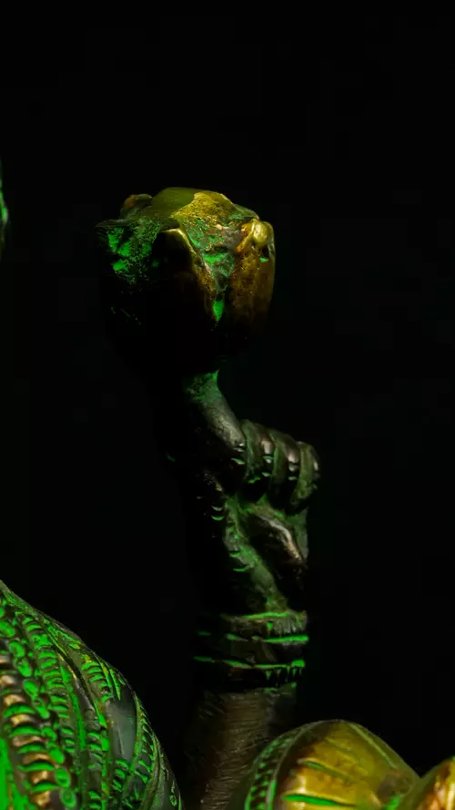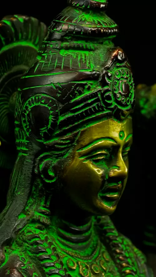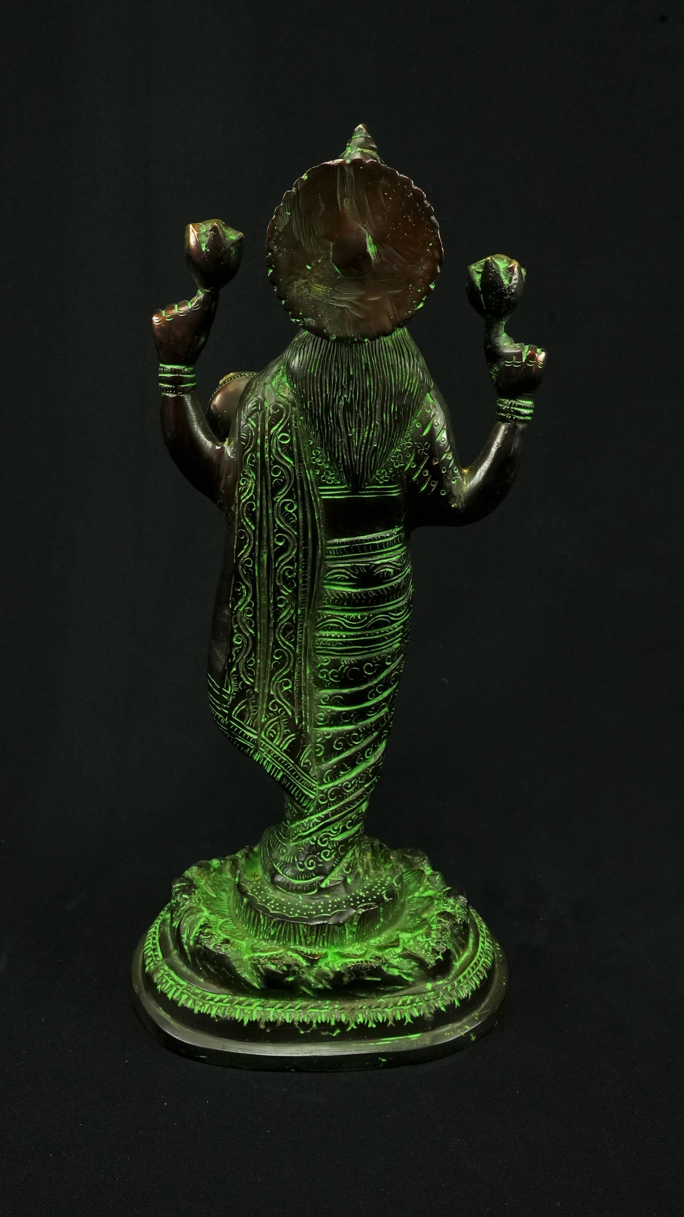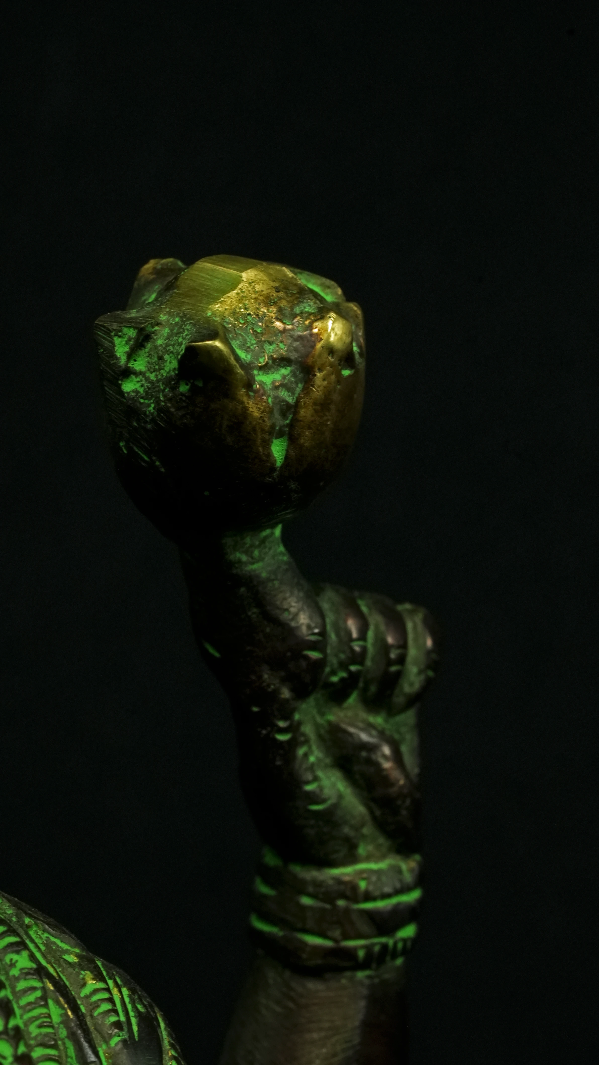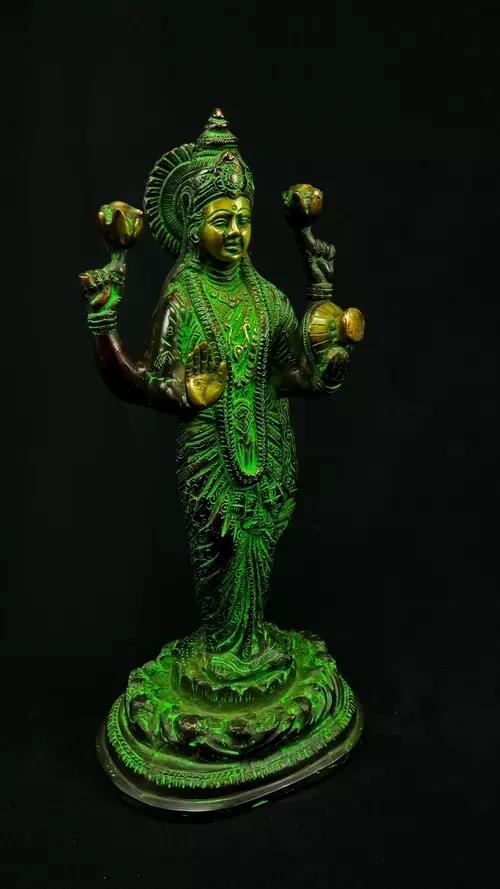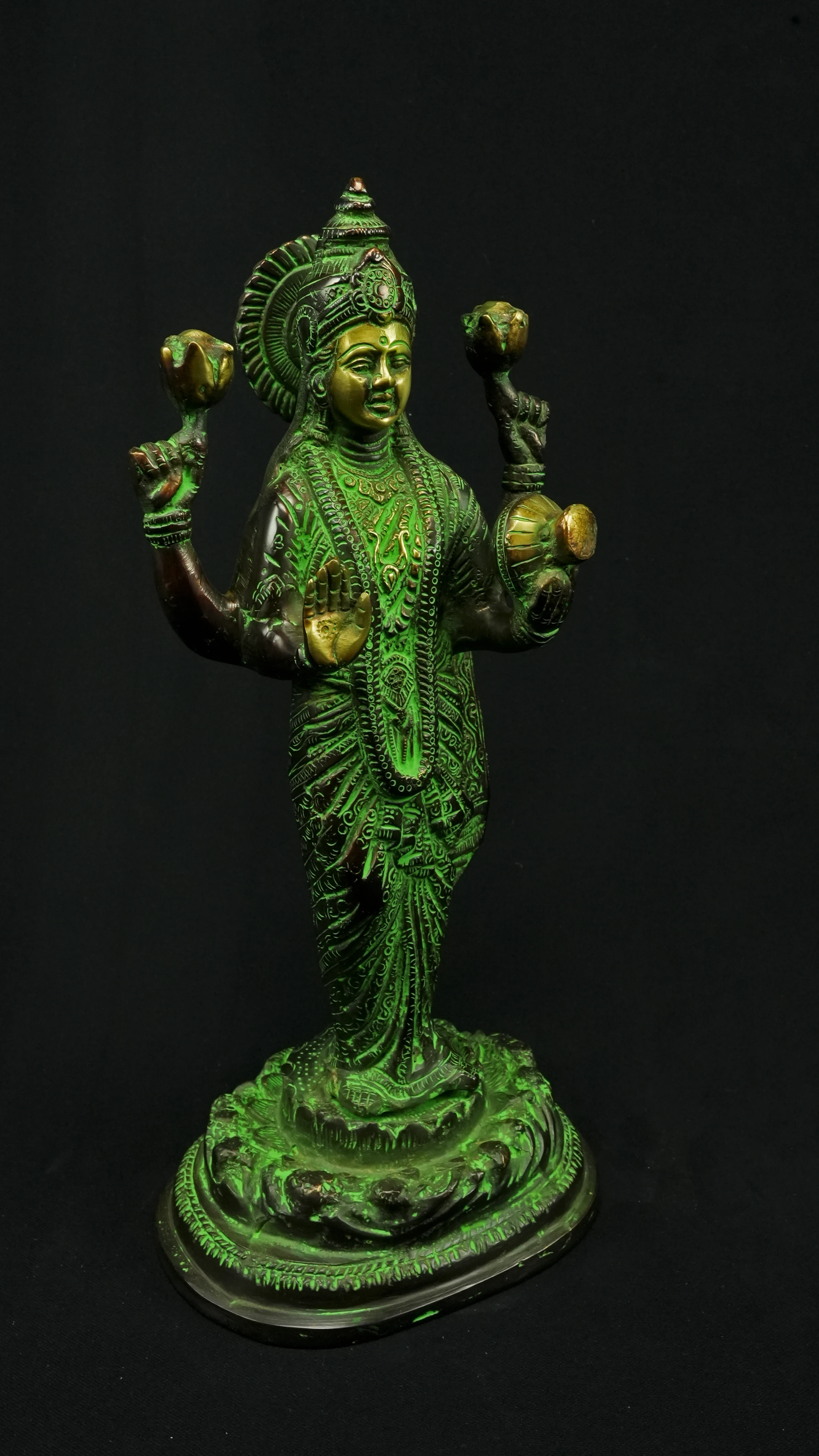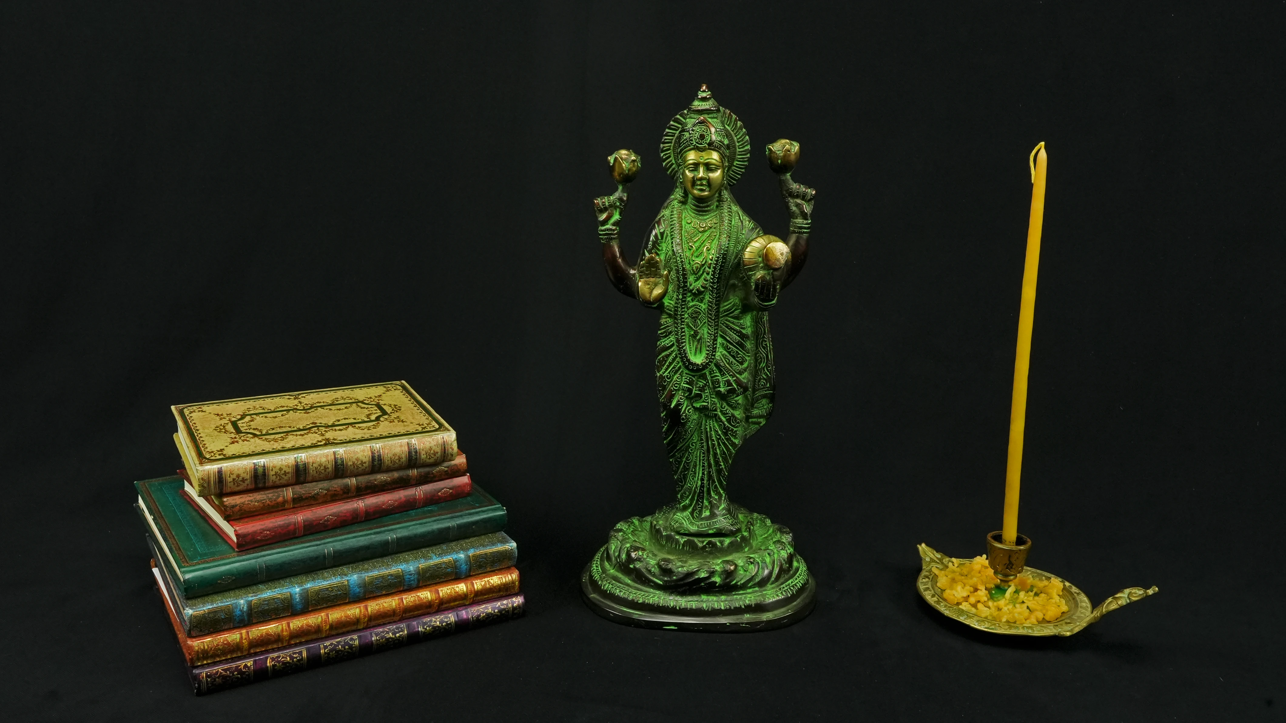 Cette statue de Dhanvantari, à la patine dorée et verte, incarne la puissance de la guérison dans sa forme la plus pure : à la fois médecine sacrée et lumière consciente. Debout sur un lotus, elle symbolise l’équilibre parfait entre la connaissance des lois naturelles et la Grâce divine qui régénère. Le vert vibrant évoque le prāna, la nature et le cœur, tandis que l’or de ses ornements rappelle la clarté intérieure indispensable à tout véritable processus de guérison.