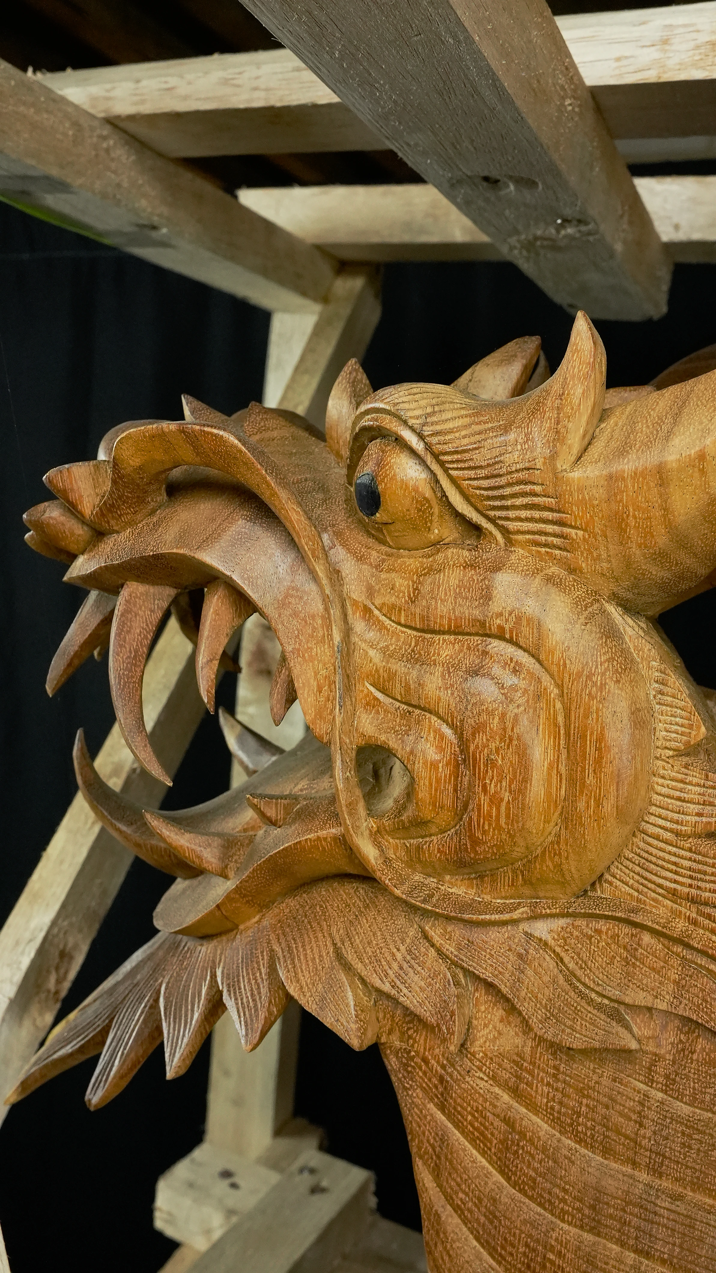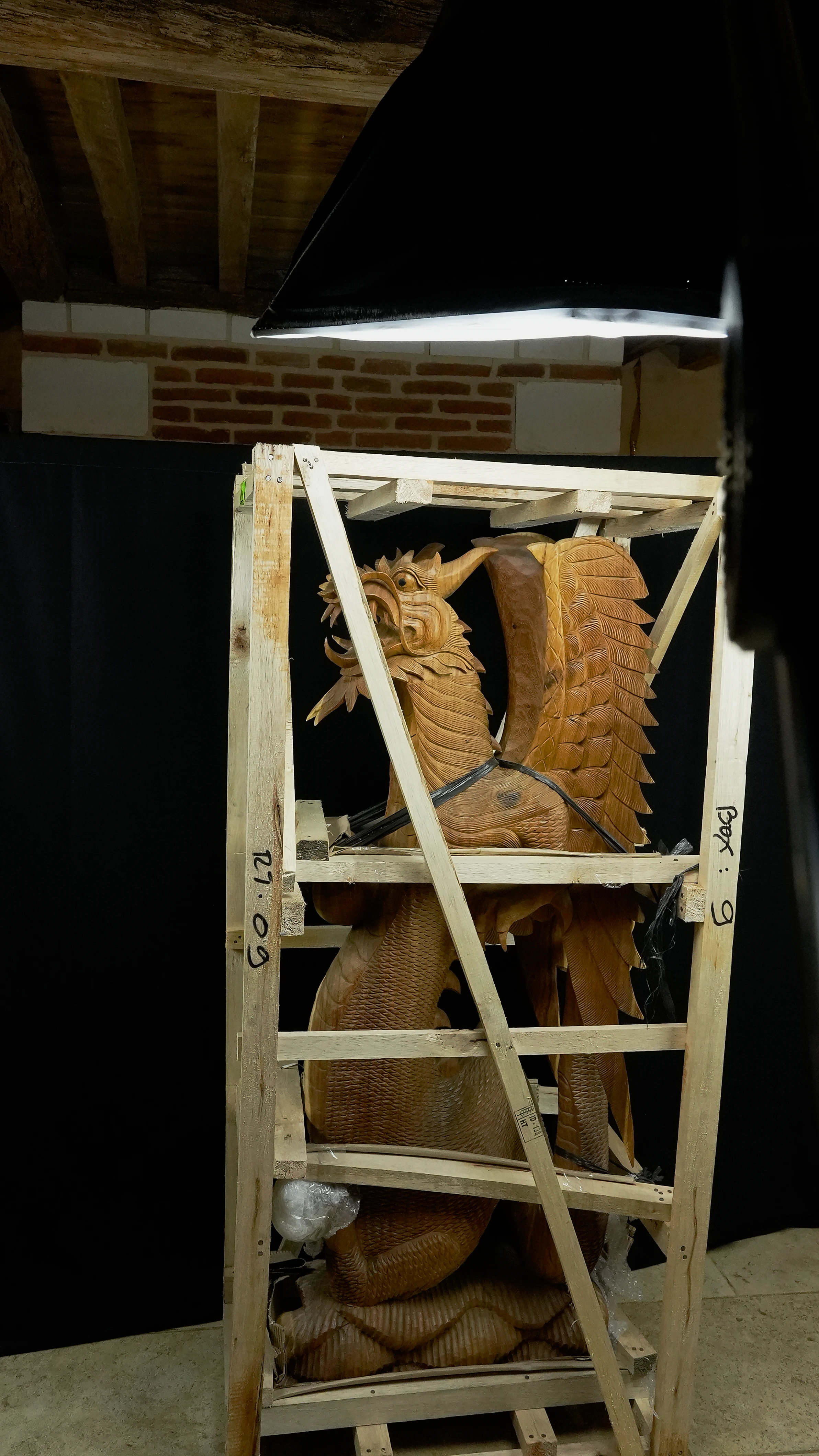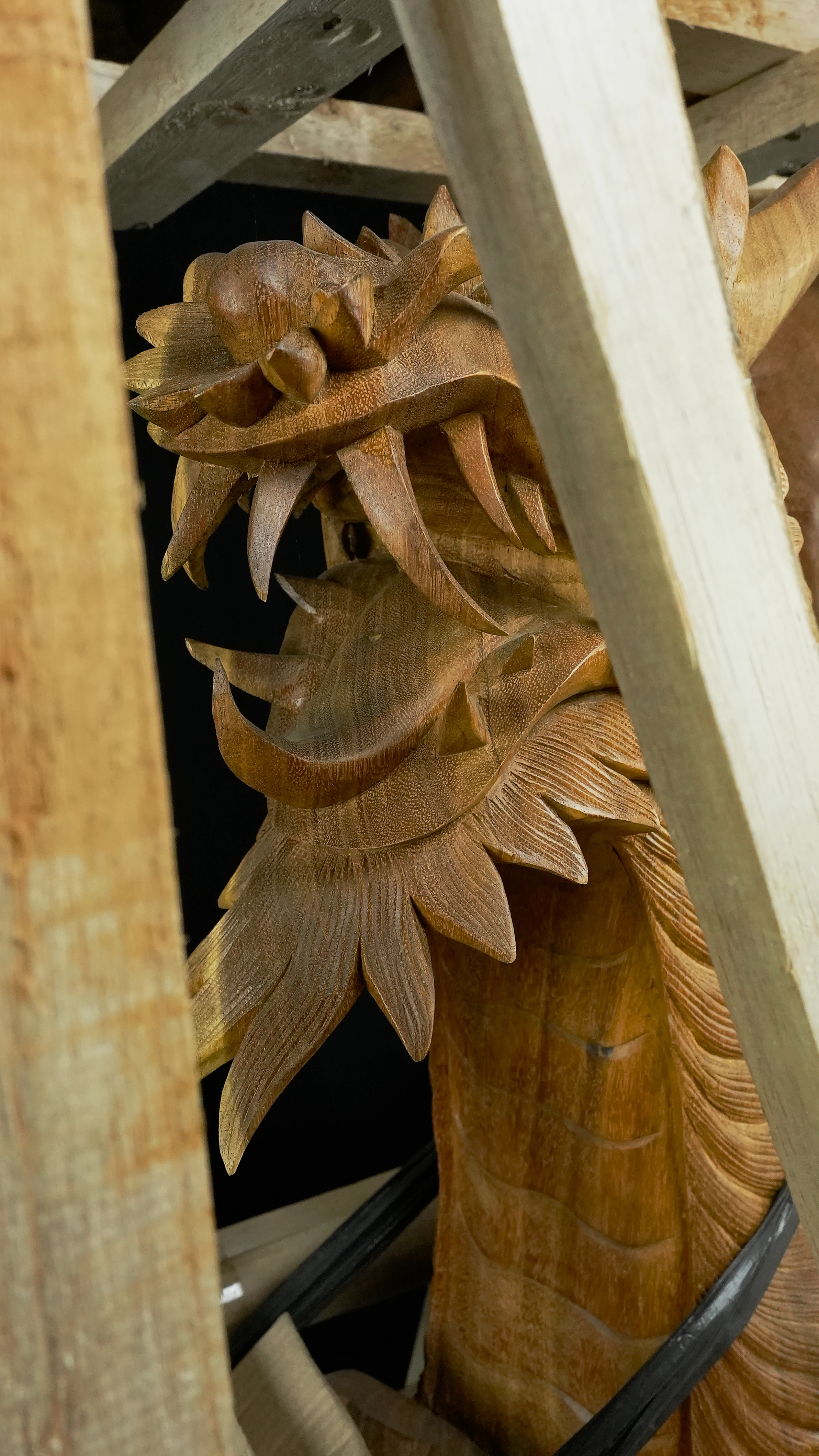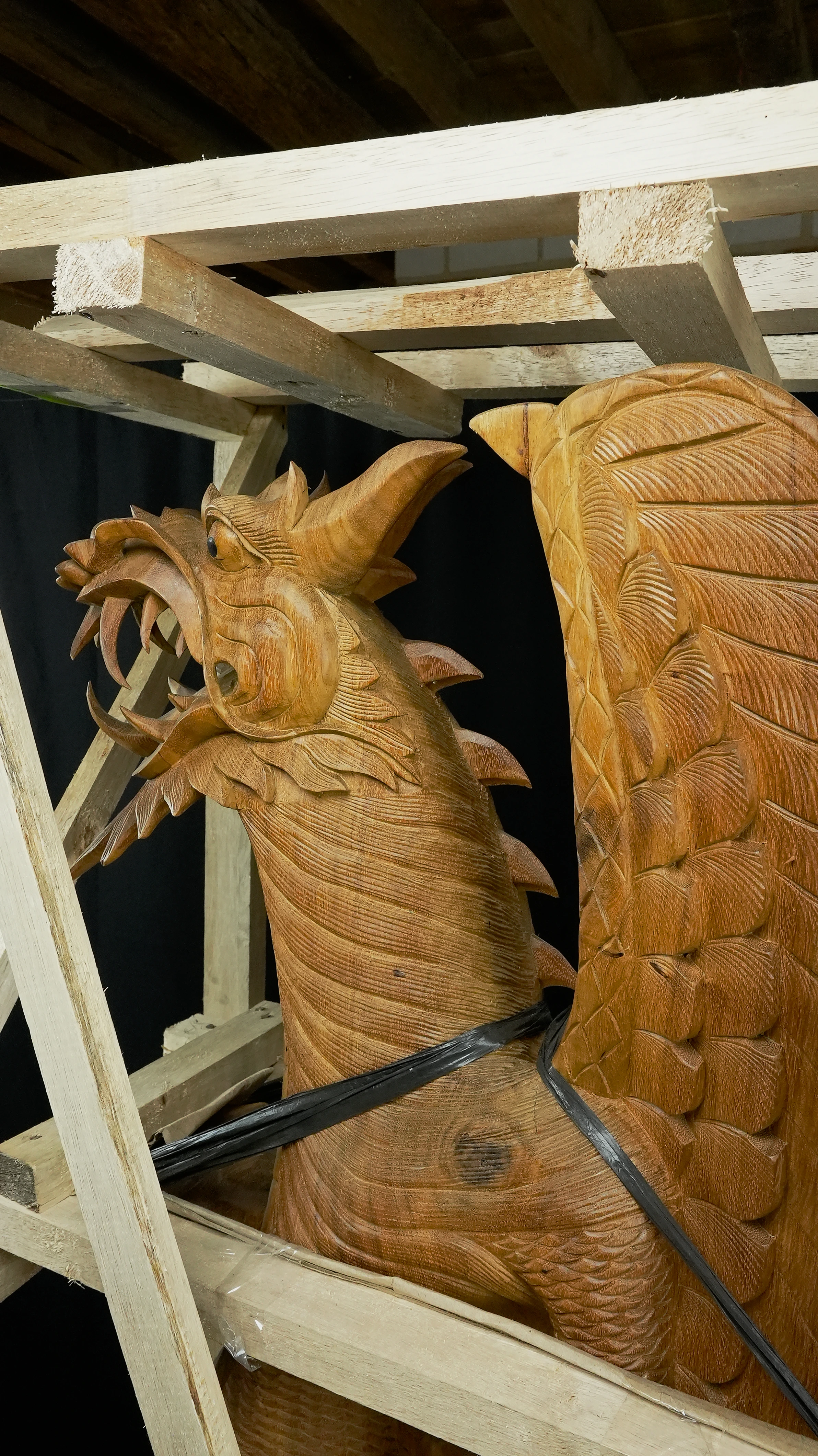 - 1x Statue avatarisée de Dragon en Bois de Suar : 58.8 kg, 148 cm de hauteur, 42 cm de longueur et 60 cm de largeur. Origine : Java, Indonésia.