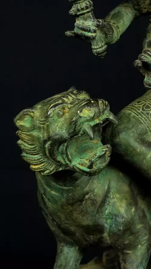 - Lien avec le Félin Sacré : Durga chevauche un lion ou un tigre, symboles de courage, d’instinct et de domination sur les forces du chaos. Elle convient particulièrement aux présences lié aux félins, ou au-moins à la symbolique.