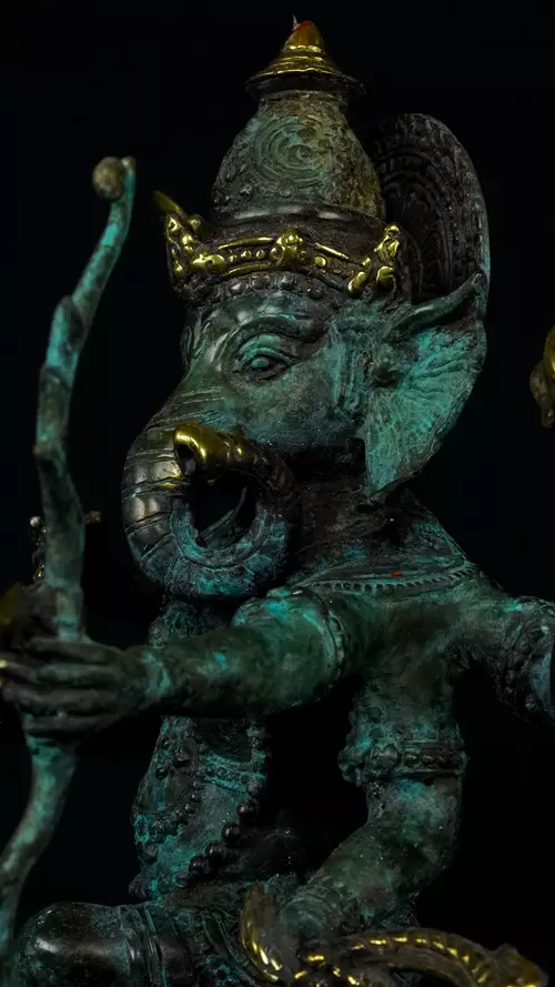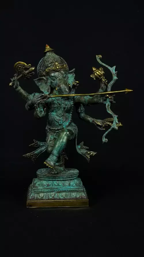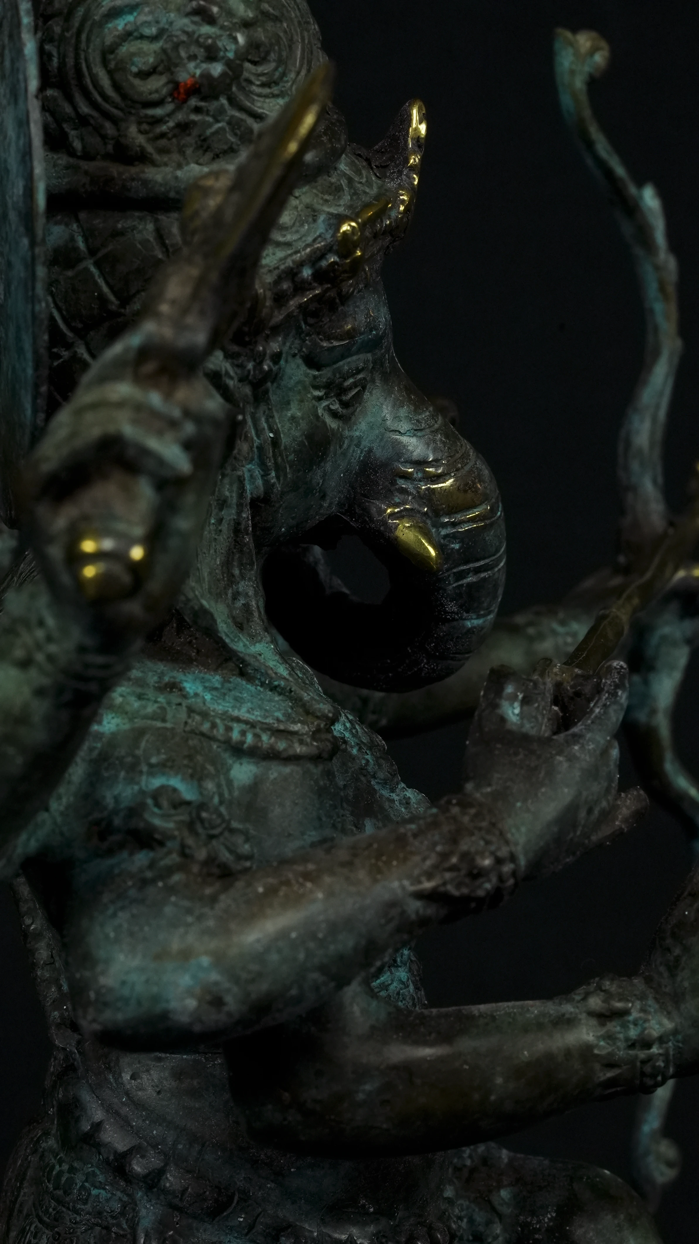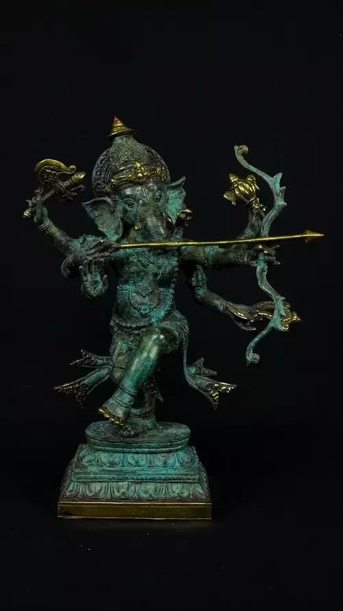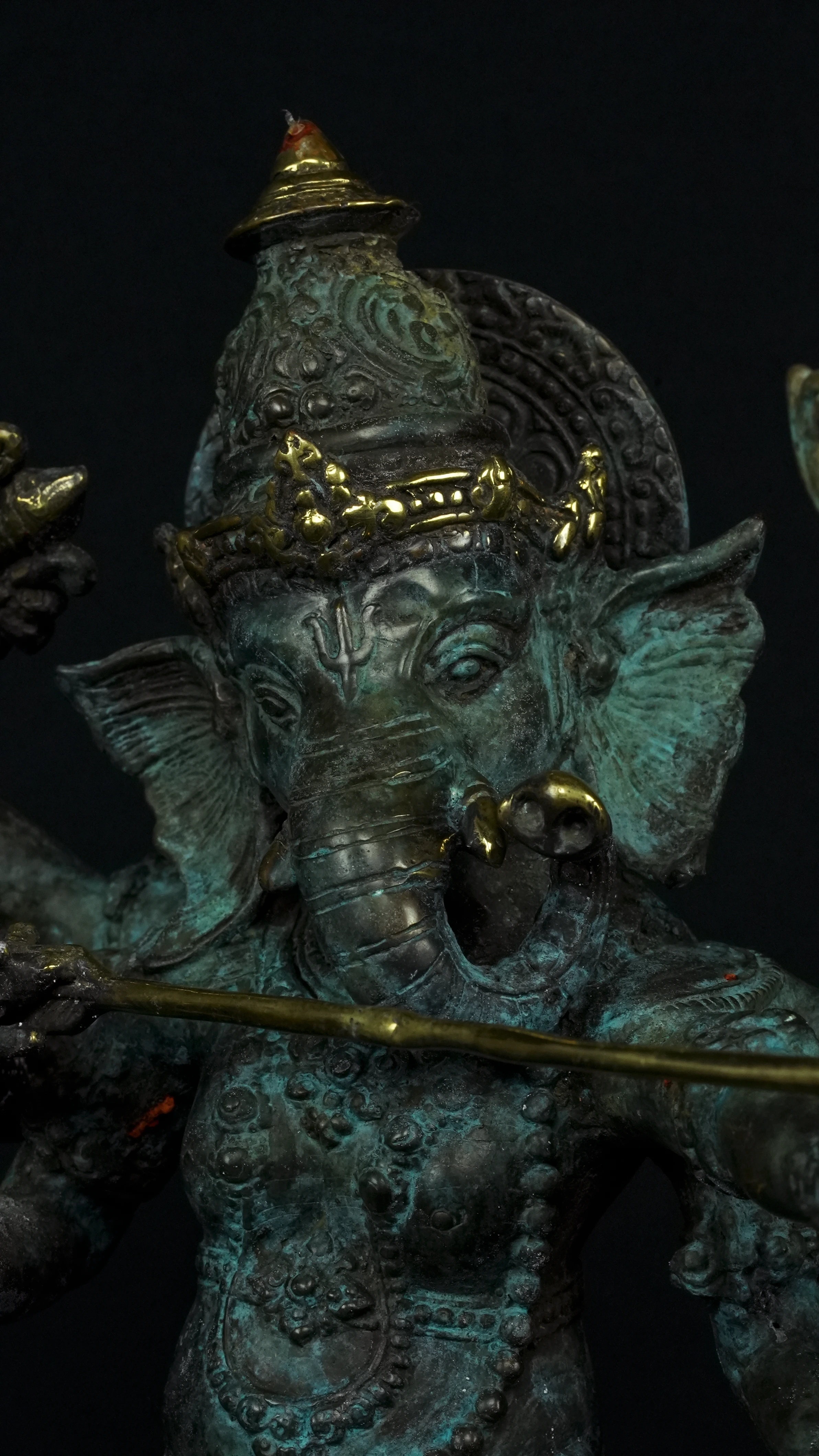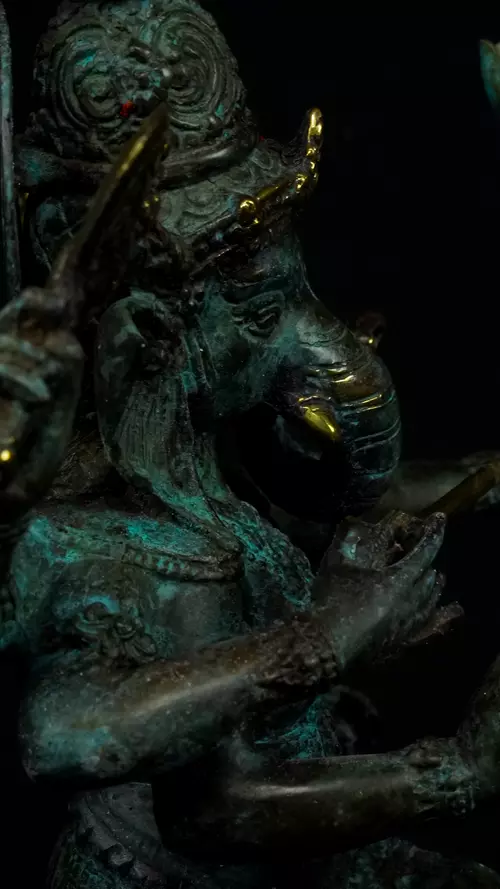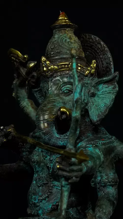 Ganesh incarne le courage et la détermination. Il affronte les entités malveillantes et repousse les ténèbres sur tous les plans d'existence. Ses actions héroïques garantissent la sécurité et la prospérité, que ce soit sur Terre ou dans les dimensions invisibles.