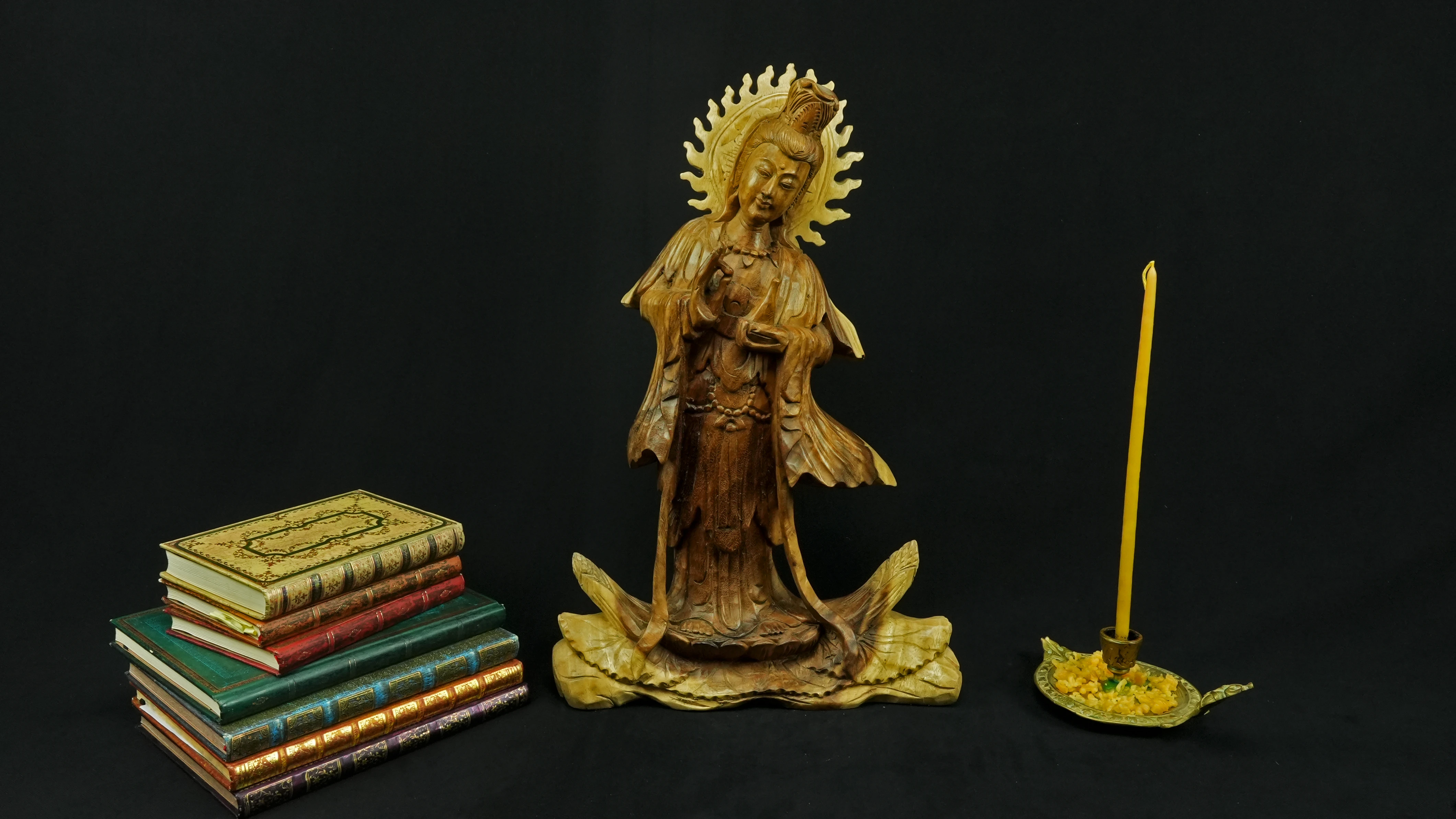 Rayonnant depuis son autel, elle diffuse une énergie de paix active, capable d’éclairer les zones confuses, de purifier les émotions et de stabiliser l’abondance intérieure. Le vase qu’elle porte, son mudrā d’offrande et son auréole solaire manifestent l’union vivante de la compassion, de la lucidité et de la maîtrise intérieure. Elle t’accompagne dans l’alchimie subtile de l’éveil : un chemin où l’amour se marie à la sagesse, où la clarté s’ancre dans le corps, et où la perception s’affine pour mieux servir.