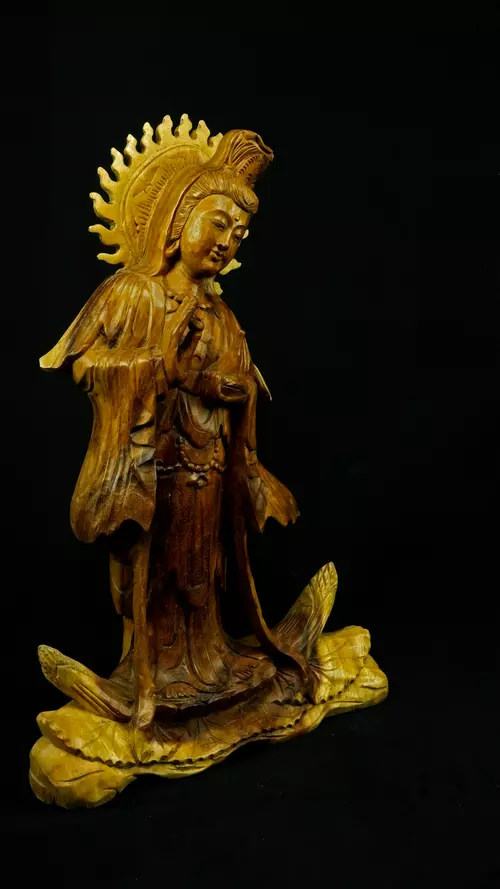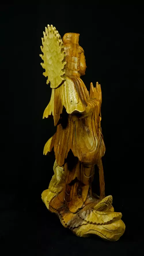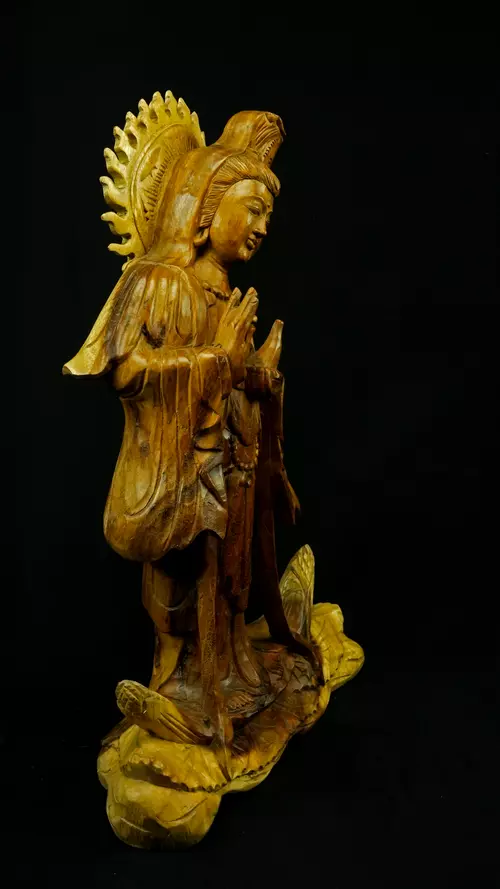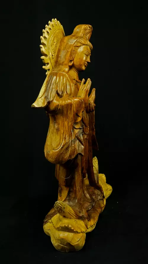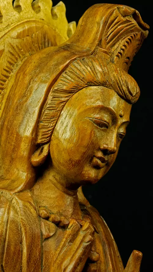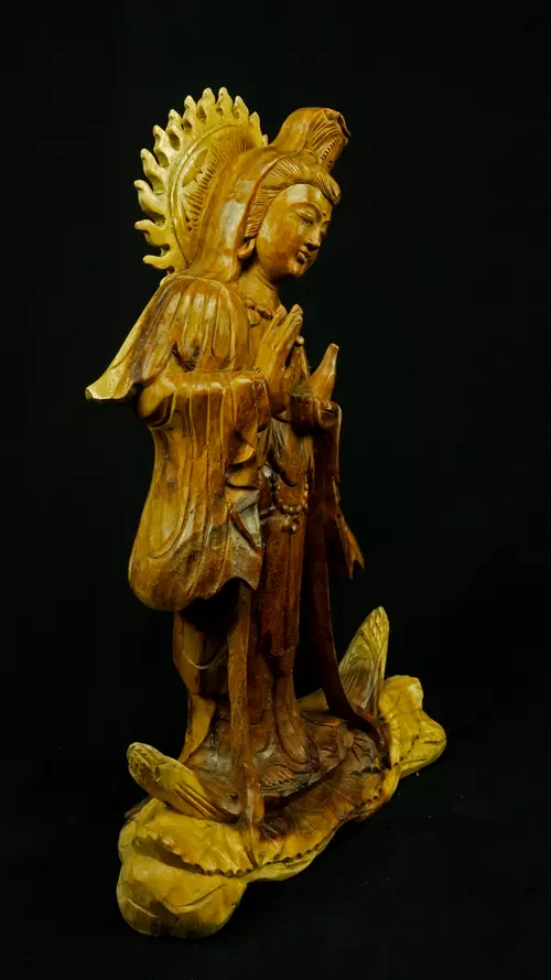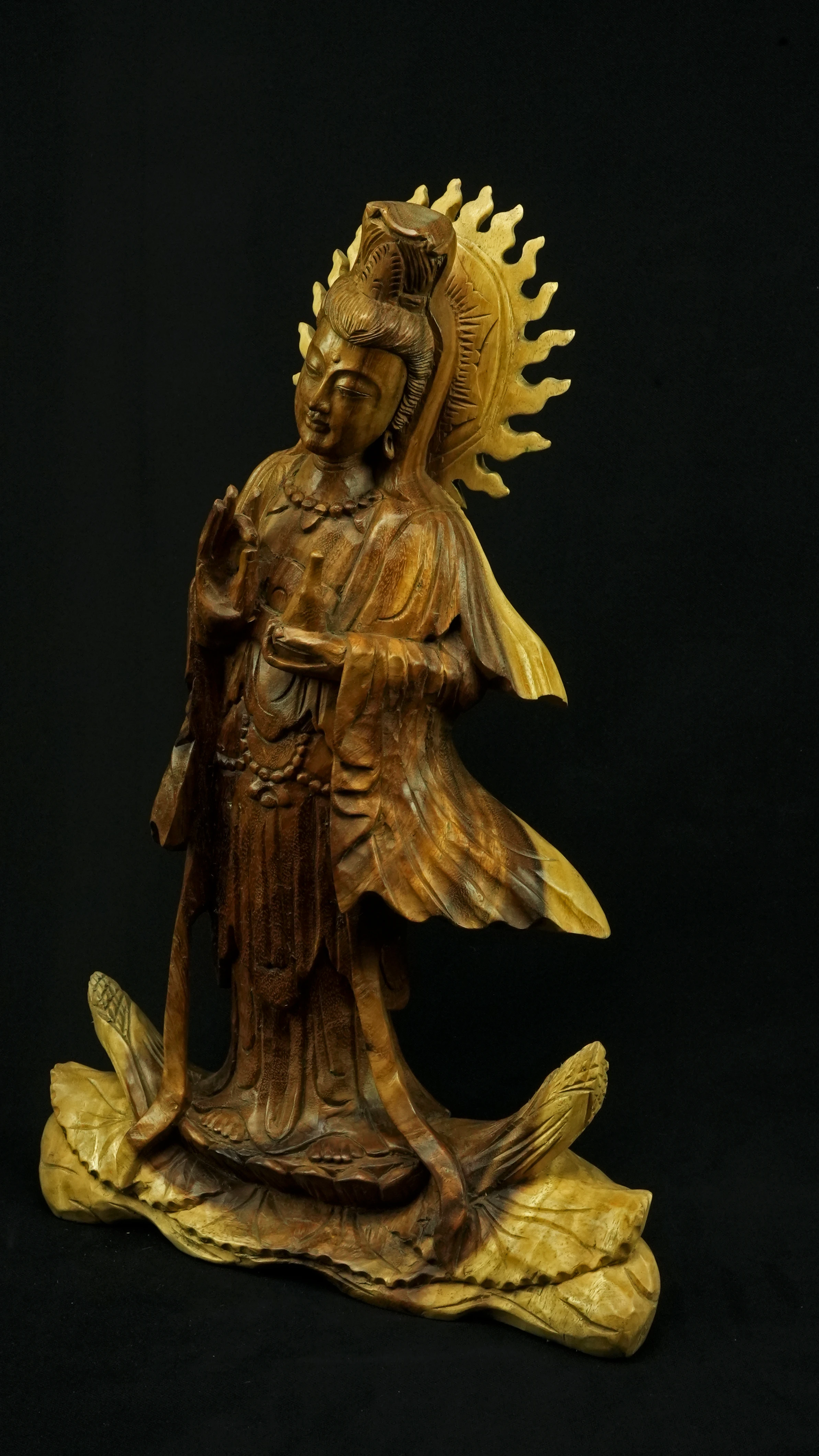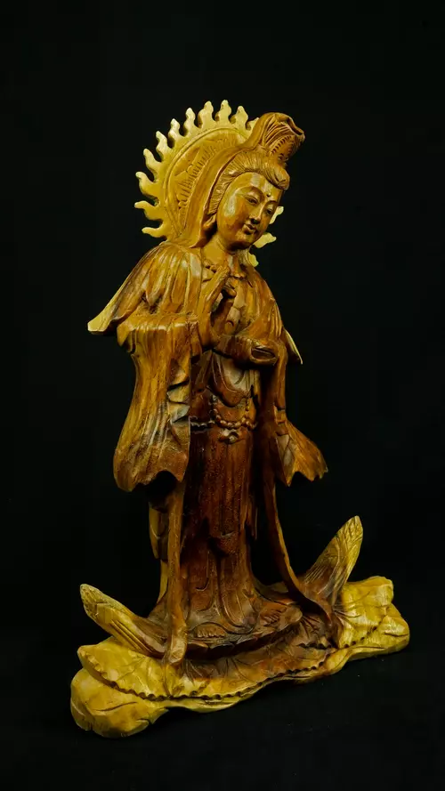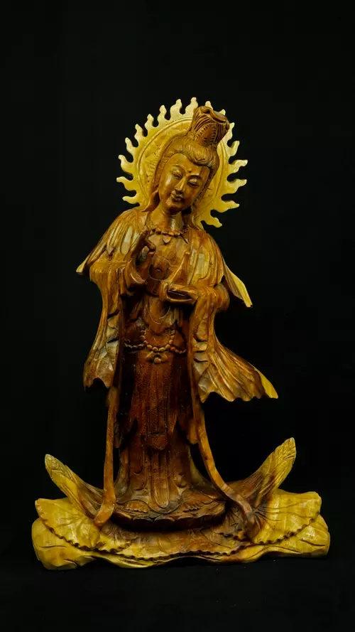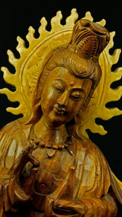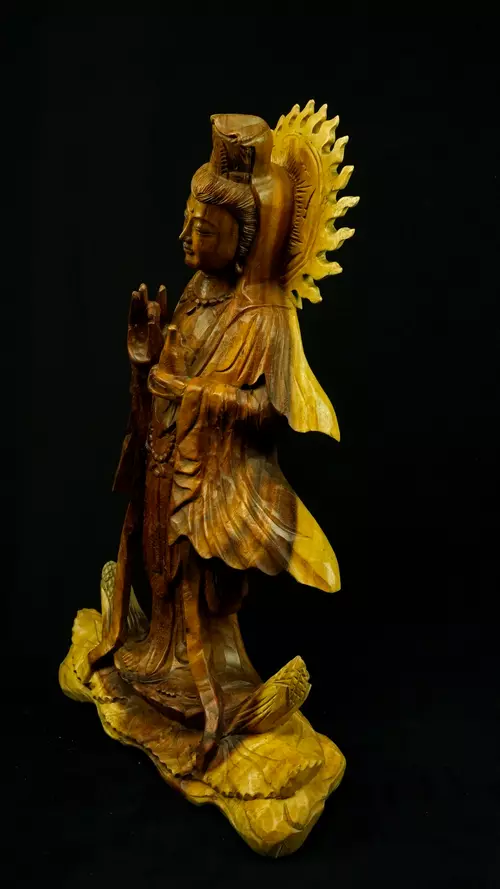 Le visage paisible de Kwan Yin reflète la pureté de l’esprit maîtrisé et la bienveillance sans condition. Ses ornements divins : diadème, collier, bijoux et lotus rappellent que la véritable richesse réside dans la lumière du discernement et non dans la possession. Son arc ornemental, couronné de flammes ascendantes, représente le rayonnement du feu intérieur, la clarté de l’âme libérée des illusions.