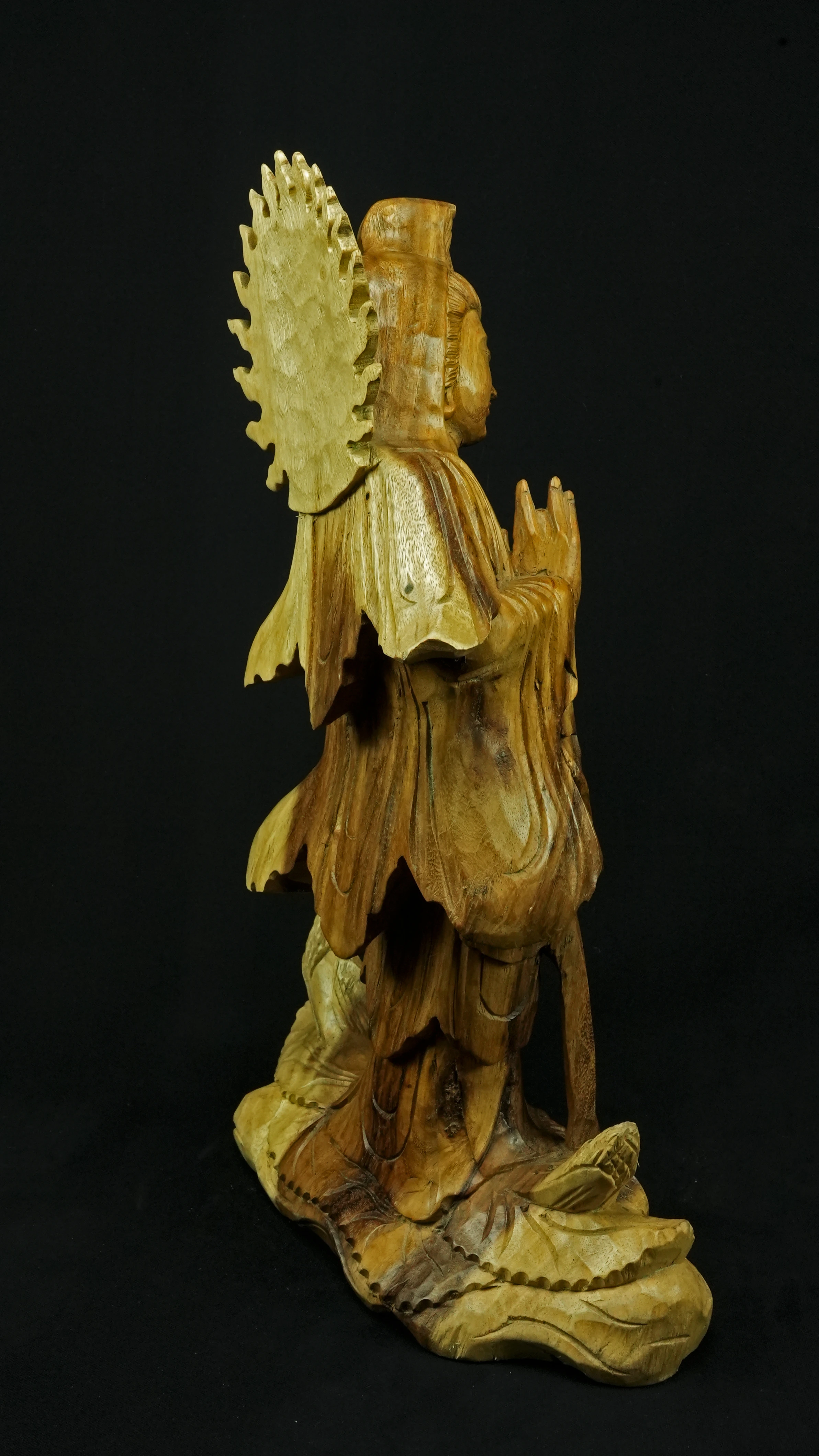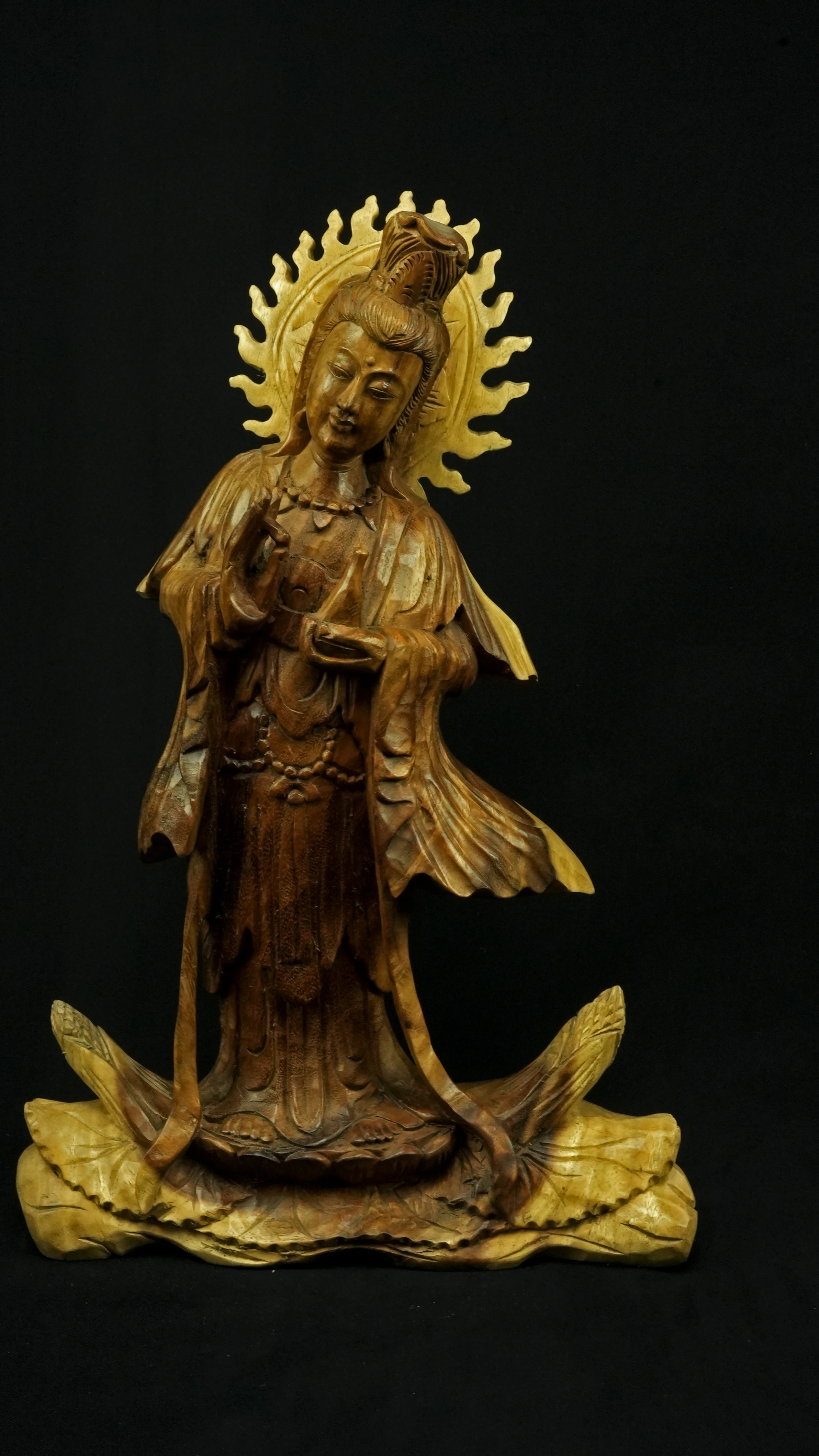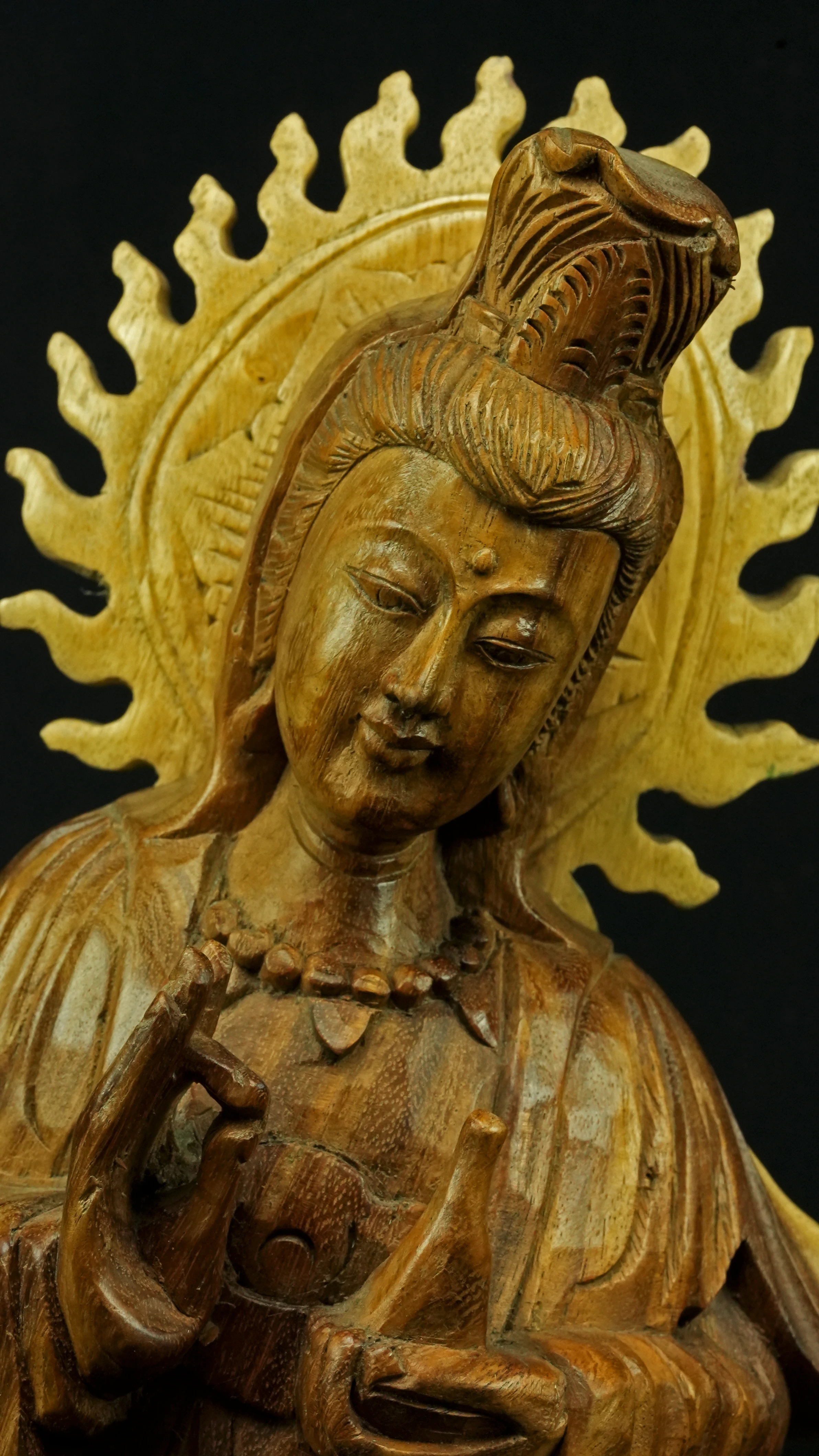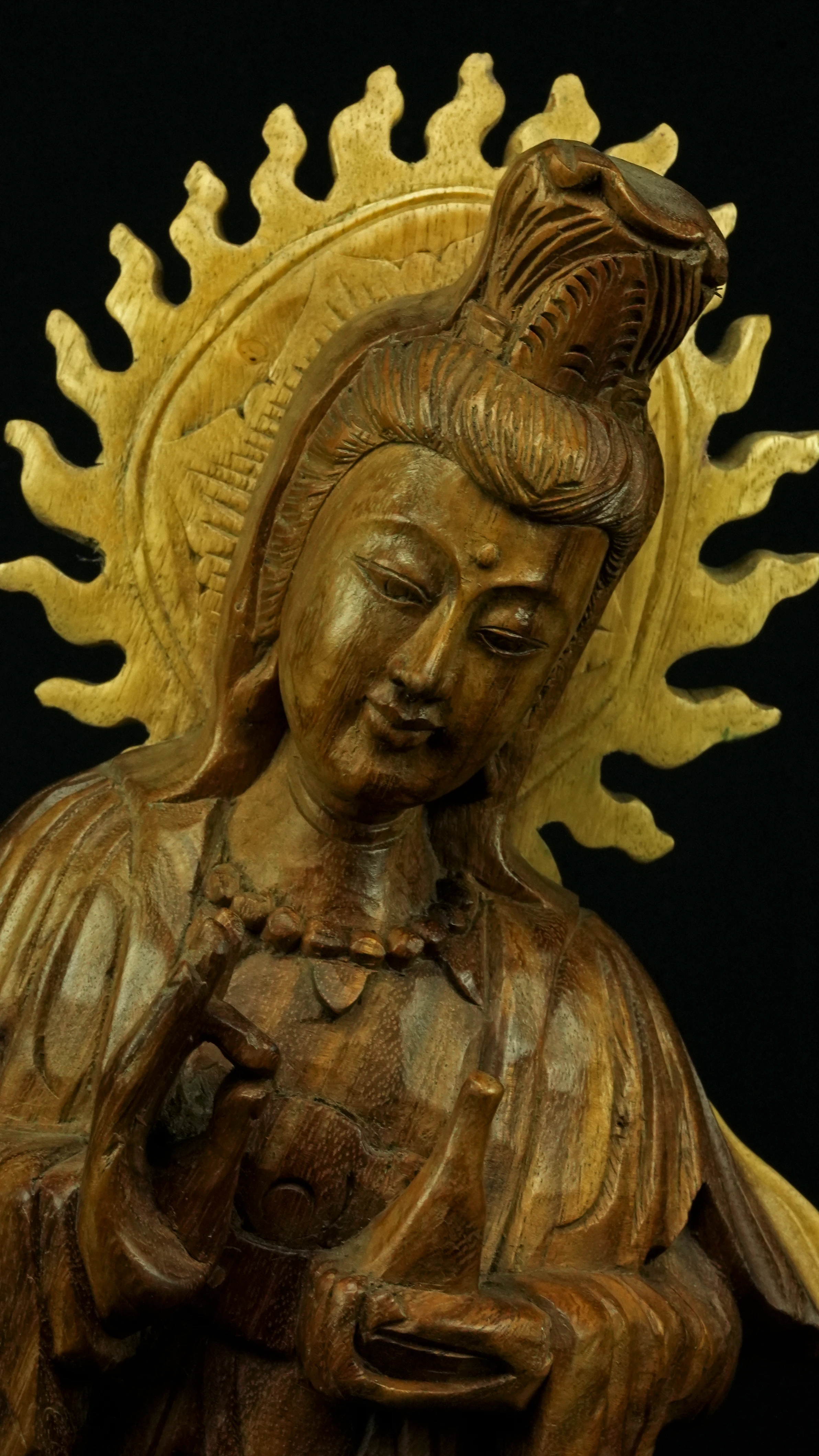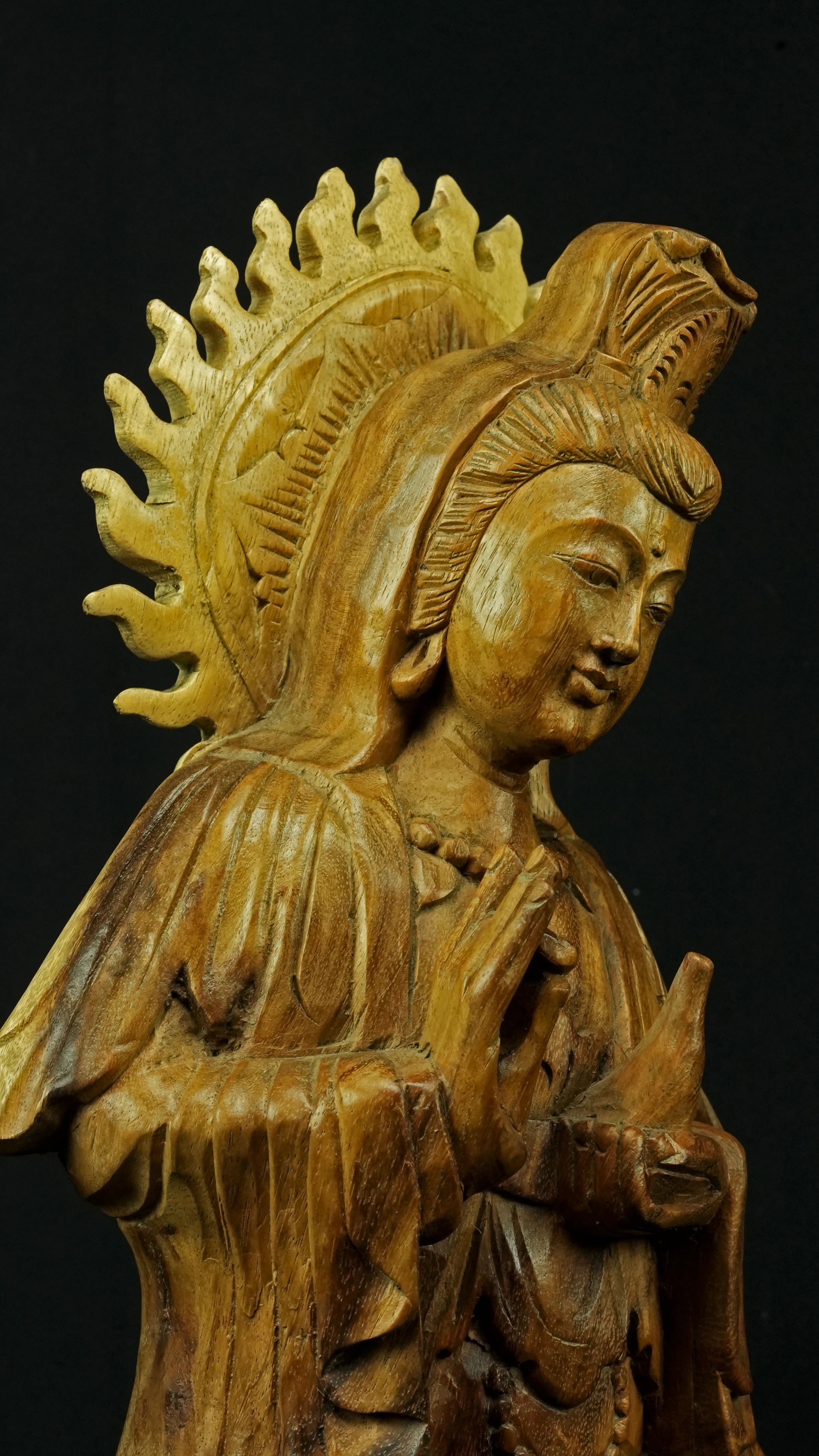 Le visage paisible de Kwan Yin reflète la pureté de l’esprit maîtrisé et la bienveillance sans condition. Ses ornements divins : diadème, collier, bijoux et lotus rappellent que la véritable richesse réside dans la lumière du discernement et non dans la possession. Son arc ornemental, couronné de flammes ascendantes, représente le rayonnement du feu intérieur, la clarté de l’âme libérée des illusions.