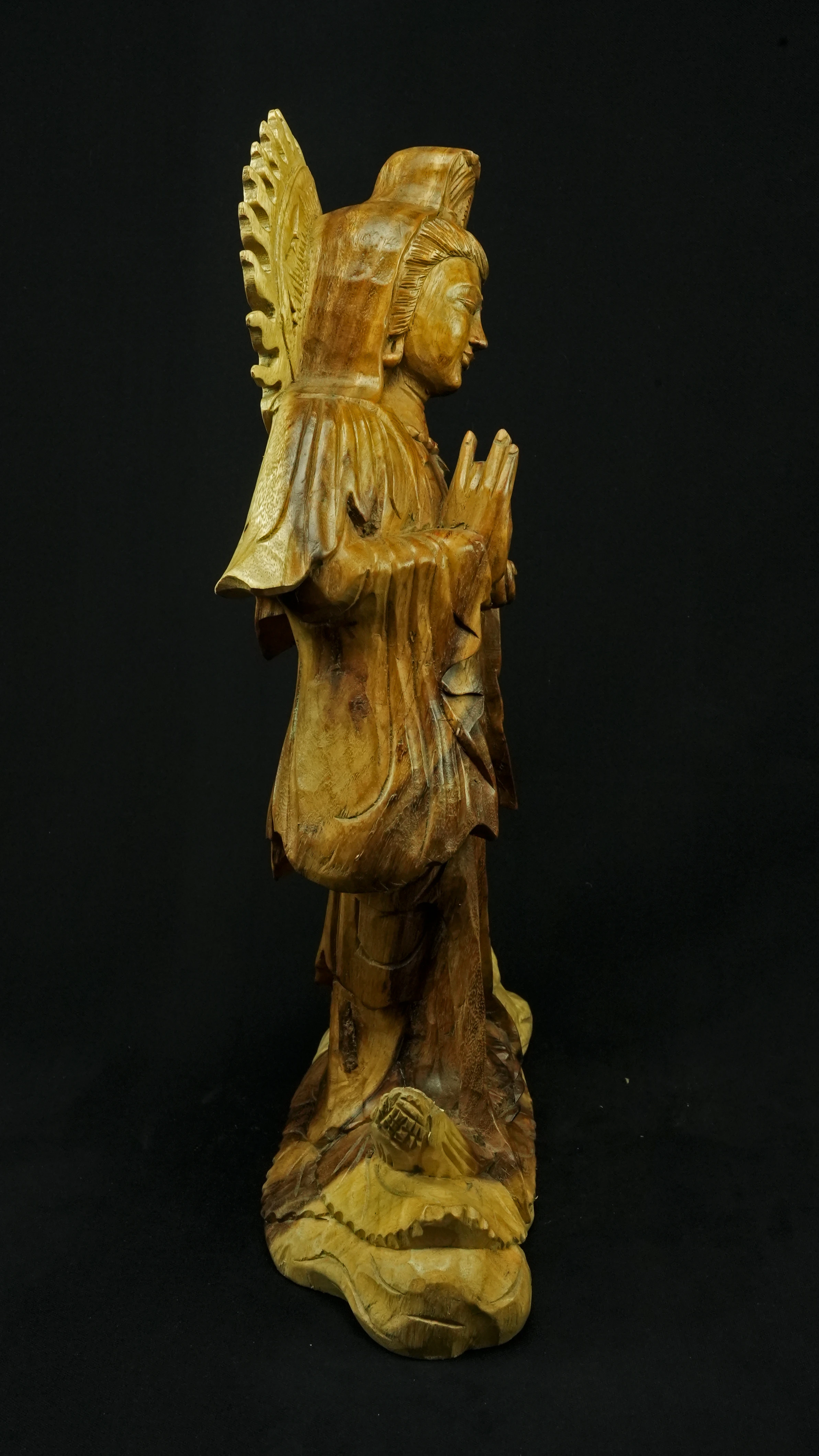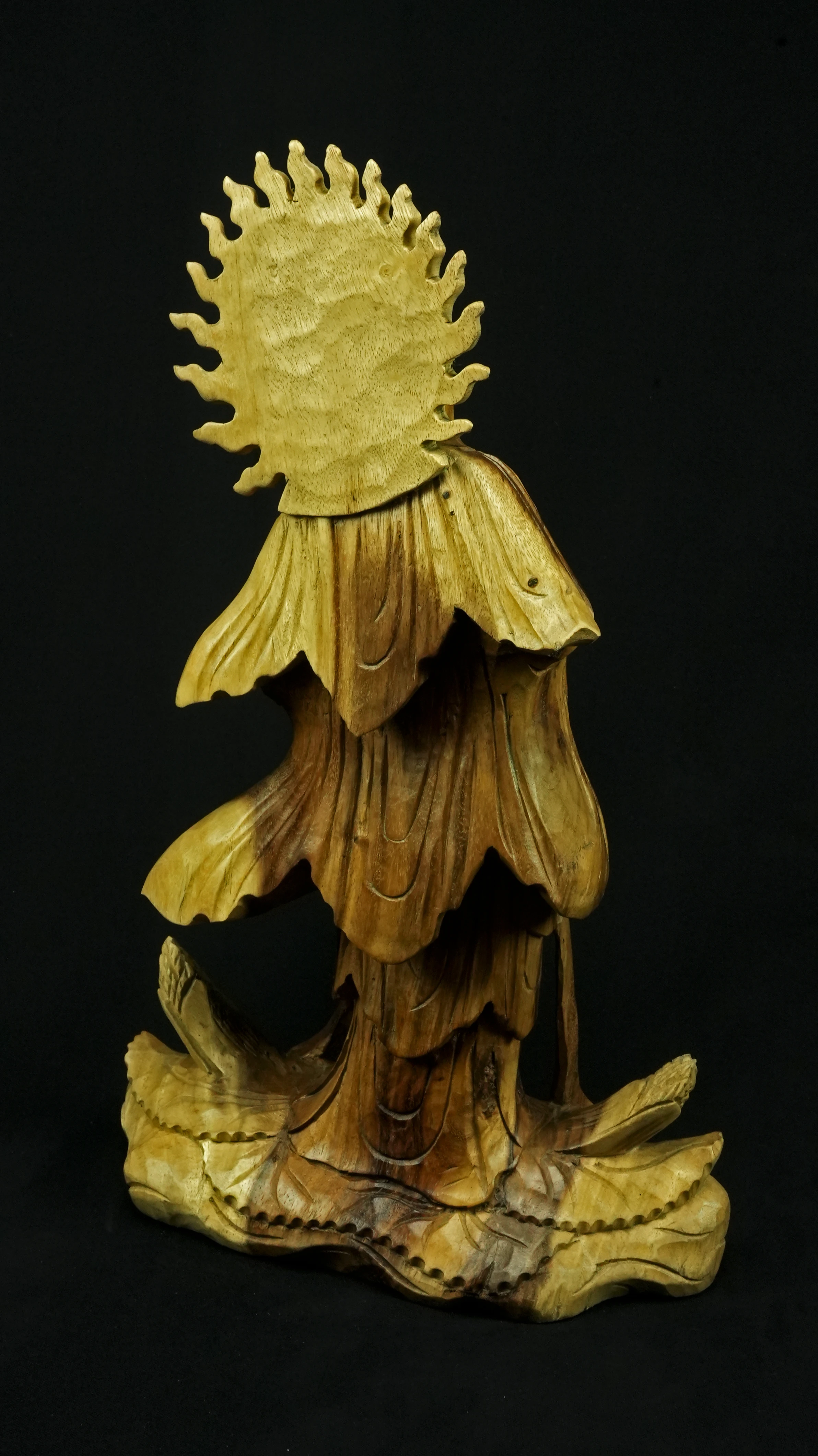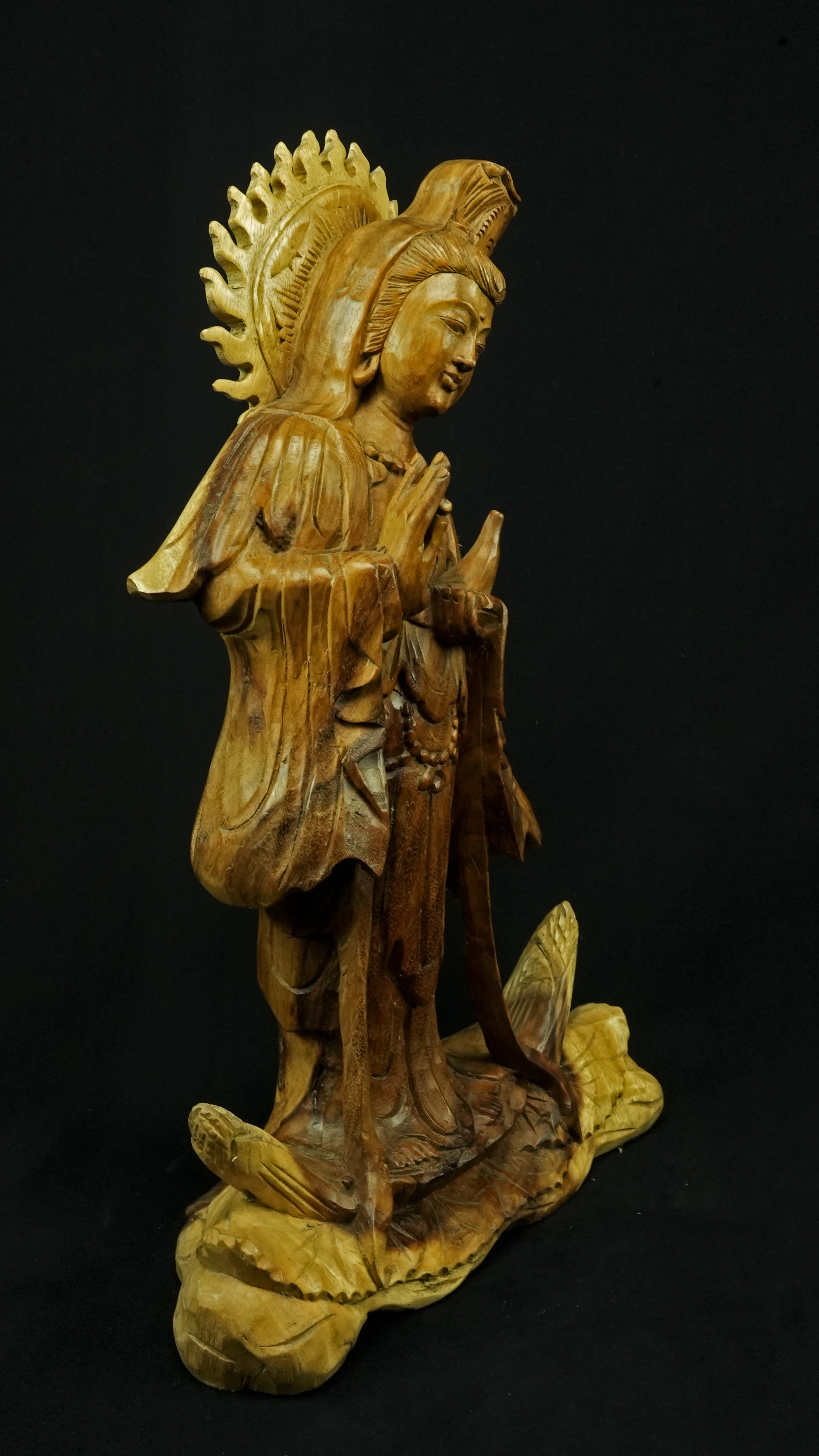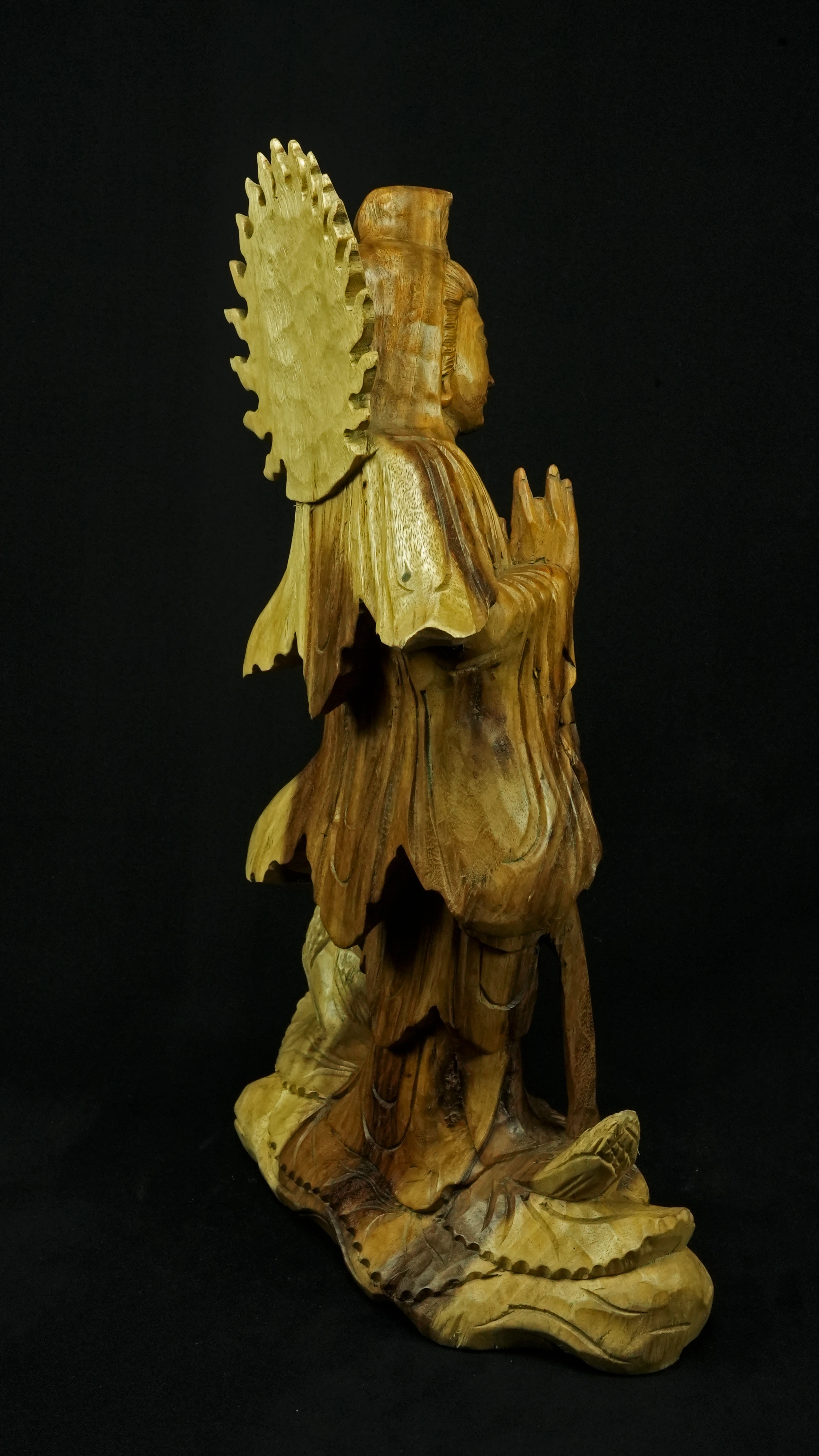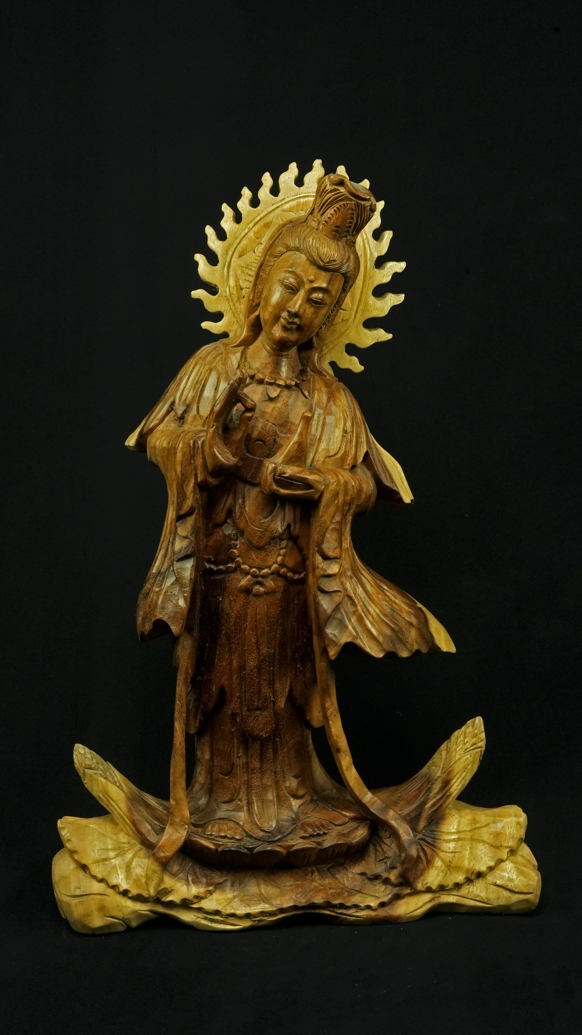 Le visage paisible de Kwan Yin reflète la pureté de l’esprit maîtrisé et la bienveillance sans condition. Ses ornements divins : diadème, collier, bijoux et lotus rappellent que la véritable richesse réside dans la lumière du discernement et non dans la possession. Son arc ornemental, couronné de flammes ascendantes, représente le rayonnement du feu intérieur, la clarté de l’âme libérée des illusions.