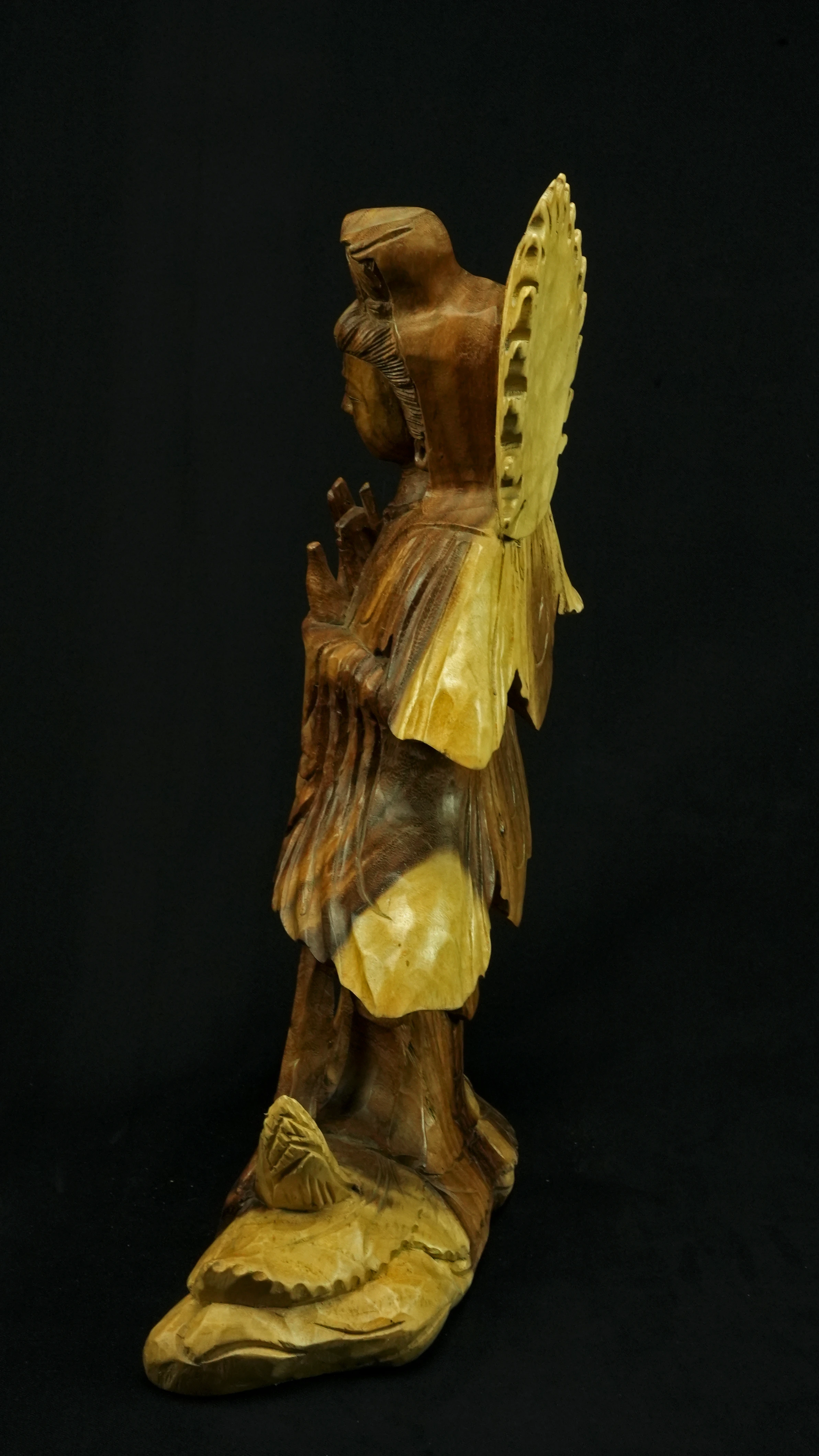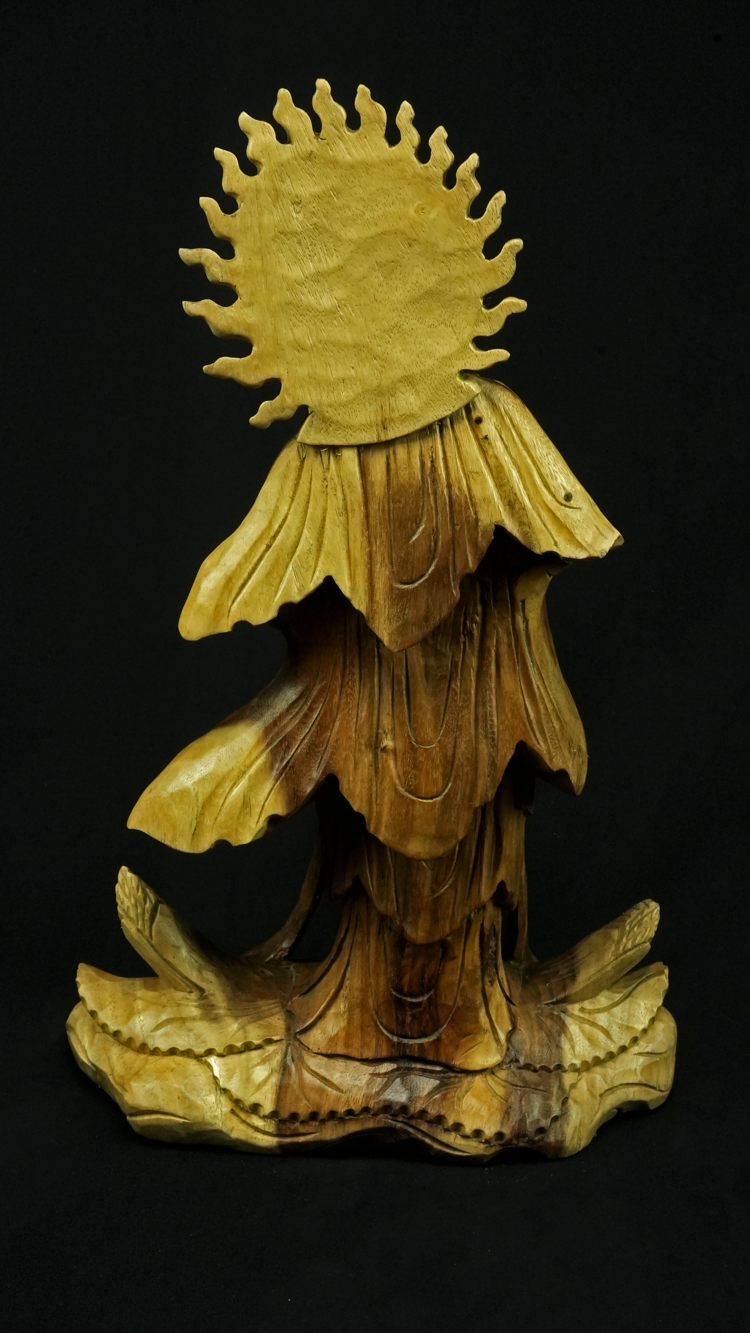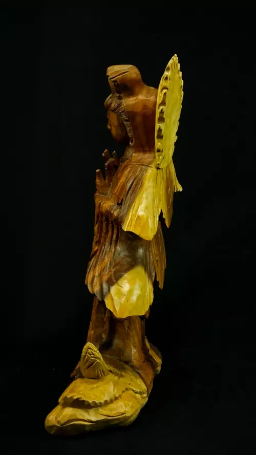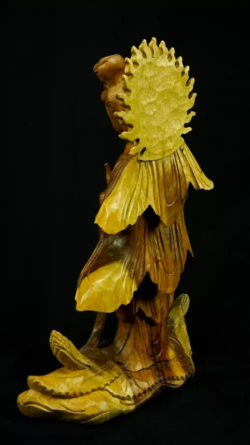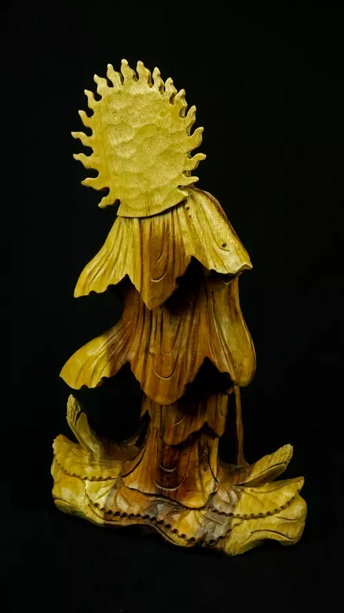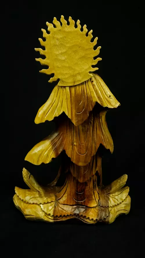 Le bois de suar, issu d’arbres majestueux à croissance rapide, est porteur de l’idée d’abondance et de renouvellement. Spirituellement, il symbolise la générosité et la prospérité, et rappelle le cycle permanent de la vie, de la mort et de la régénération. Le suar wood est reconnu pour sa résilience. Sa densité et sa solidité en font un support stable, capable de « retenir » et de conserver les énergies spirituelles, particulièrement précieux pour les statues. Le bois est un matériau vivant, et le suar, par sa structure souple et équilibrée, est lié à l’harmonie énergétique. Il favorise la circulation douce des énergies, apaise les perturbations vibratoires et soutient les pratiques méditatives. Sa chaleur naturelle rappelle la proximité avec le monde végétal et l’importance de rester enraciné tout en étant ouvert au ciel.