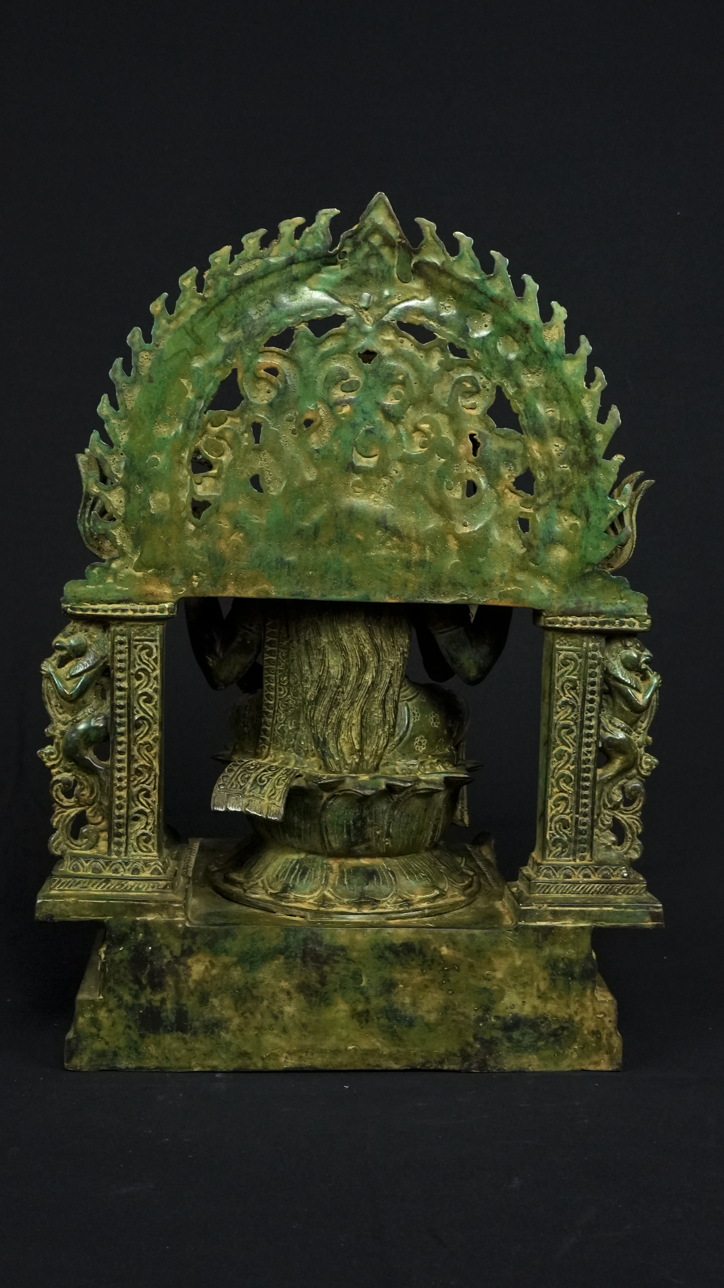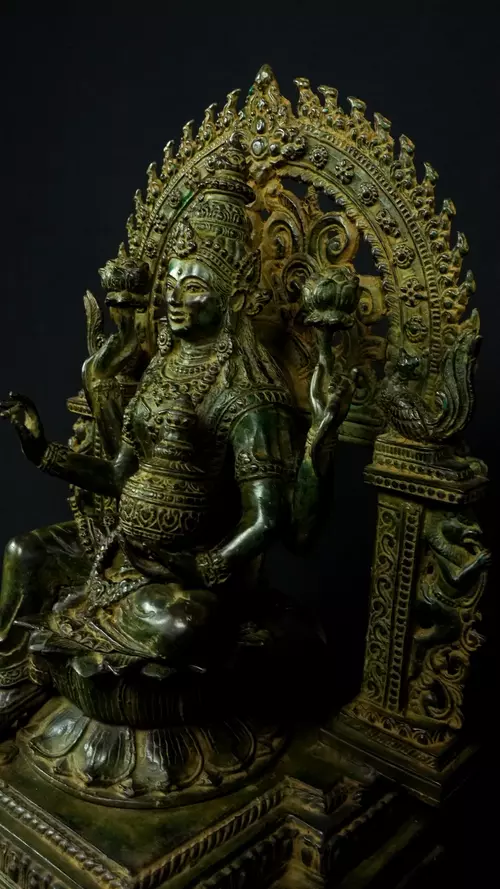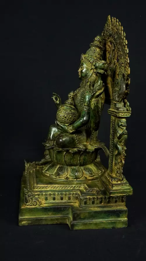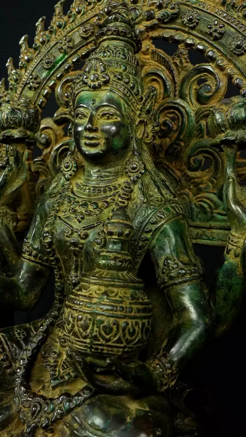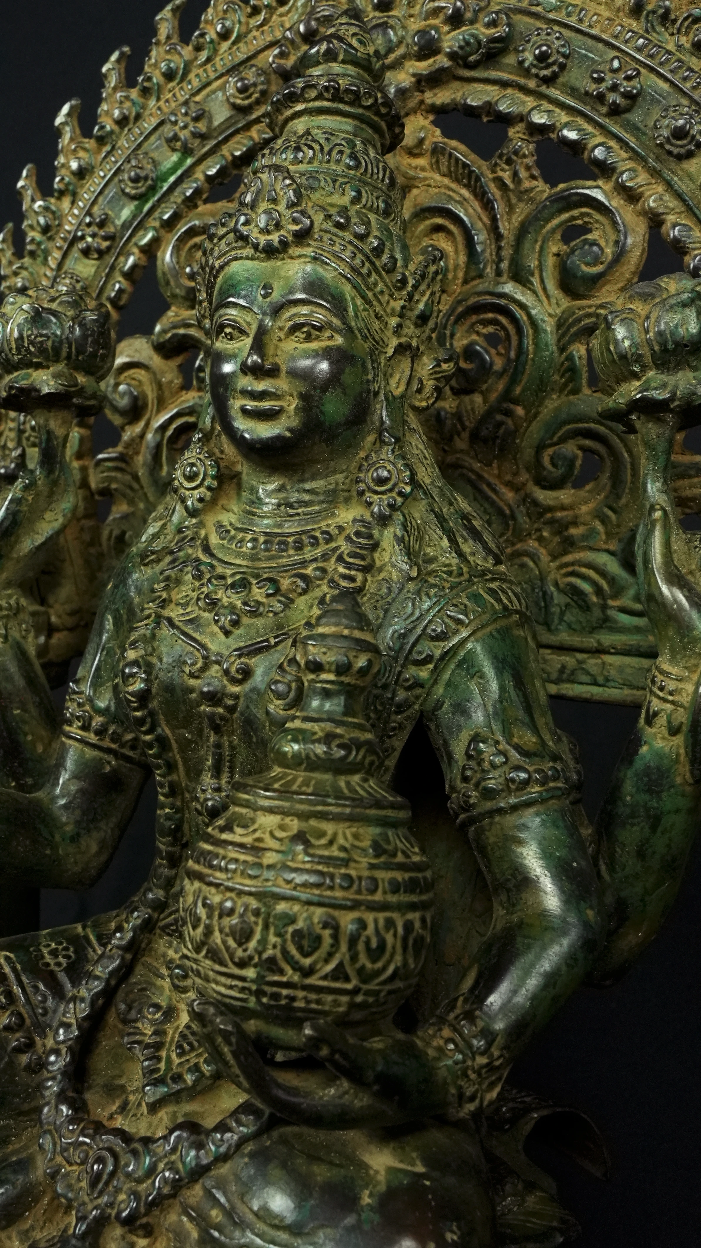 Assise en posture de méditation (Padmasana), elle repose sur un trône orné de lotus et de flammes stylisées, symboles de pureté et d’illumination. Ses quatre bras expriment l’équilibre parfait entre contemplation et action juste : l’un forme le mudra de purification, un autre tient l’amphore divine d’où s’écoule le nectar de connaissance, et ses deux bras supérieurs élèvent les lotus sacrés, manifestation de la sagesse pleinement intégrée. Elle incarne les enseignements divins et les rayonne dans toutes les directions.
