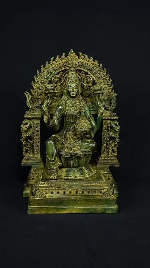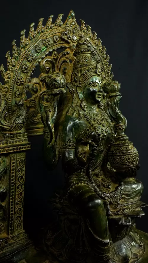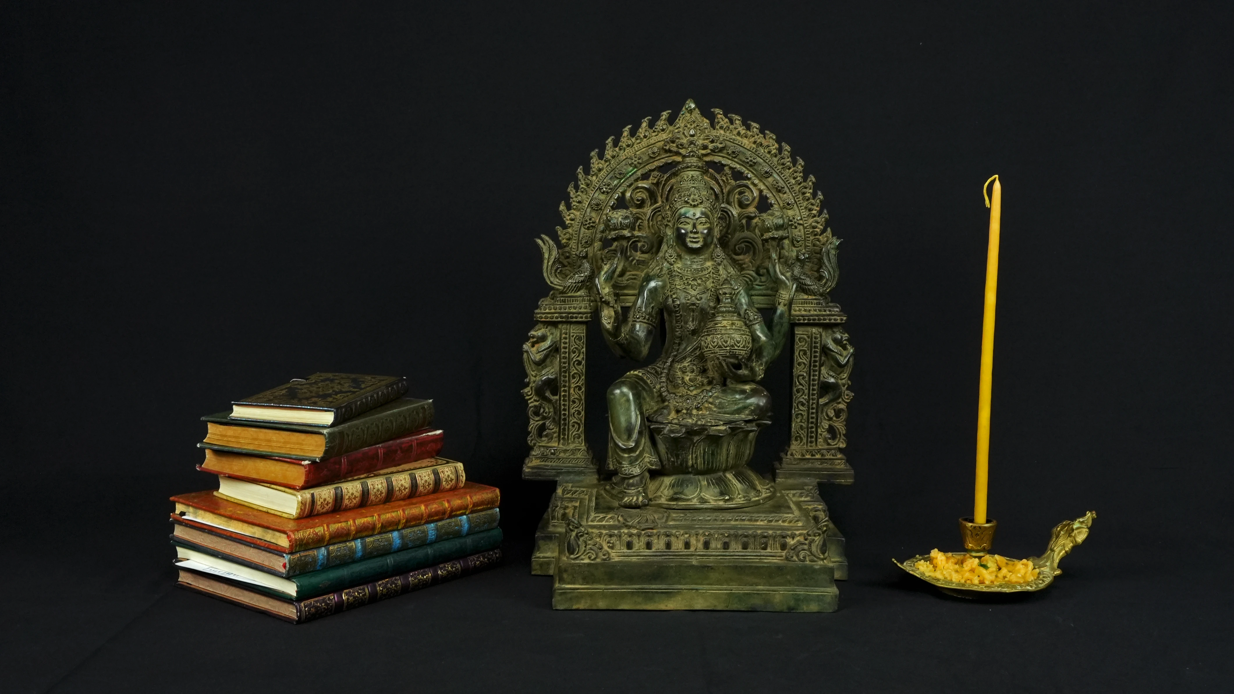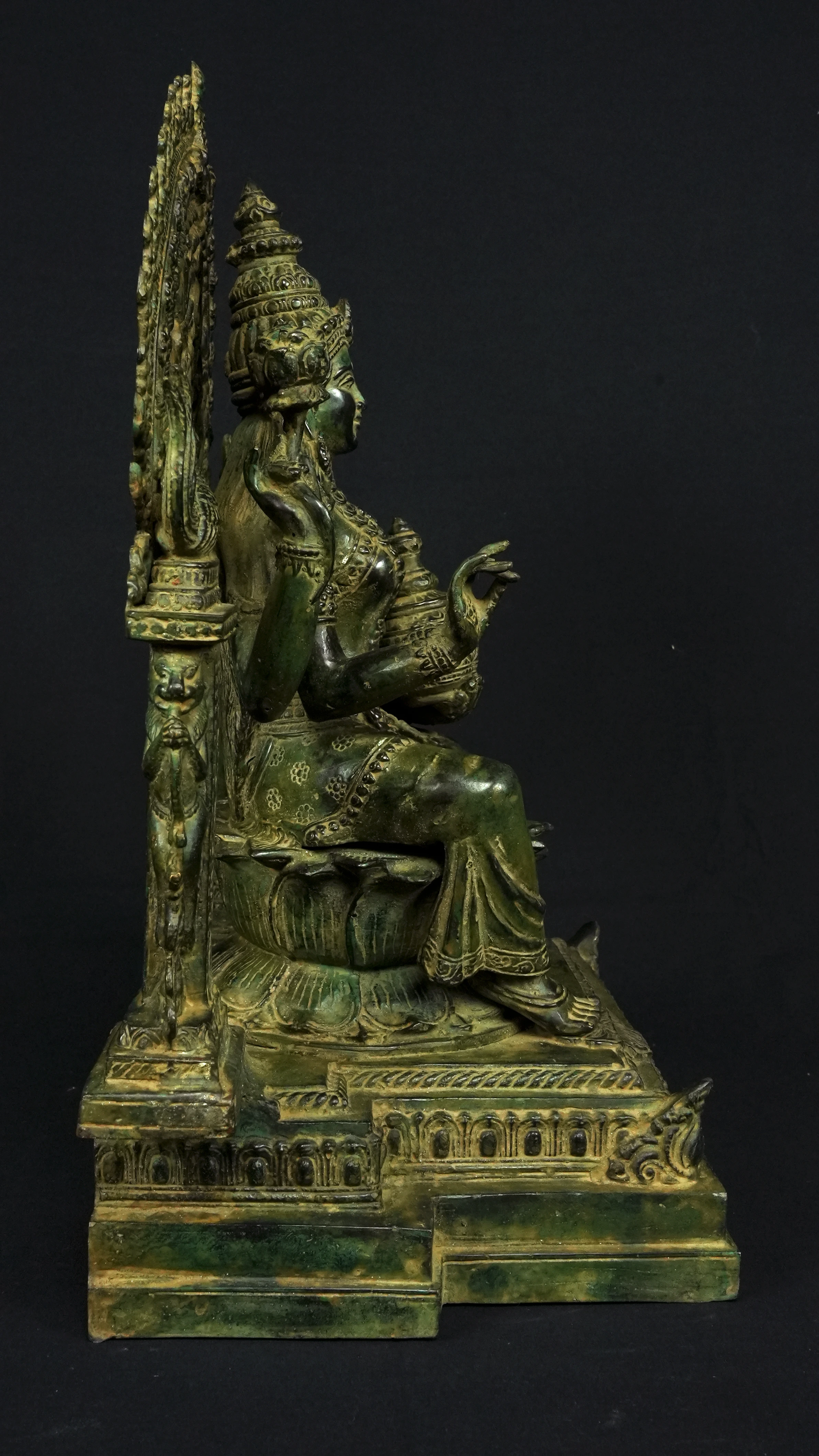 Assise en posture de méditation (Padmasana), elle repose sur un trône orné de lotus et de flammes stylisées, symboles de pureté et d’illumination. Ses quatre bras expriment l’équilibre parfait entre contemplation et action juste : l’un forme le mudra de purification, un autre tient l’amphore divine d’où s’écoule le nectar de connaissance, et ses deux bras supérieurs élèvent les lotus sacrés, manifestation de la sagesse pleinement intégrée. Elle incarne les enseignements divins et les rayonne dans toutes les directions.