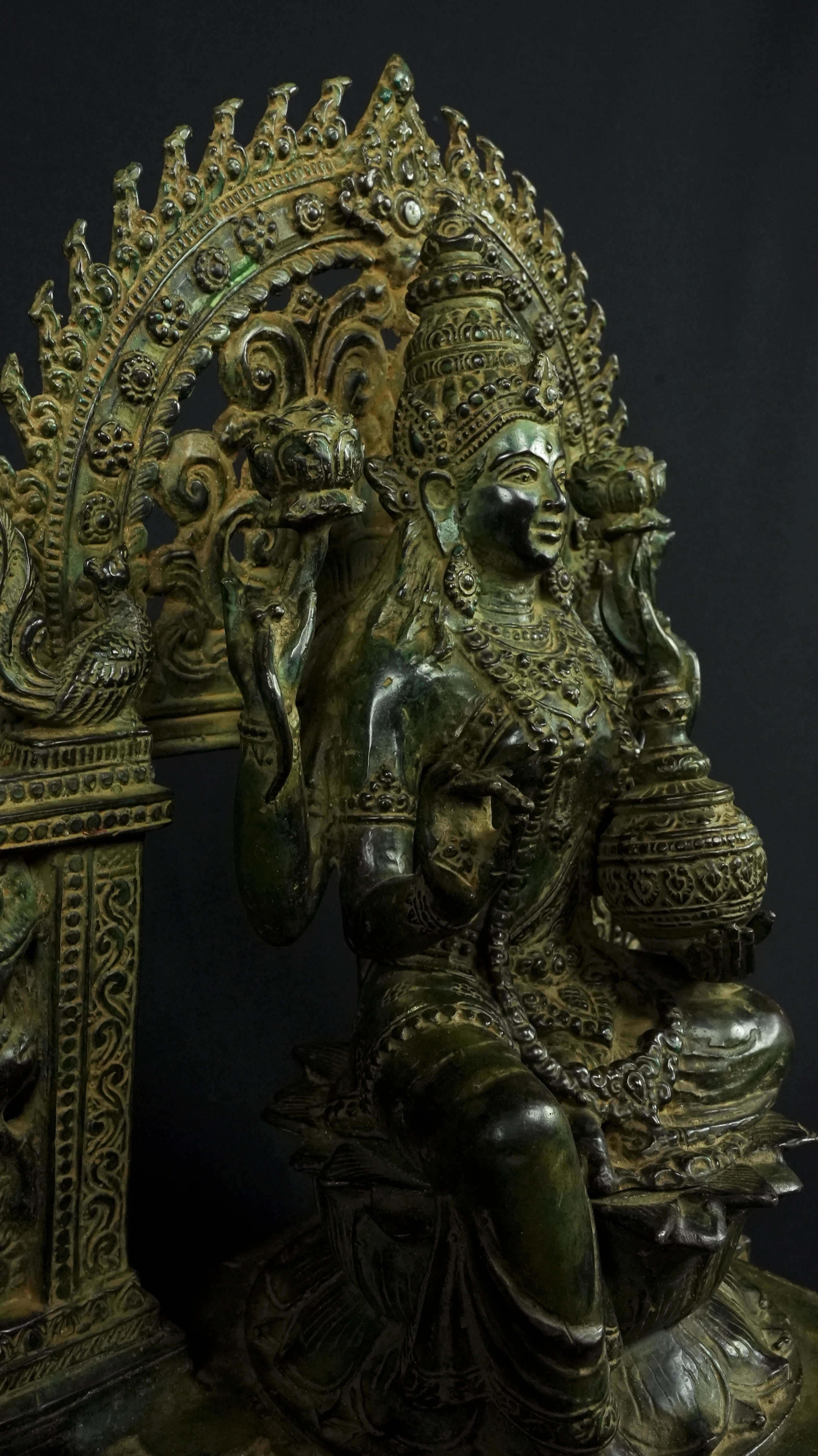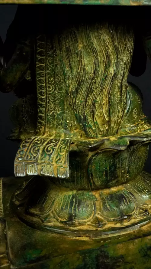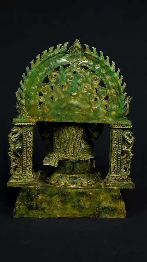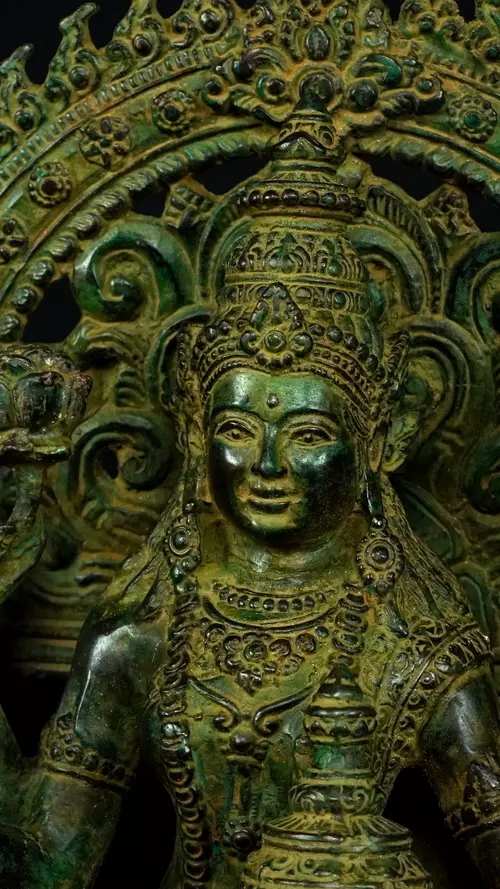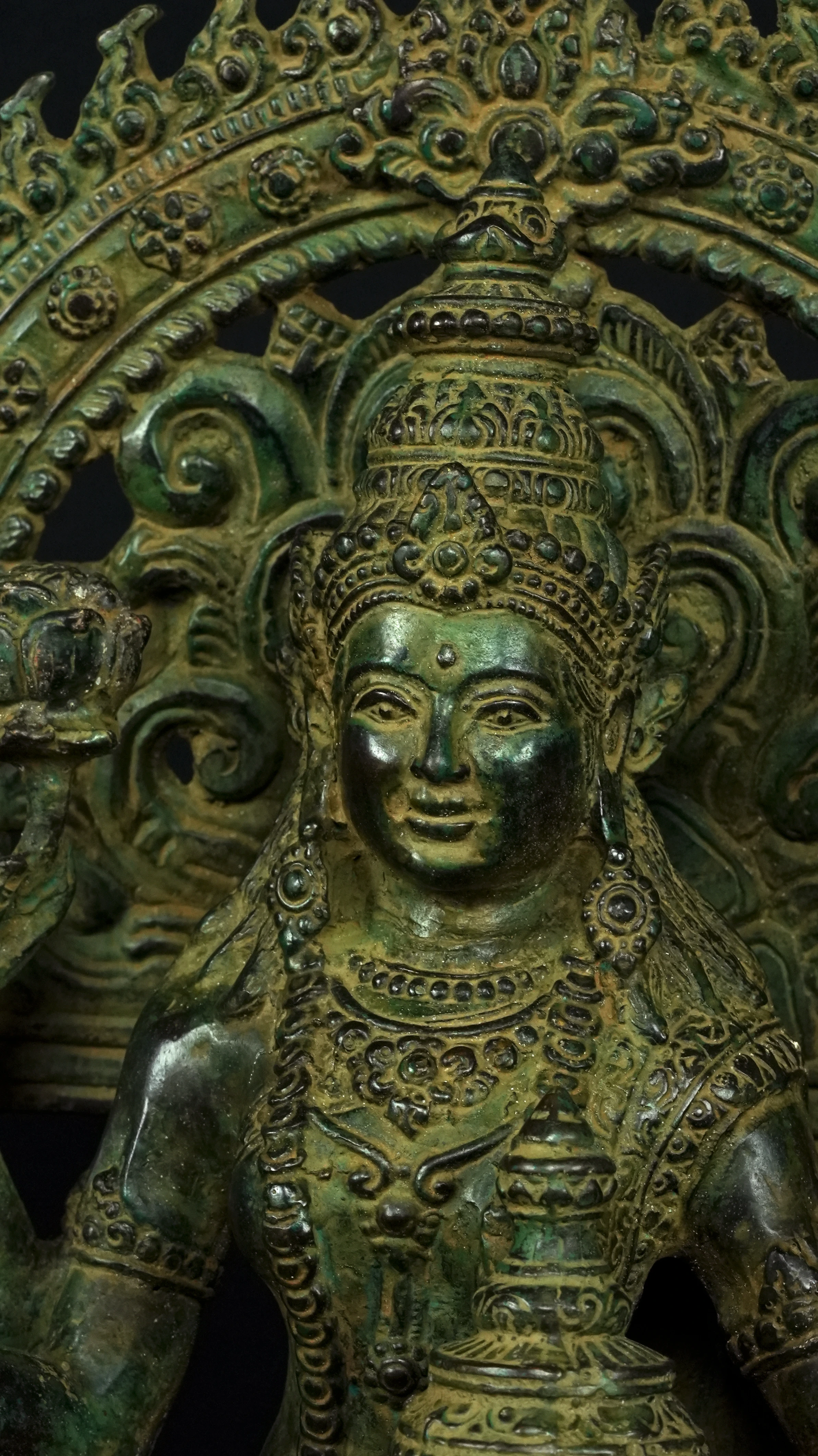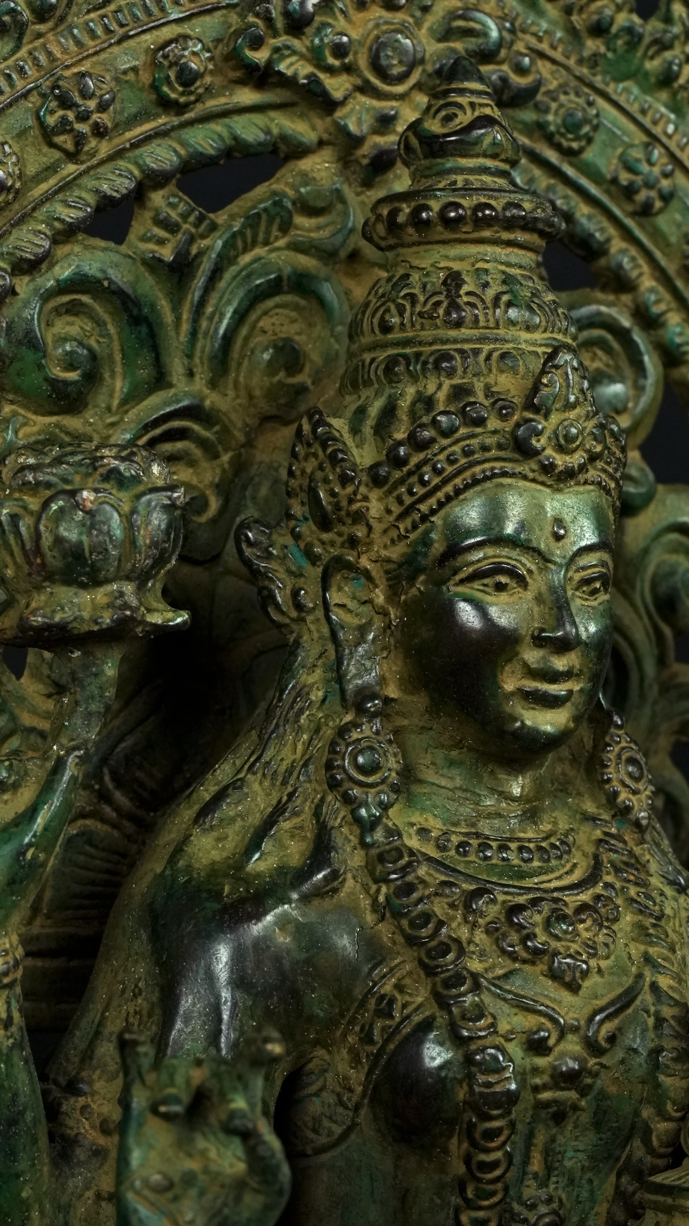 Le visage paisible de Kwan Yin reflète la pureté de l’esprit maîtrisé et la bienveillance sans condition. Ses ornements divins : diadème, collier, bijoux et lotus rappellent que la véritable richesse réside dans la lumière du discernement et non dans la possession. Son arc ornemental, couronné de flammes ascendantes, représente le rayonnement du feu intérieur, la clarté de l’âme libérée des illusions.