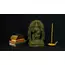 L’amphore renversée symbolise le flot ininterrompu du savoir et de l’abondance spirituelle. C’est le réservoir du cœur éveillé, d’où s’écoule l’Amrita, le nectar de vérité. À ses côtés, le paon sacré, gardien de la beauté intérieure, représente la transmutation : il transforme les poisons émotionnels en lumière consciente. Sous son trône, une créature mi-animale, mi-humaine, gardienne du Dharma, veille à l’équilibre entre les plans.