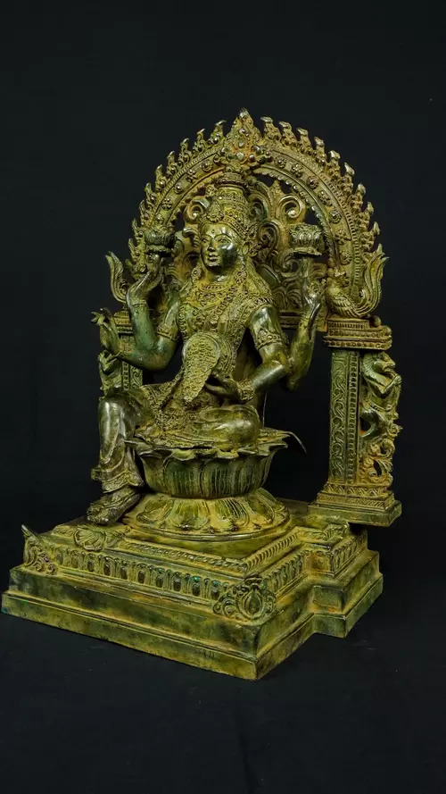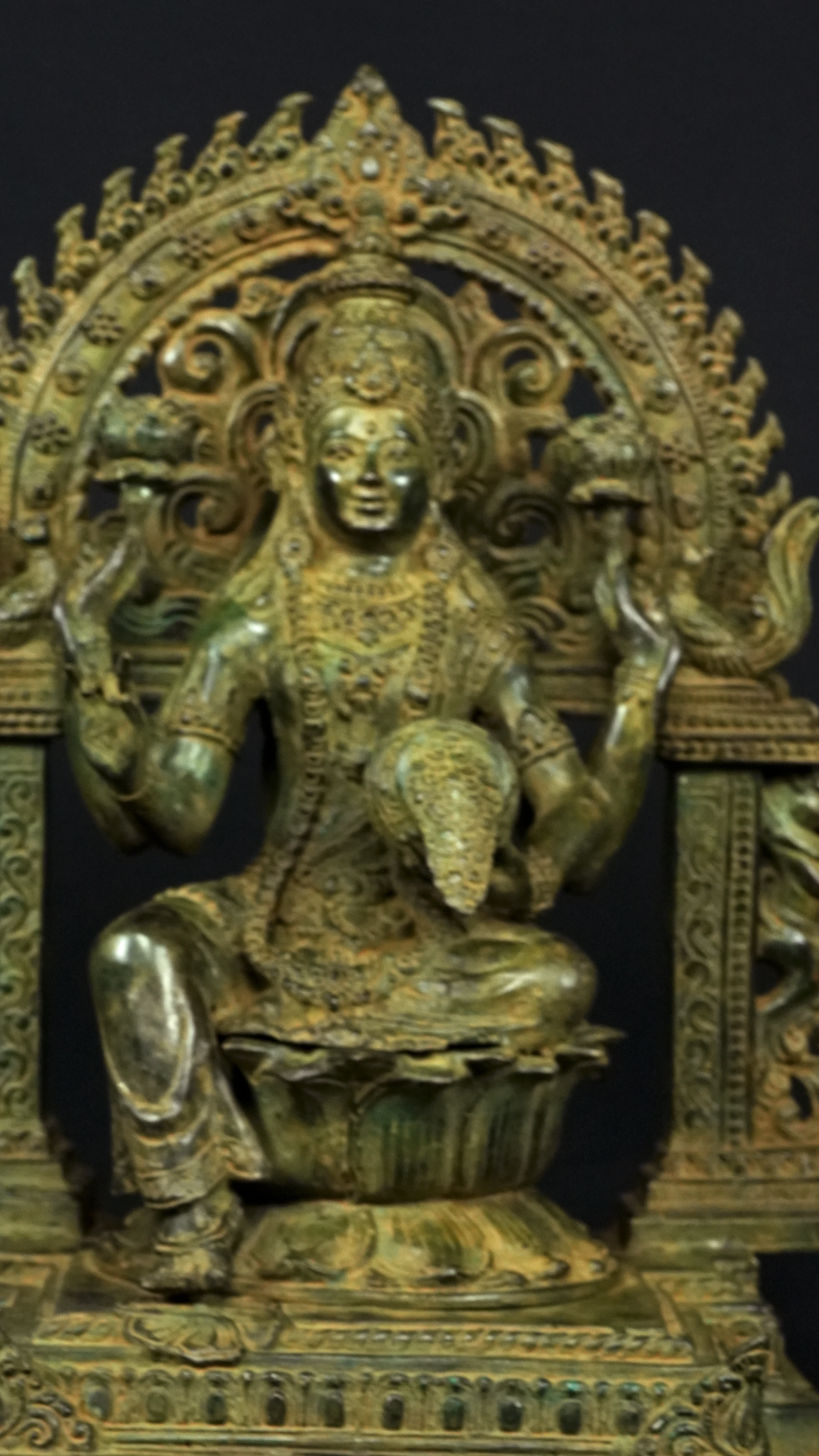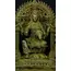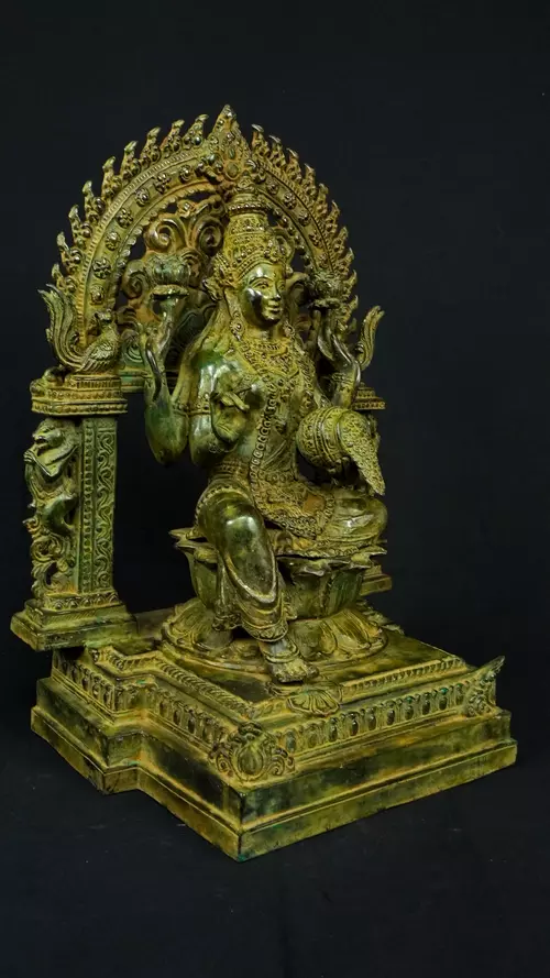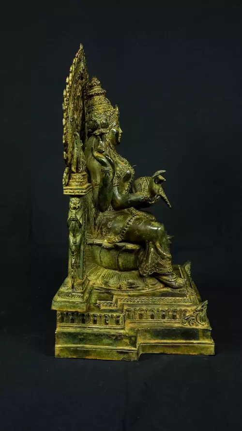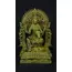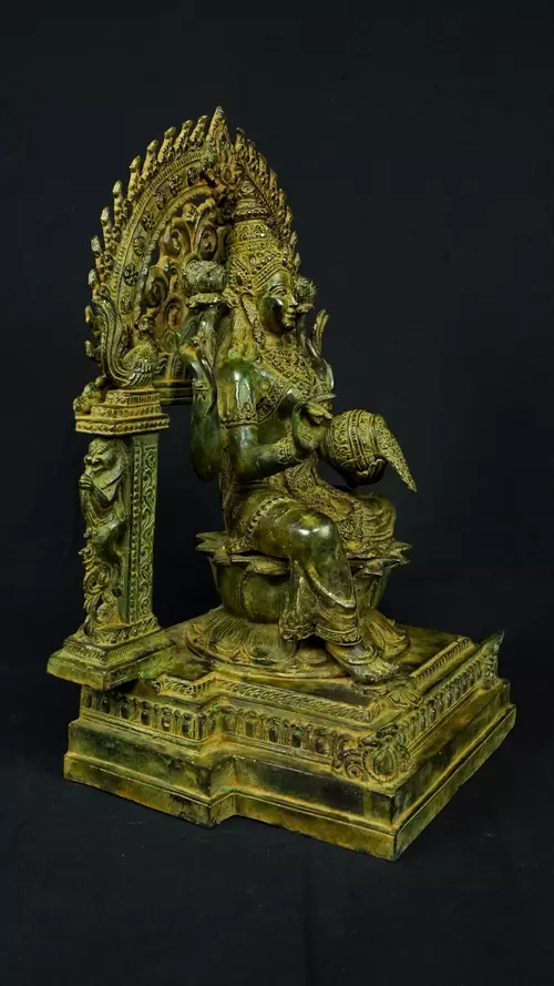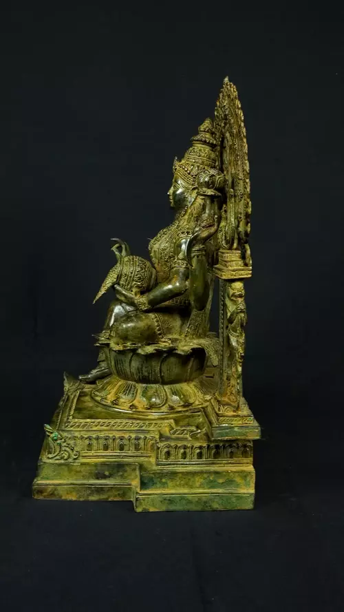 Assise en posture de méditation (Padmasana), elle repose sur un trône orné de lotus et de flammes stylisées, symboles de pureté et d’illumination. Ses quatre bras expriment l’équilibre parfait entre contemplation et action juste : l’un forme le mudra de purification, un autre tient l’amphore divine d’où s’écoule le nectar de connaissance, et ses deux bras supérieurs élèvent les lotus sacrés, manifestation de la sagesse pleinement intégrée. Elle incarne les enseignements divins et les rayonne dans toutes les directions.