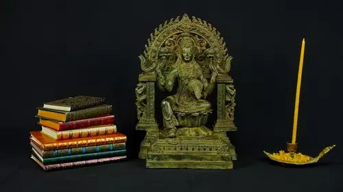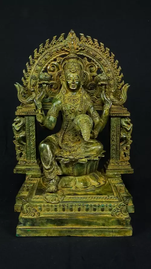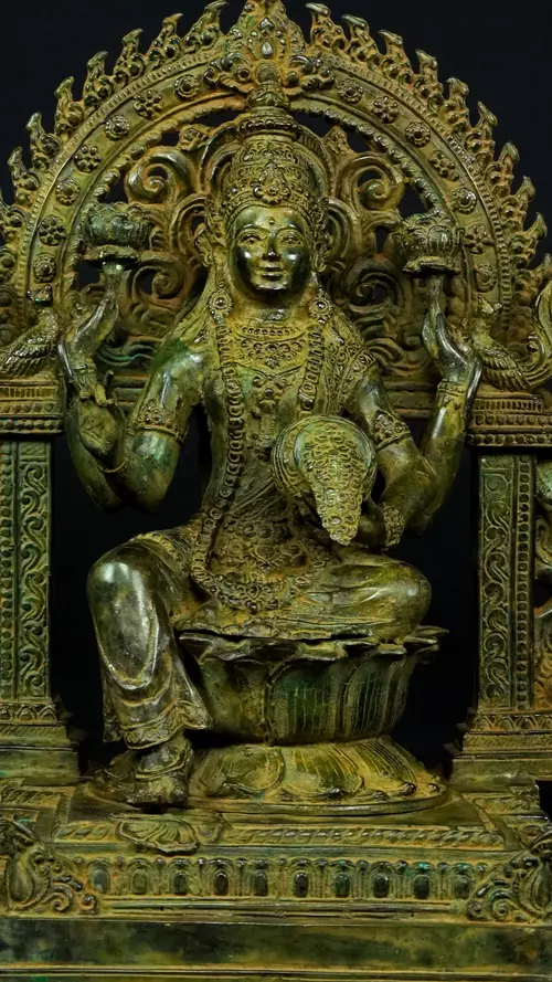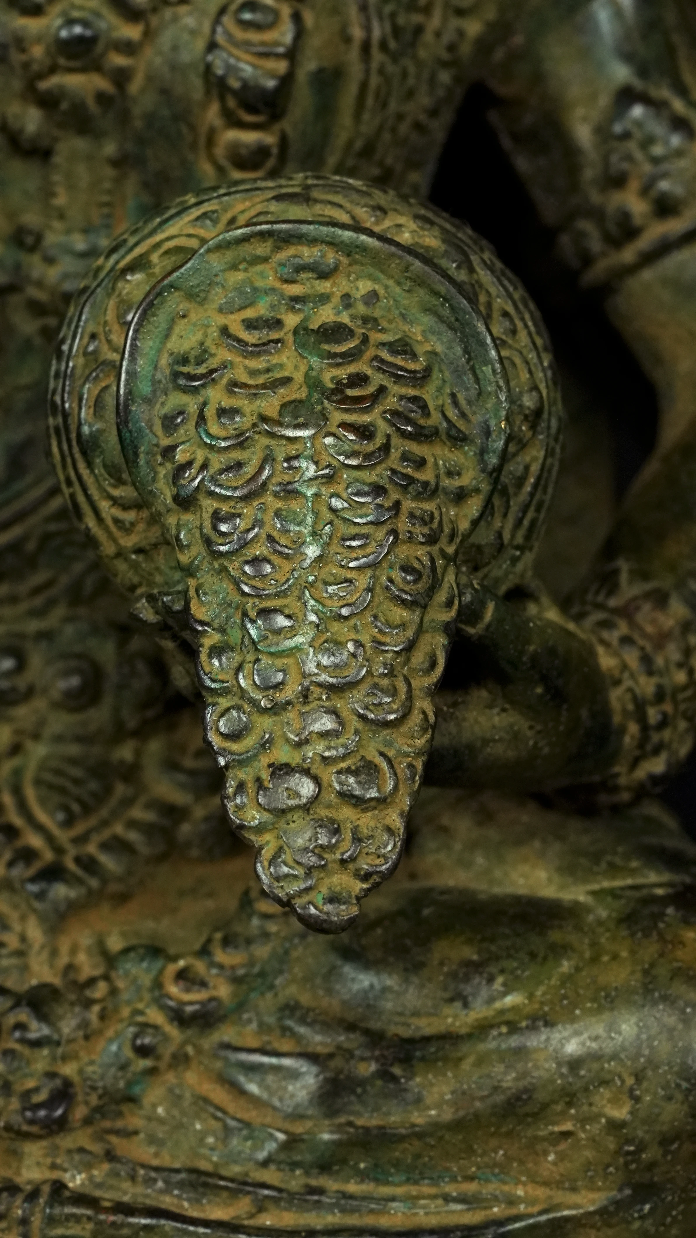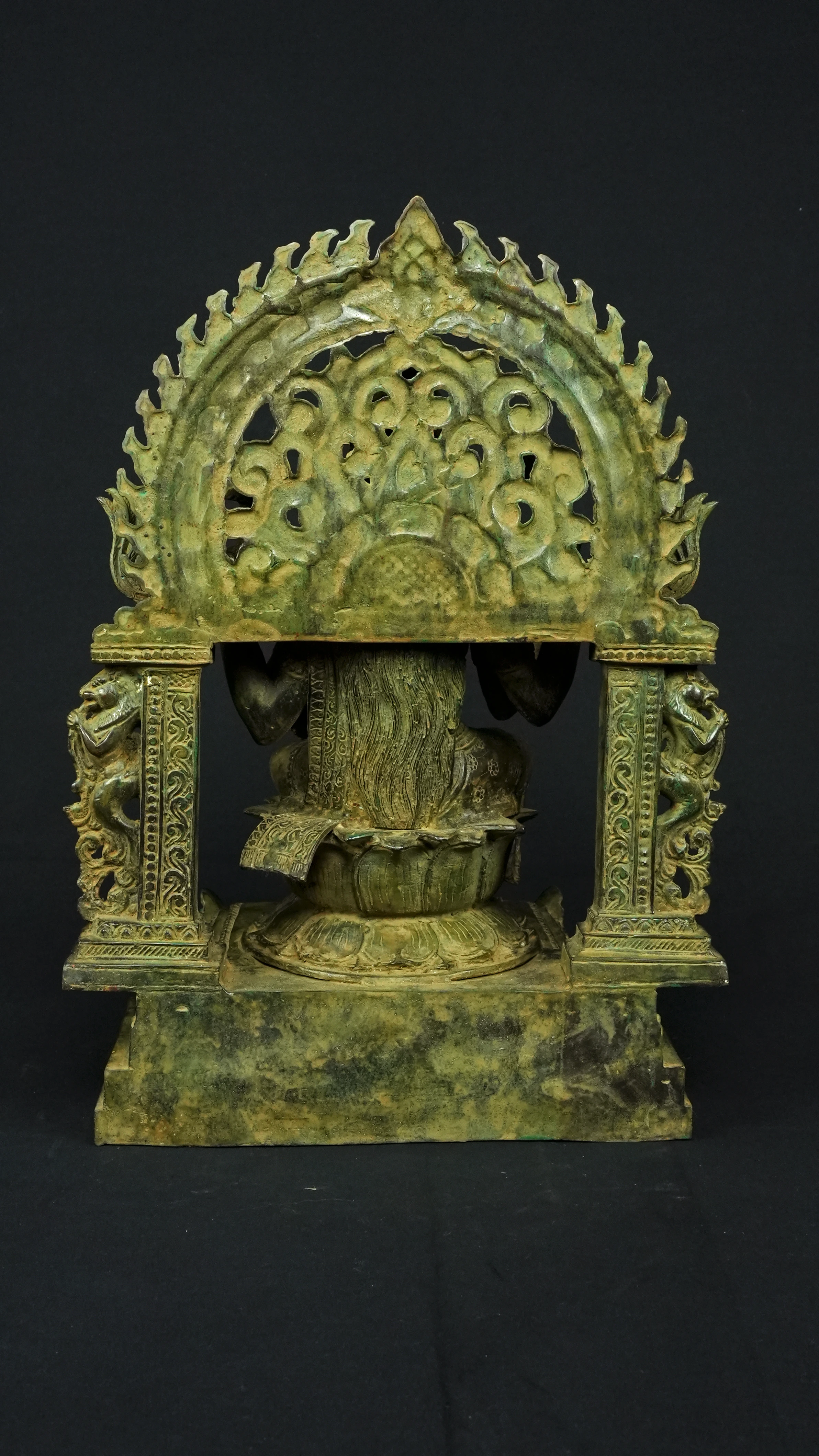 Assise en posture de méditation (Padmasana), elle repose sur un trône orné de lotus et de flammes stylisées, symboles de pureté et d’illumination. Ses quatre bras expriment l’équilibre parfait entre contemplation et action juste : l’un forme le mudra de purification, un autre tient l’amphore divine d’où s’écoule le nectar de connaissance, et ses deux bras supérieurs élèvent les lotus sacrés, manifestation de la sagesse pleinement intégrée. Elle incarne les enseignements divins et les rayonne dans toutes les directions.