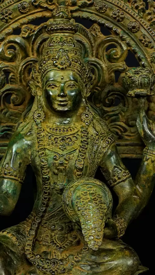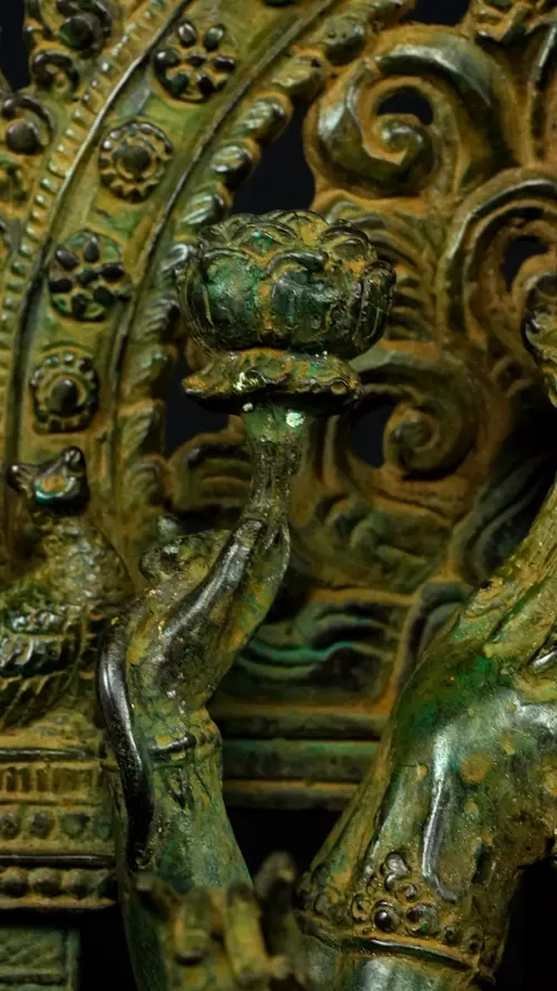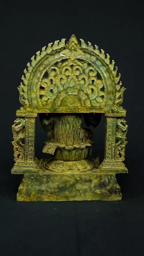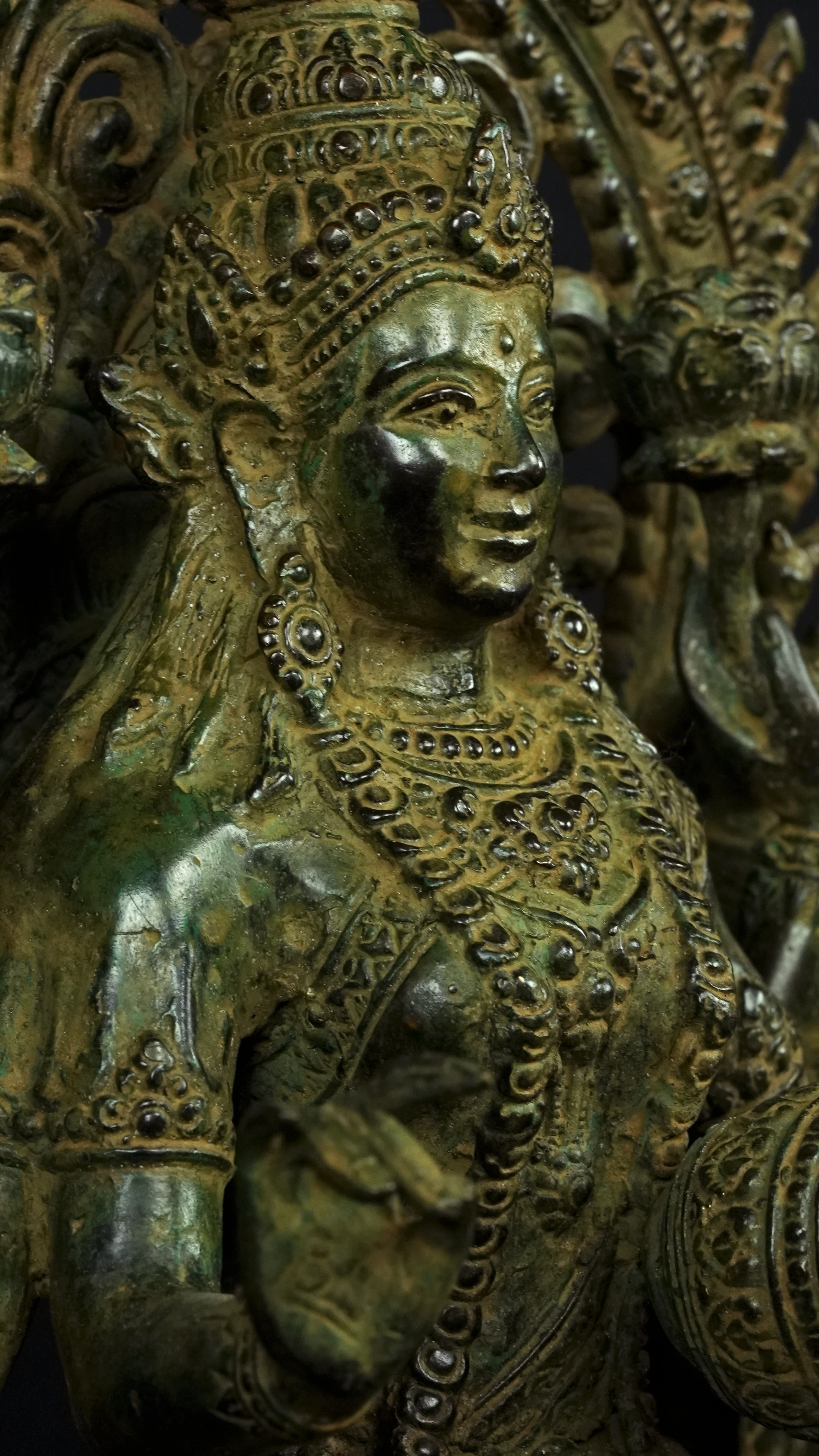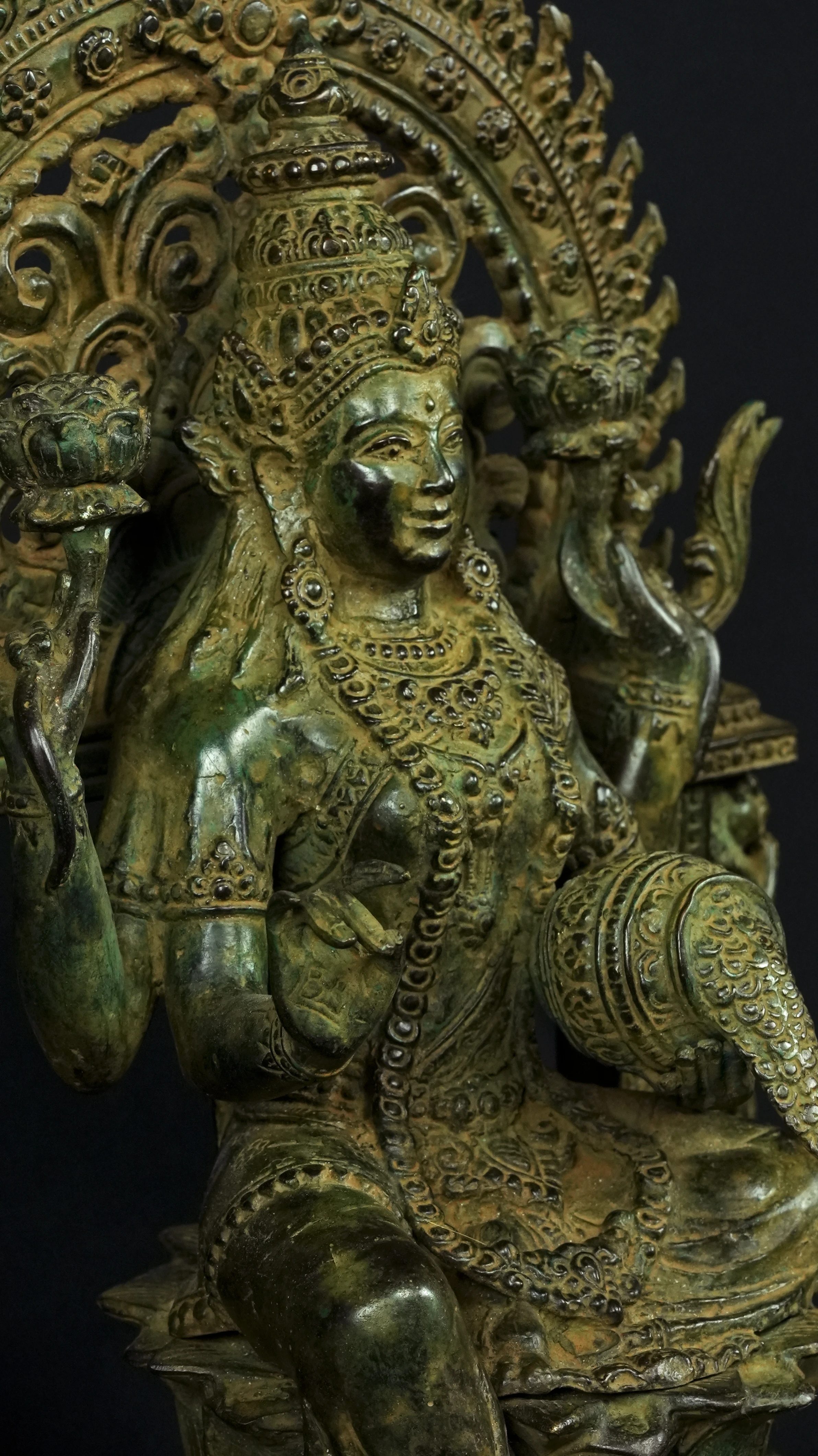 Le visage paisible de Kwan Yin reflète la pureté de l’esprit maîtrisé et la bienveillance sans condition. Ses ornements divins : diadème, collier, bijoux et lotus rappellent que la véritable richesse réside dans la lumière du discernement et non dans la possession. Son arc ornemental, couronné de flammes ascendantes, représente le rayonnement du feu intérieur, la clarté de l’âme libérée des illusions.