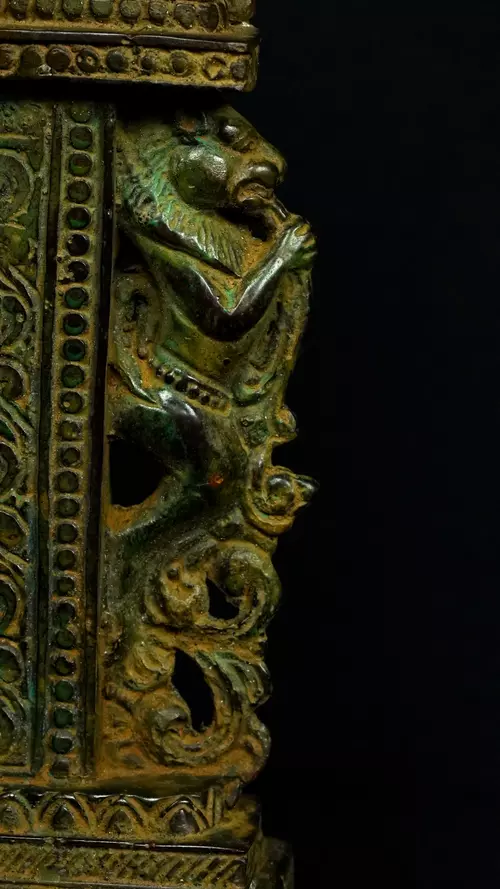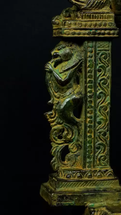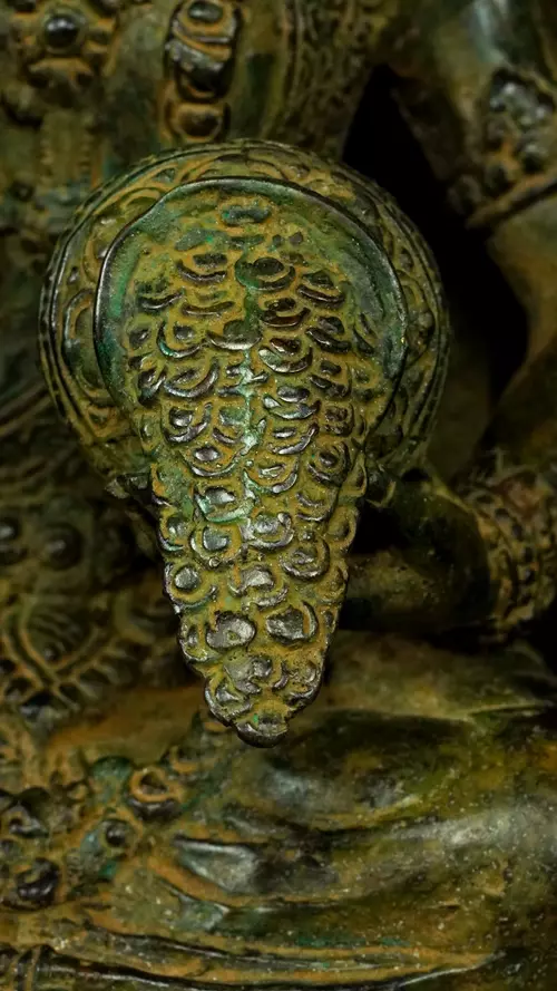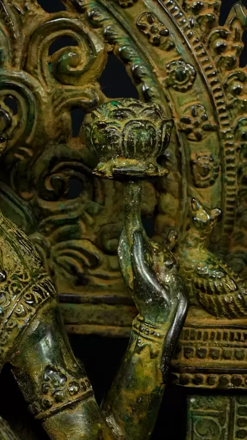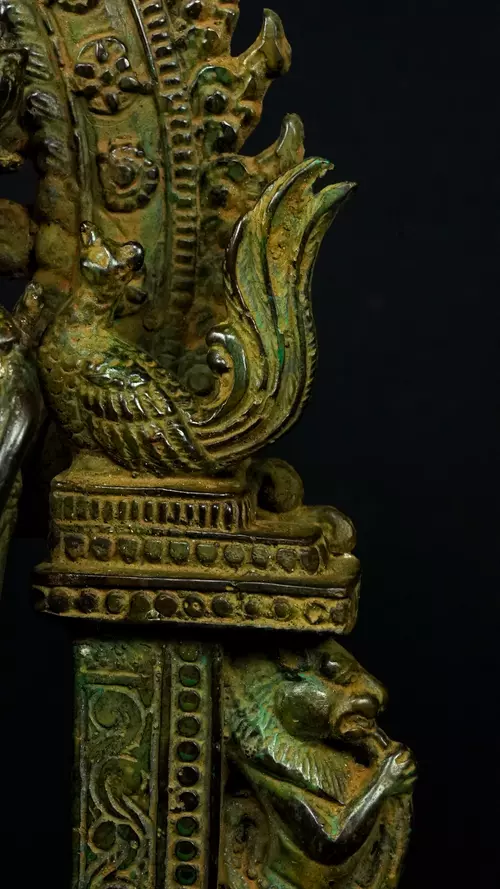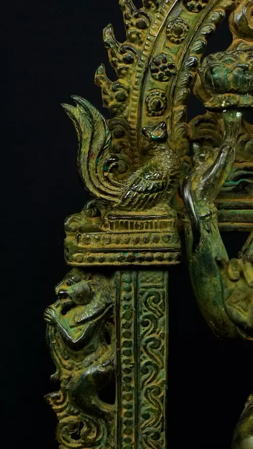 L’amphore renversée symbolise le flot ininterrompu du savoir et de l’abondance spirituelle. C’est le réservoir du cœur éveillé, d’où s’écoule l’Amrita, le nectar de vérité. À ses côtés, le paon sacré, gardien de la beauté intérieure, représente la transmutation : il transforme les poisons émotionnels en lumière consciente. Sous son trône, une créature mi-animale, mi-humaine, gardienne du Dharma, veille à l’équilibre entre les plans.