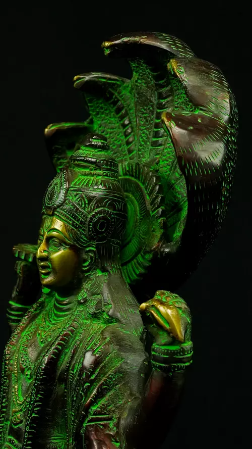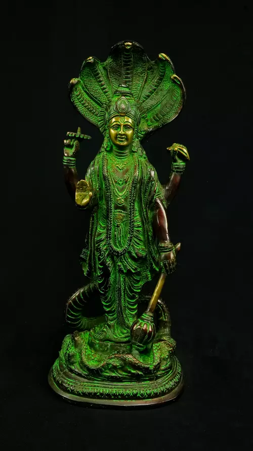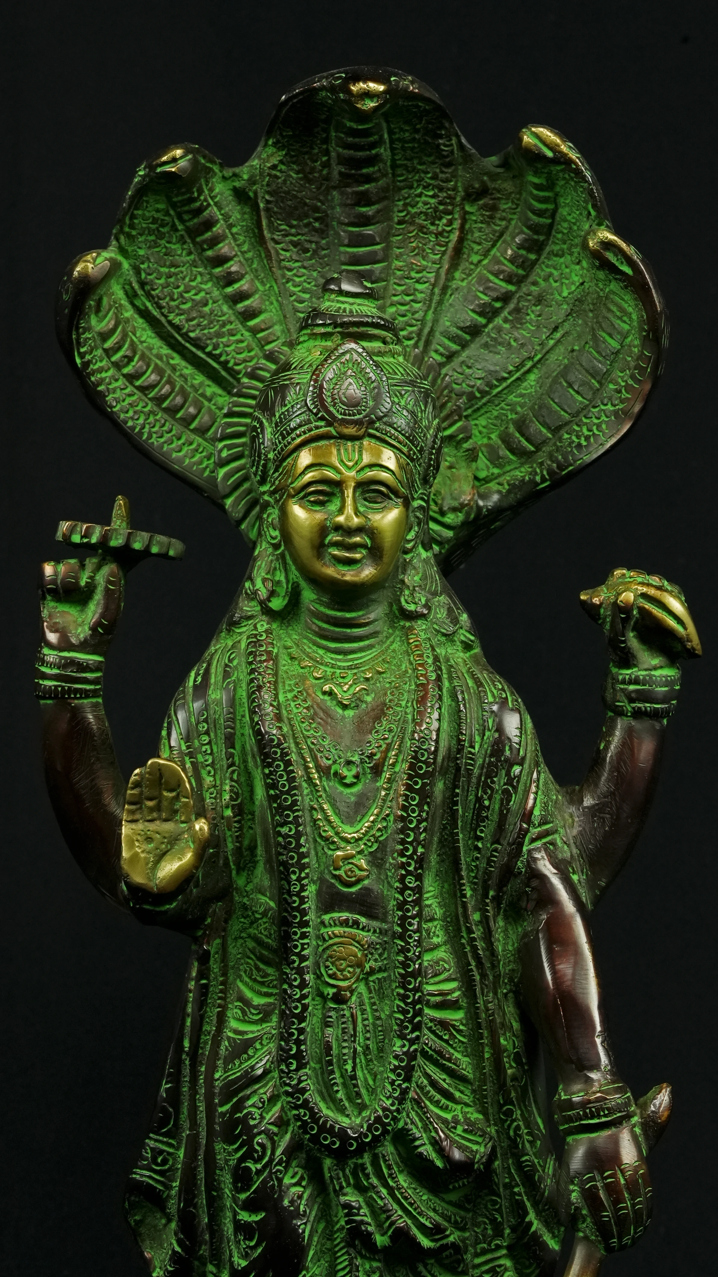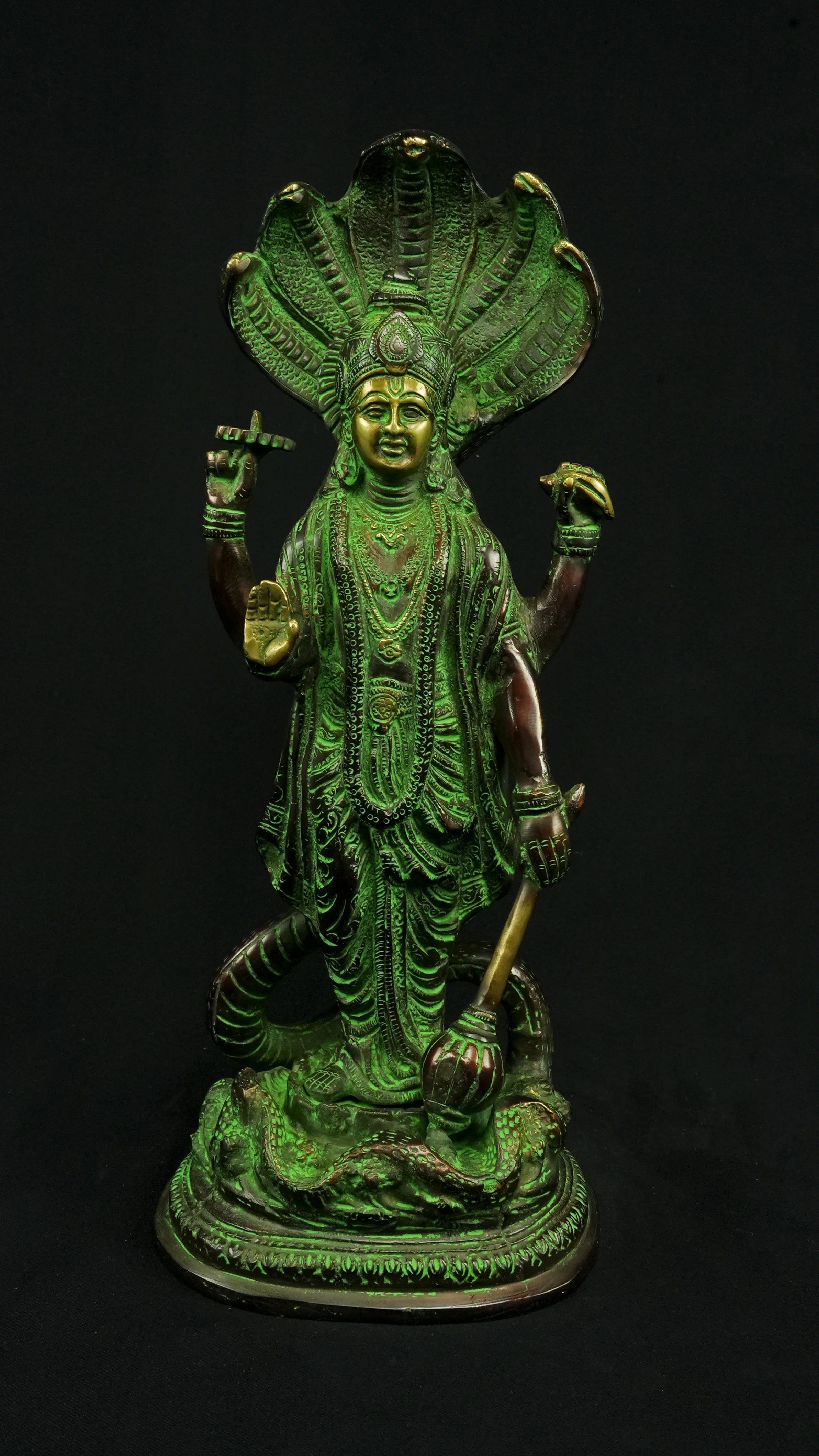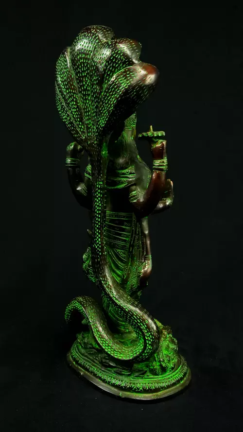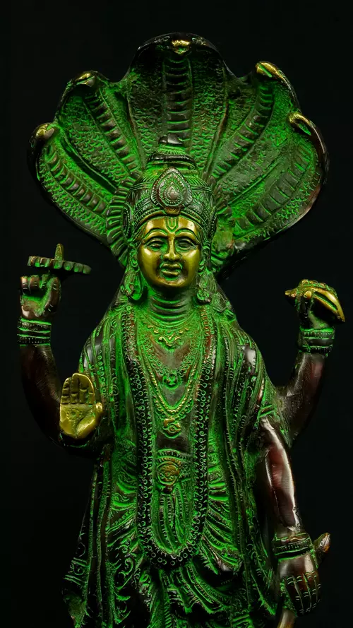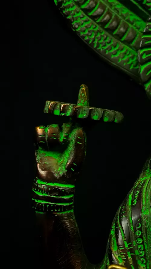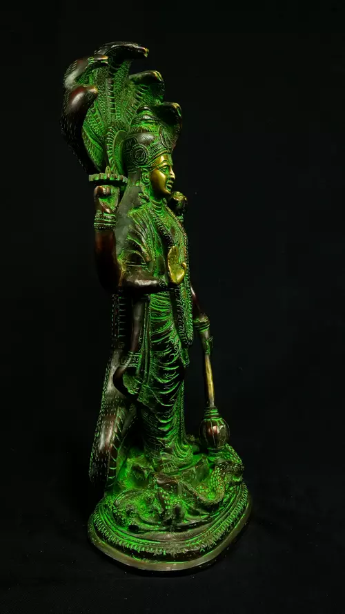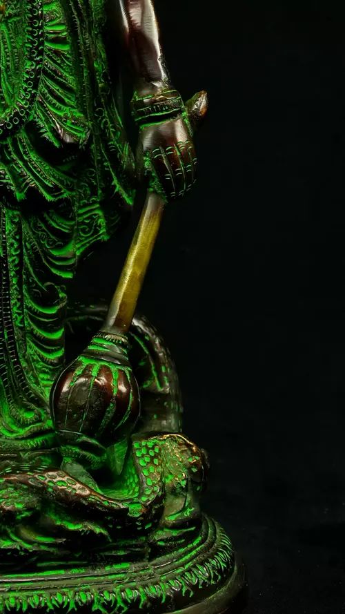 Cette statue de Dhanvantari, à la patine dorée et verte, incarne la puissance de la guérison dans sa forme la plus pure : à la fois médecine sacrée et lumière consciente. Debout sur un lotus, elle symbolise l’équilibre parfait entre la connaissance des lois naturelles et la Grâce divine qui régénère. Le vert vibrant évoque le prāna, la nature et le cœur, tandis que l’or de ses ornements rappelle la clarté intérieure indispensable à tout véritable processus de guérison.