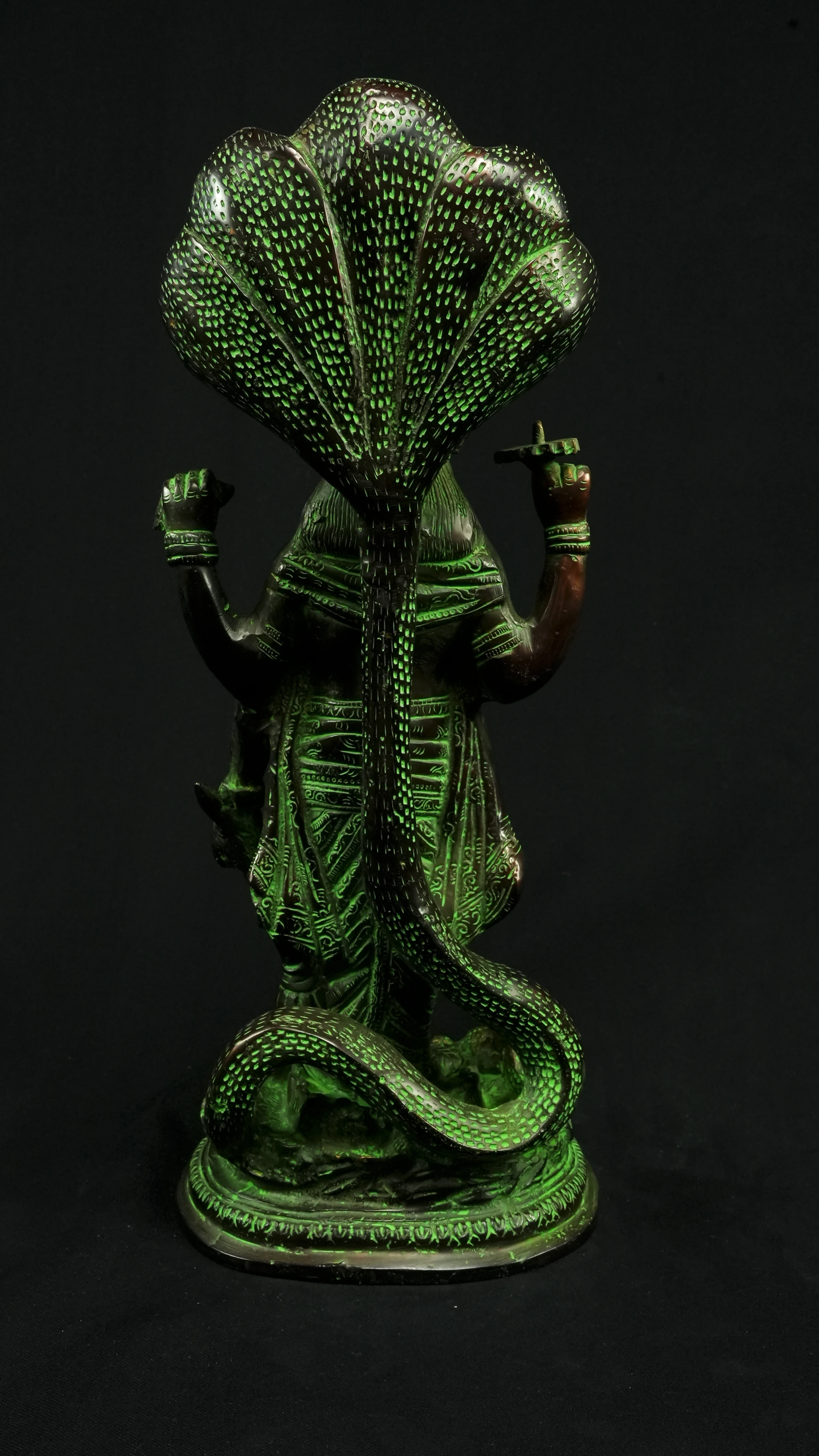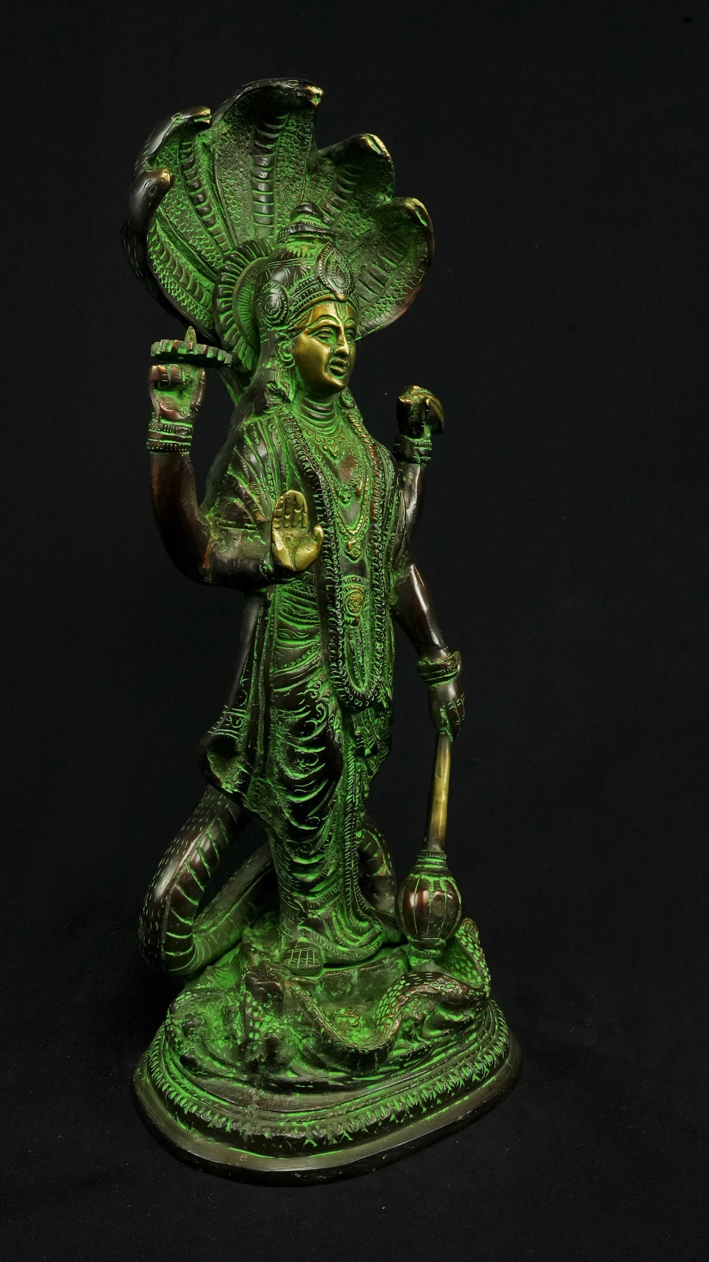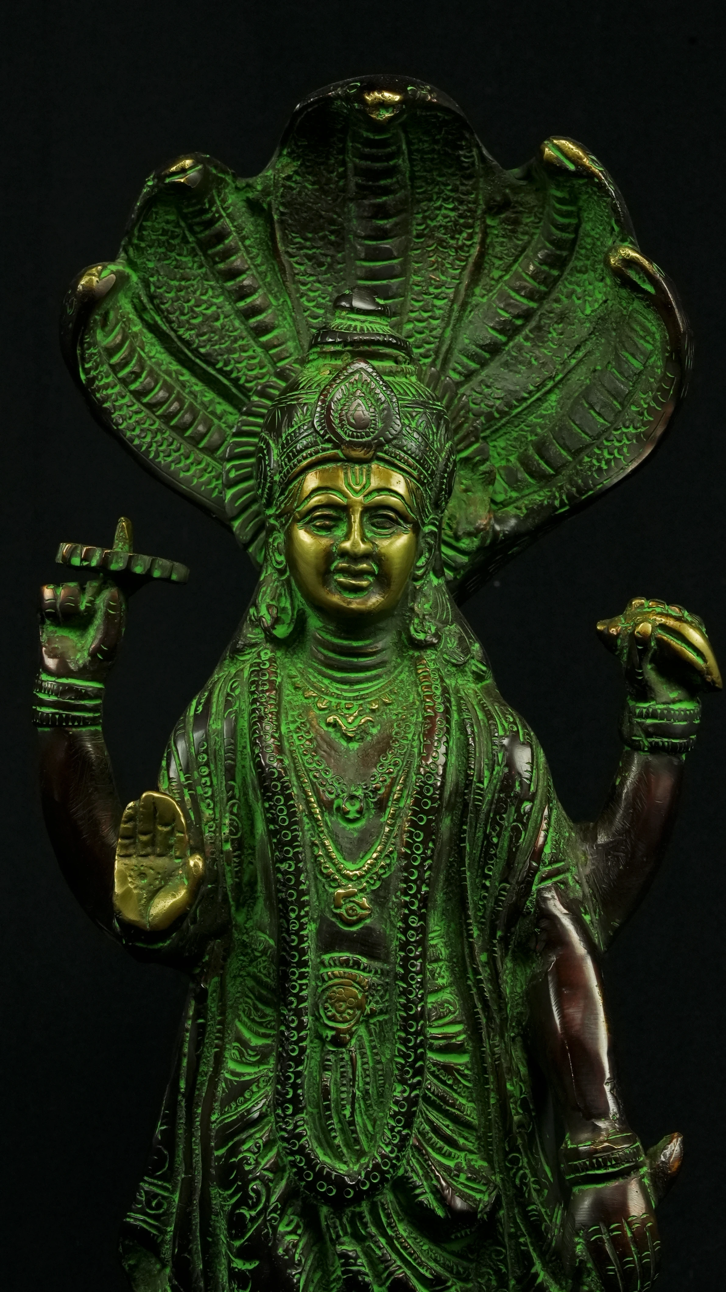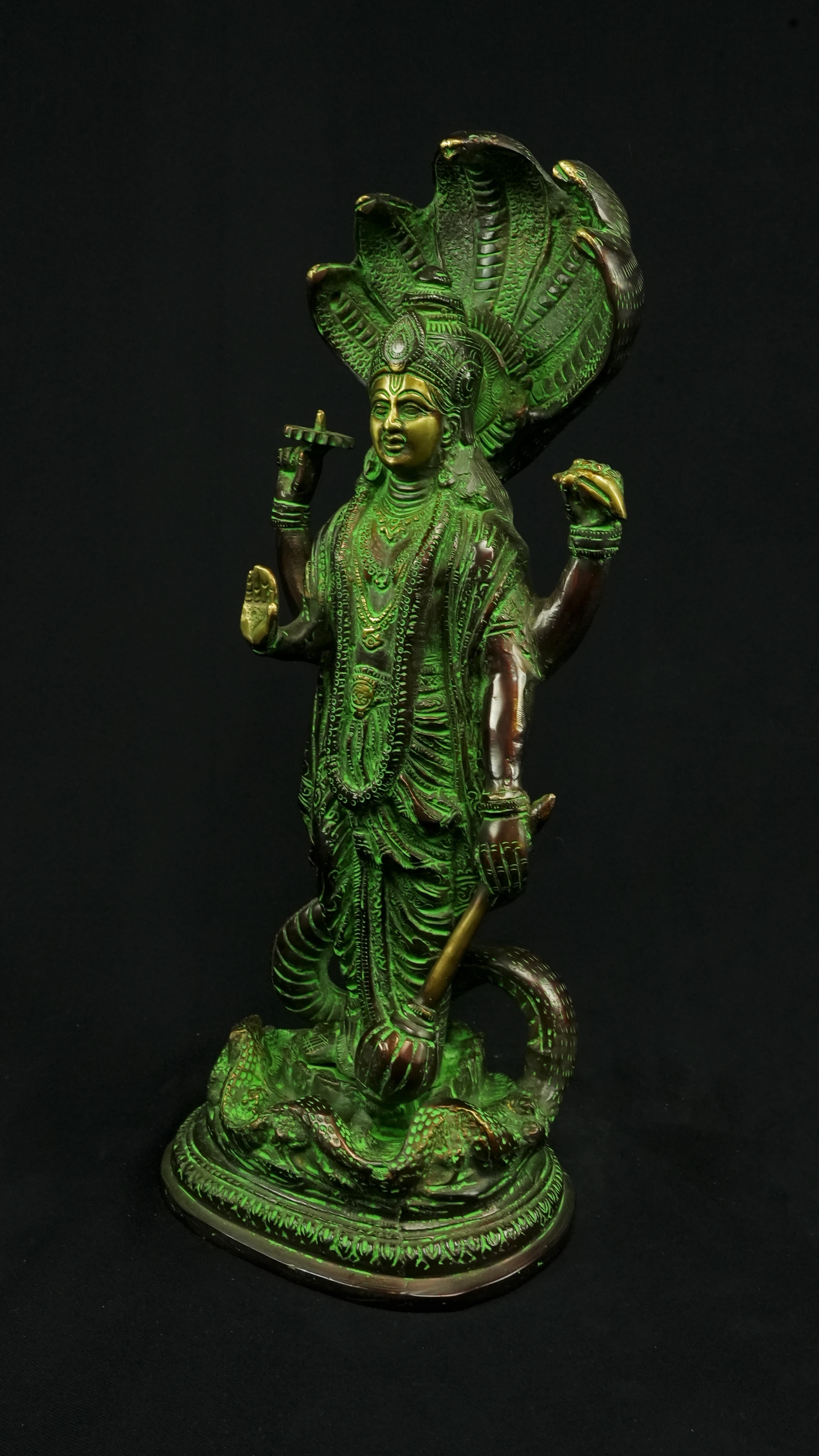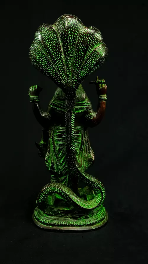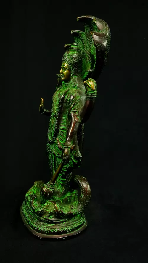 Cette statue de Dhanvantari, à la patine dorée et verte, incarne la puissance de la guérison dans sa forme la plus pure : à la fois médecine sacrée et lumière consciente. Debout sur un lotus, elle symbolise l’équilibre parfait entre la connaissance des lois naturelles et la Grâce divine qui régénère. Le vert vibrant évoque le prāna, la nature et le cœur, tandis que l’or de ses ornements rappelle la clarté intérieure indispensable à tout véritable processus de guérison.