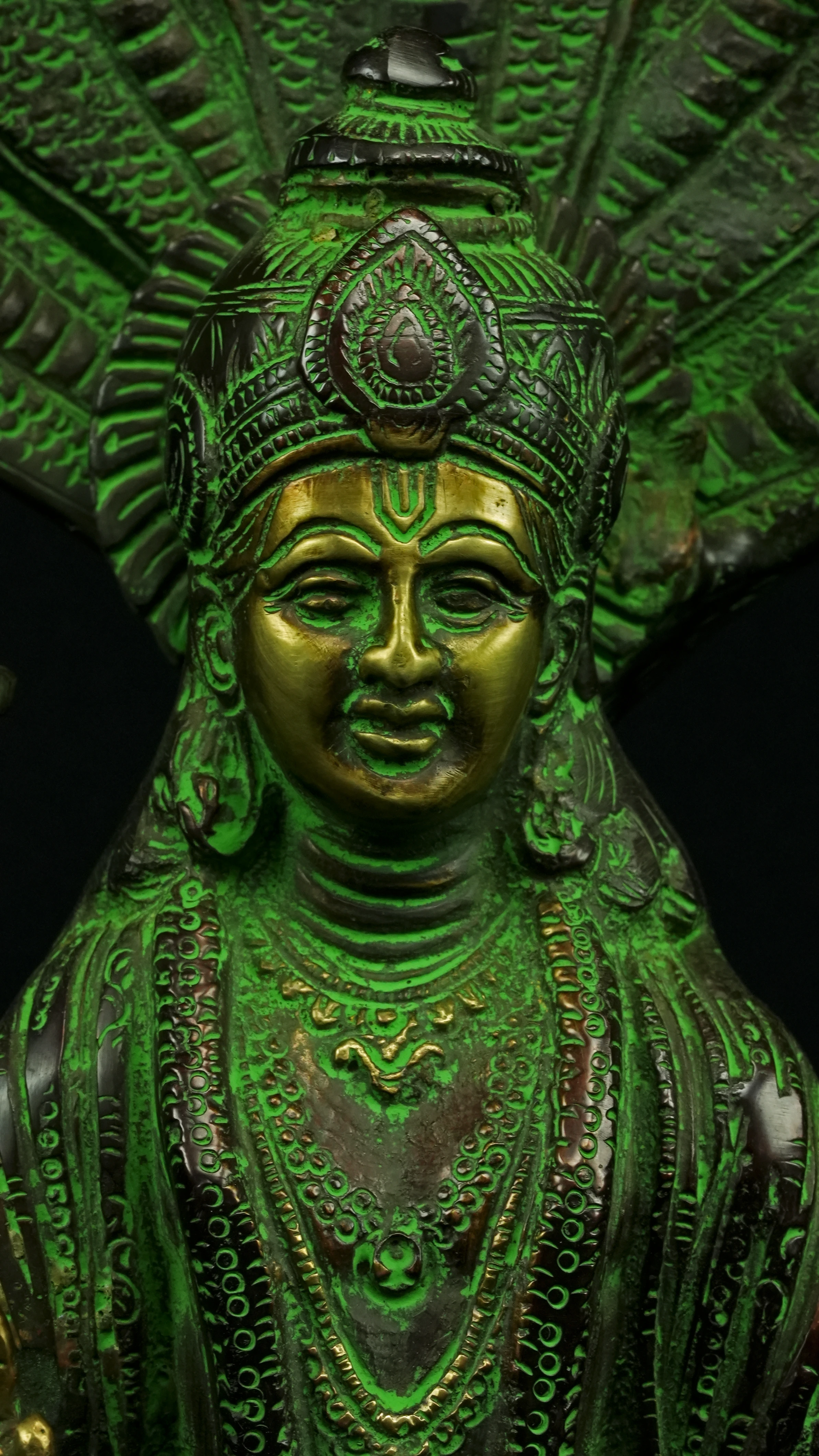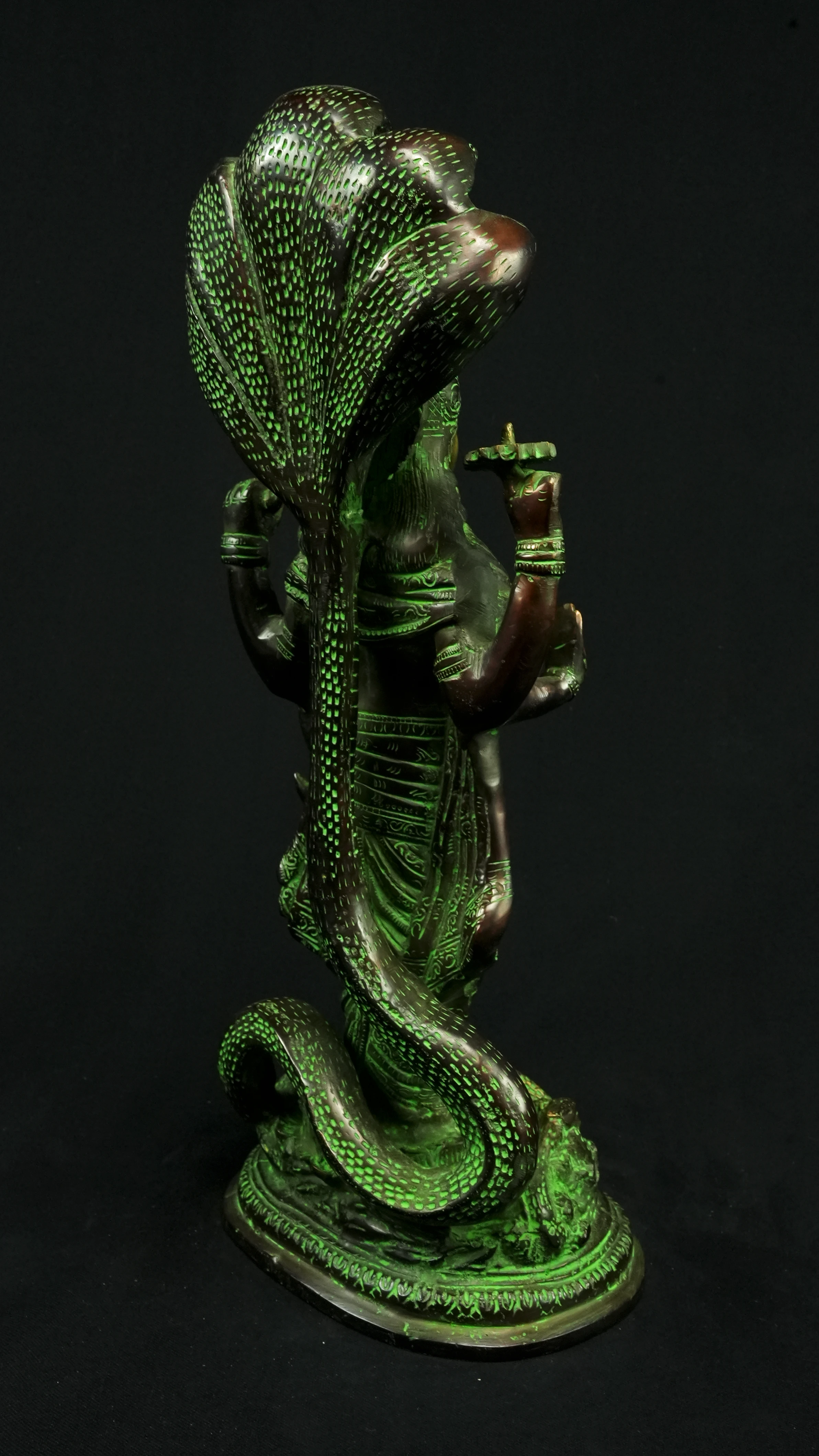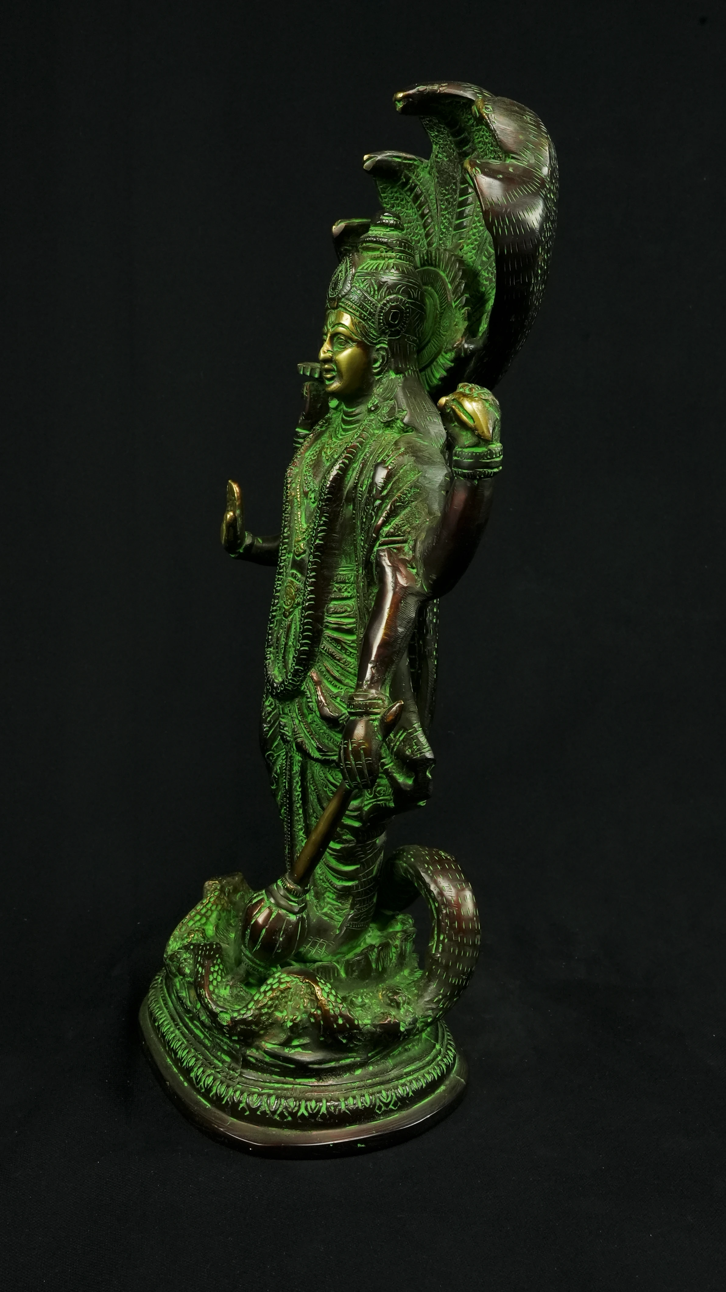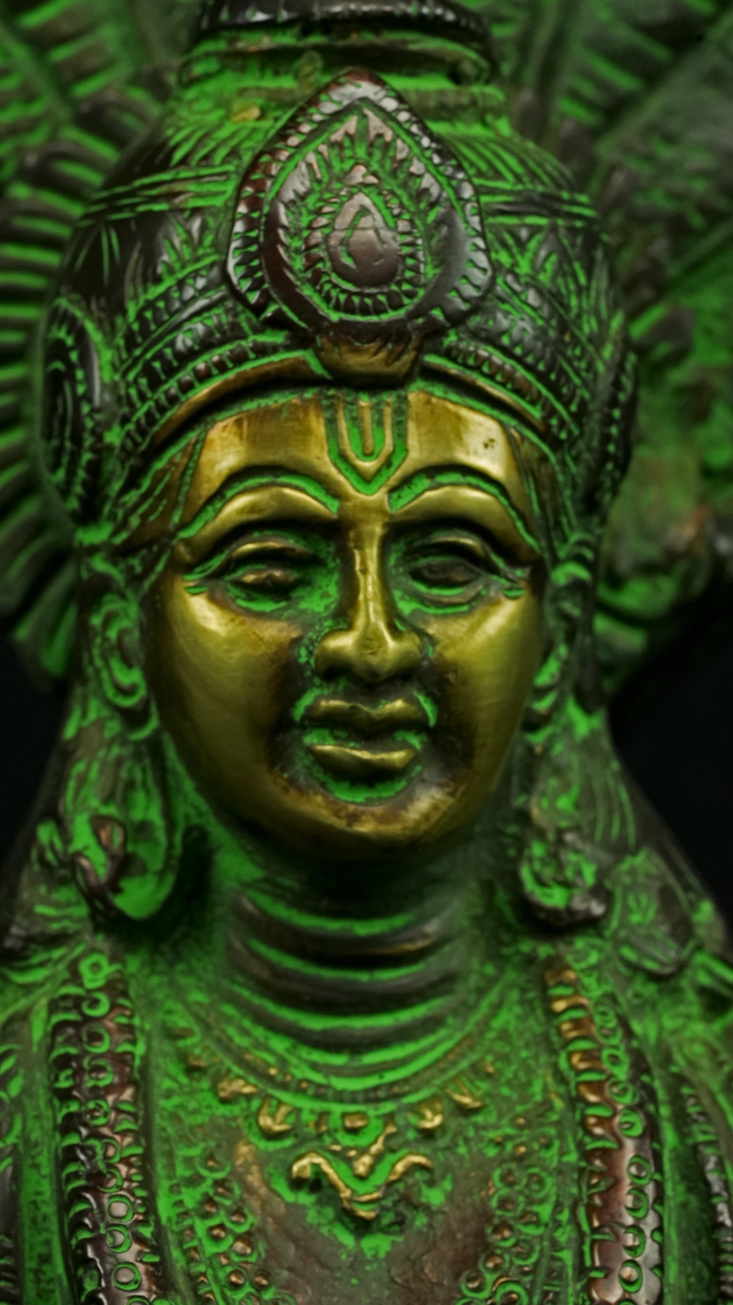 Cette statue de Dhanvantari, à la patine dorée et verte, incarne la puissance de la guérison dans sa forme la plus pure : à la fois médecine sacrée et lumière consciente. Debout sur un lotus, elle symbolise l’équilibre parfait entre la connaissance des lois naturelles et la Grâce divine qui régénère. Le vert vibrant évoque le prāna, la nature et le cœur, tandis que l’or de ses ornements rappelle la clarté intérieure indispensable à tout véritable processus de guérison.