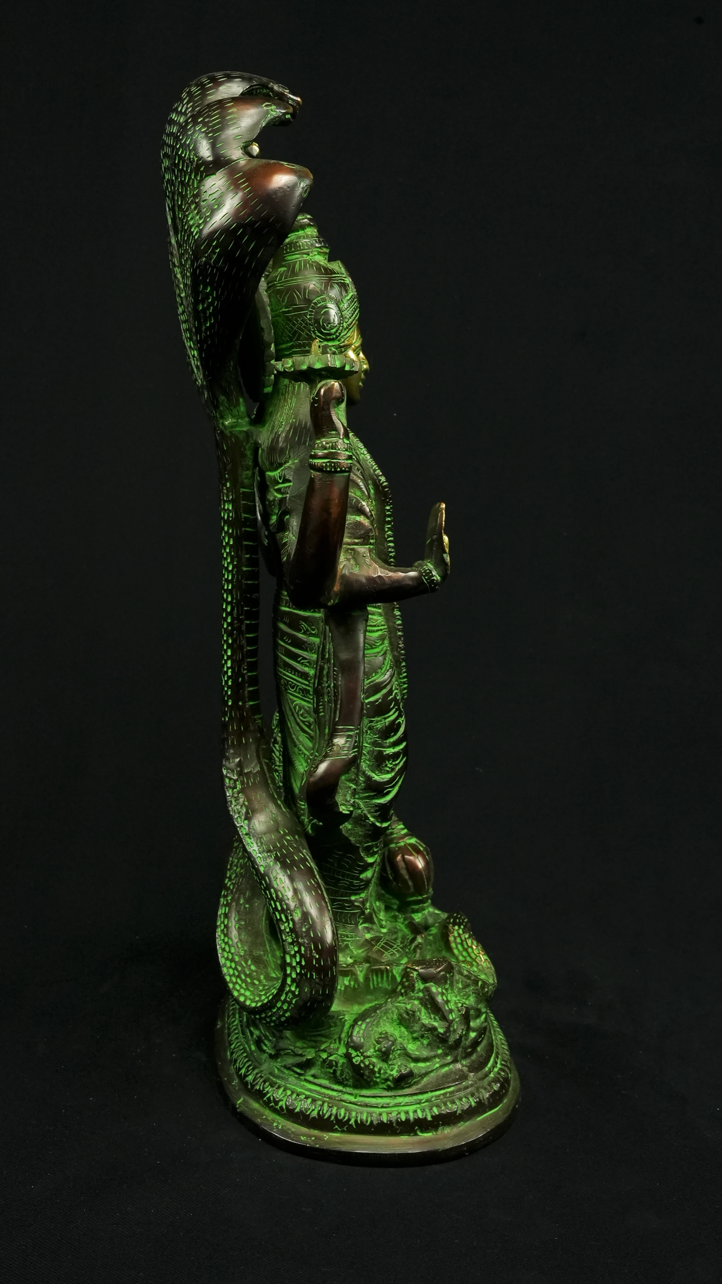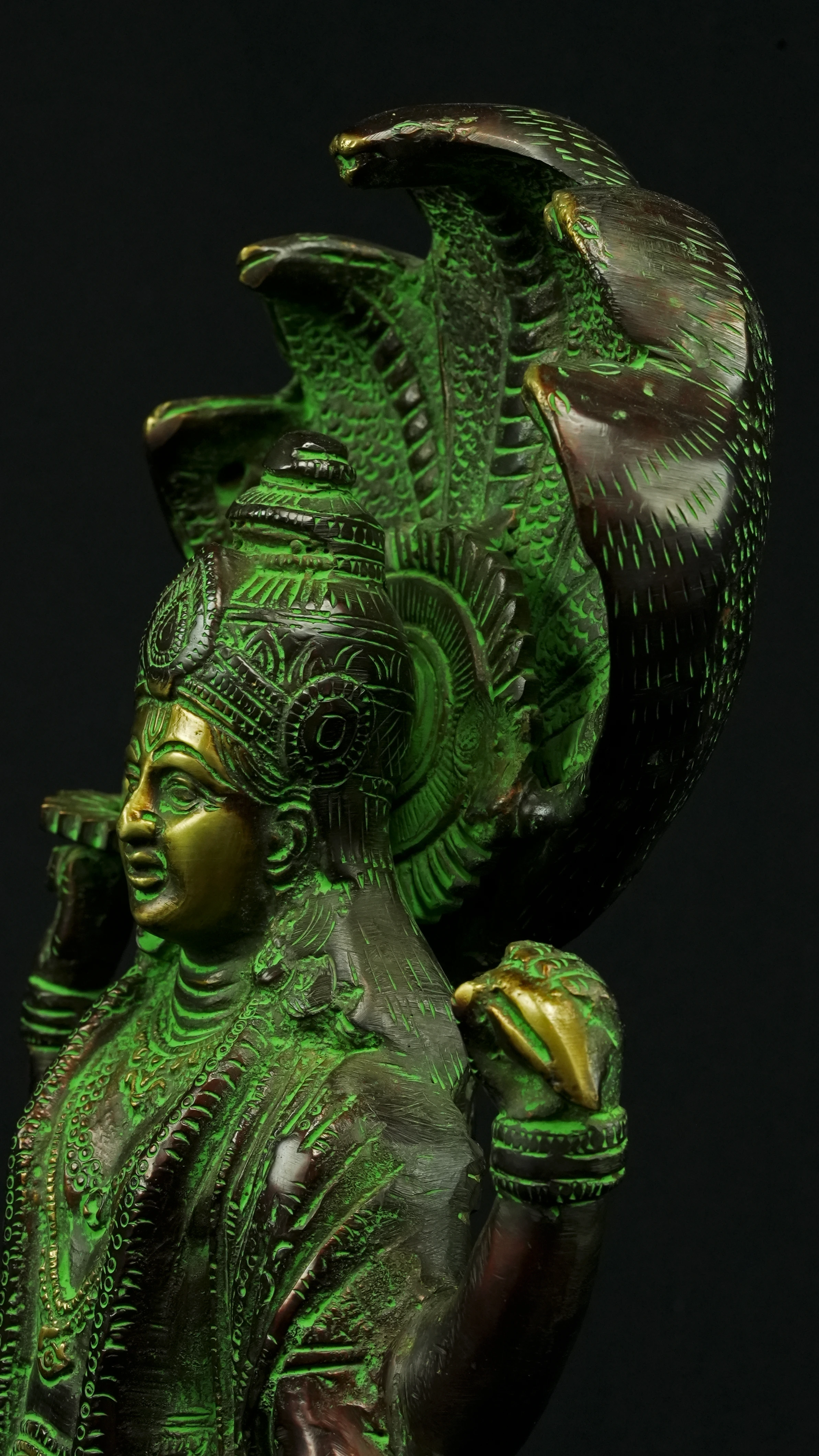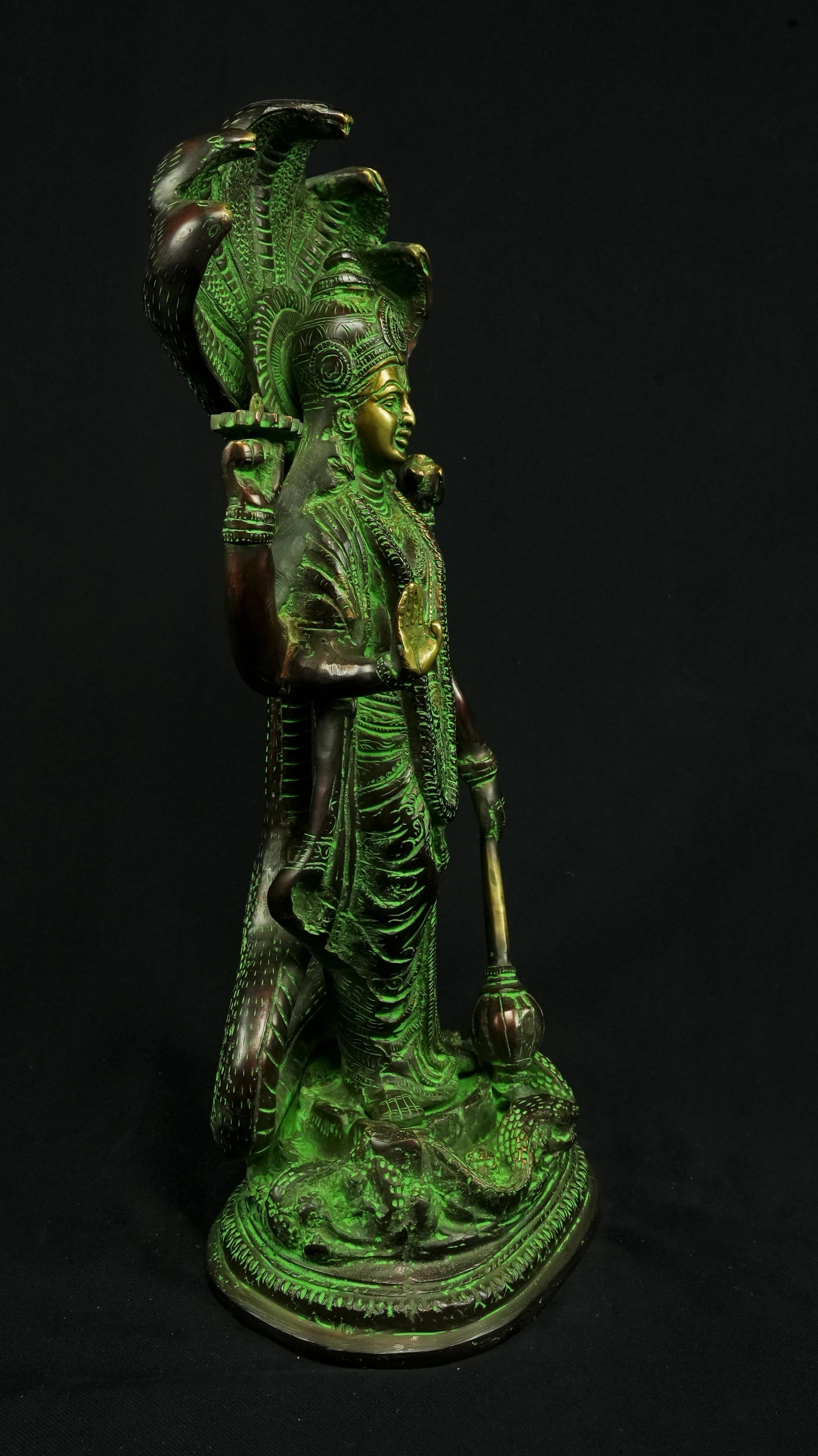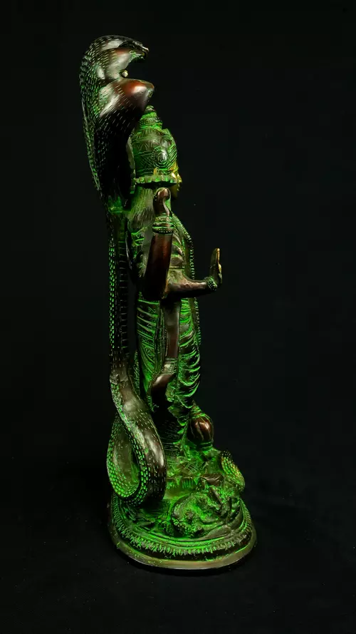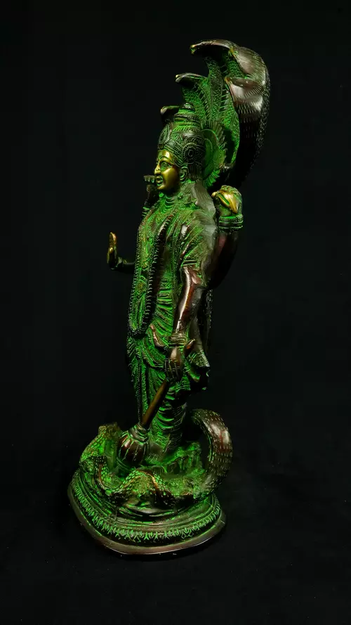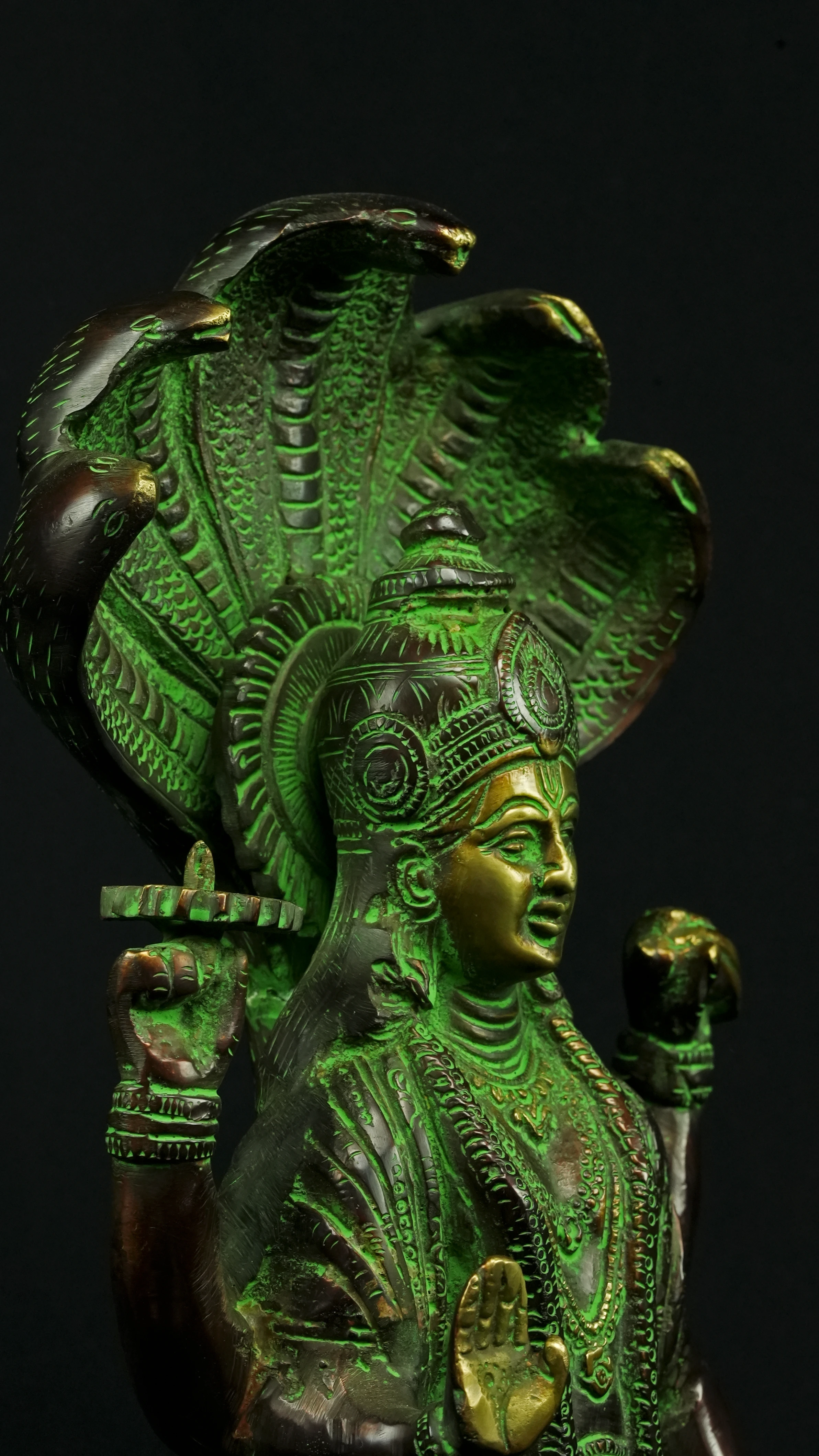 Cette statue de Dhanvantari, à la patine dorée et verte, incarne la puissance de la guérison dans sa forme la plus pure : à la fois médecine sacrée et lumière consciente. Debout sur un lotus, elle symbolise l’équilibre parfait entre la connaissance des lois naturelles et la Grâce divine qui régénère. Le vert vibrant évoque le prāna, la nature et le cœur, tandis que l’or de ses ornements rappelle la clarté intérieure indispensable à tout véritable processus de guérison.