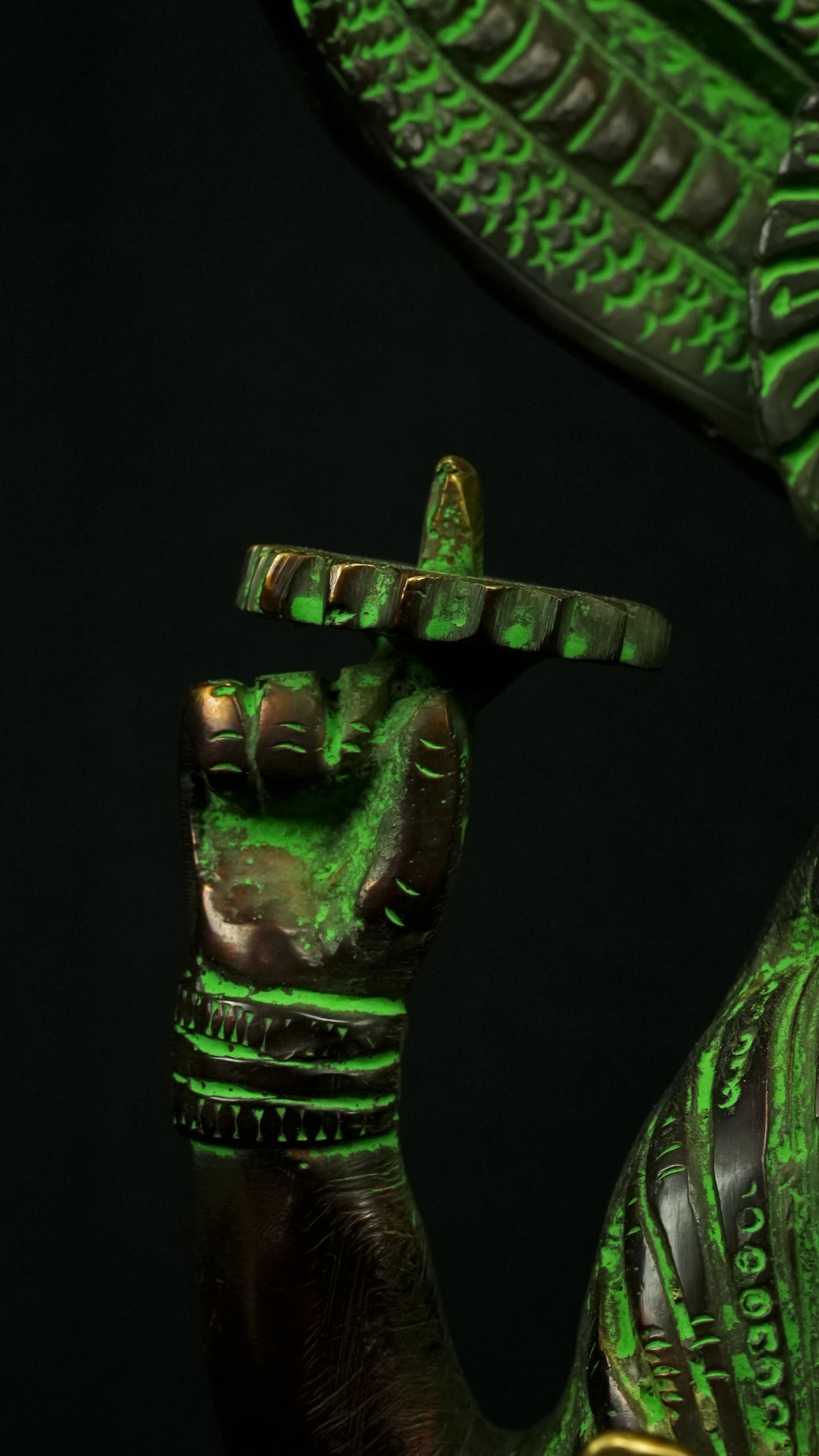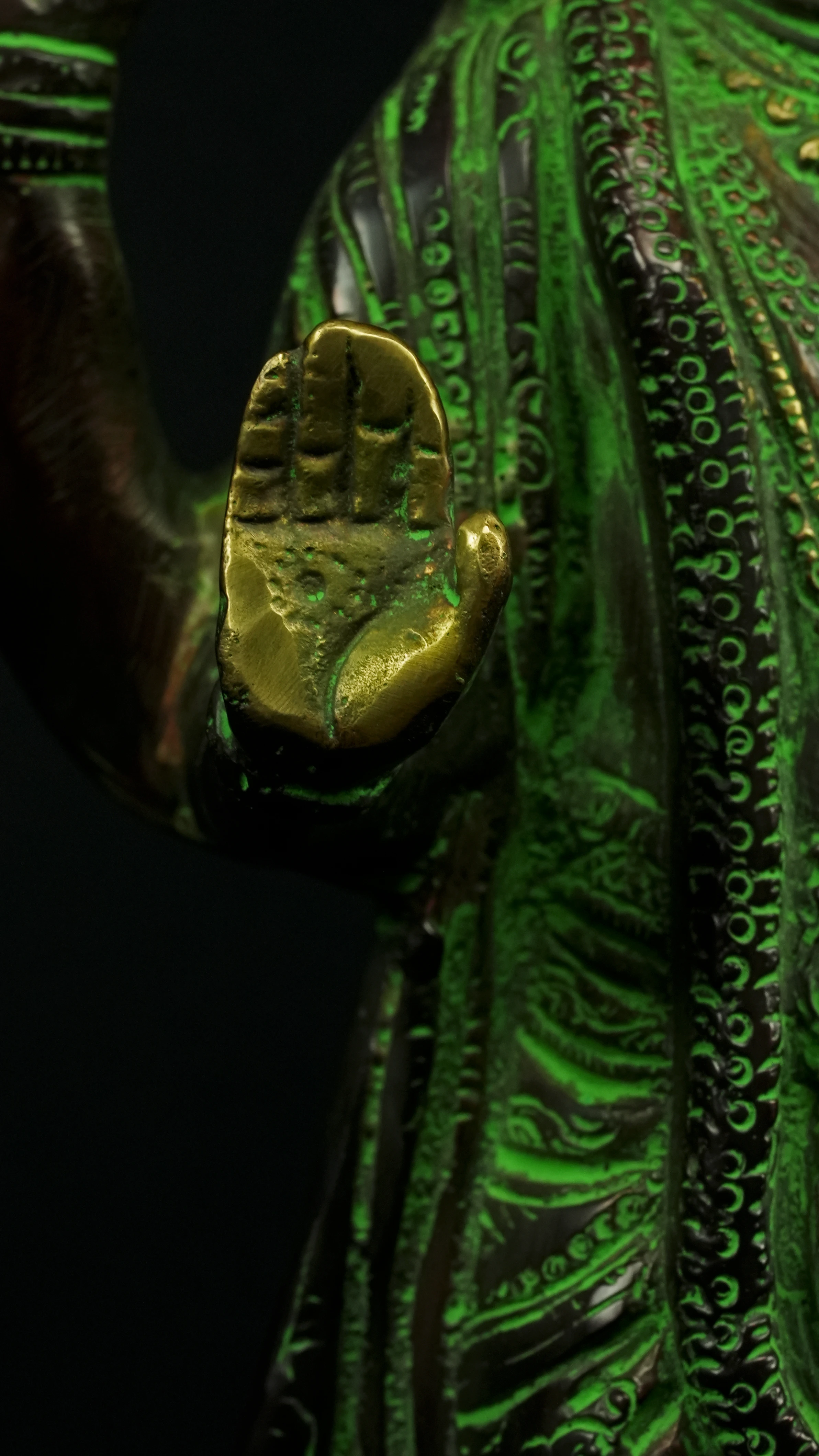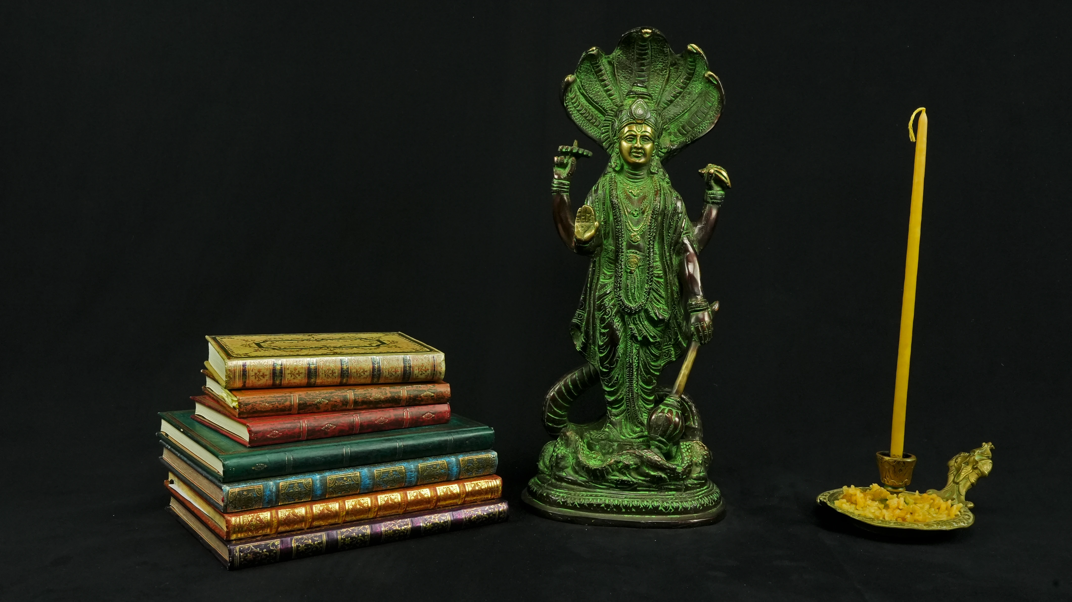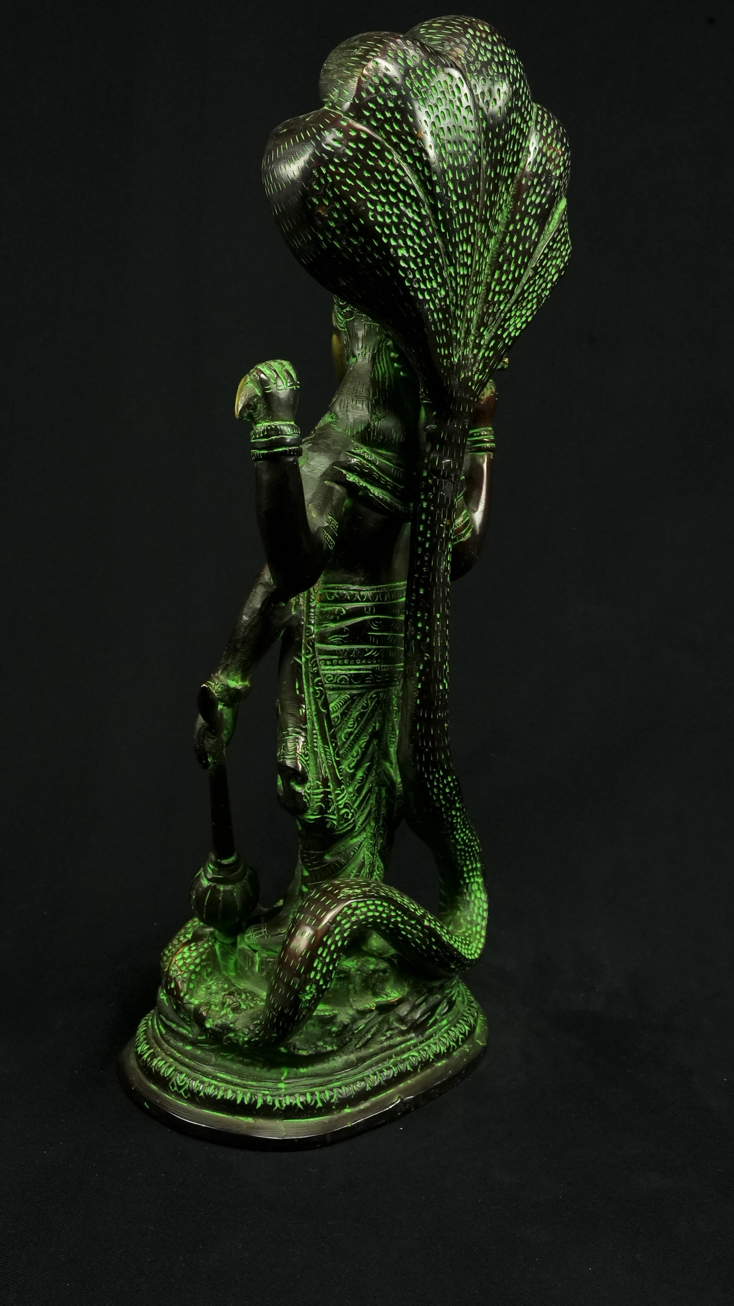 Cette statue de Dhanvantari, à la patine dorée et verte, incarne la puissance de la guérison dans sa forme la plus pure : à la fois médecine sacrée et lumière consciente. Debout sur un lotus, elle symbolise l’équilibre parfait entre la connaissance des lois naturelles et la Grâce divine qui régénère. Le vert vibrant évoque le prāna, la nature et le cœur, tandis que l’or de ses ornements rappelle la clarté intérieure indispensable à tout véritable processus de guérison.