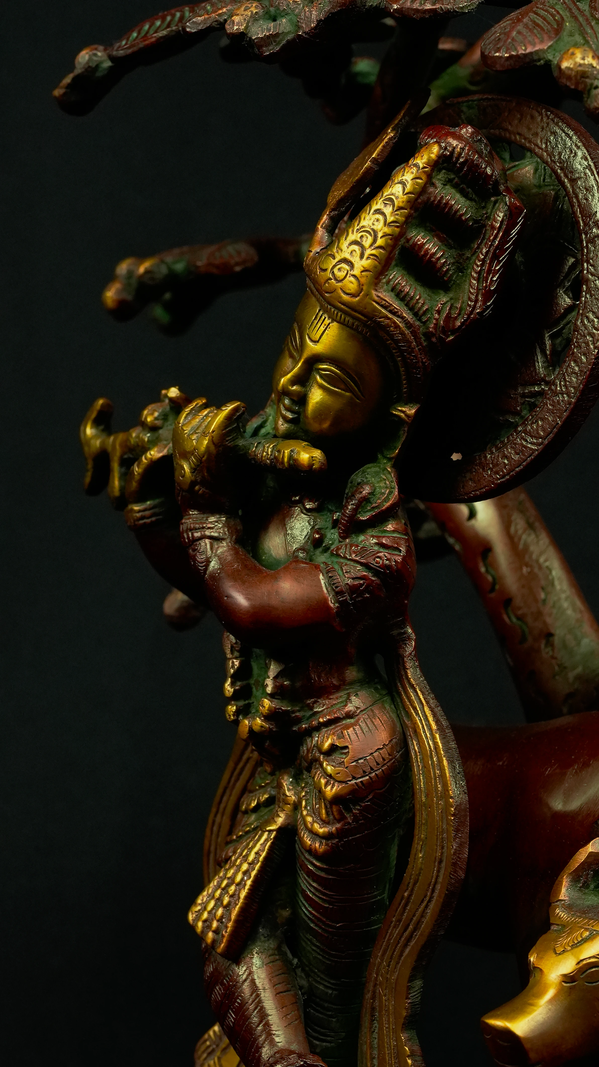 Dans cette représentation, Krishna adopte une posture élégante et fluide, debout avec sa jambe droite croisée sur la gauche, tout en jouant de sa flûte divine. Ce geste incarne l’harmonie parfaite entre le spirituel et le matériel, l’équilibre entre l’action et la contemplation, le divin et l’humain.