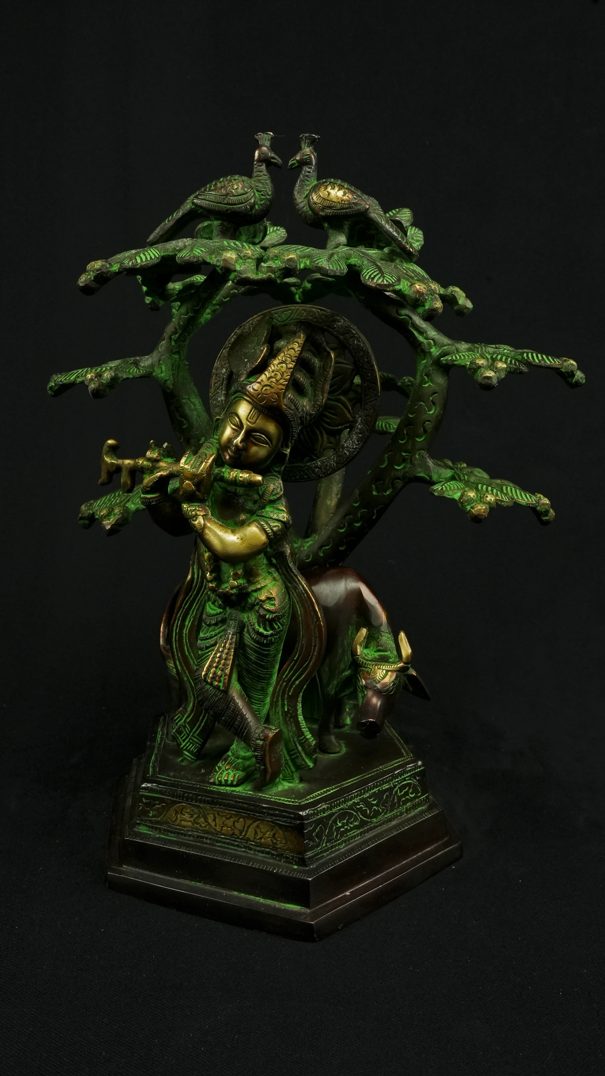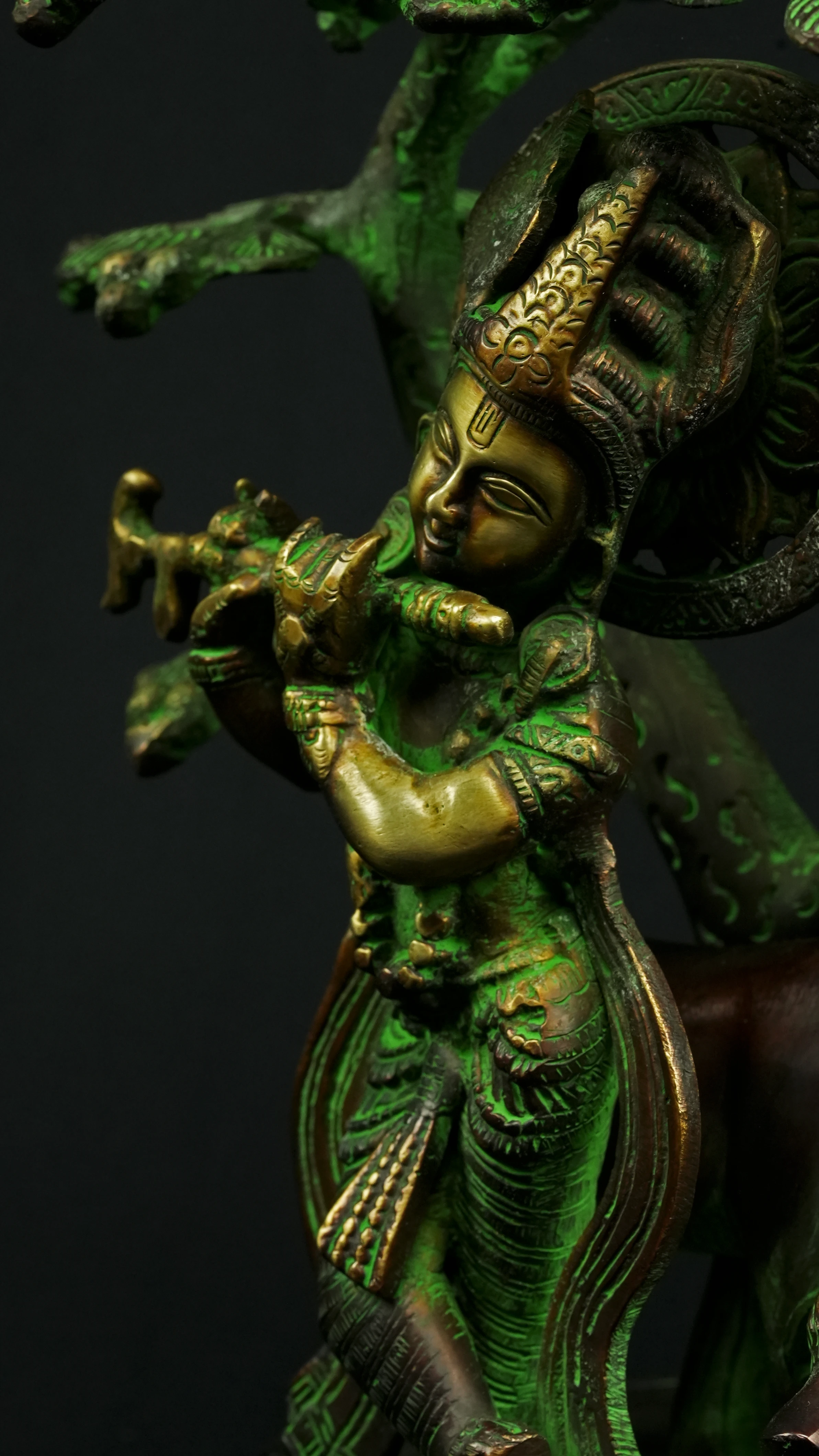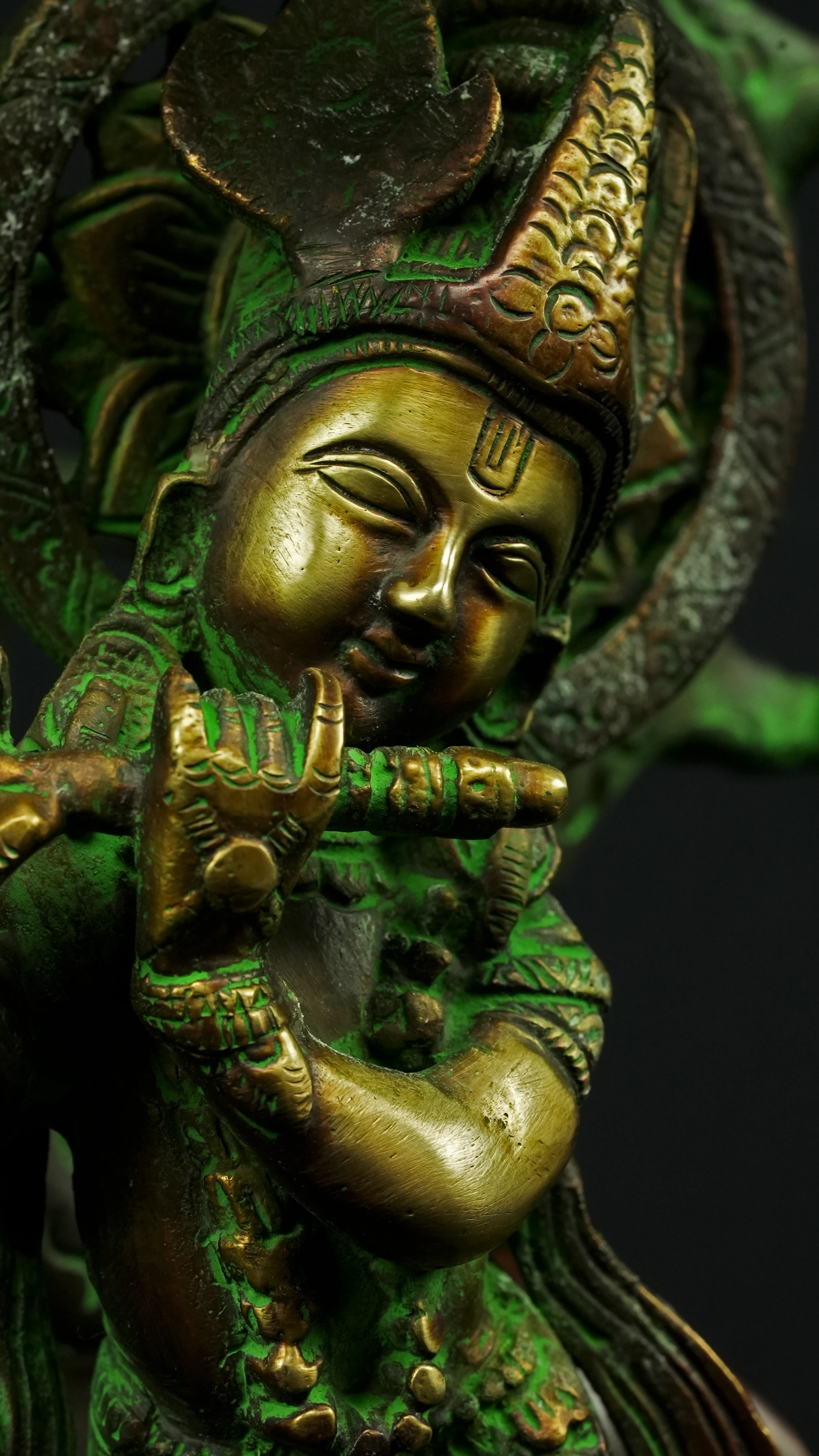 Dans cette représentation, Krishna adopte une posture élégante et fluide, debout avec sa jambe droite croisée sur la gauche, tout en jouant de sa flûte divine. Ce geste incarne l’harmonie parfaite entre le spirituel et le matériel, l’équilibre entre l’action et la contemplation, le divin et l’humain.
