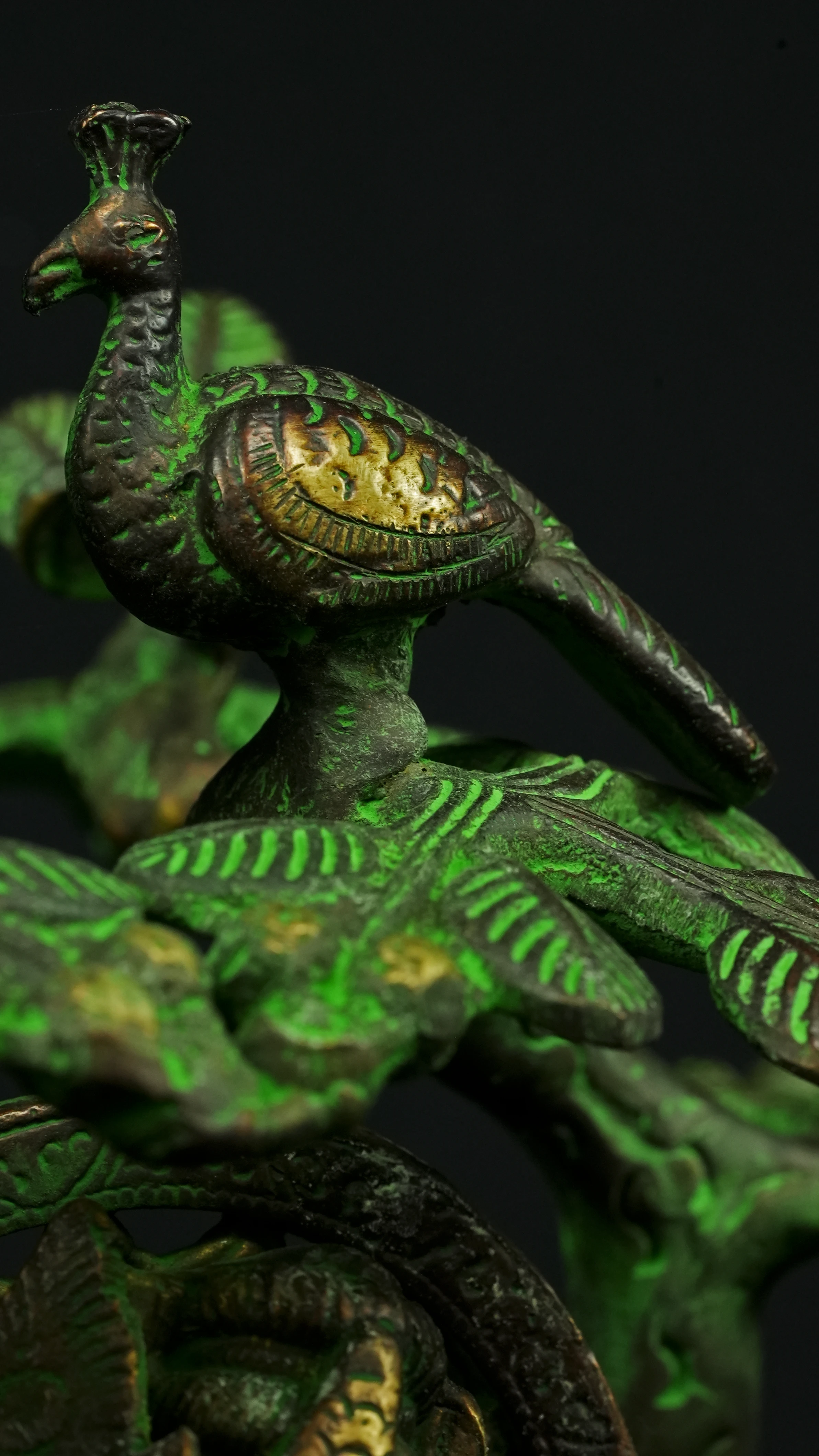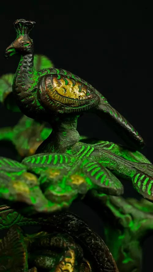 La plume de paon que Krishna porte sur sa couronne représente quant à elle l’harmonie cosmique, la grâce et la maîtrise des énergies subtiles. Associée aux 7 Rayons Sacrés, elle reflète l’équilibre spirituel que Krishna transmet à ses dévots, les guidant vers une compréhension plus profonde de leur propre lumière intérieure.
