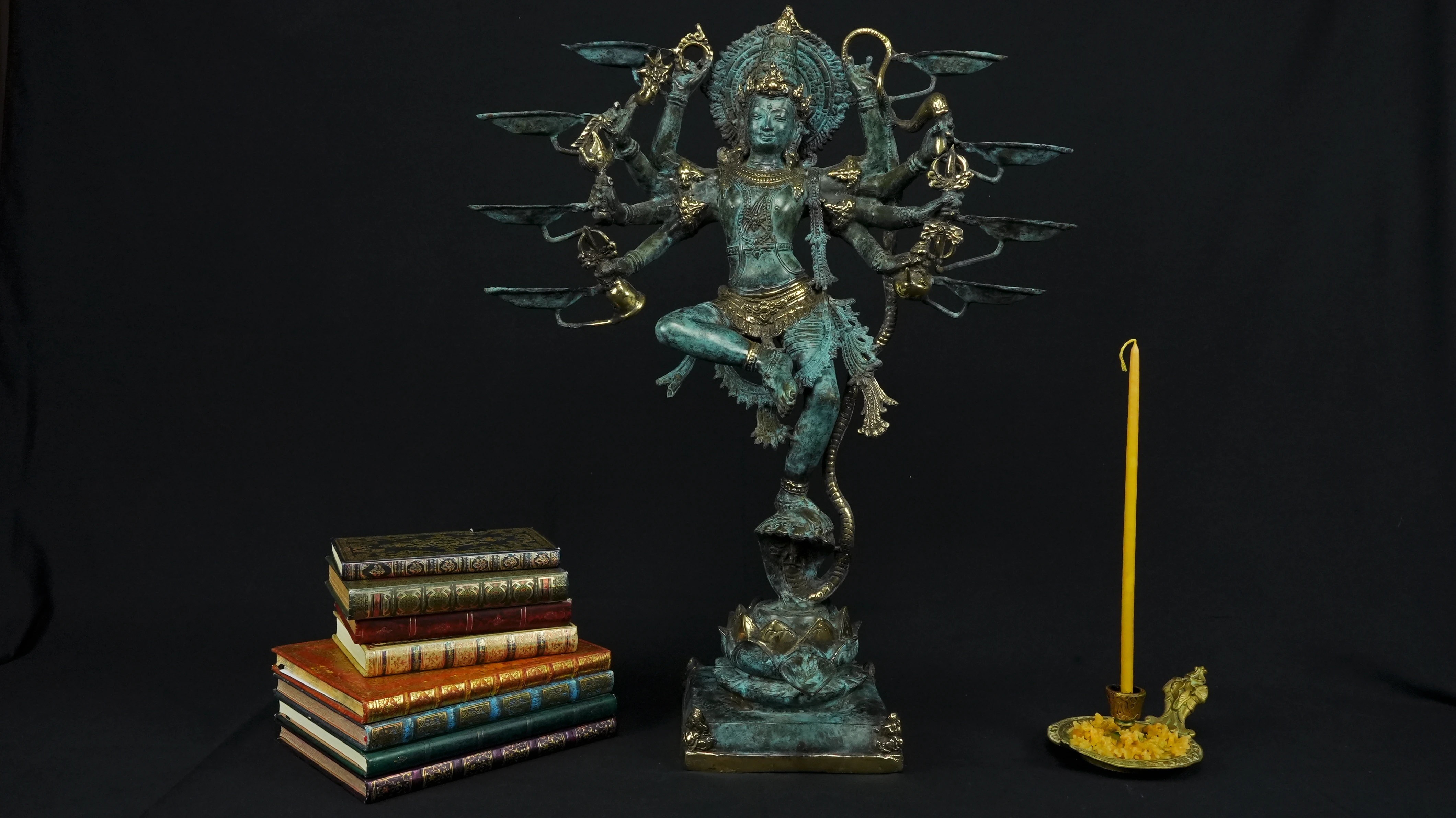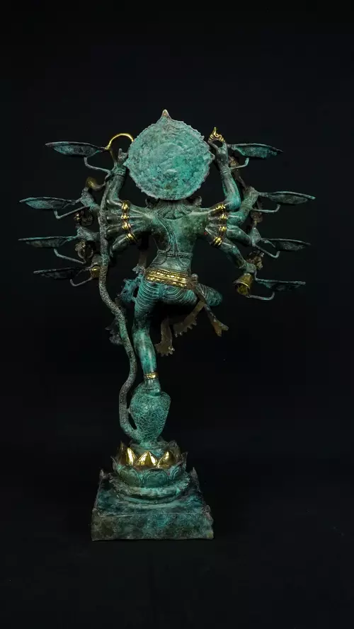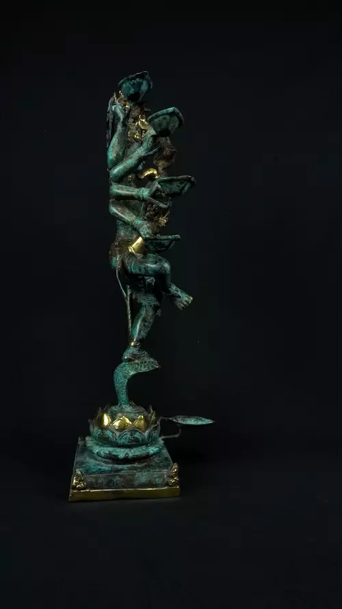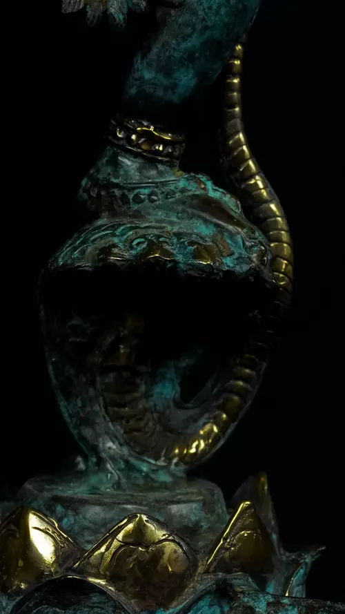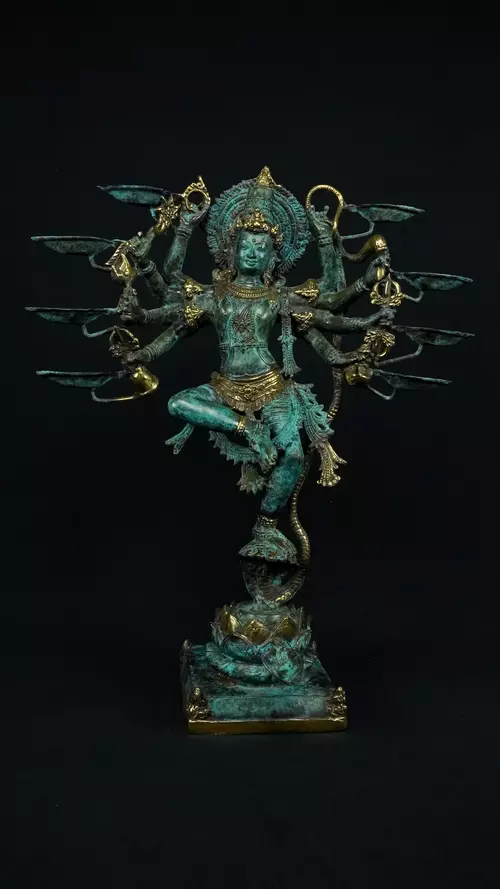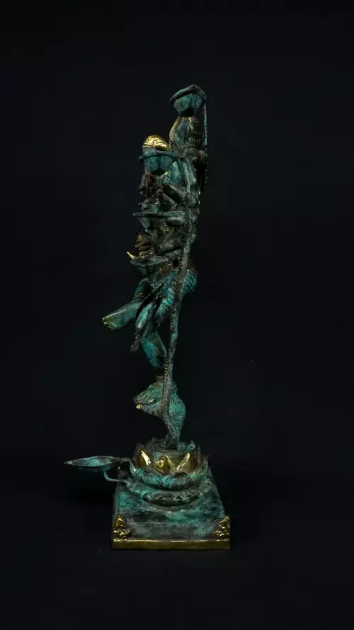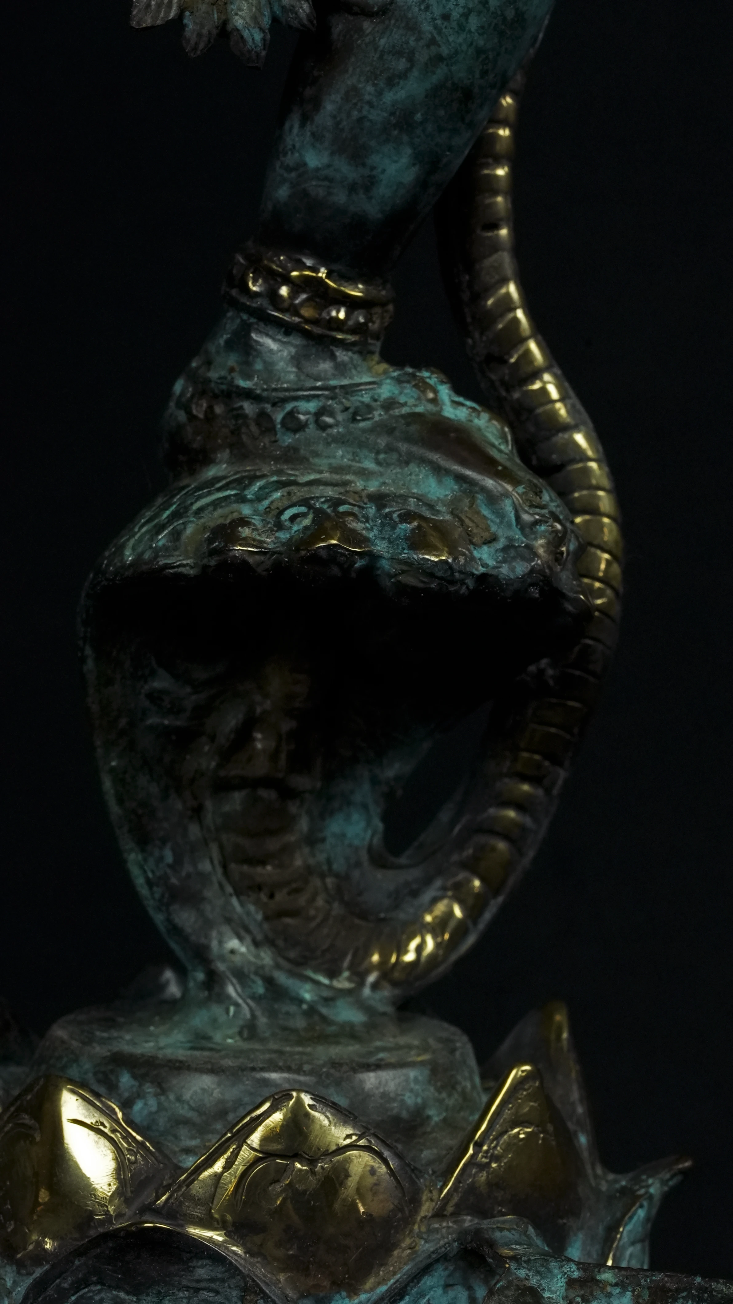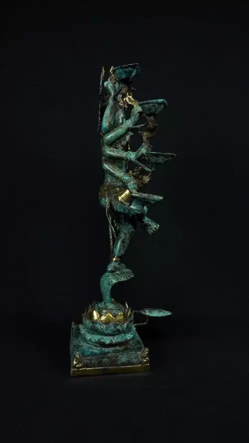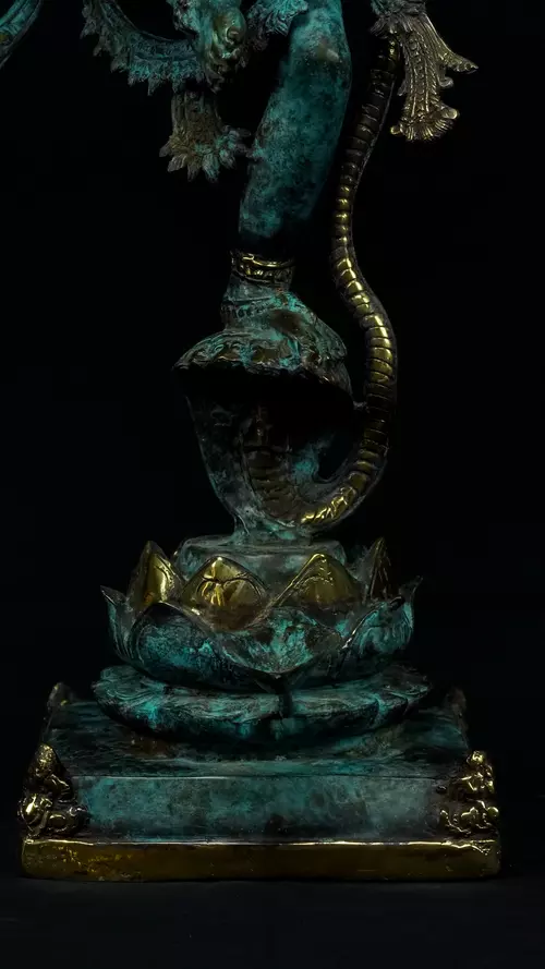 Sa danse sur le serpent sacré exprime l’union parfaite entre la matière et le divin, la transformation naturelle de l’énergie vitale en sagesse, abondance et harmonie universelle.