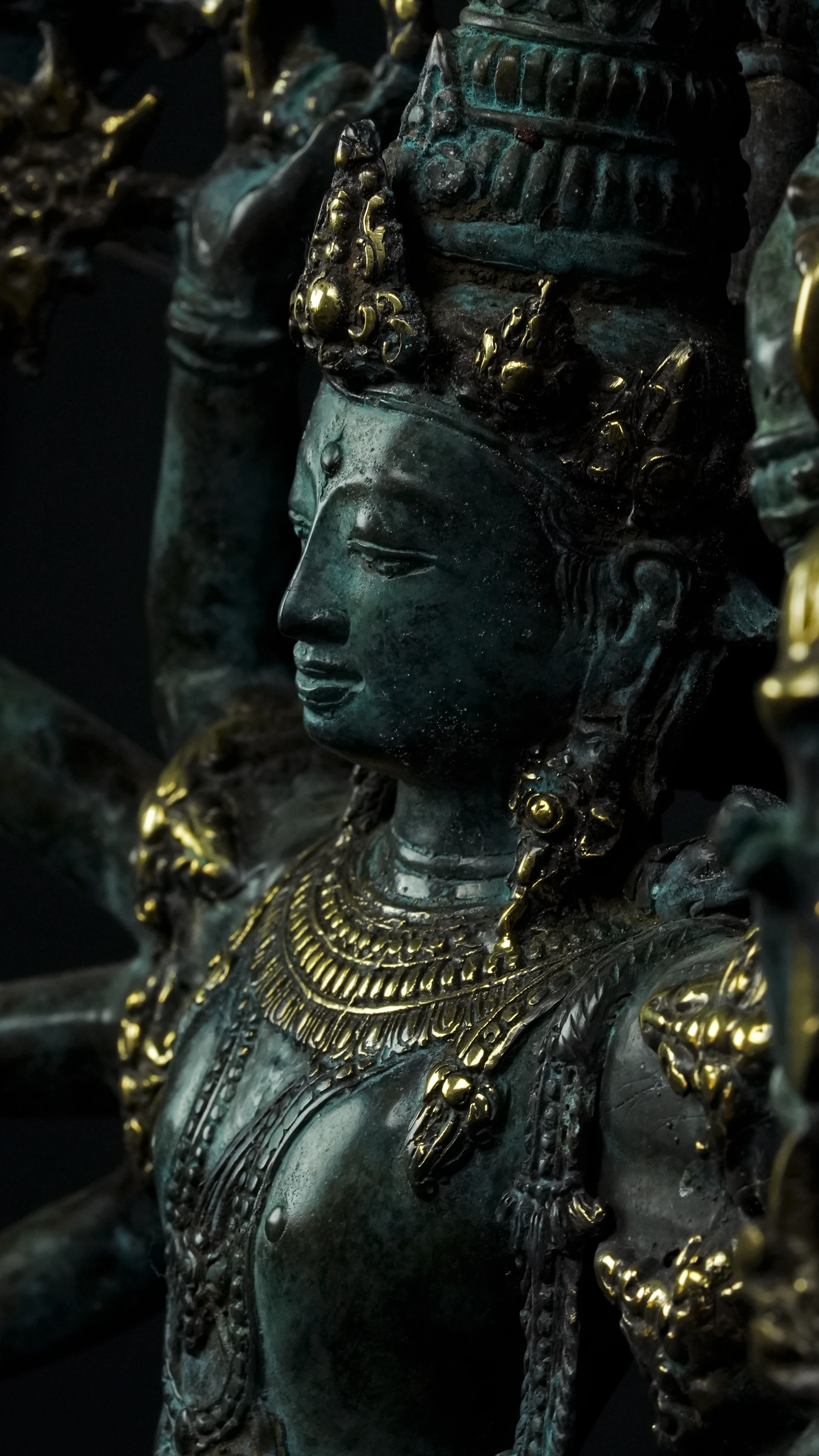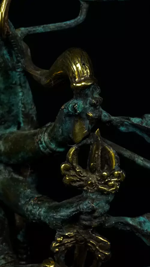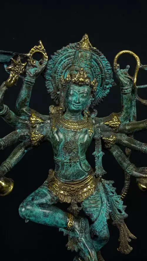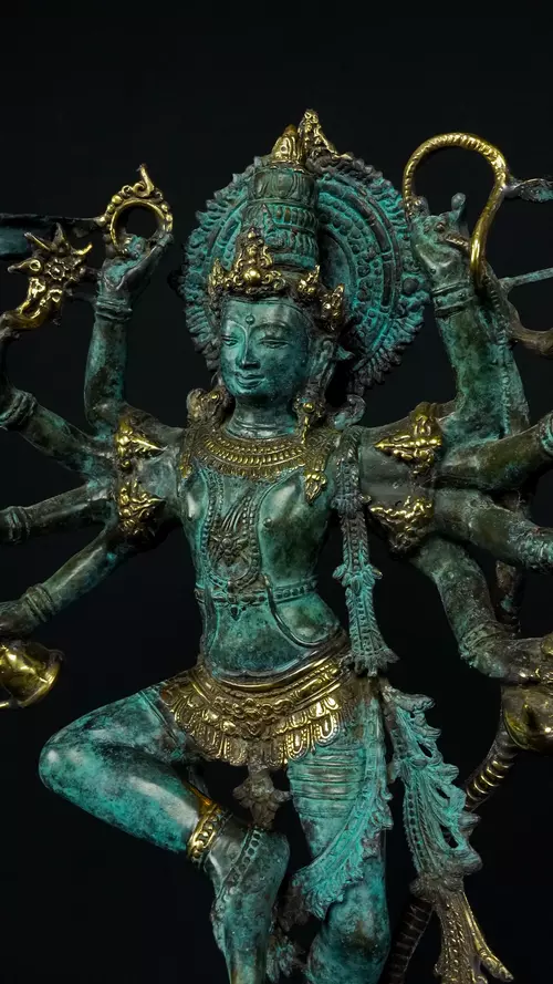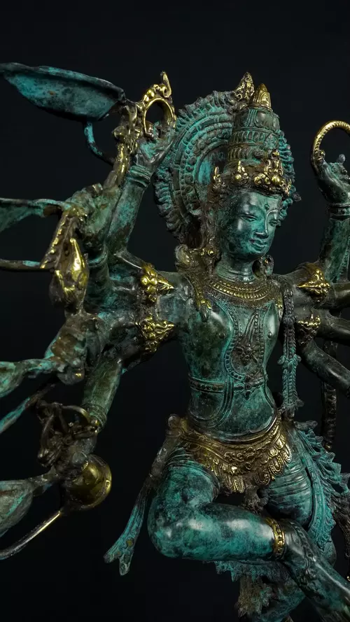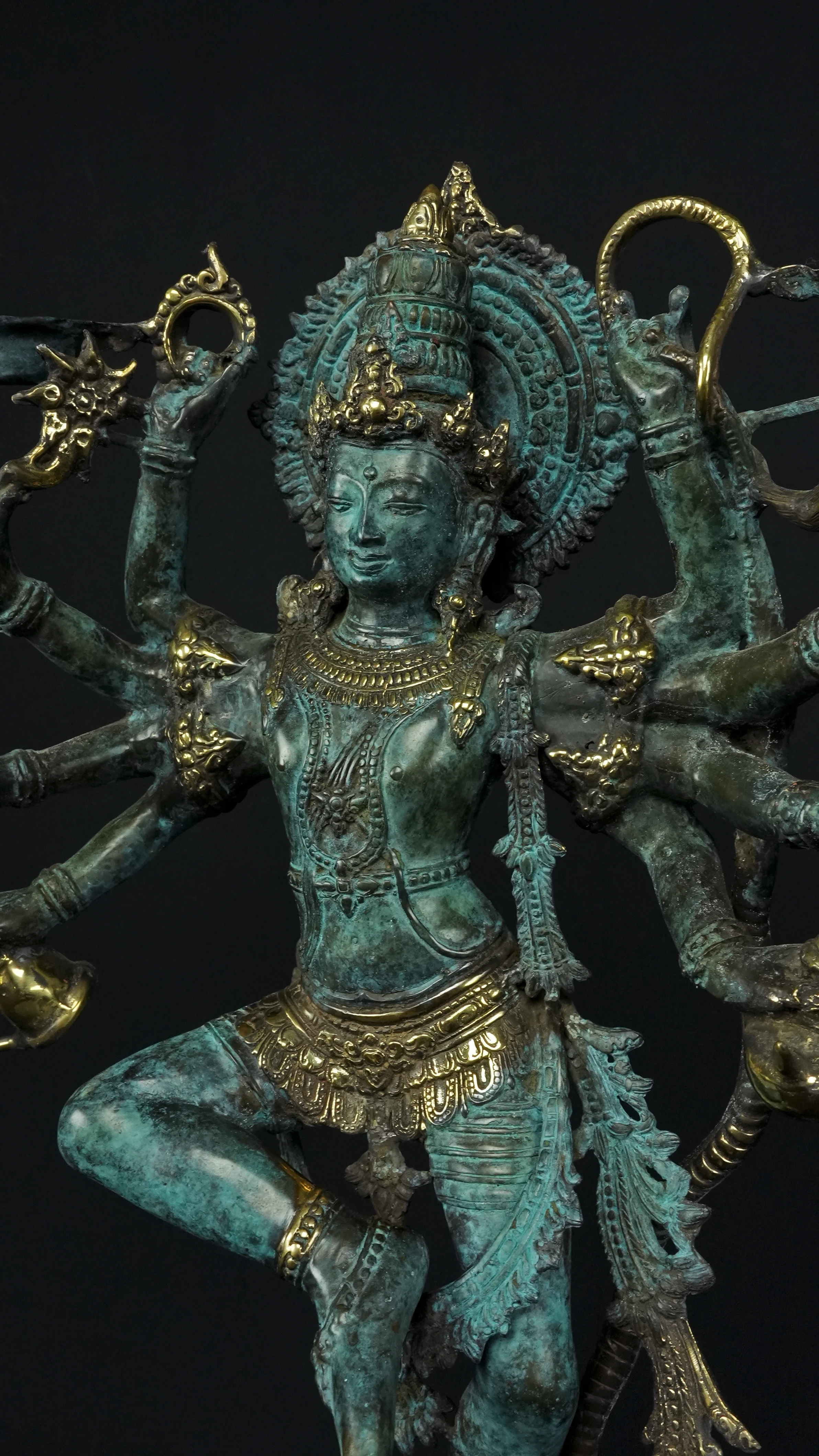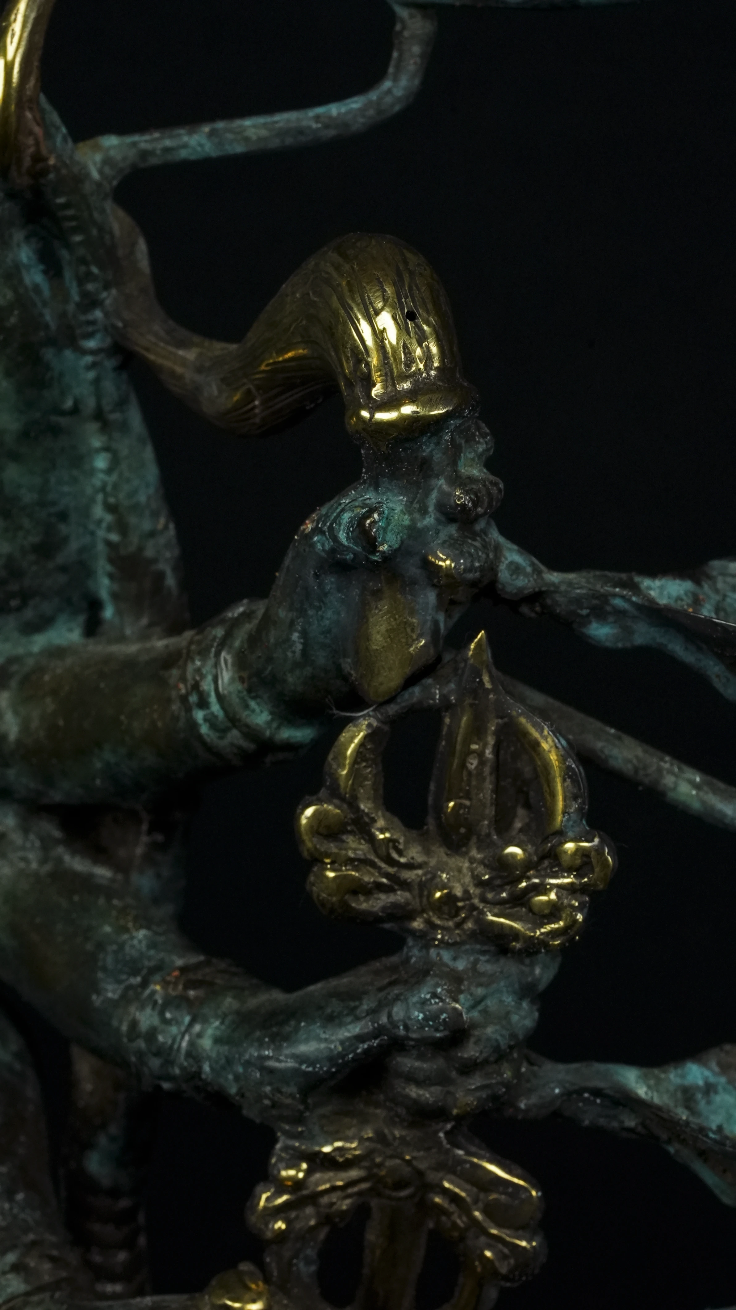 Sa danse sur le serpent sacré exprime l’union parfaite entre la matière et le divin, la transformation naturelle de l’énergie vitale en sagesse, abondance et harmonie universelle.