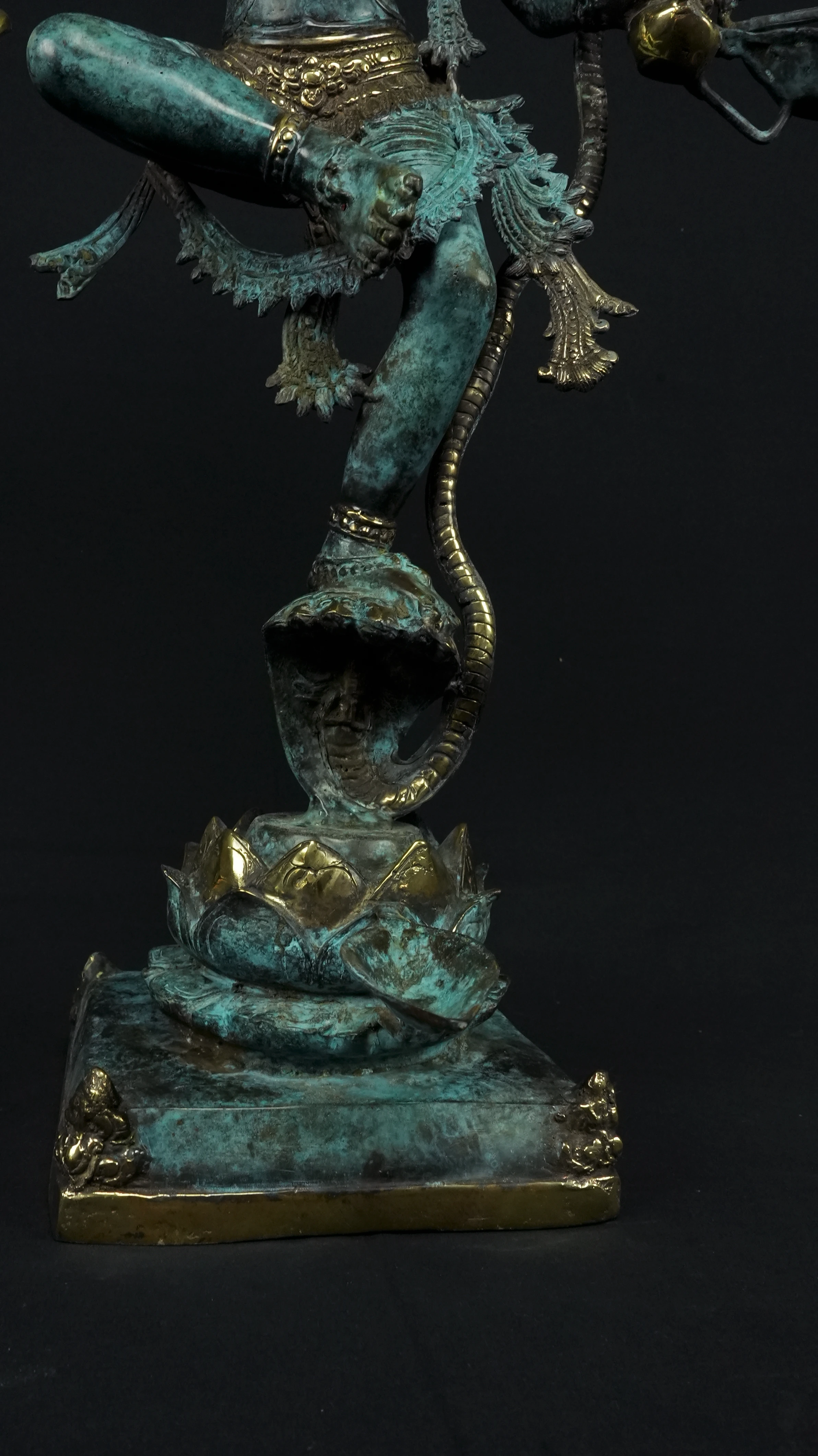 Sous son pied, le cobra sacré Kalinga représente la puissance vitale éveillée et canalisée.
