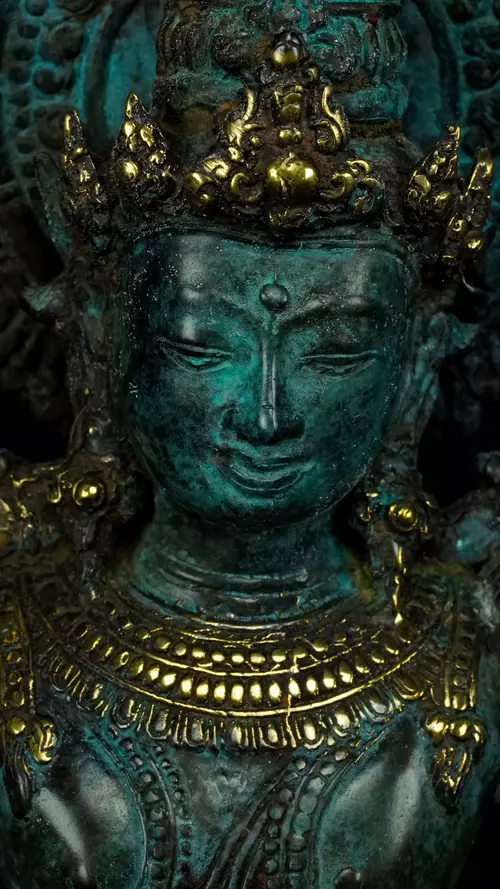Son regard paisible transmet la sérénité de celle qui connaît la vérité du flux éternel, tout circule, tout se transforme.