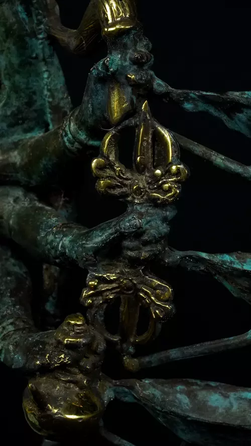 Le disque doré rappelle l’ordre cosmique et le cycle éternel du don, tandis que le trident incarne la maîtrise des trois plans.