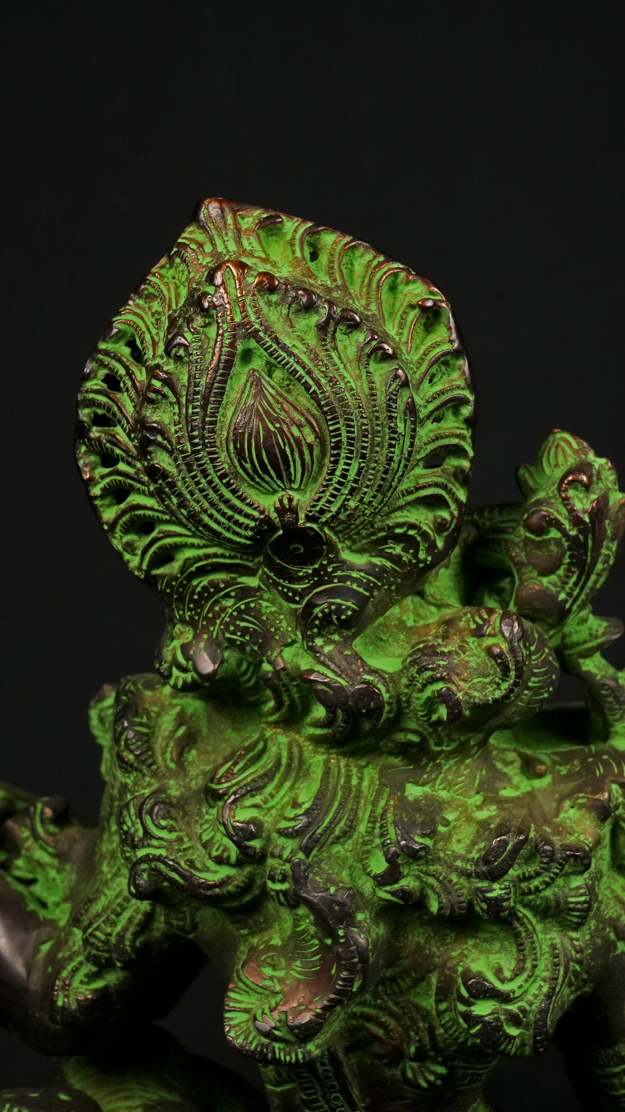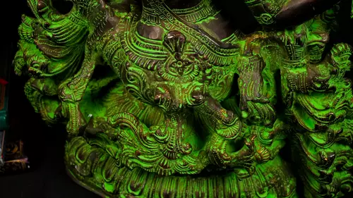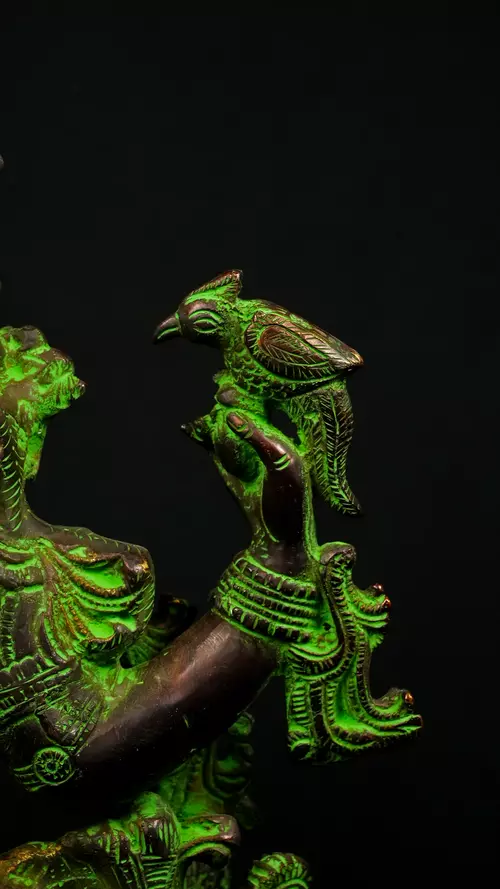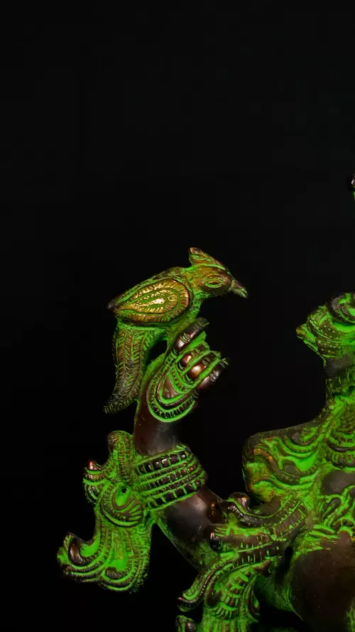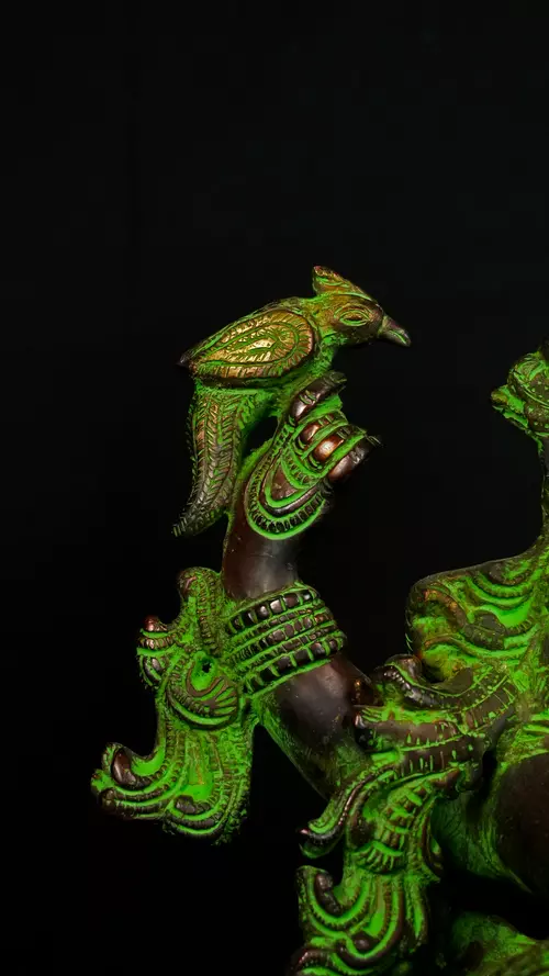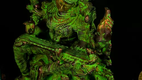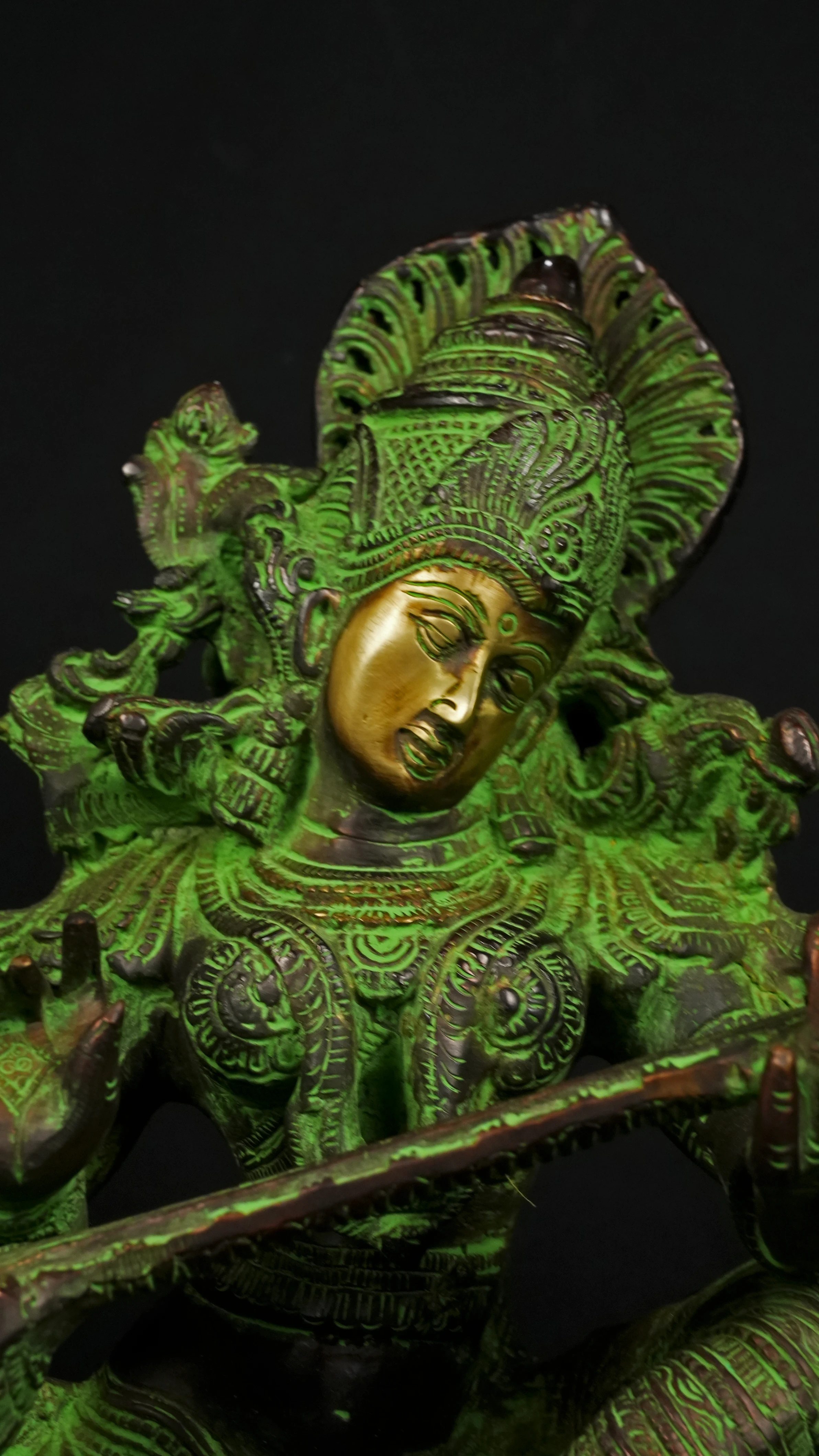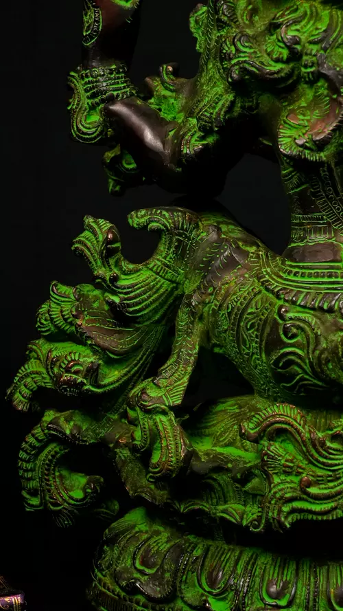 Le style hoysala de cette statue est caractérisé par des ornements détaillés, des motifs délicats et des sculptures riches en symboles. Les vêtements de Saraswati sont vaporeux et flottants, créant une sensation de mouvement subtil, comme si elle était entourée d'une brise légère. Ces vêtements vaporeux évoquent non seulement sa grâce, mais aussi sa nature éthérée et spirituelle. Ils rappellent que la connaissance est fluide et légère, s’écoulant de manière naturelle et inspiré.
