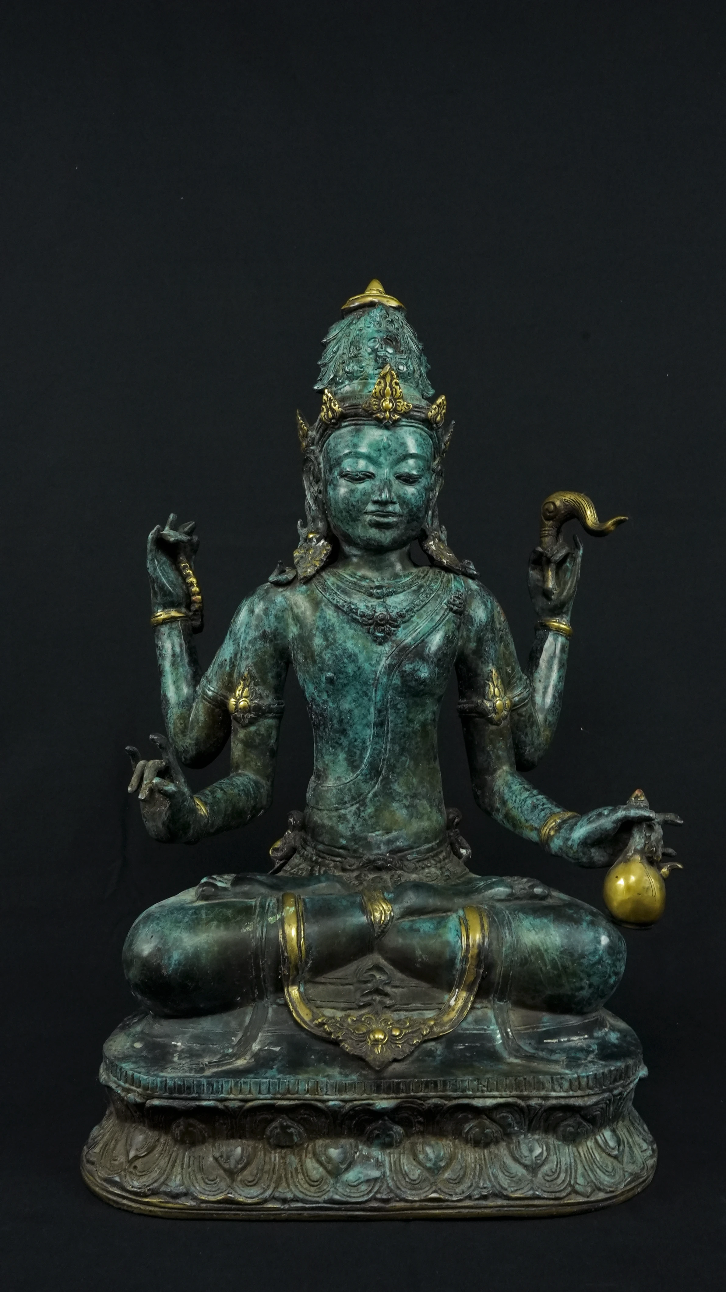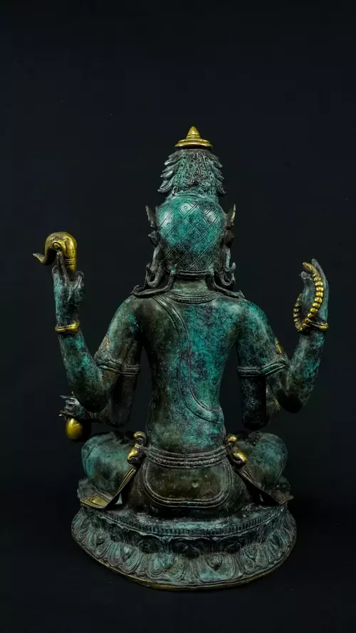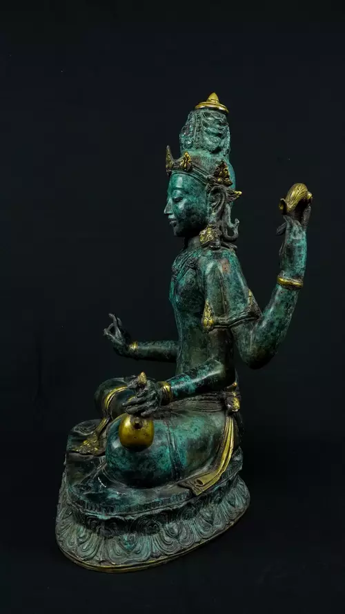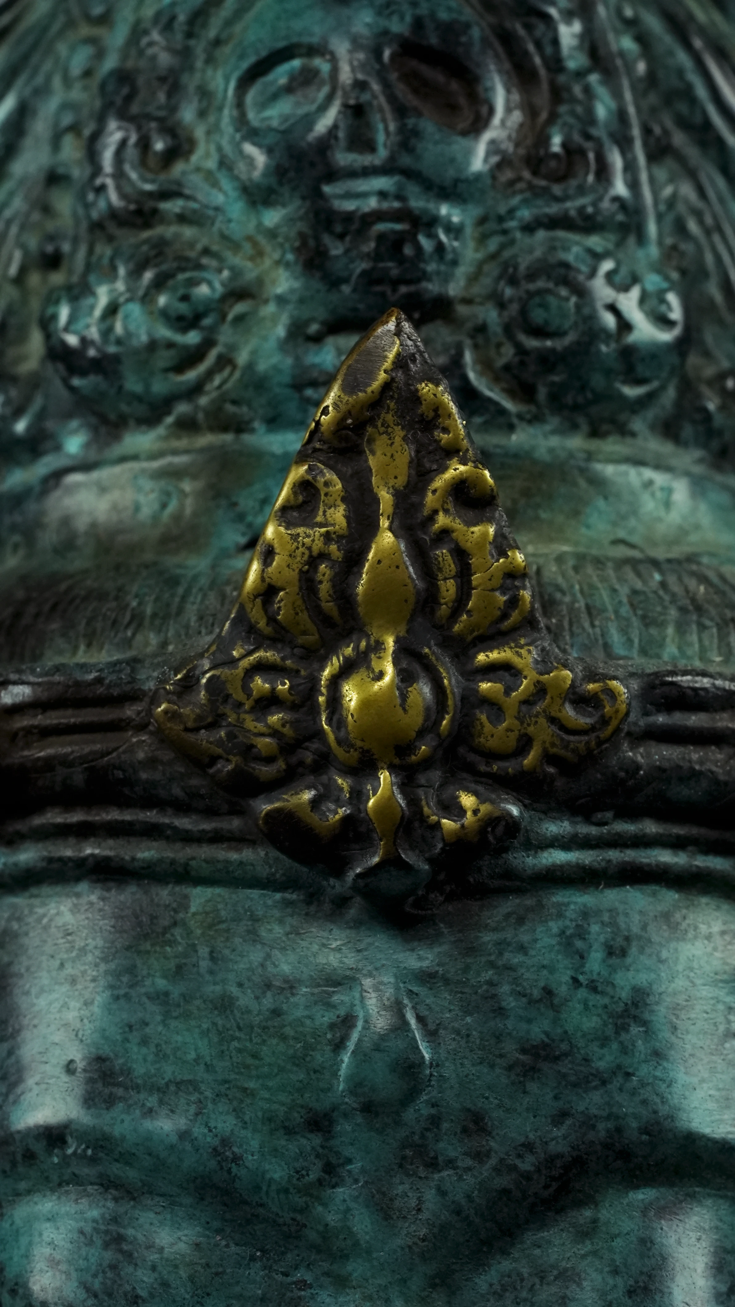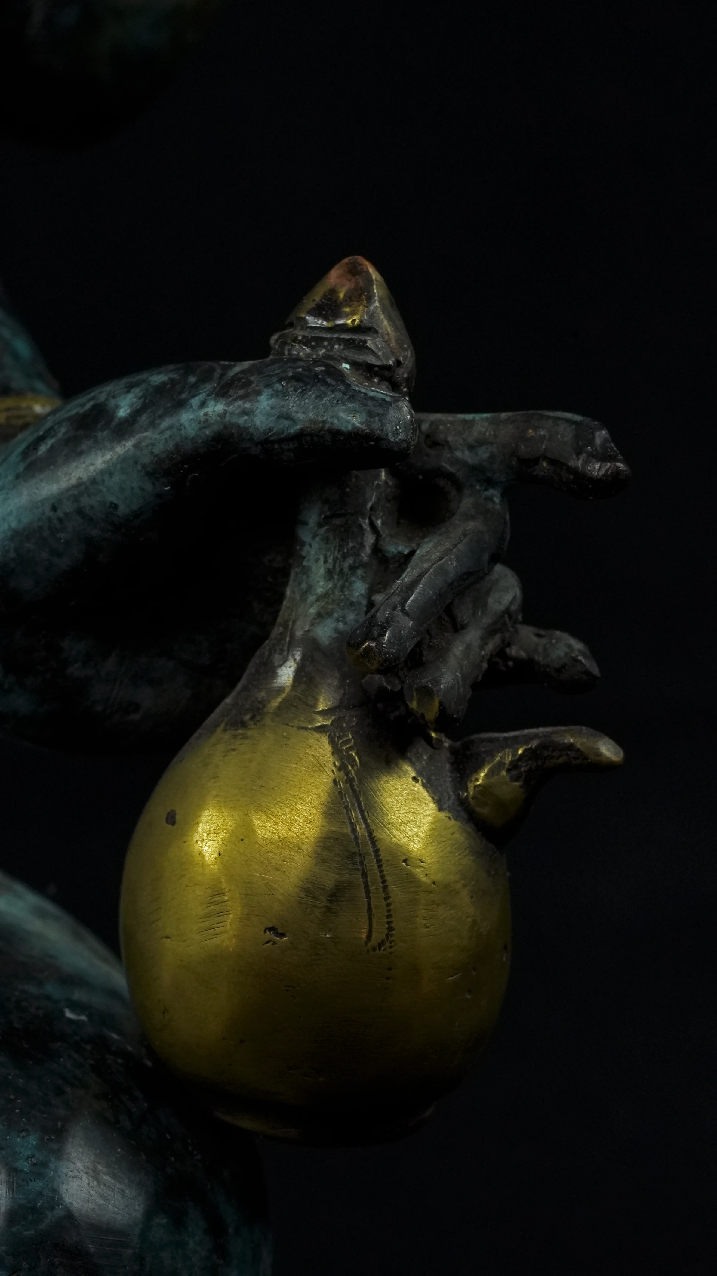 Cette statue de Brahma, aux teintes cuivrées et vertes patinées, incarne la rencontre de la conscience et de la matière. Assis en posture de méditation, il dégage une présence stable et sereine, portant en lui l’intelligence divine à l’origine de toute chose. Chaque élément, son mudra d’enseignement, le vase de création, le mala du temps et le sceptre de sagesse symbolisent un aspect de l’ordre universel et de la transmission sacrée. Les reflets dorés sur sa coiffe et ses ornements rappellent la lumière pure de la connaissance qui éclaire toute création alignée. Le socle en lotus, finement sculpté, évoque la pureté née du chaos, tandis que son regard apaisé reflète l’équilibre parfait entre le verbe, l’intention et la forme.