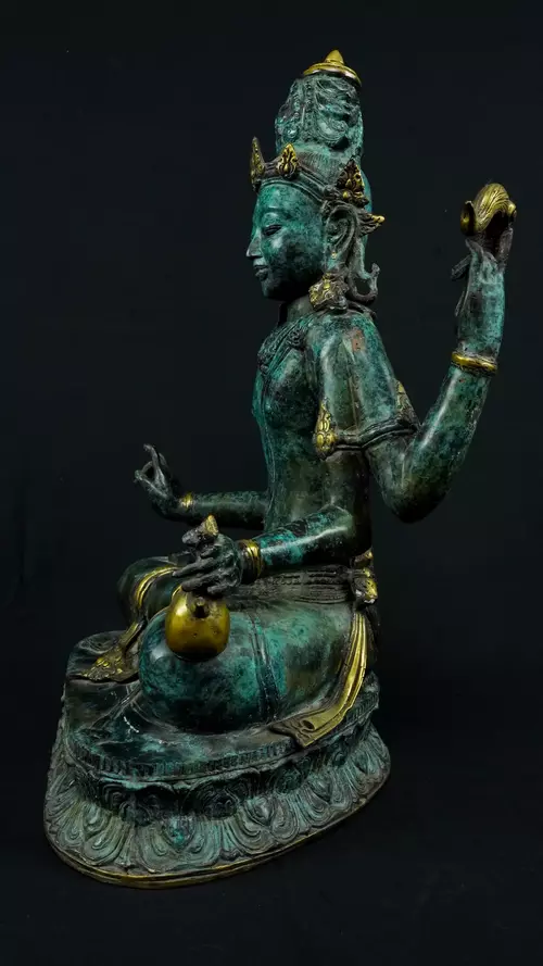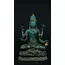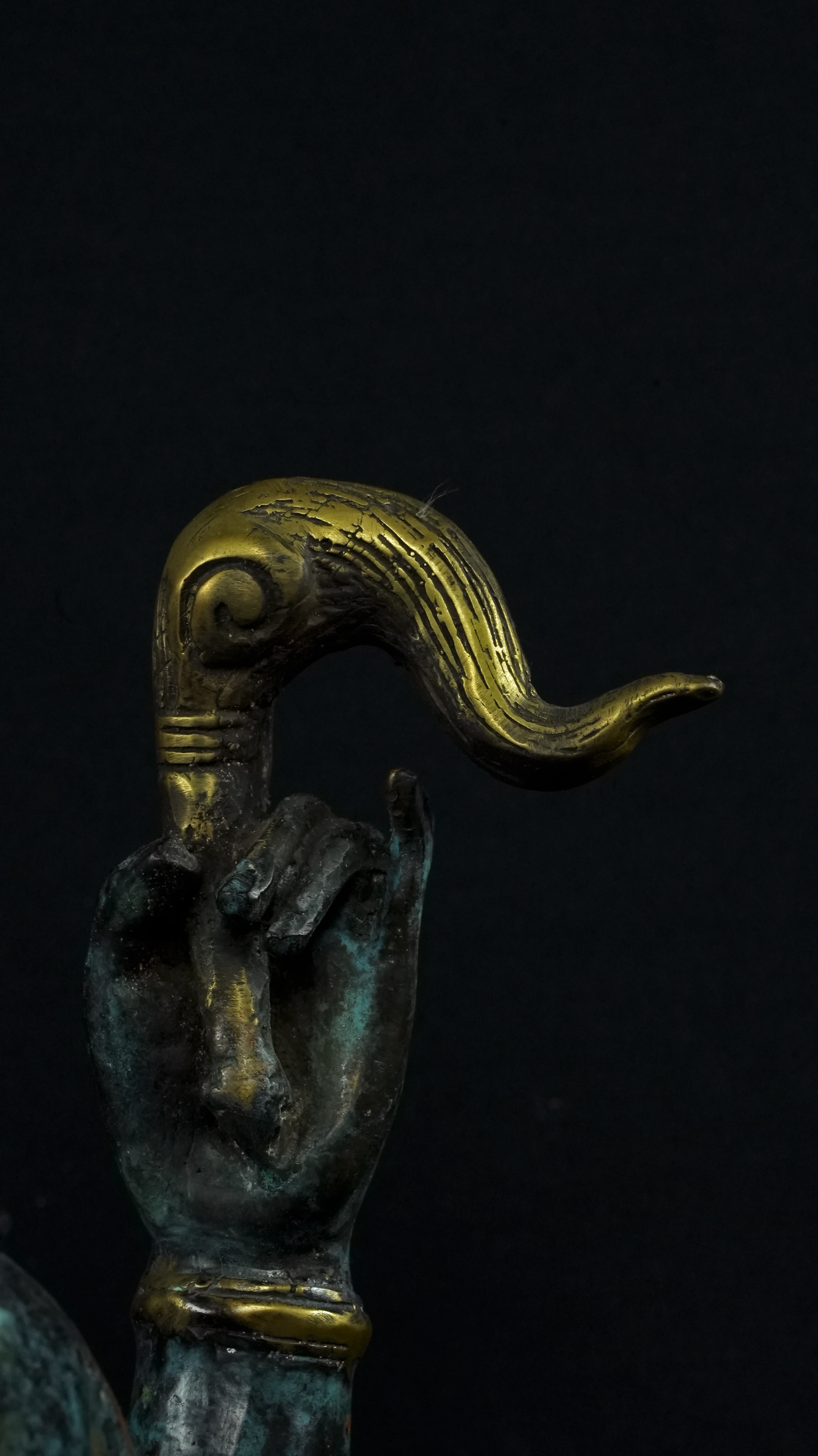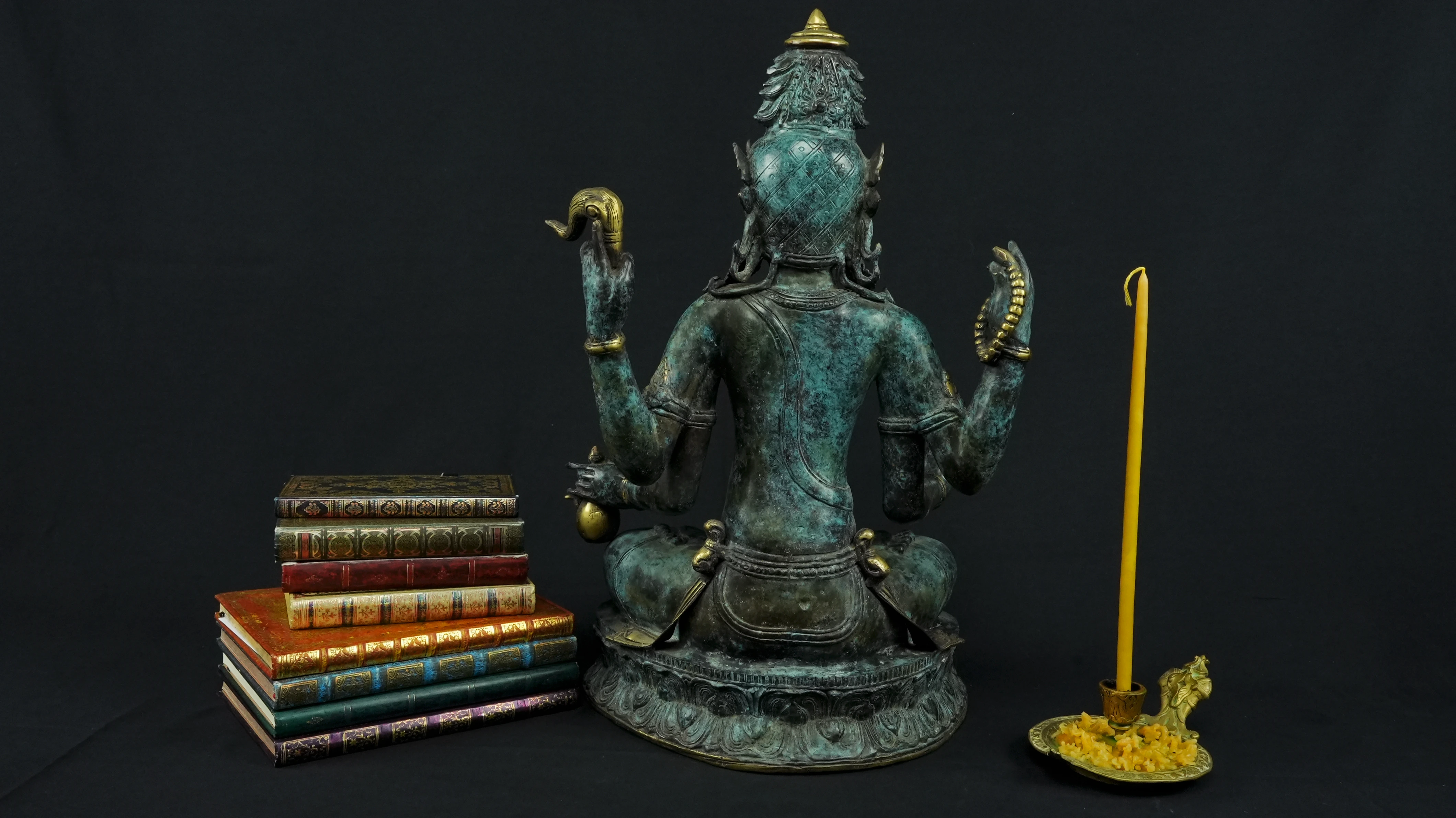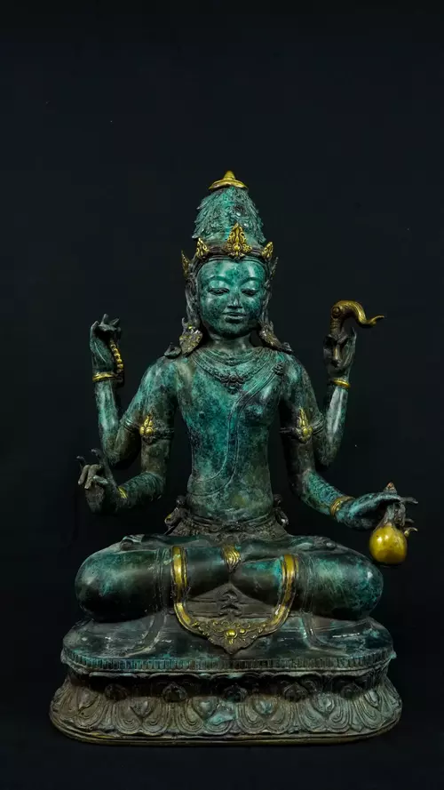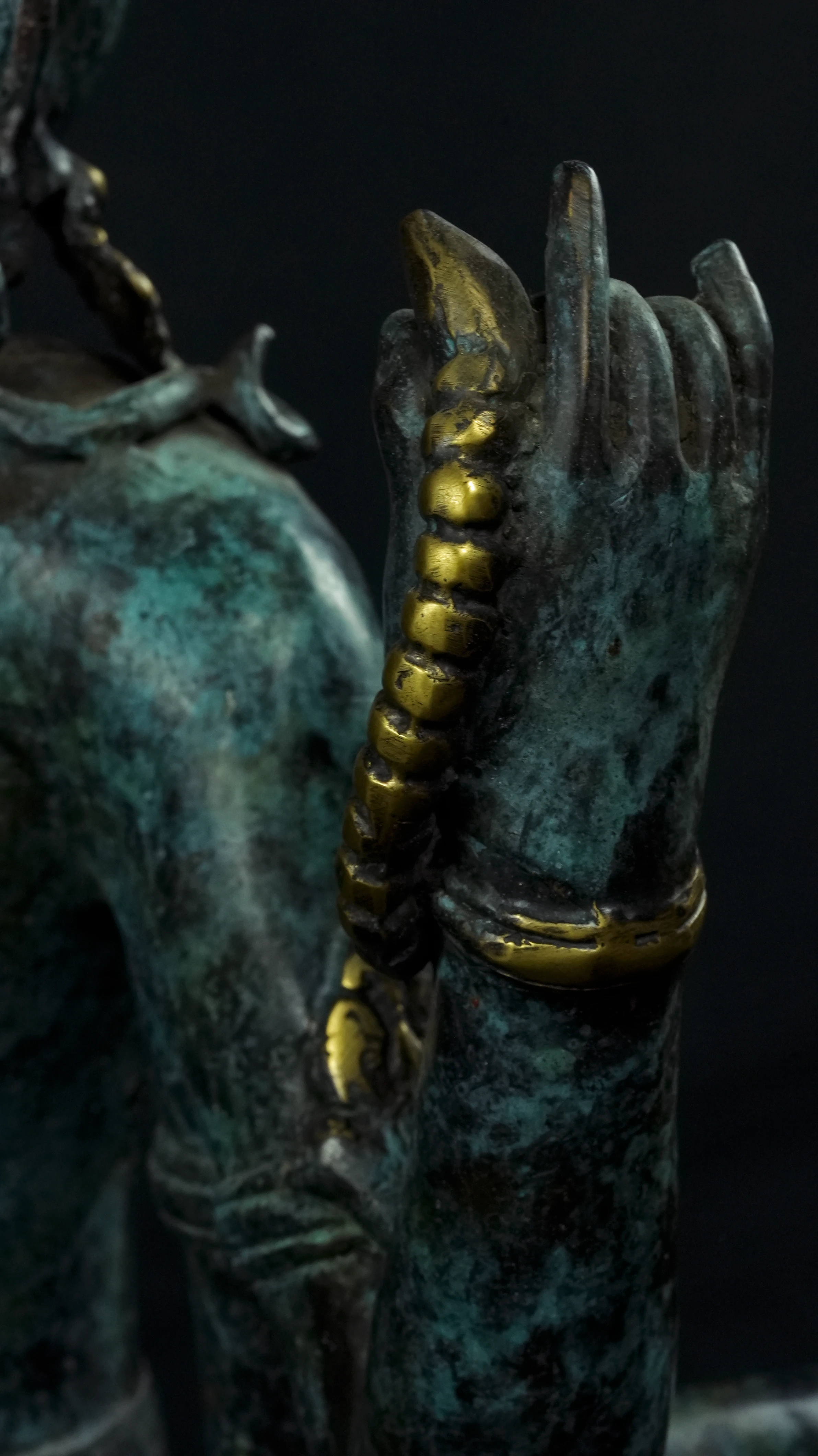 Cette statue de Brahma, aux teintes cuivrées et vertes patinées, incarne la rencontre de la conscience et de la matière. Assis en posture de méditation, il dégage une présence stable et sereine, portant en lui l’intelligence divine à l’origine de toute chose. Chaque élément, son mudra d’enseignement, le vase de création, le mala du temps et le sceptre de sagesse symbolisent un aspect de l’ordre universel et de la transmission sacrée. Les reflets dorés sur sa coiffe et ses ornements rappellent la lumière pure de la connaissance qui éclaire toute création alignée. Le socle en lotus, finement sculpté, évoque la pureté née du chaos, tandis que son regard apaisé reflète l’équilibre parfait entre le verbe, l’intention et la forme.