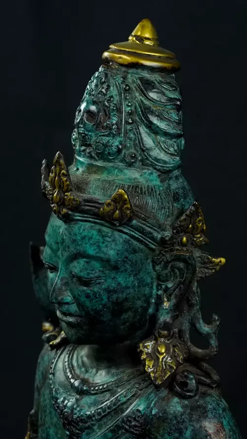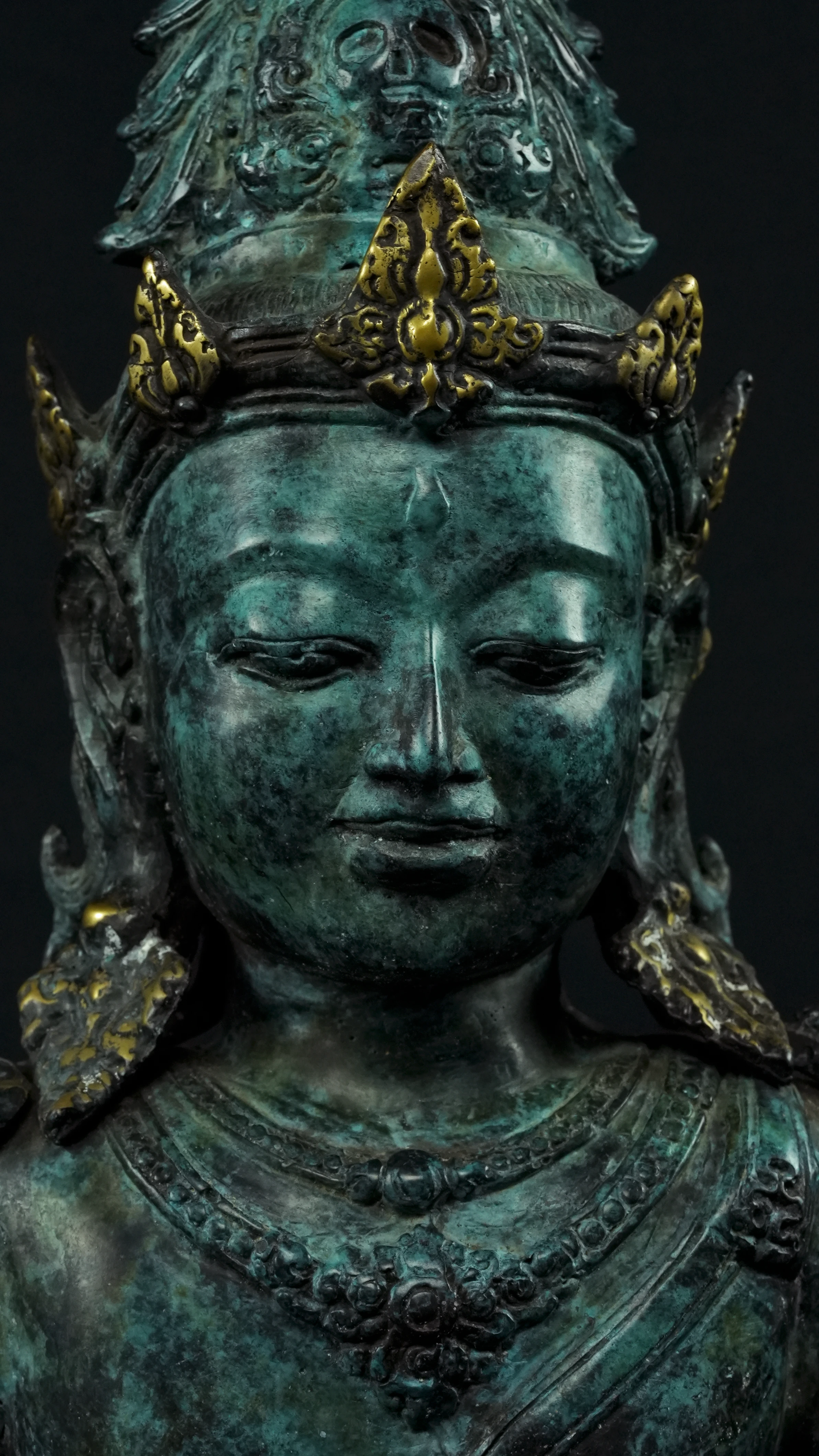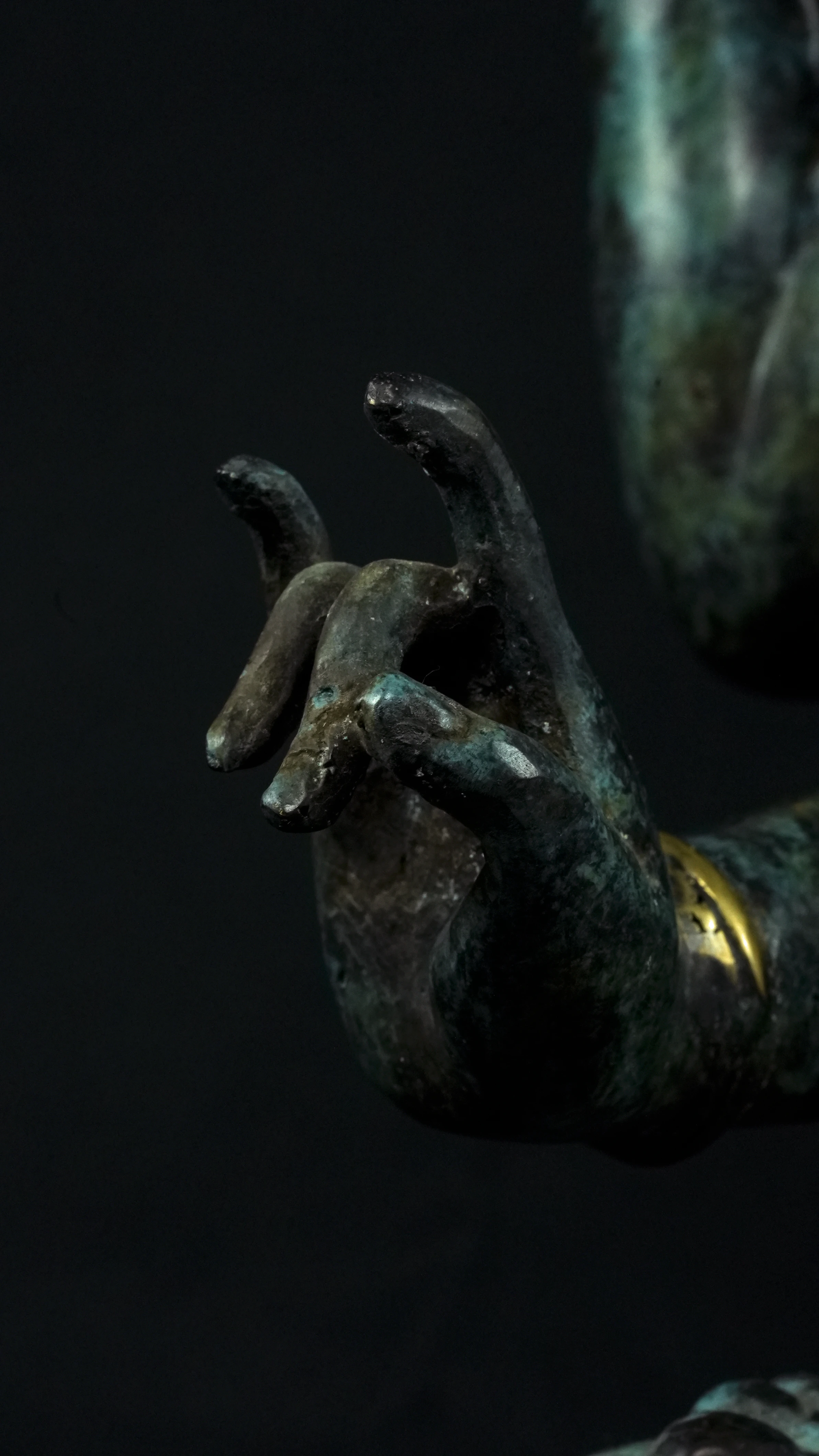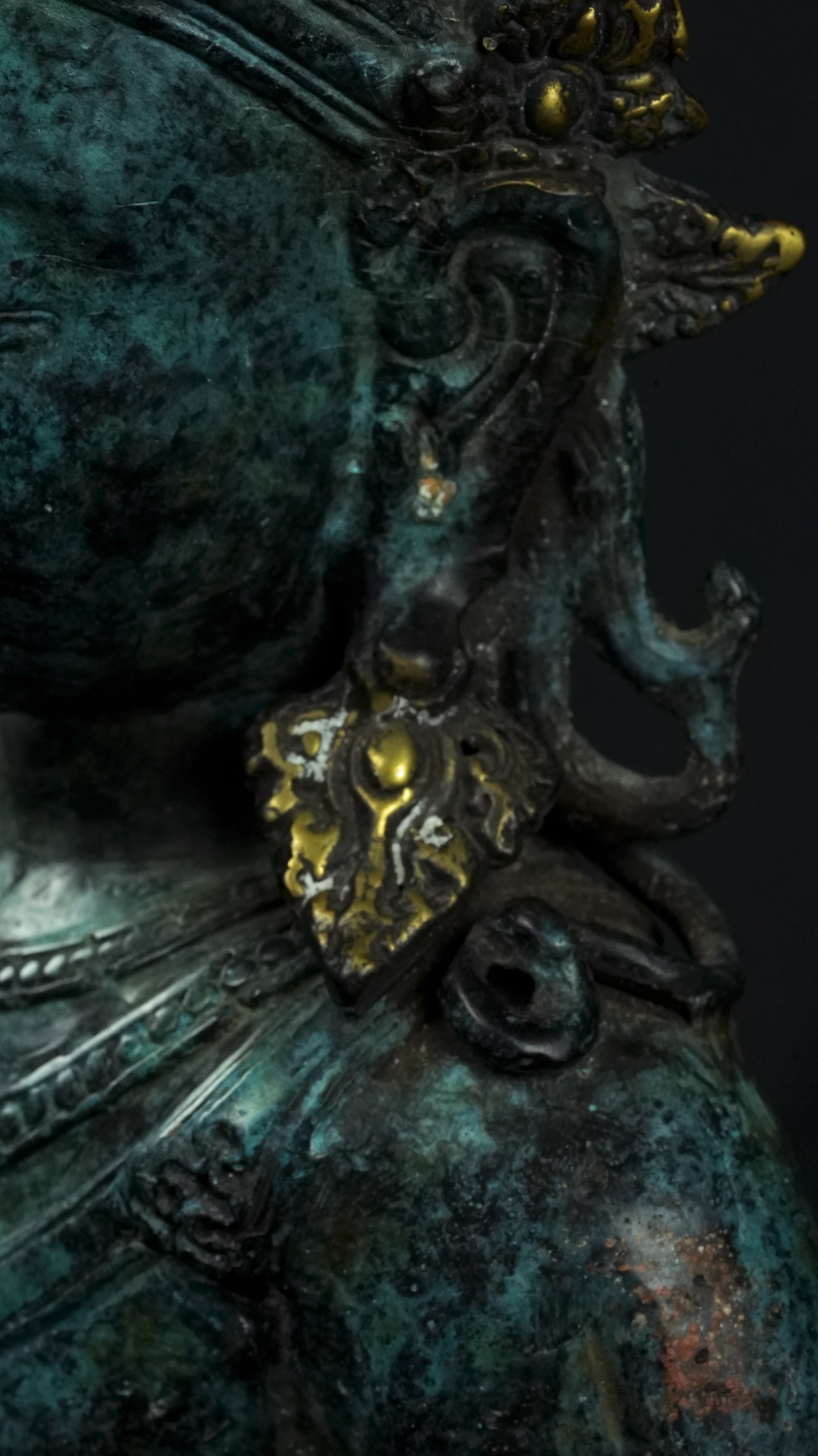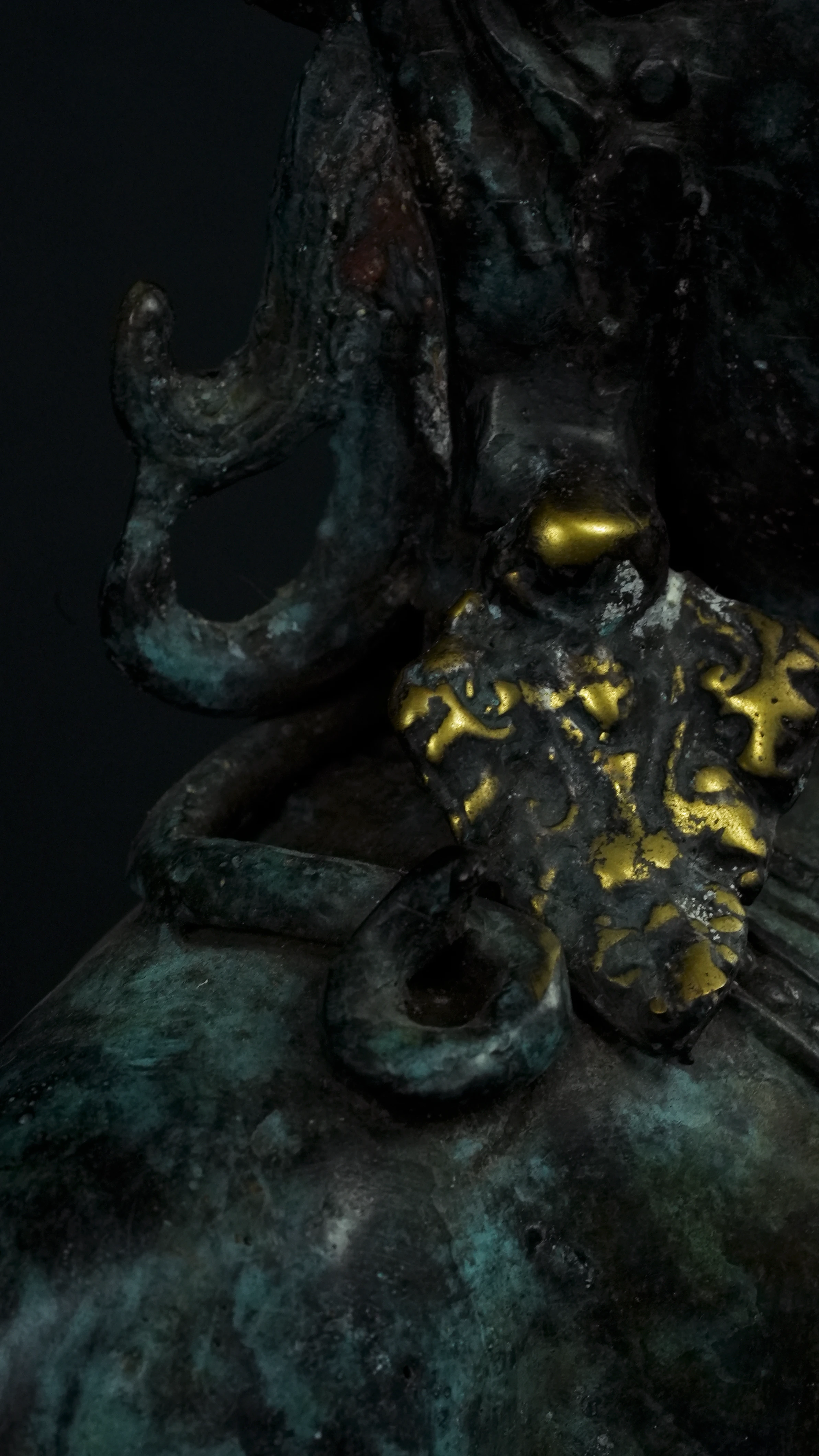 Cette statue de Brahma, aux teintes cuivrées et vertes patinées, incarne la rencontre de la conscience et de la matière. Assis en posture de méditation, il dégage une présence stable et sereine, portant en lui l’intelligence divine à l’origine de toute chose. Chaque élément, son mudra d’enseignement, le vase de création, le mala du temps et le sceptre de sagesse symbolisent un aspect de l’ordre universel et de la transmission sacrée. Les reflets dorés sur sa coiffe et ses ornements rappellent la lumière pure de la connaissance qui éclaire toute création alignée. Le socle en lotus, finement sculpté, évoque la pureté née du chaos, tandis que son regard apaisé reflète l’équilibre parfait entre le verbe, l’intention et la forme.