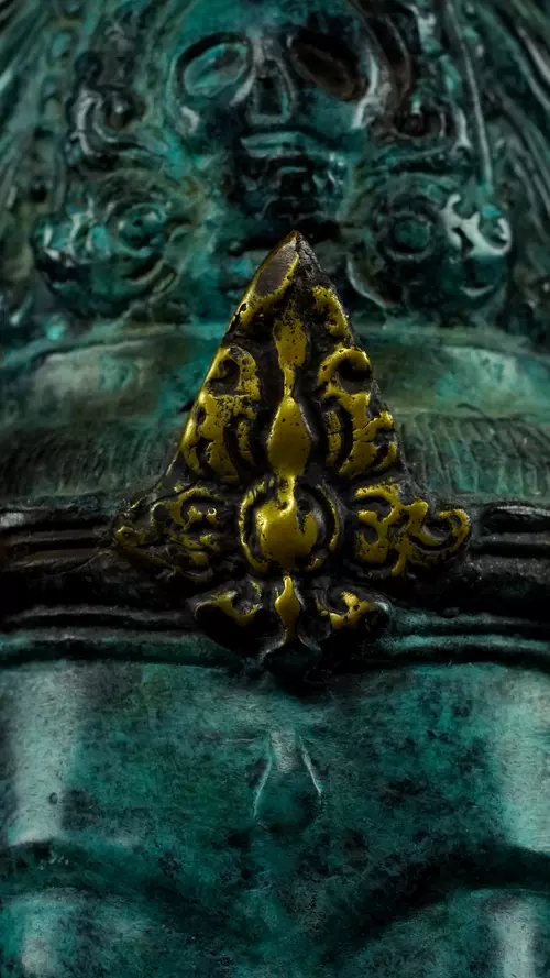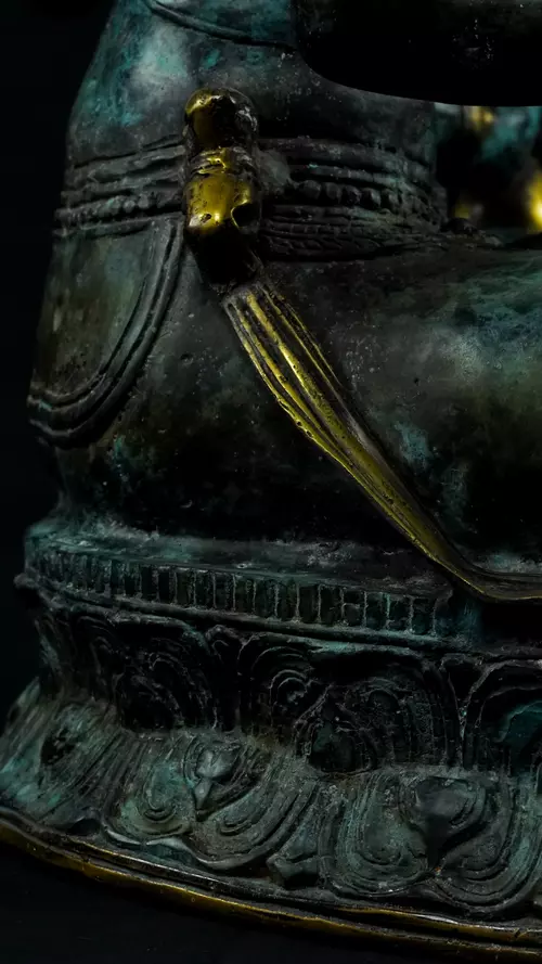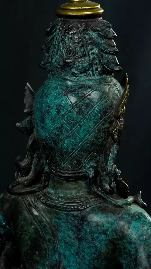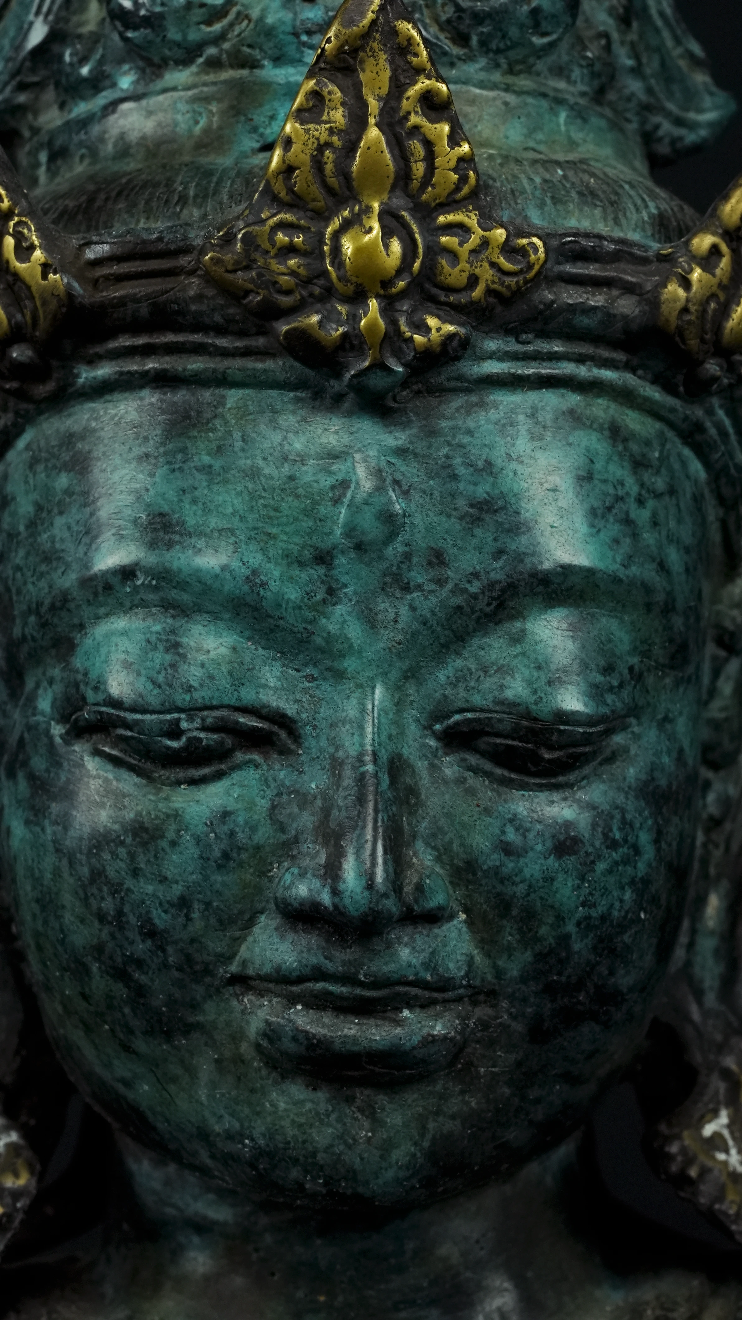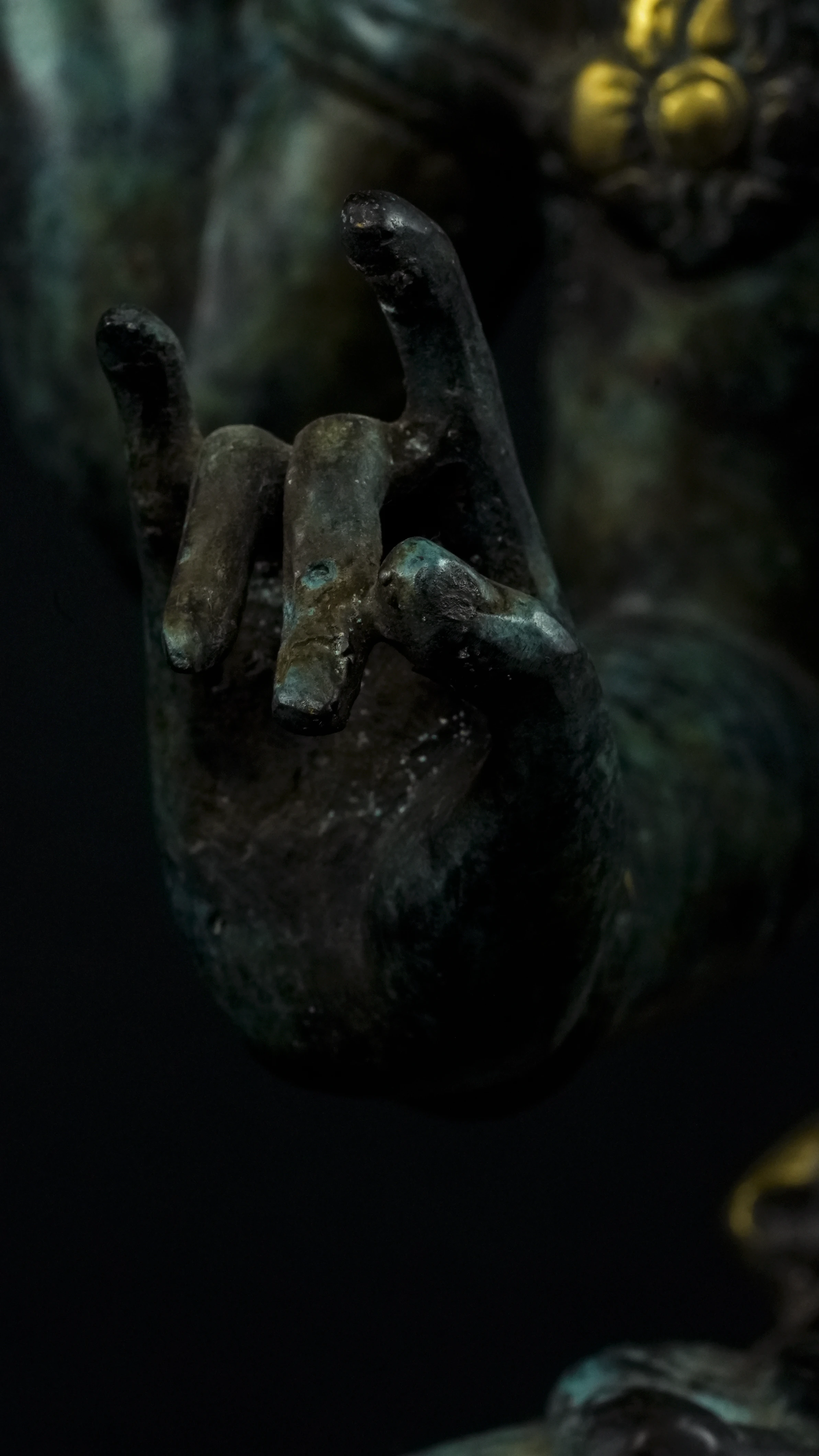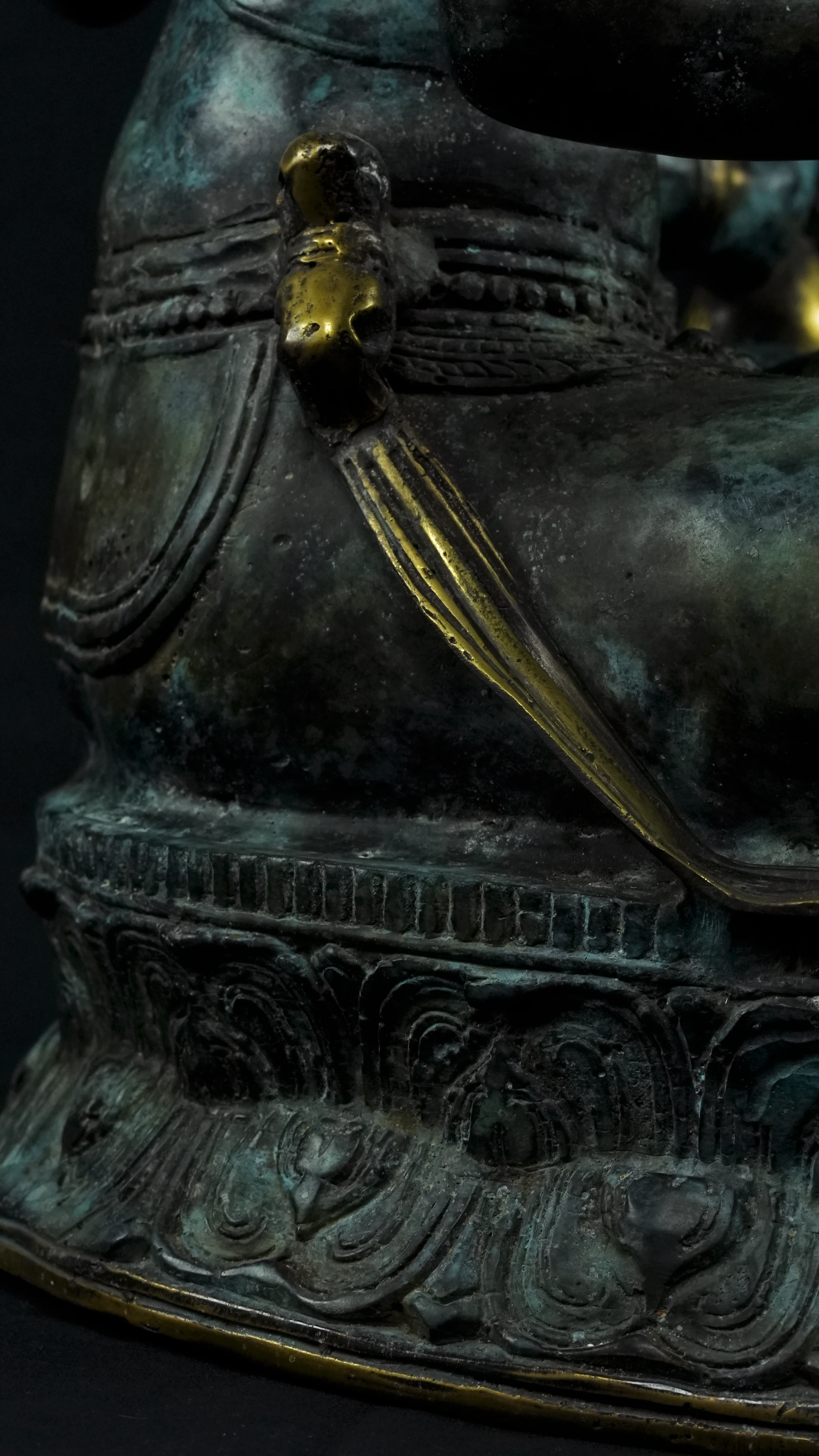 Cette statue de Brahma, aux teintes cuivrées et vertes patinées, incarne la rencontre de la conscience et de la matière. Assis en posture de méditation, il dégage une présence stable et sereine, portant en lui l’intelligence divine à l’origine de toute chose. Chaque élément, son mudra d’enseignement, le vase de création, le mala du temps et le sceptre de sagesse symbolisent un aspect de l’ordre universel et de la transmission sacrée. Les reflets dorés sur sa coiffe et ses ornements rappellent la lumière pure de la connaissance qui éclaire toute création alignée. Le socle en lotus, finement sculpté, évoque la pureté née du chaos, tandis que son regard apaisé reflète l’équilibre parfait entre le verbe, l’intention et la forme.