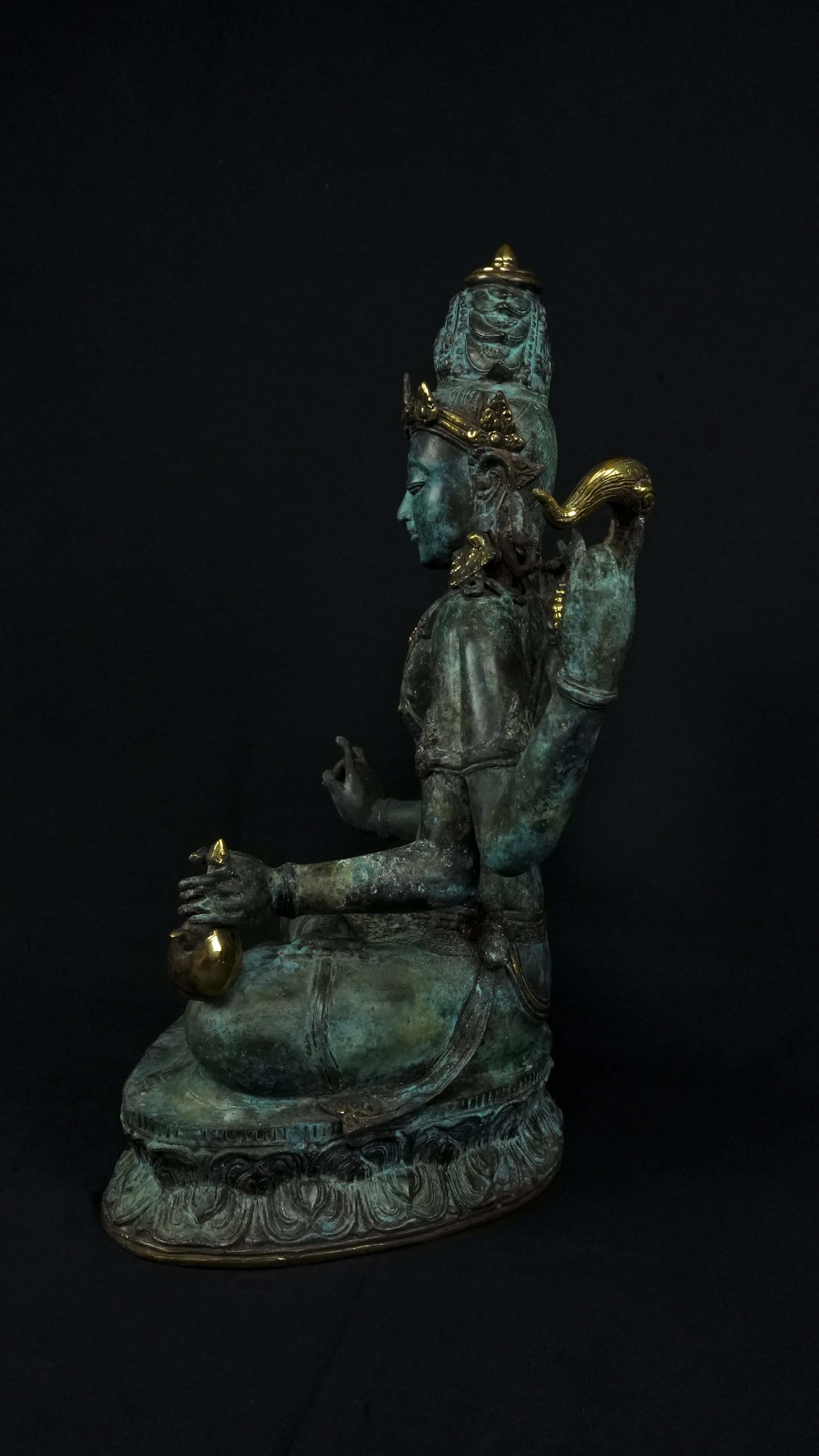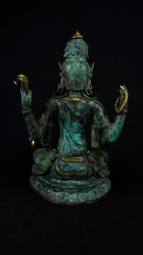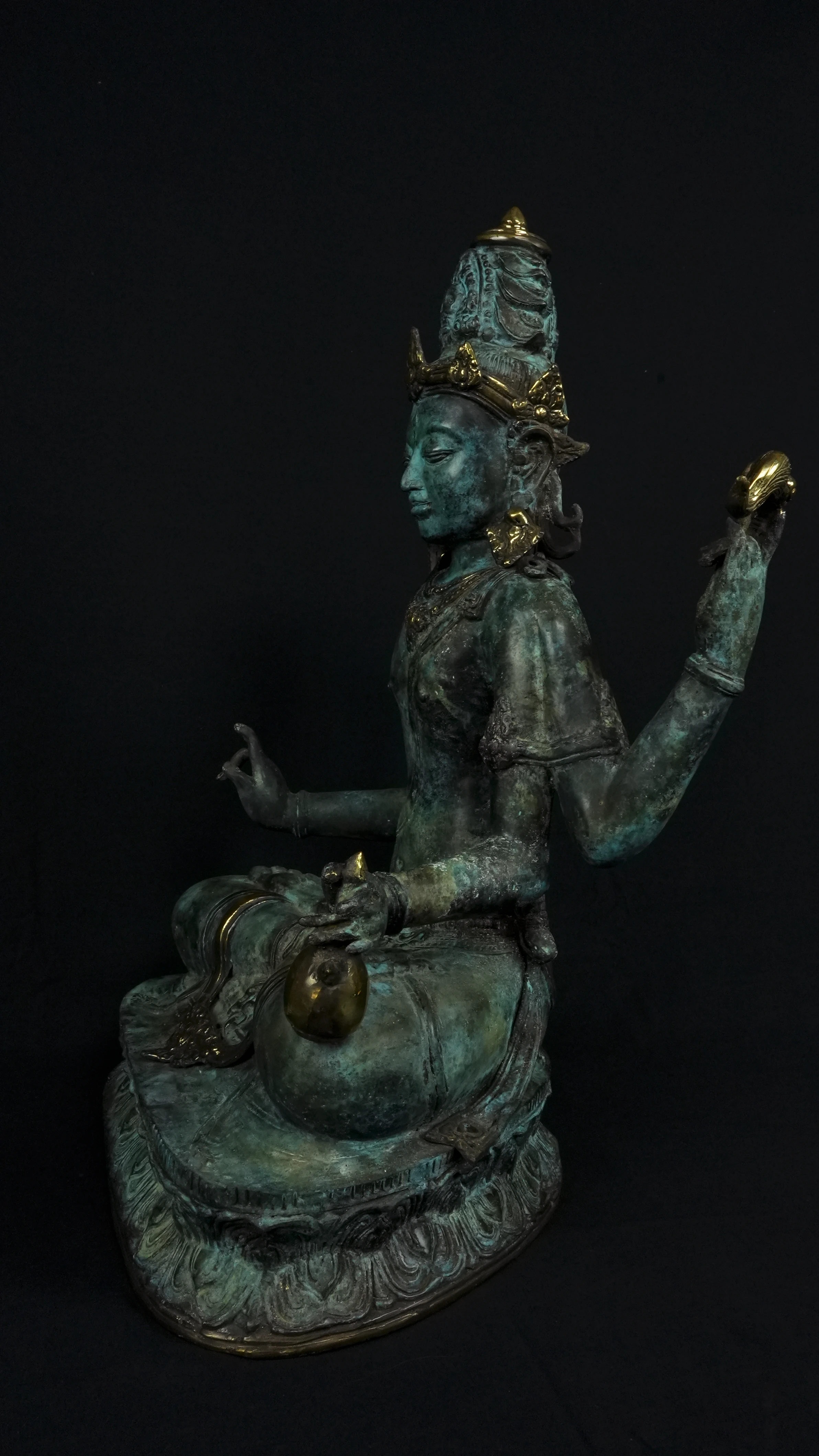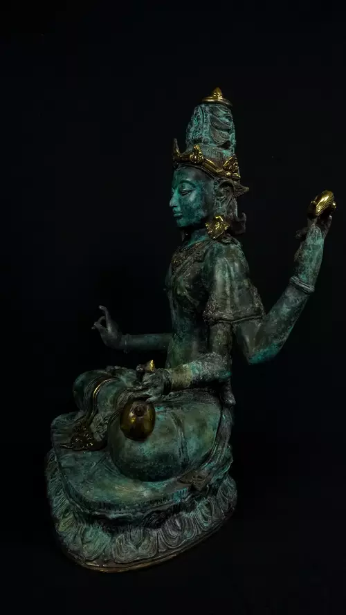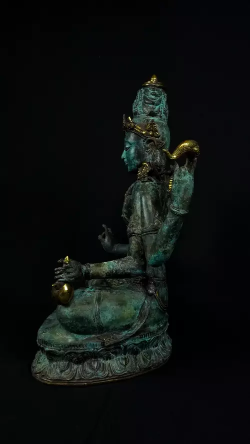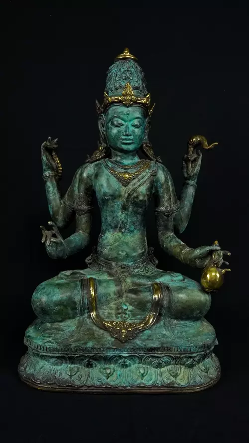 Cette statue de Brahma, aux teintes cuivrées et vertes patinées, incarne la rencontre de la conscience et de la matière. Assis en posture de méditation, il dégage une présence stable et sereine, portant en lui l’intelligence divine à l’origine de toute chose. Chaque élément, son mudra d’enseignement, le vase de création, le mala du temps et le sceptre de sagesse symbolisent un aspect de l’ordre universel et de la transmission sacrée. Les reflets dorés sur sa coiffe et ses ornements rappellent la lumière pure de la connaissance qui éclaire toute création alignée. Le socle en lotus, finement sculpté, évoque la pureté née du chaos, tandis que son regard apaisé reflète l’équilibre parfait entre le verbe, l’intention et la forme.