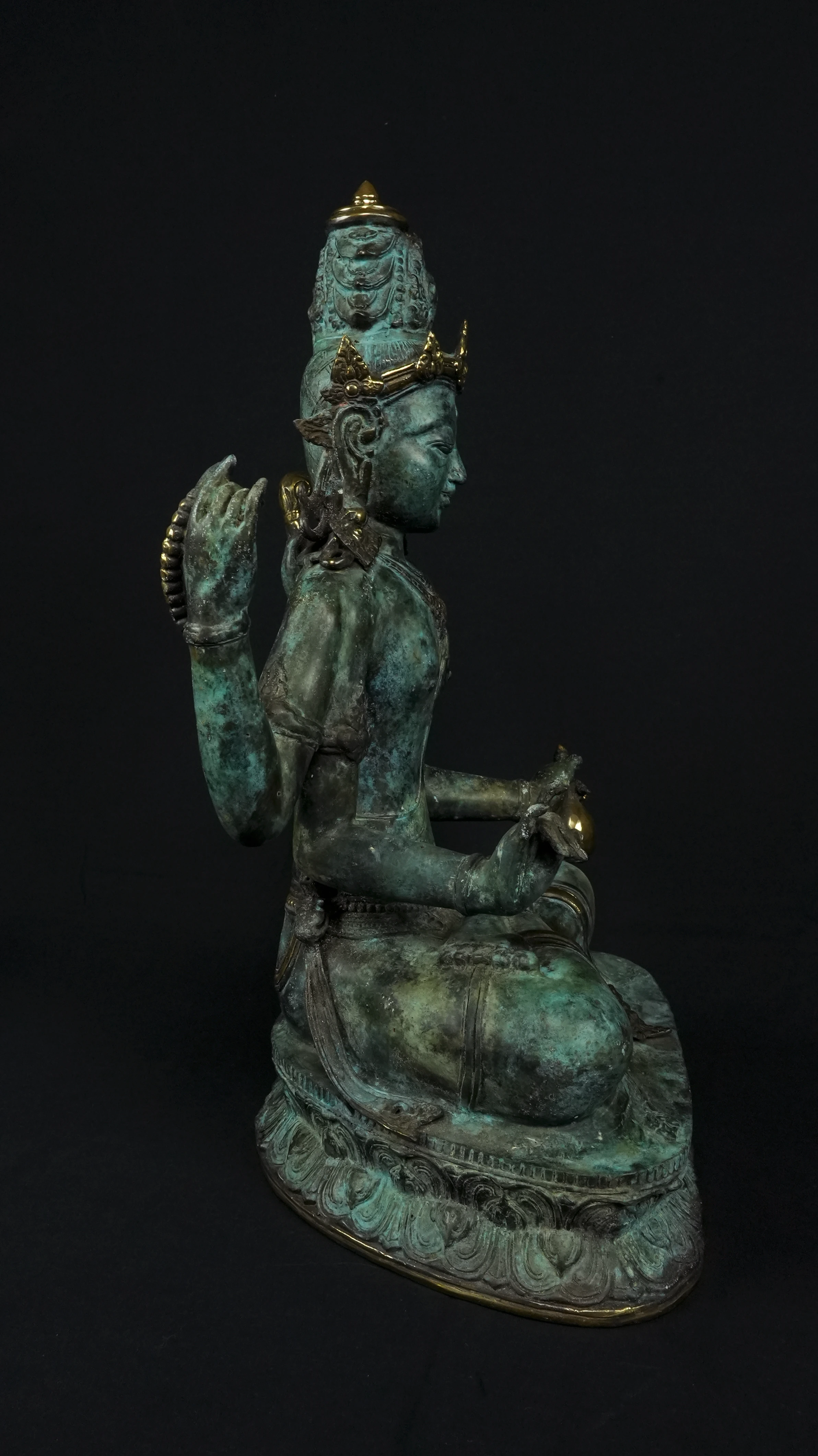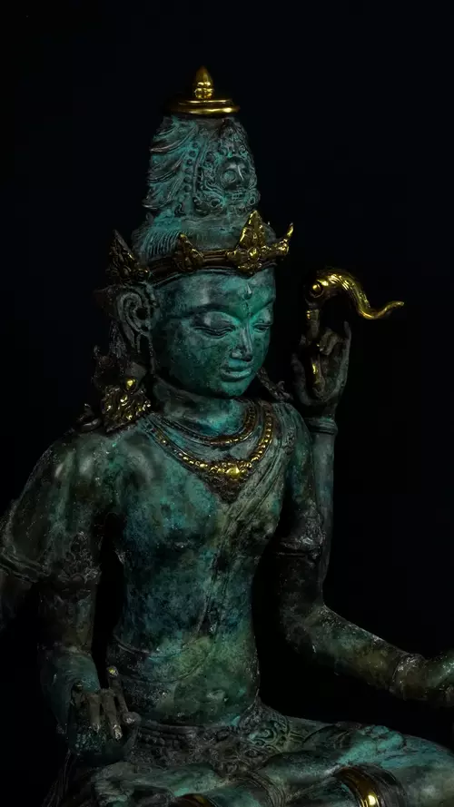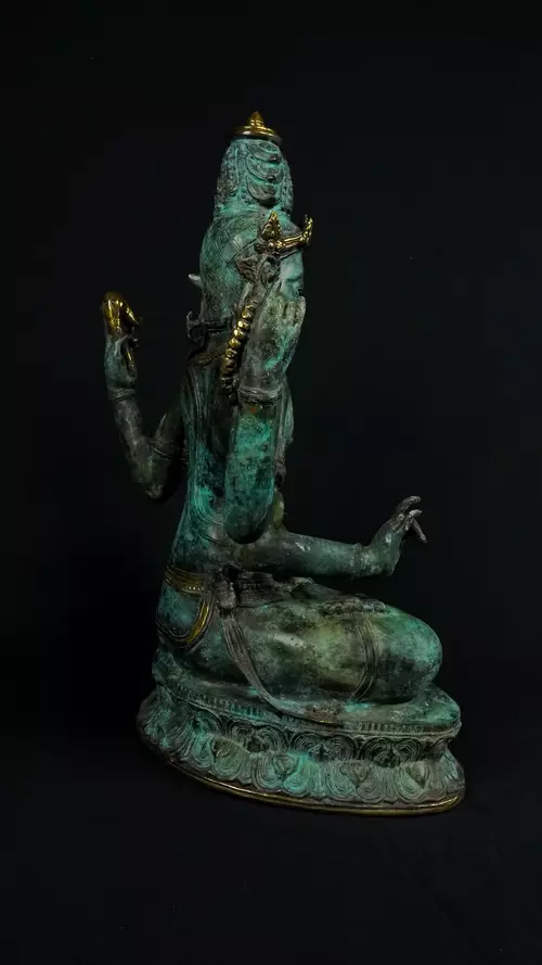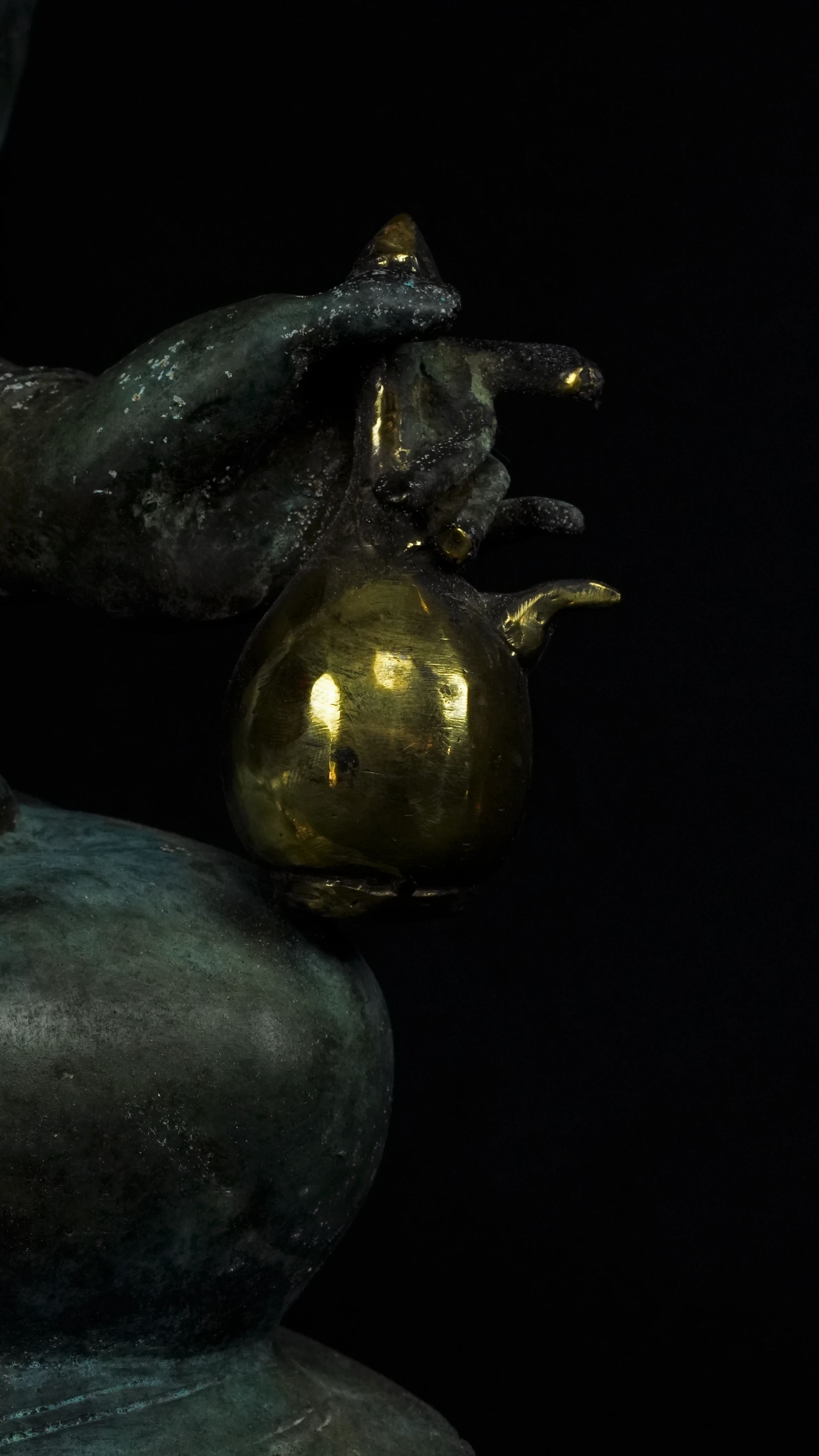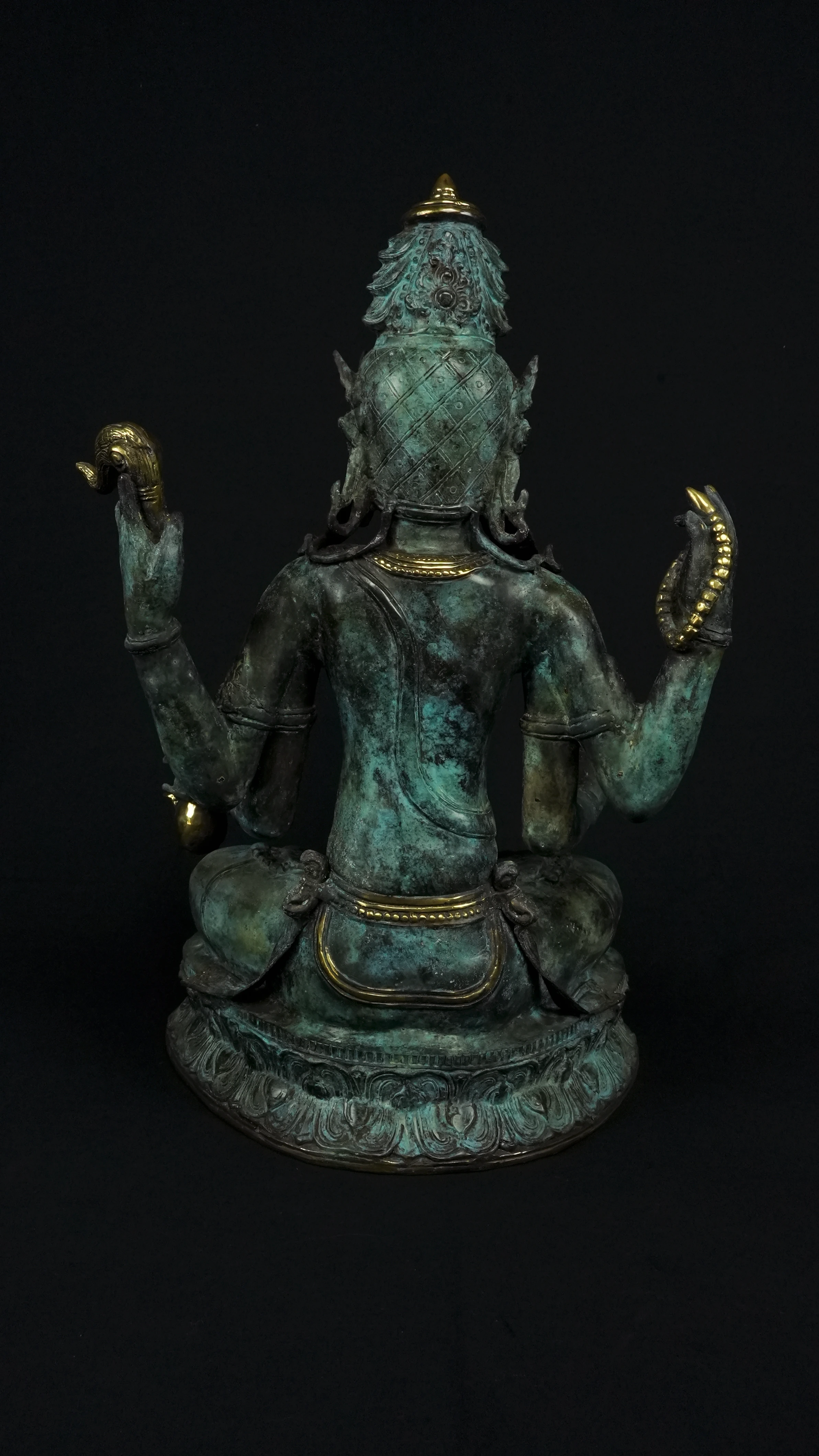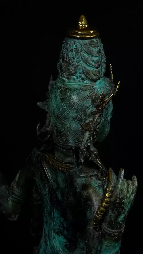 Cette statue de Brahma, aux teintes cuivrées et vertes patinées, incarne la rencontre de la conscience et de la matière. Assis en posture de méditation, il dégage une présence stable et sereine, portant en lui l’intelligence divine à l’origine de toute chose. Chaque élément, son mudra d’enseignement, le vase de création, le mala du temps et le sceptre de sagesse symbolisent un aspect de l’ordre universel et de la transmission sacrée. Les reflets dorés sur sa coiffe et ses ornements rappellent la lumière pure de la connaissance qui éclaire toute création alignée. Le socle en lotus, finement sculpté, évoque la pureté née du chaos, tandis que son regard apaisé reflète l’équilibre parfait entre le verbe, l’intention et la forme.