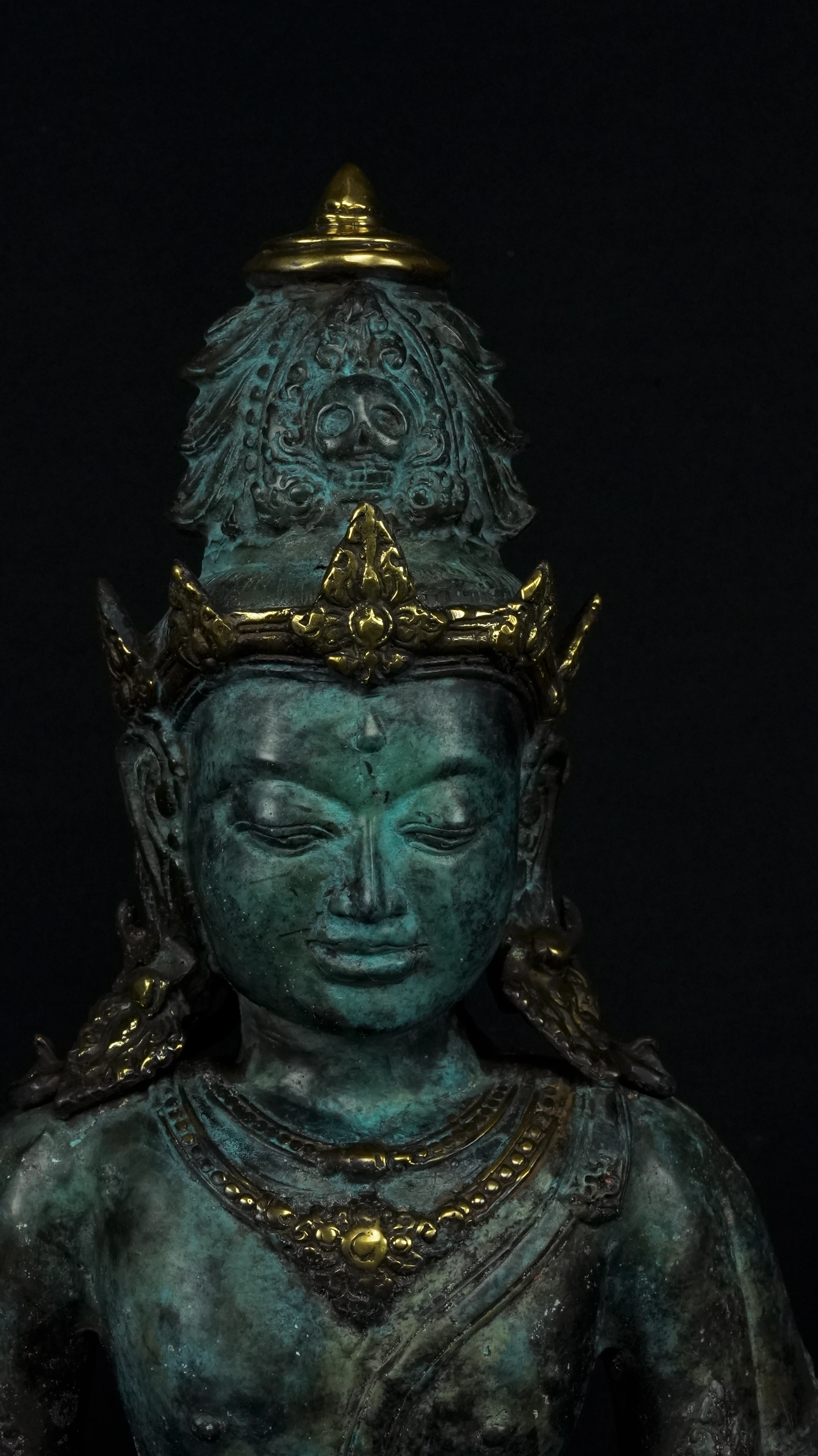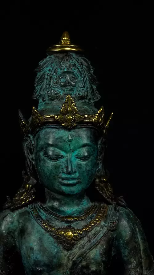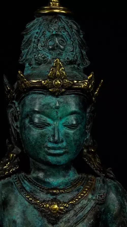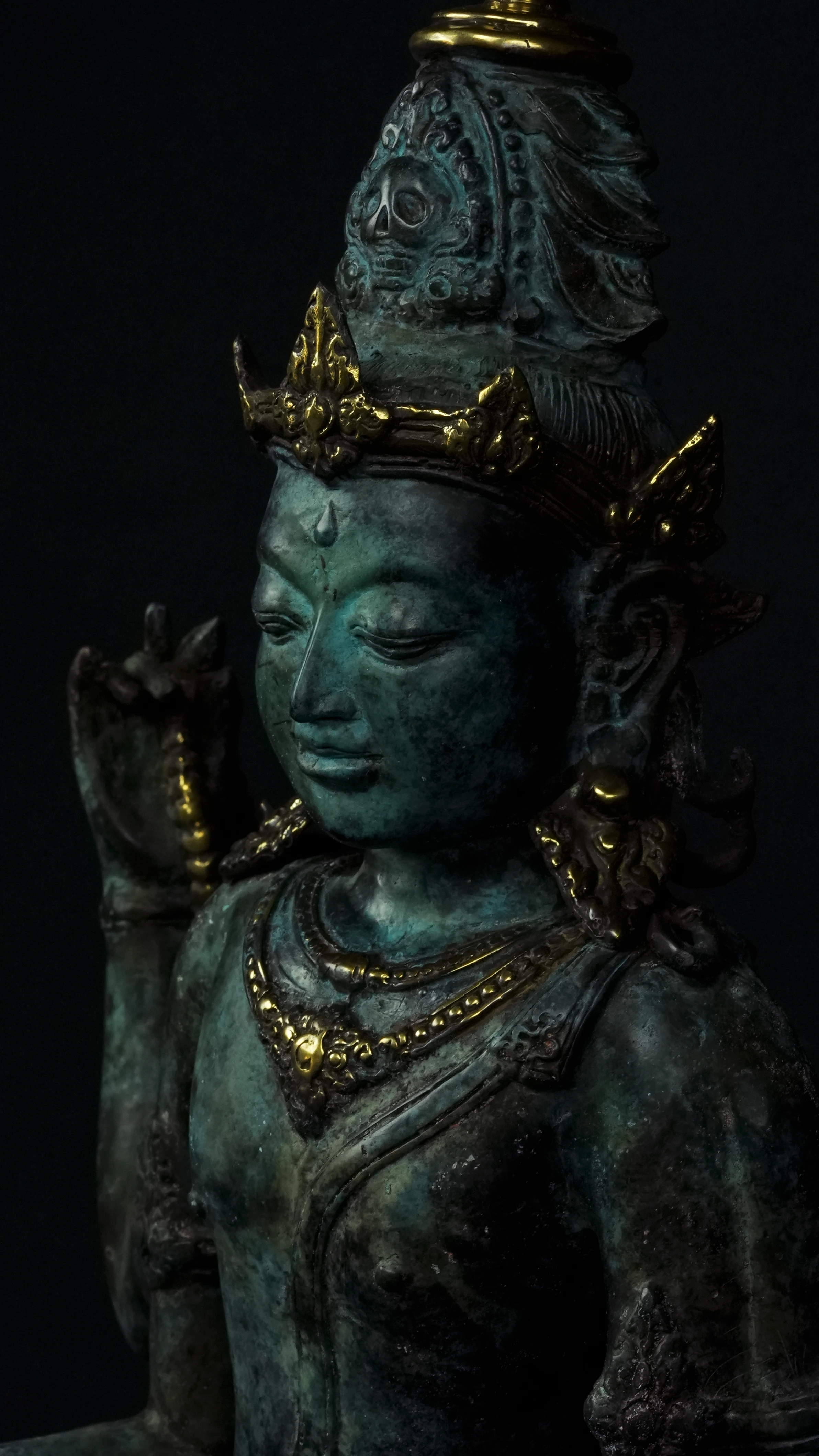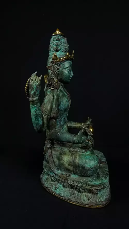 Cette statue de Brahma, aux teintes cuivrées et vertes patinées, incarne la rencontre de la conscience et de la matière. Assis en posture de méditation, il dégage une présence stable et sereine, portant en lui l’intelligence divine à l’origine de toute chose. Chaque élément, son mudra d’enseignement, le vase de création, le mala du temps et le sceptre de sagesse symbolisent un aspect de l’ordre universel et de la transmission sacrée. Les reflets dorés sur sa coiffe et ses ornements rappellent la lumière pure de la connaissance qui éclaire toute création alignée. Le socle en lotus, finement sculpté, évoque la pureté née du chaos, tandis que son regard apaisé reflète l’équilibre parfait entre le verbe, l’intention et la forme.