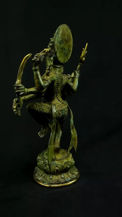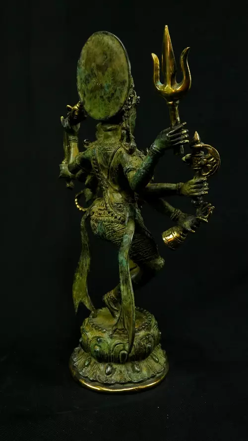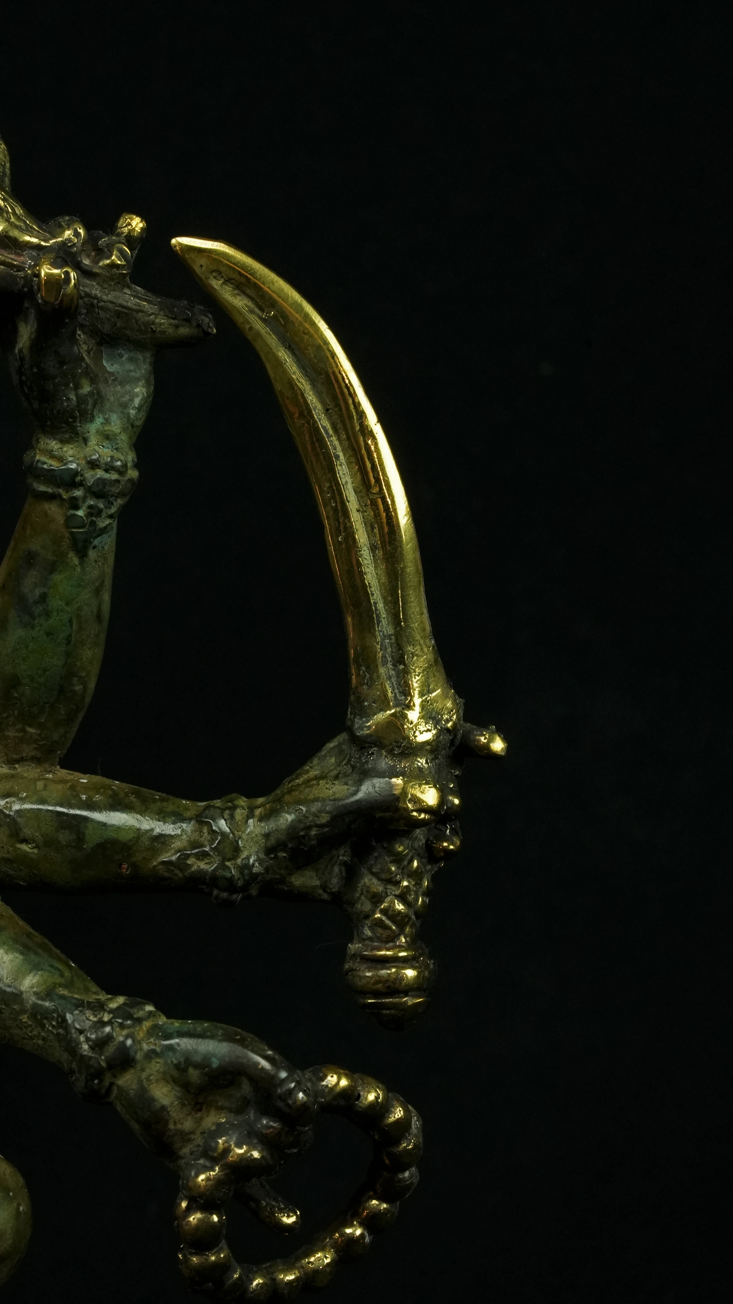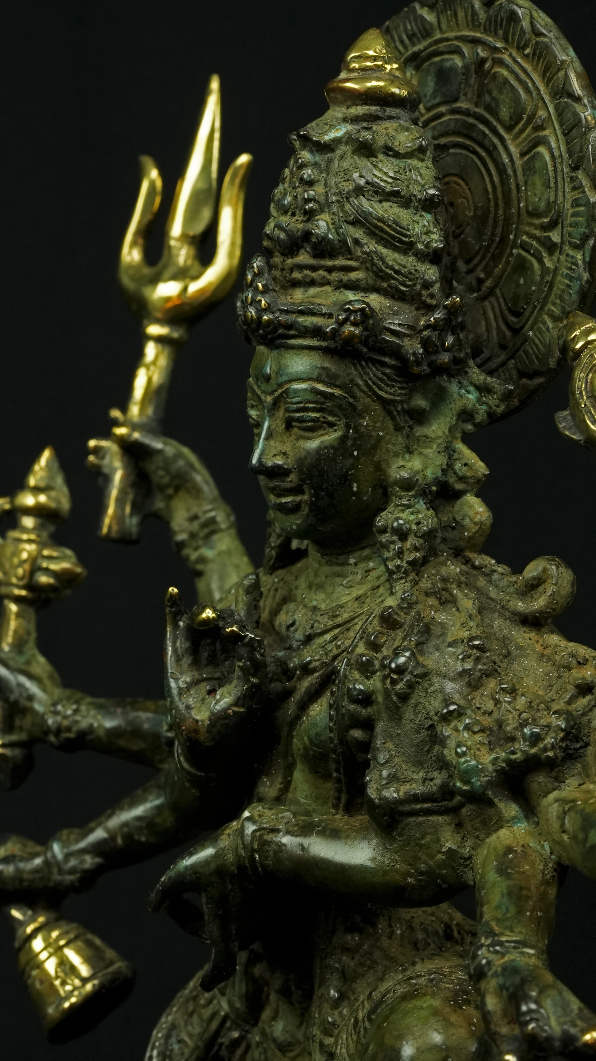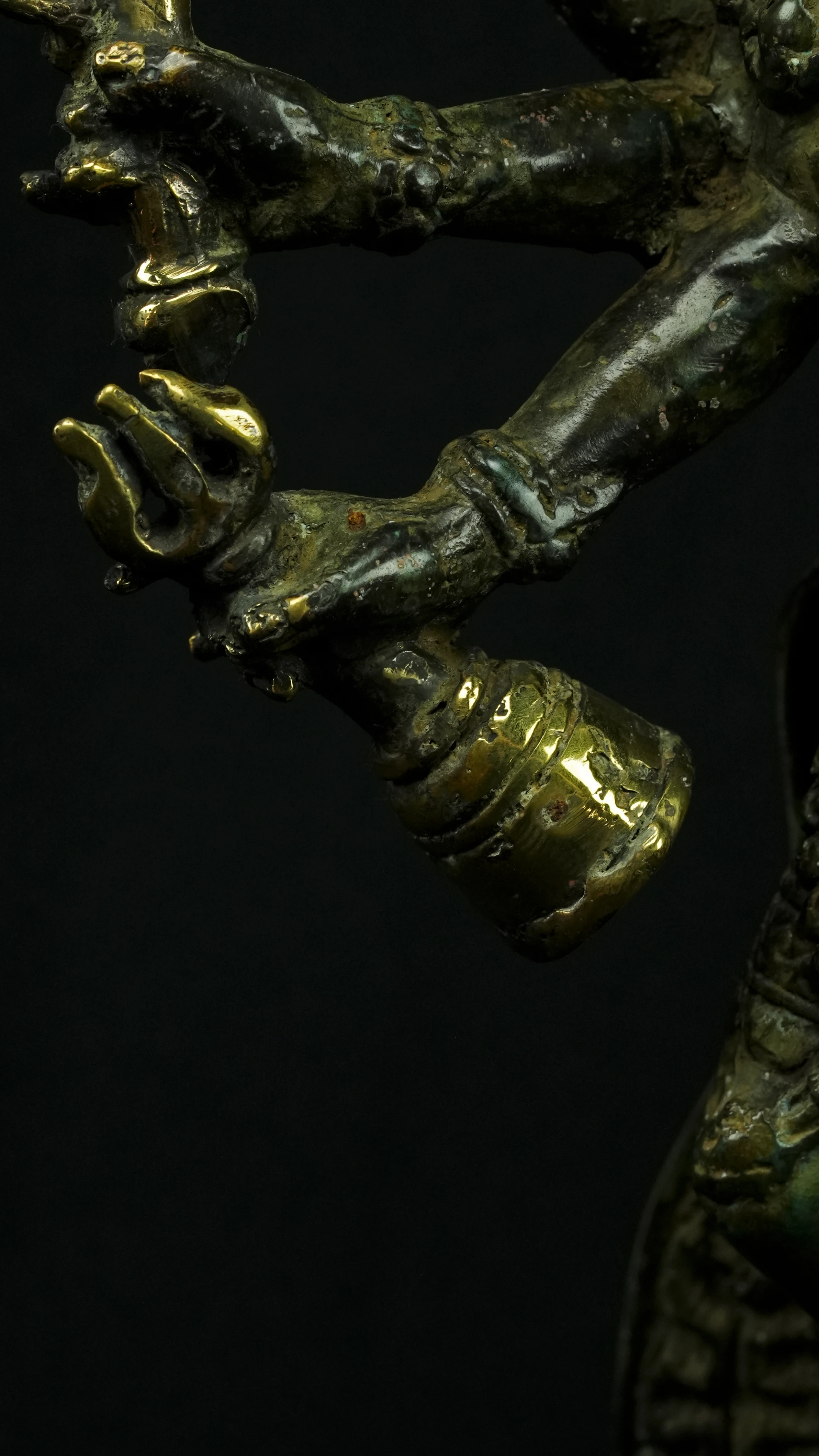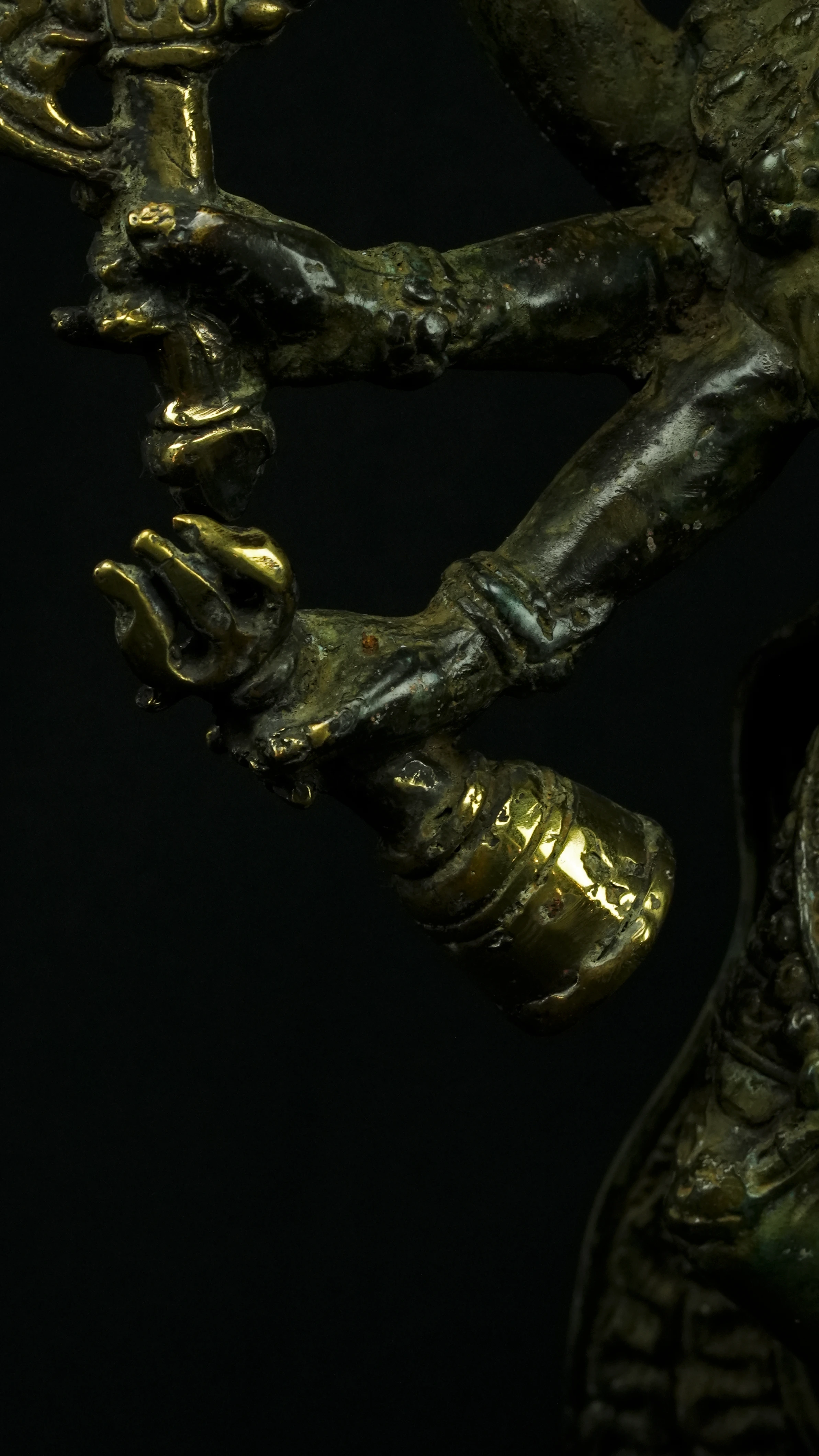 Sa danse sacrée, le nṛtya, exprime le mouvement des mondes et l’équilibre du cosmos. Chaque geste, chaque vibration, maintient l’harmonie entre les forces de vie et de dissolution. Le lotus sous ses pieds rappelle que la véritable victoire n’est pas d’écraser l’ombre, mais de s’élever au-dessus d’elle.