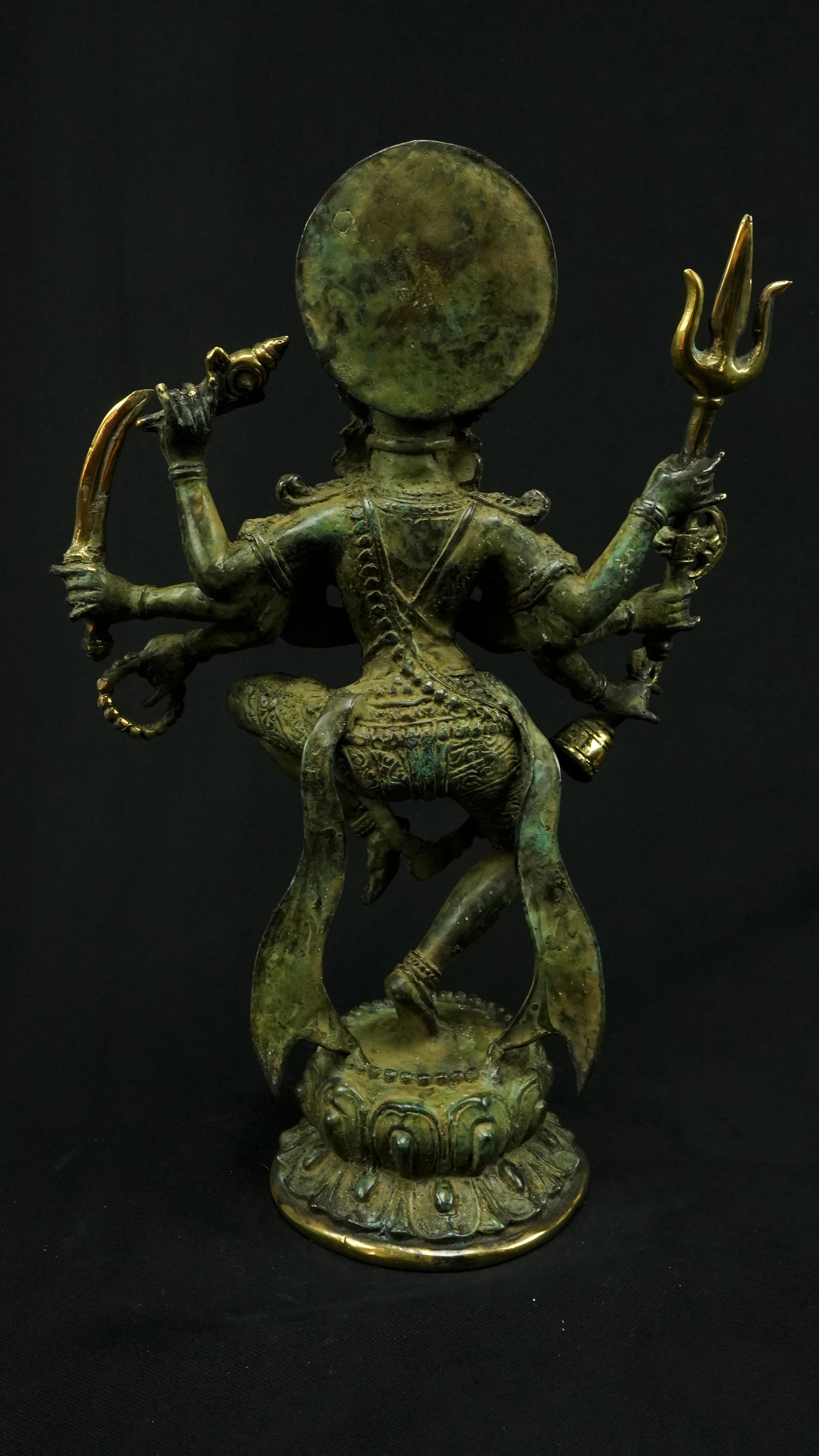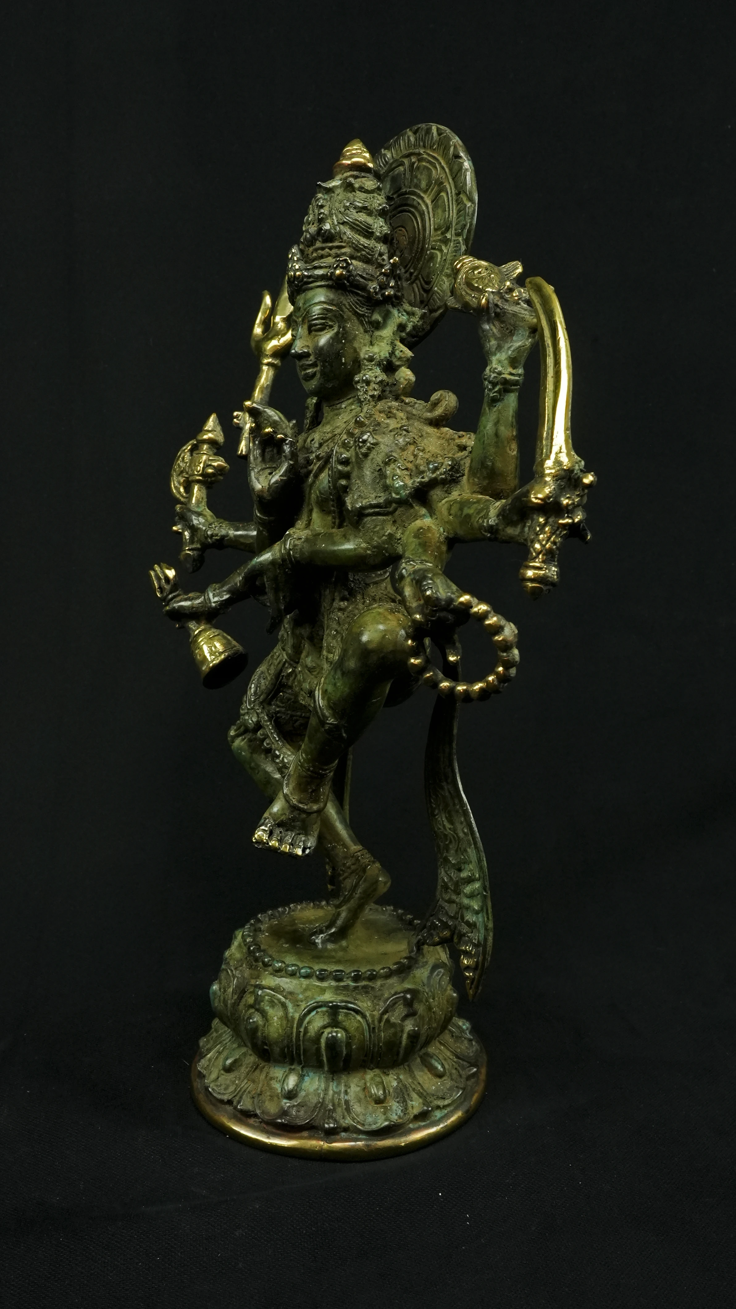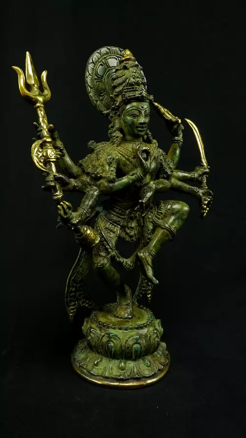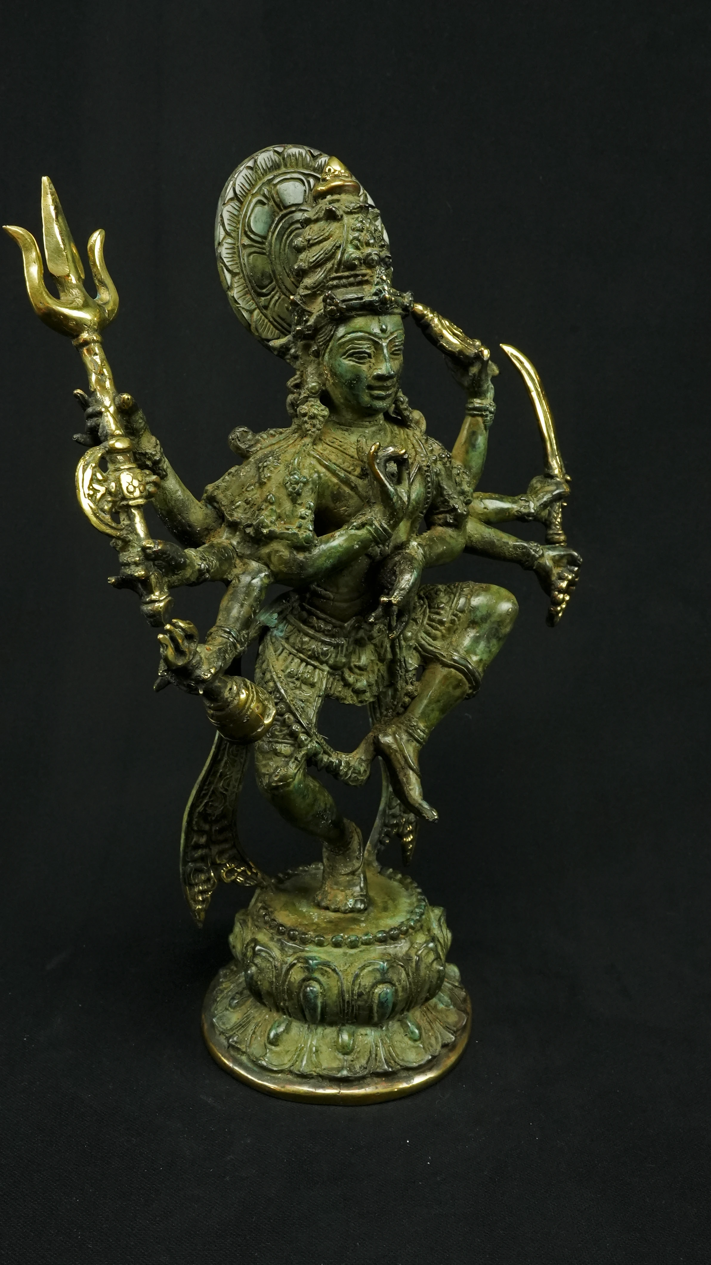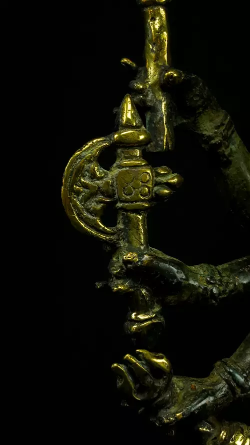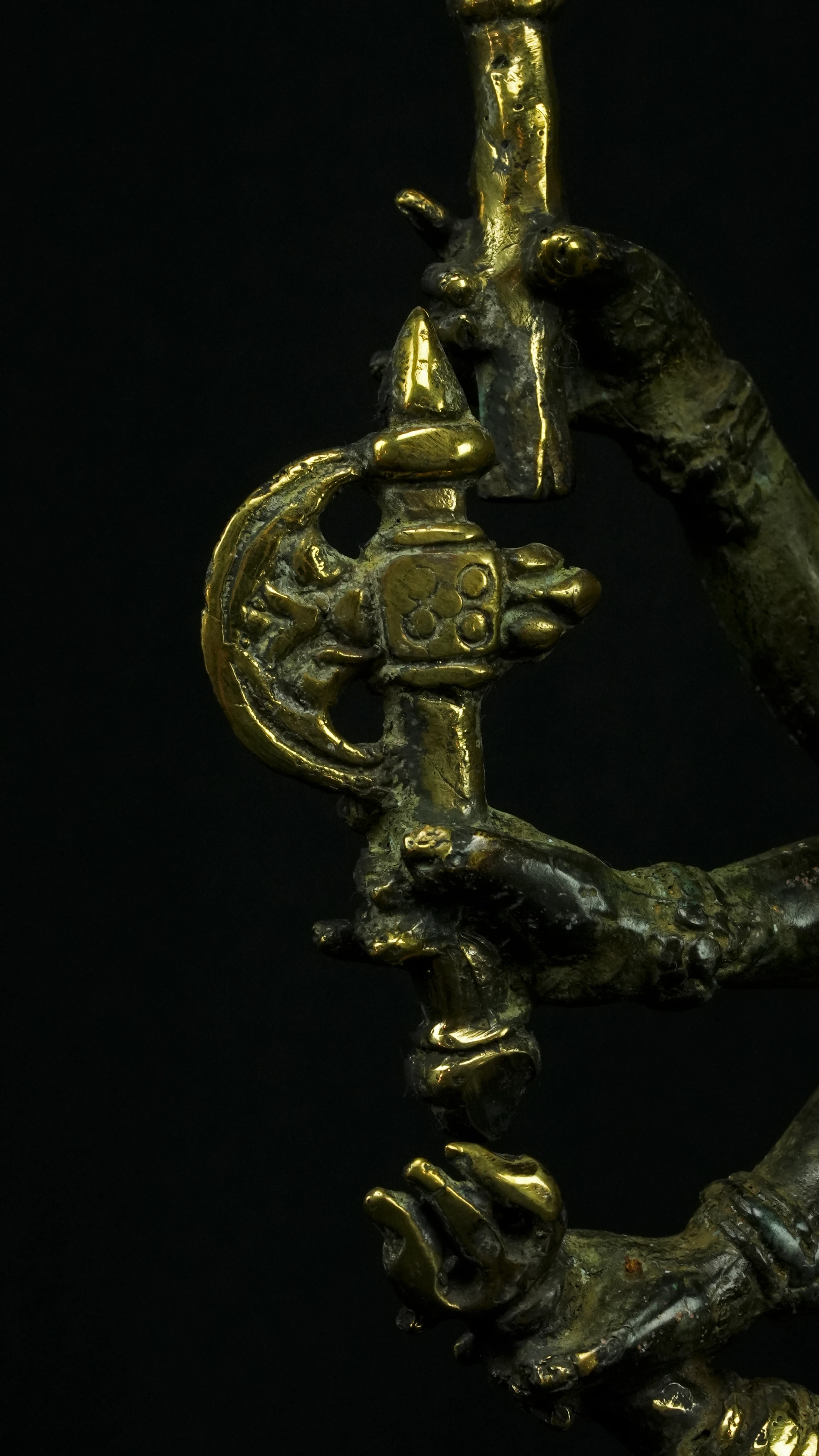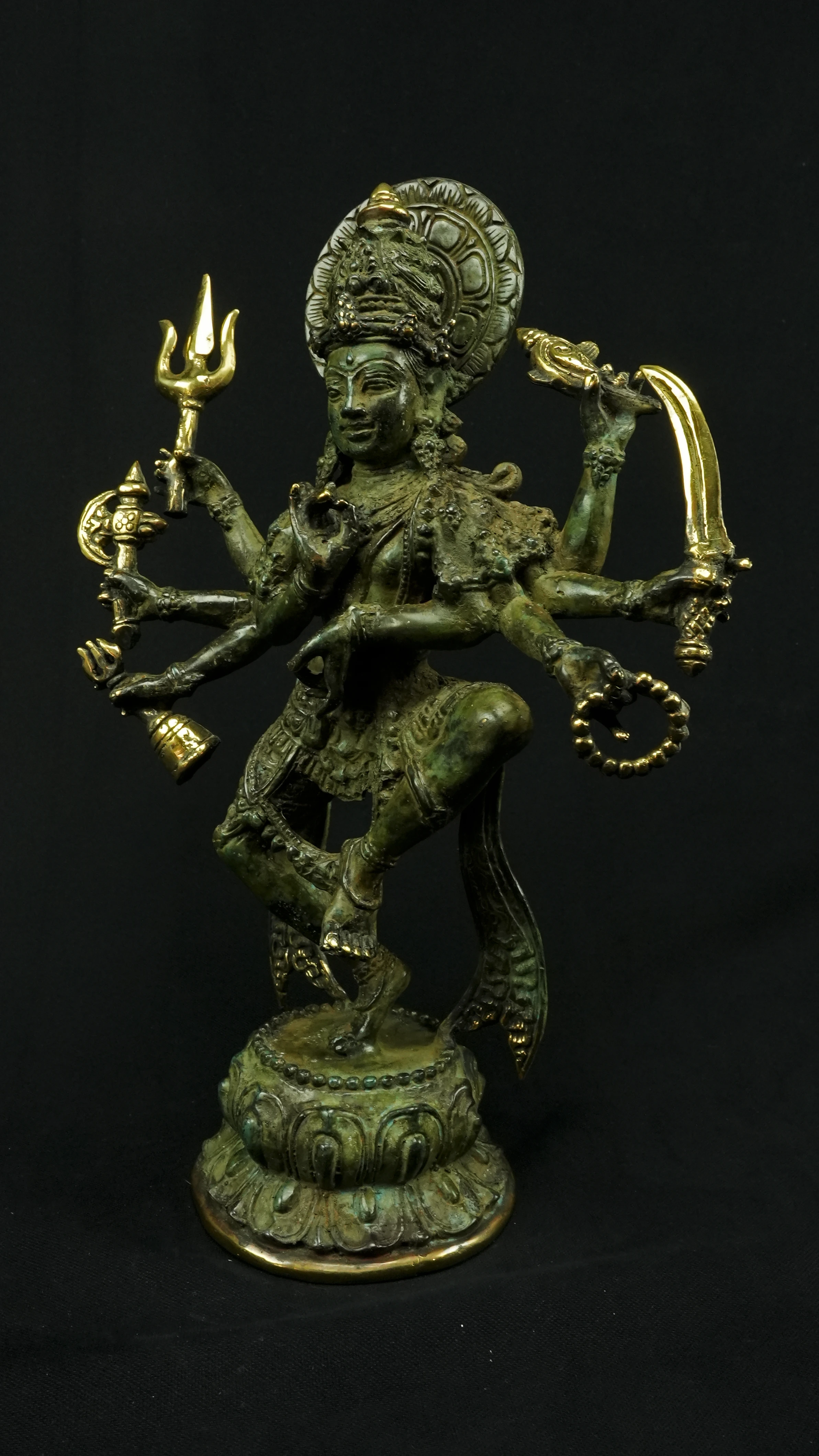 Sa danse sacrée, le nṛtya, exprime le mouvement des mondes et l’équilibre du cosmos. Chaque geste, chaque vibration, maintient l’harmonie entre les forces de vie et de dissolution. Le lotus sous ses pieds rappelle que la véritable victoire n’est pas d’écraser l’ombre, mais de s’élever au-dessus d’elle.