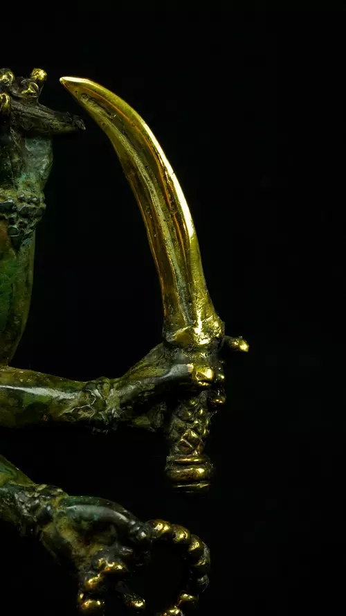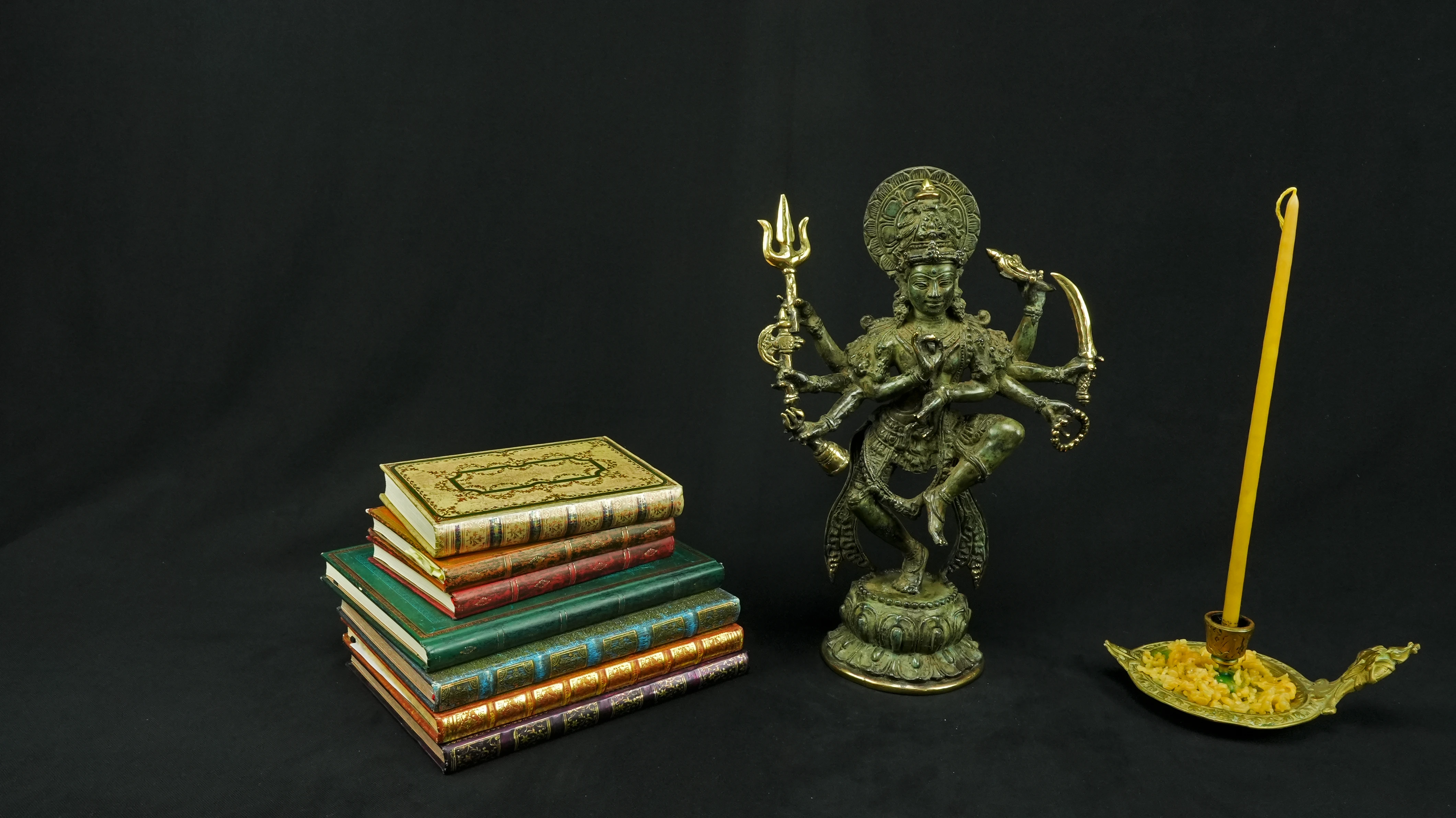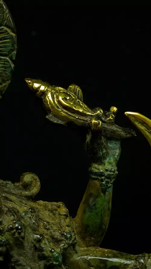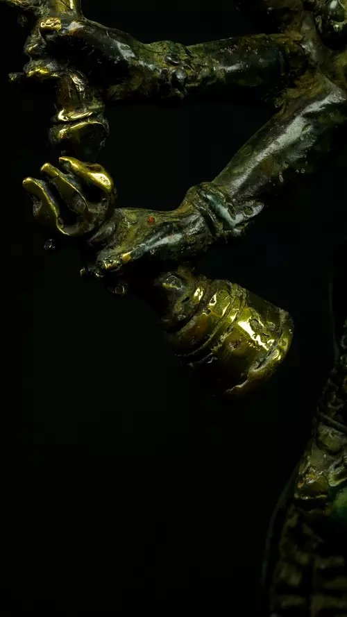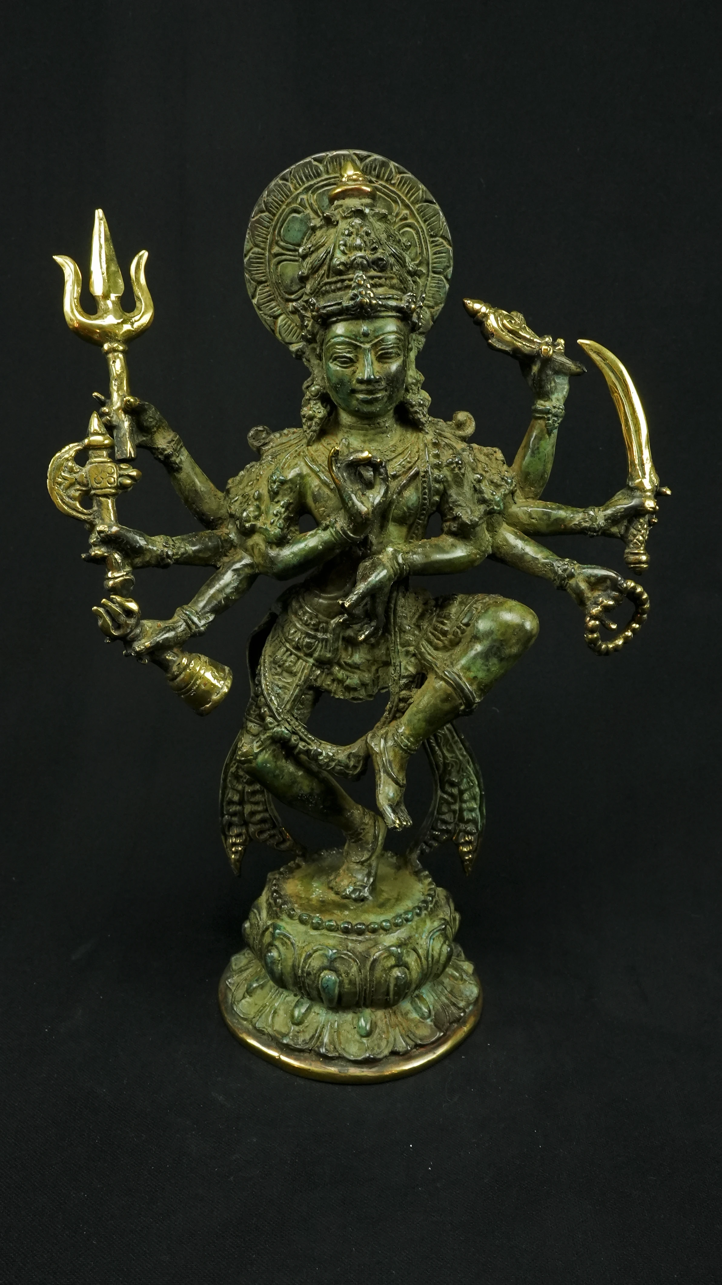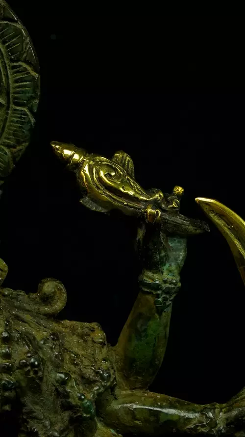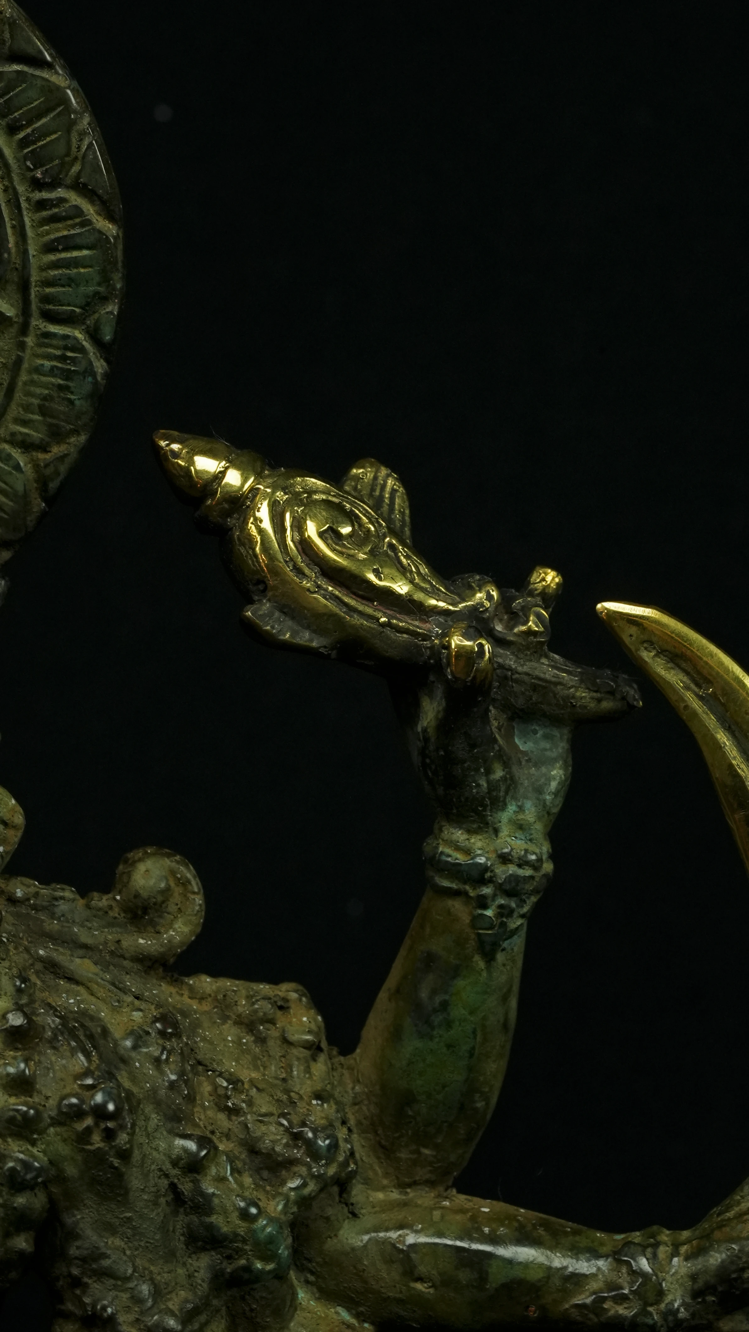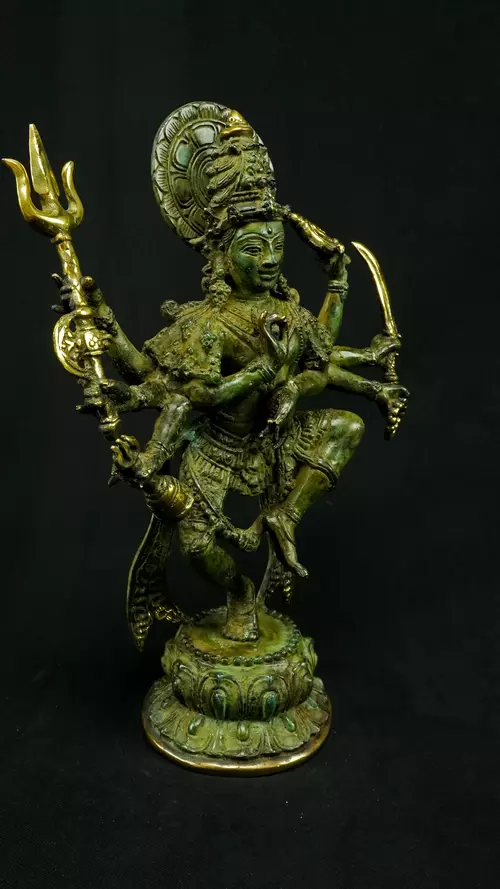 Sa danse sacrée, le nṛtya, exprime le mouvement des mondes et l’équilibre du cosmos. Chaque geste, chaque vibration, maintient l’harmonie entre les forces de vie et de dissolution. Le lotus sous ses pieds rappelle que la véritable victoire n’est pas d’écraser l’ombre, mais de s’élever au-dessus d’elle.